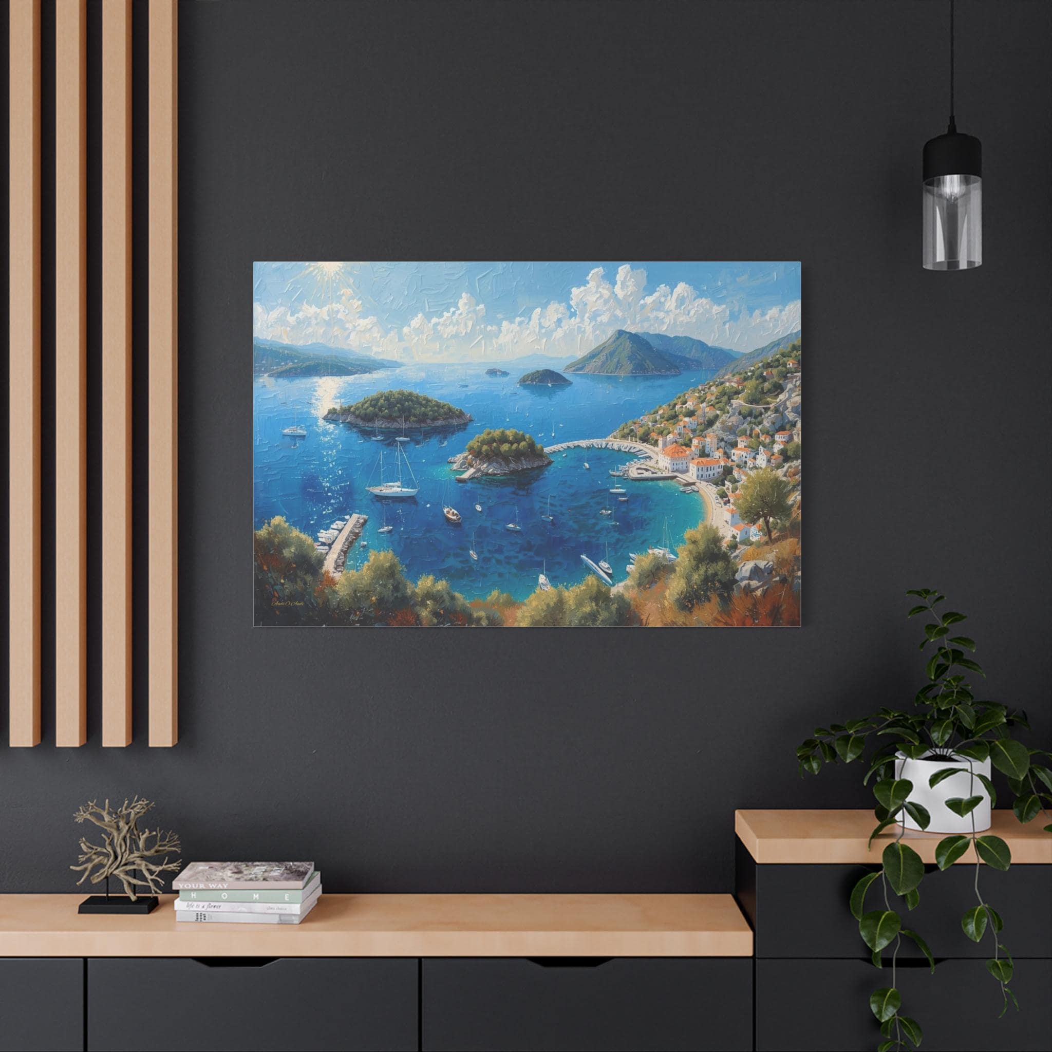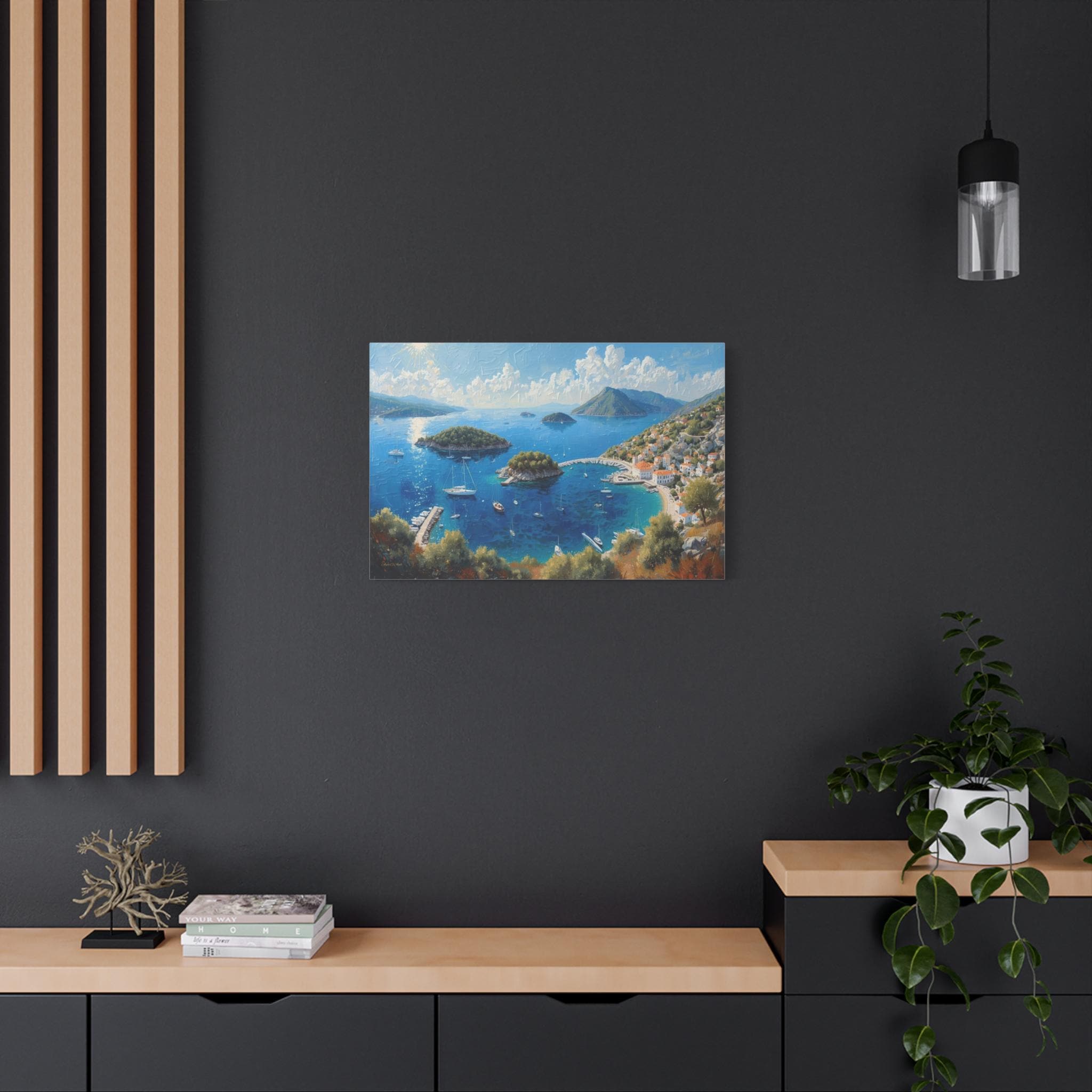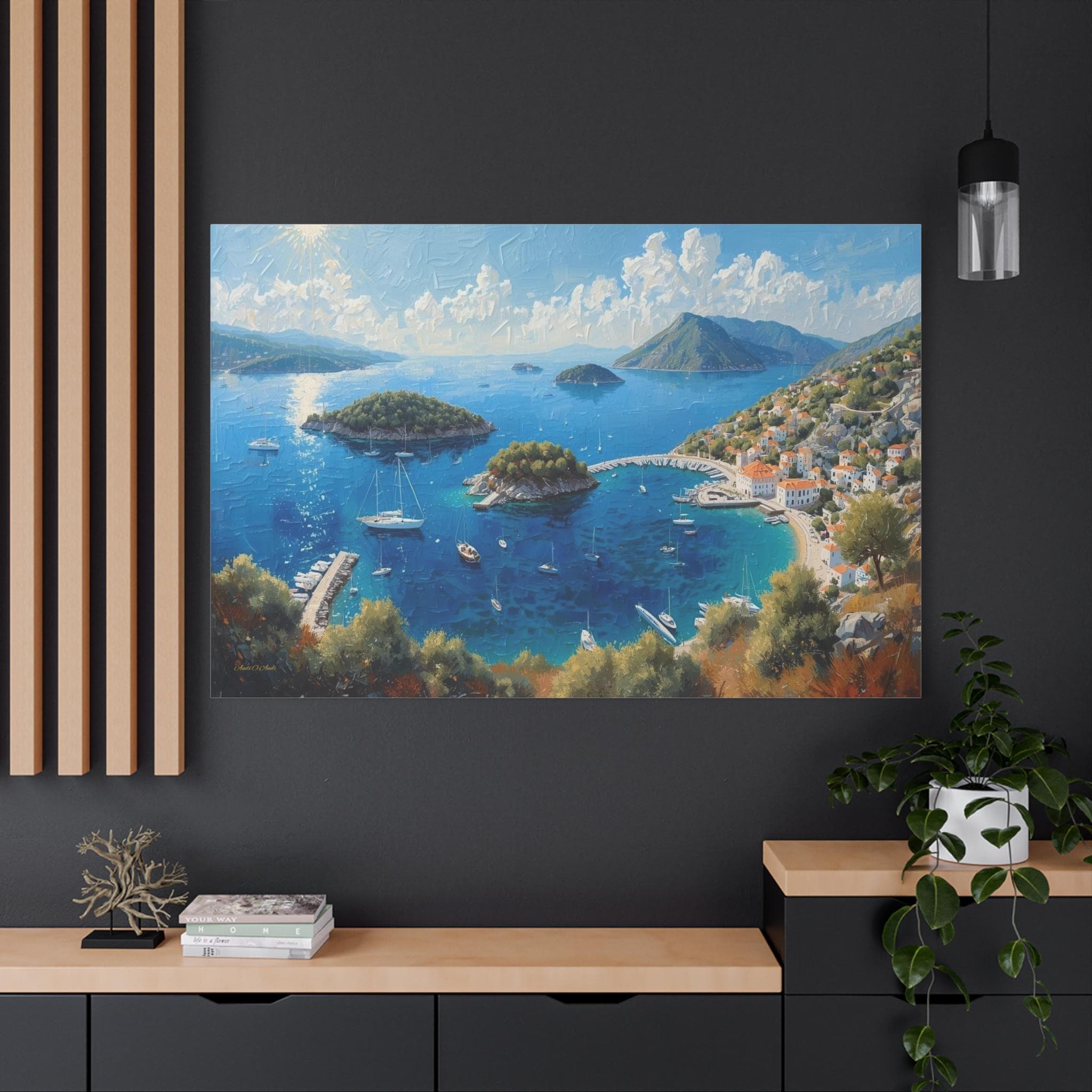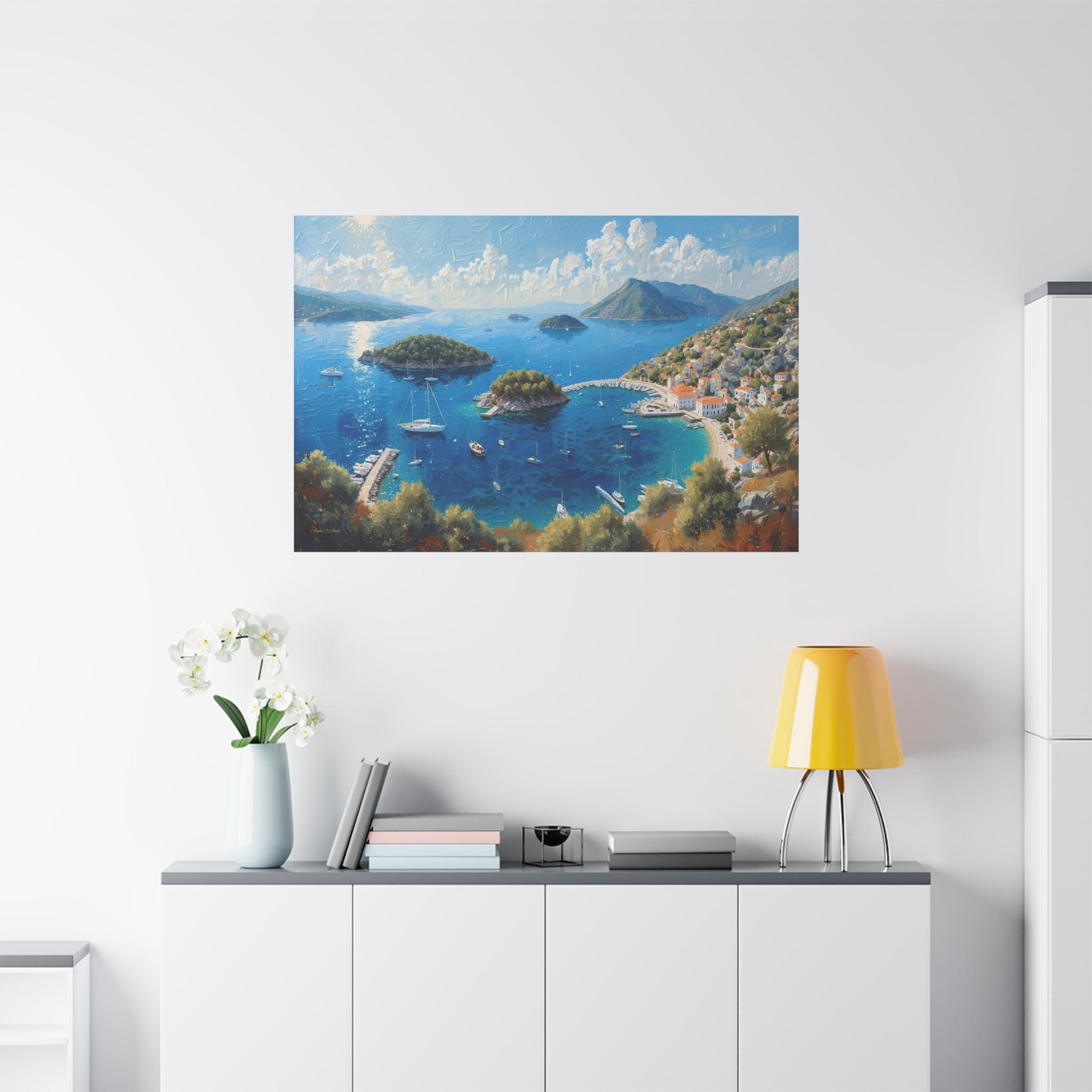 Bring the breathtaking, sun-drenched romance of the European coastline into your home with this stunning panoramic Mediterranean bay canvas print. This captivating artwork features a sweeping, aerial view of a vibrant blue gulf dotted with lush islands and pristine white sailboats. On the right, a charming coastal village with classic white stucco buildings and terracotta roofs nestles perfectly into the rolling green hillsides.