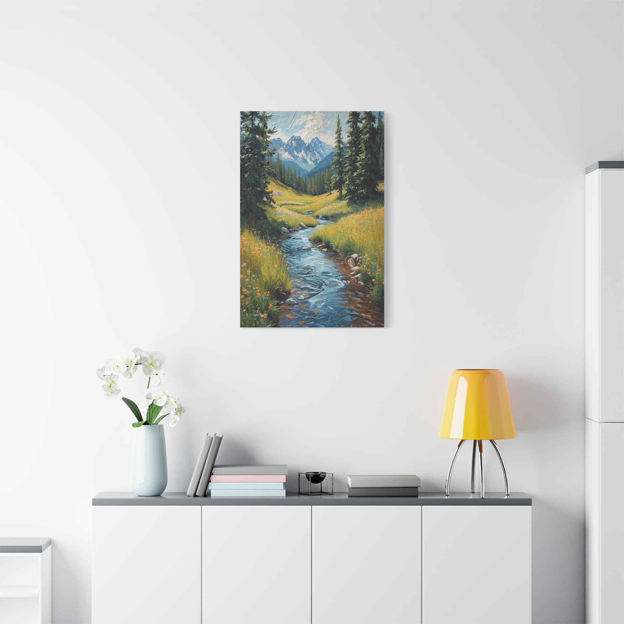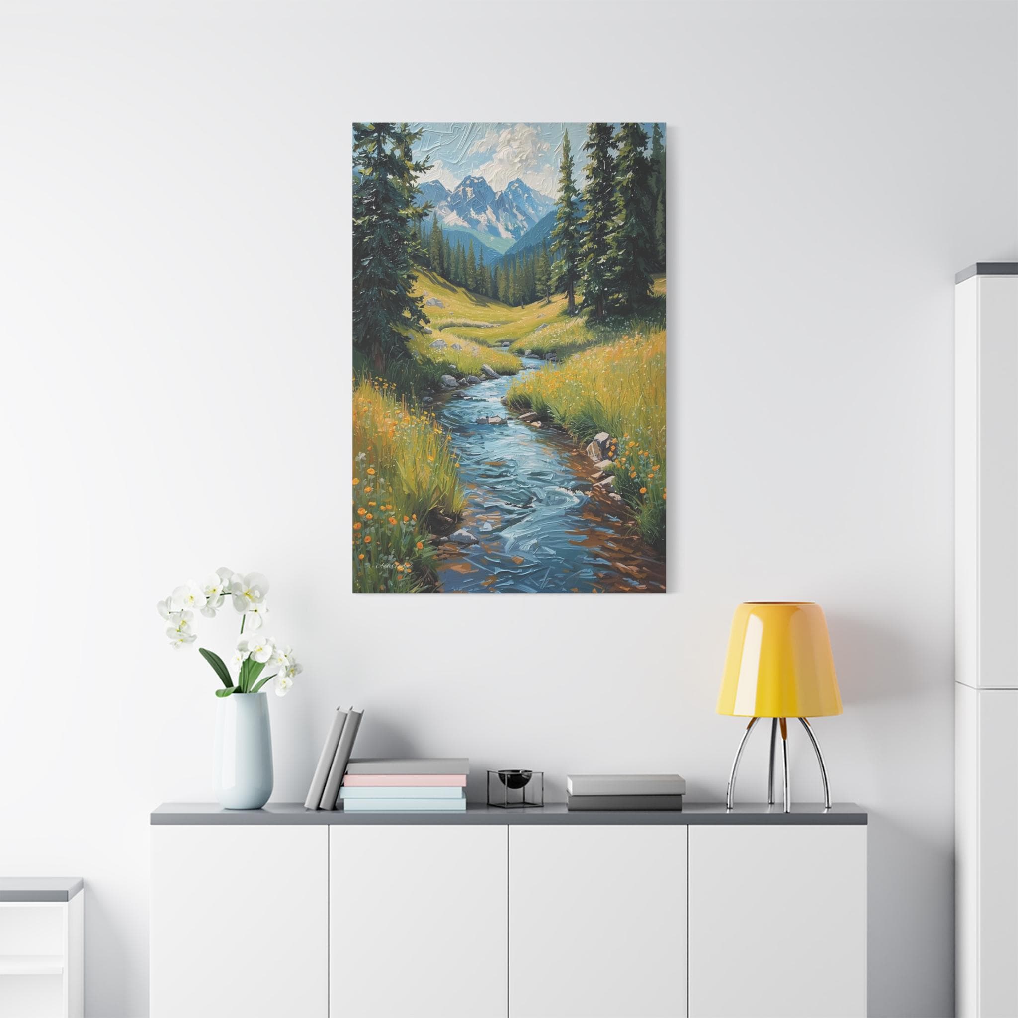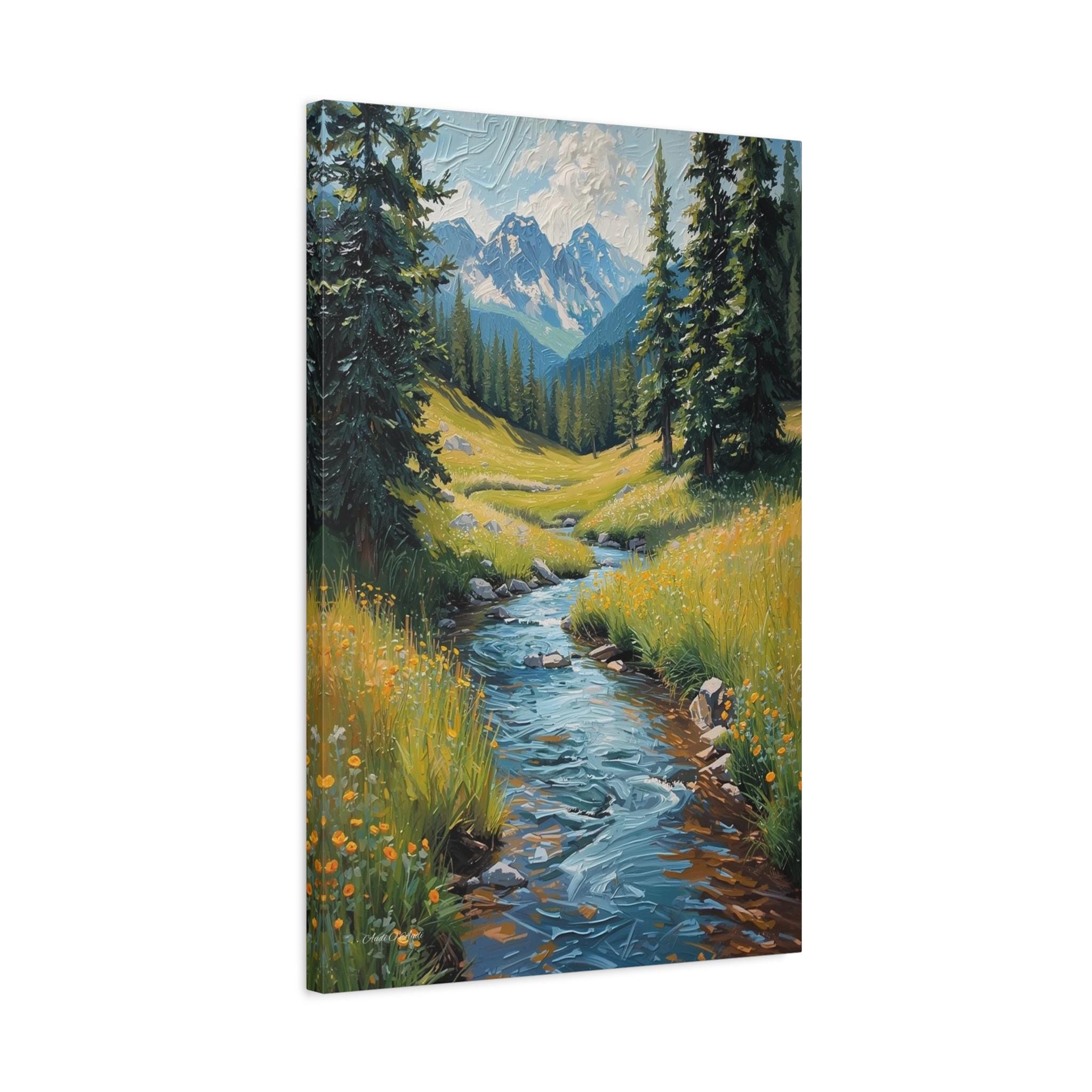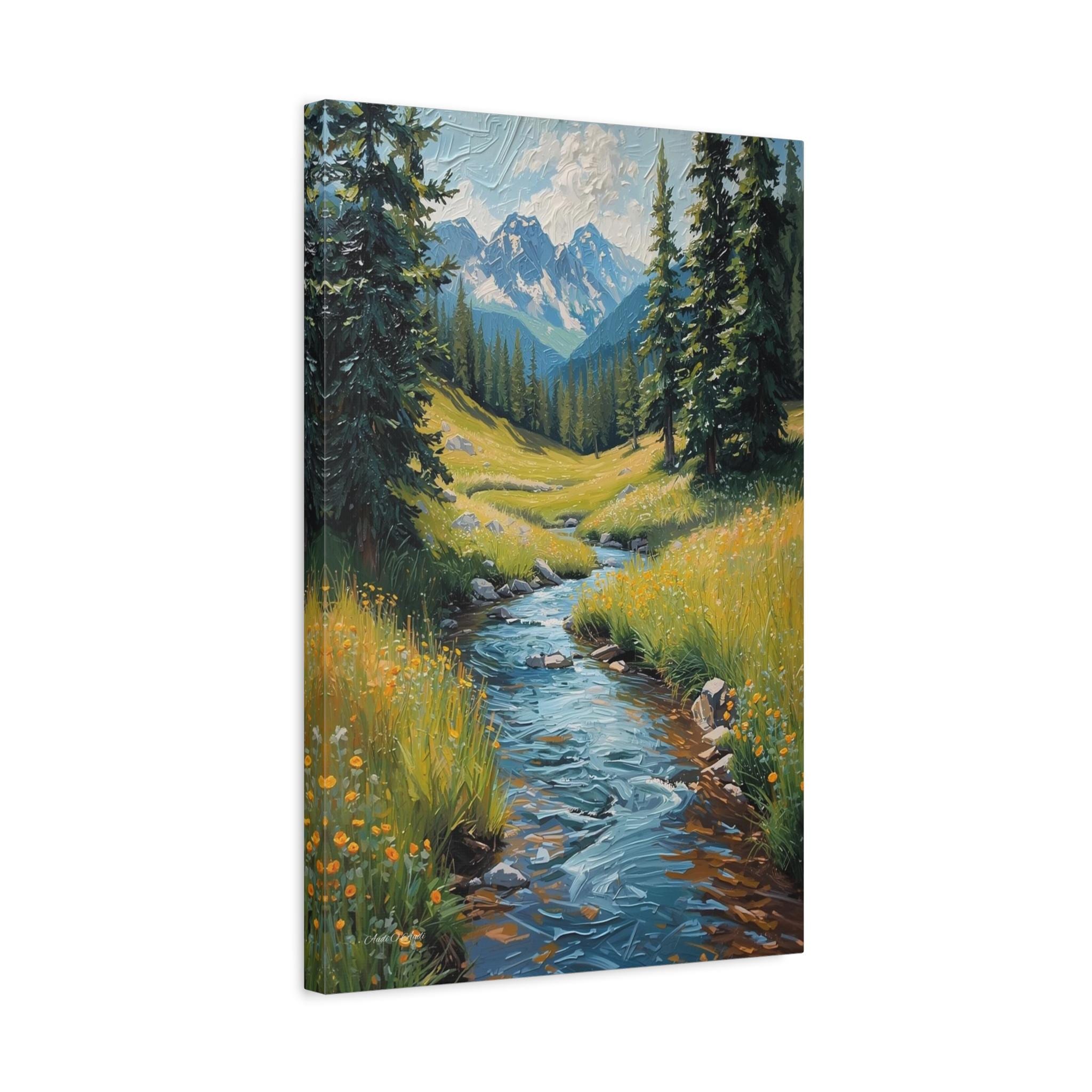 Bring the crisp, rejuvenating energy of a pristine alpine wilderness into your home with this stunning vertical mountain stream canvas print. This captivating artwork features a rushing, vibrant blue river cascading down through a lush green meadow dotted with bright yellow wildflowers. Framed by towering pine trees, the stream leads the eye perfectly toward a breathtaking background of majestic, snow-capped mountain peaks beneath a dynamic, cloudy sky.