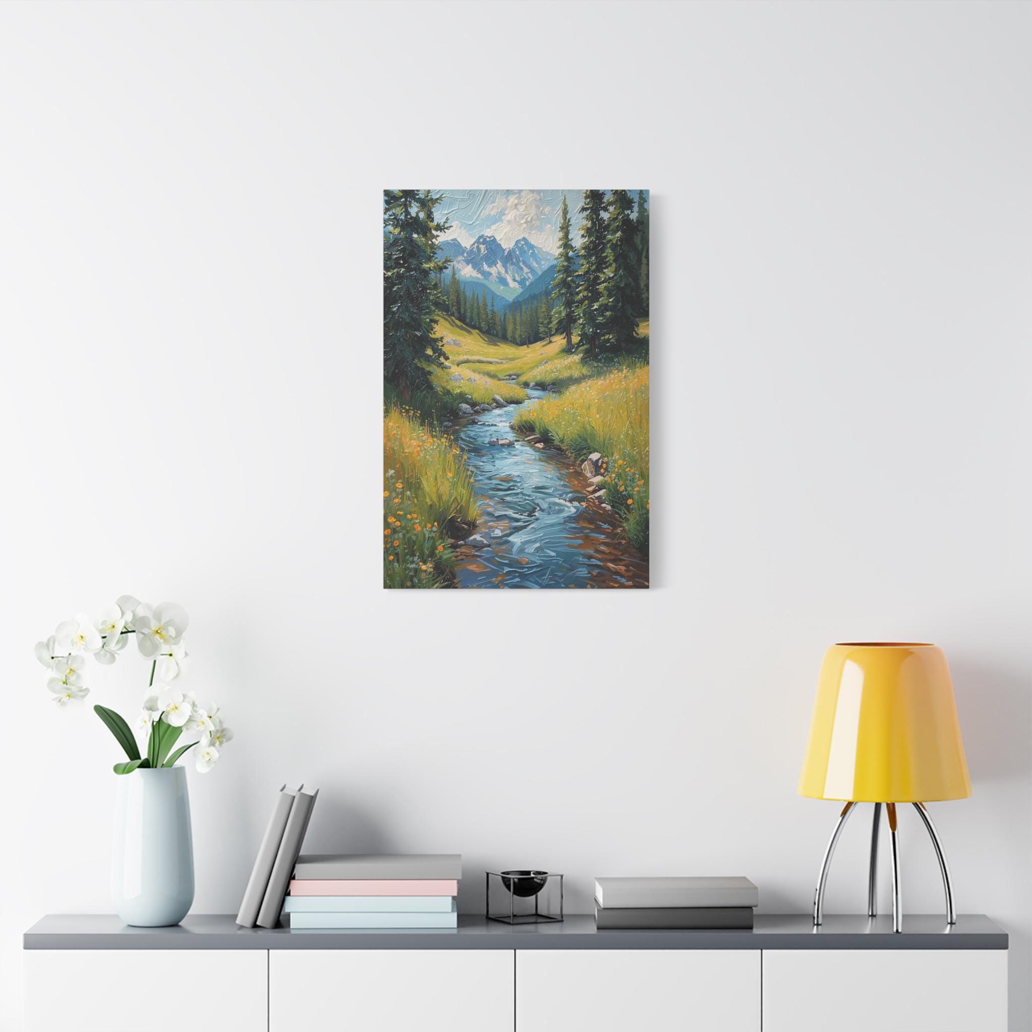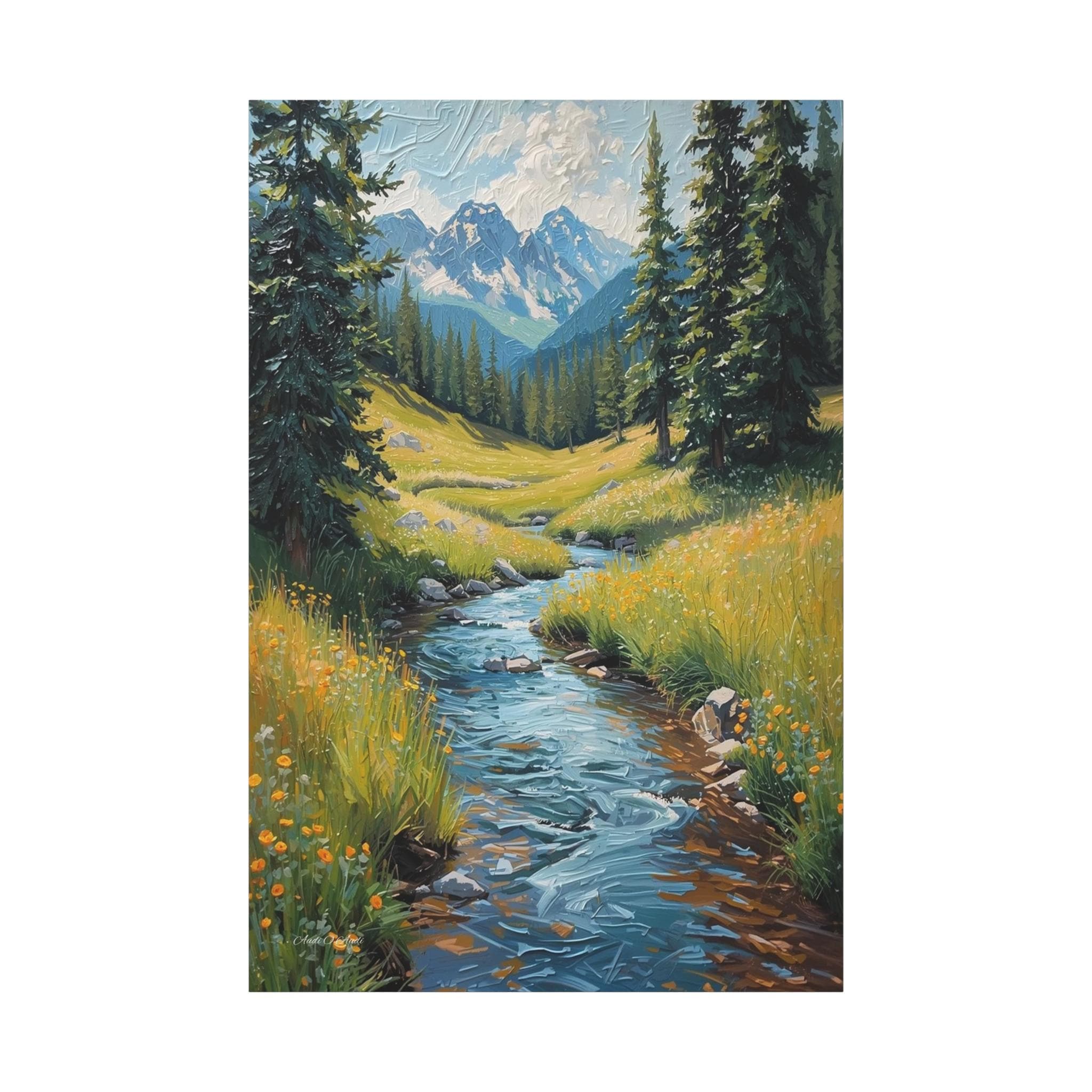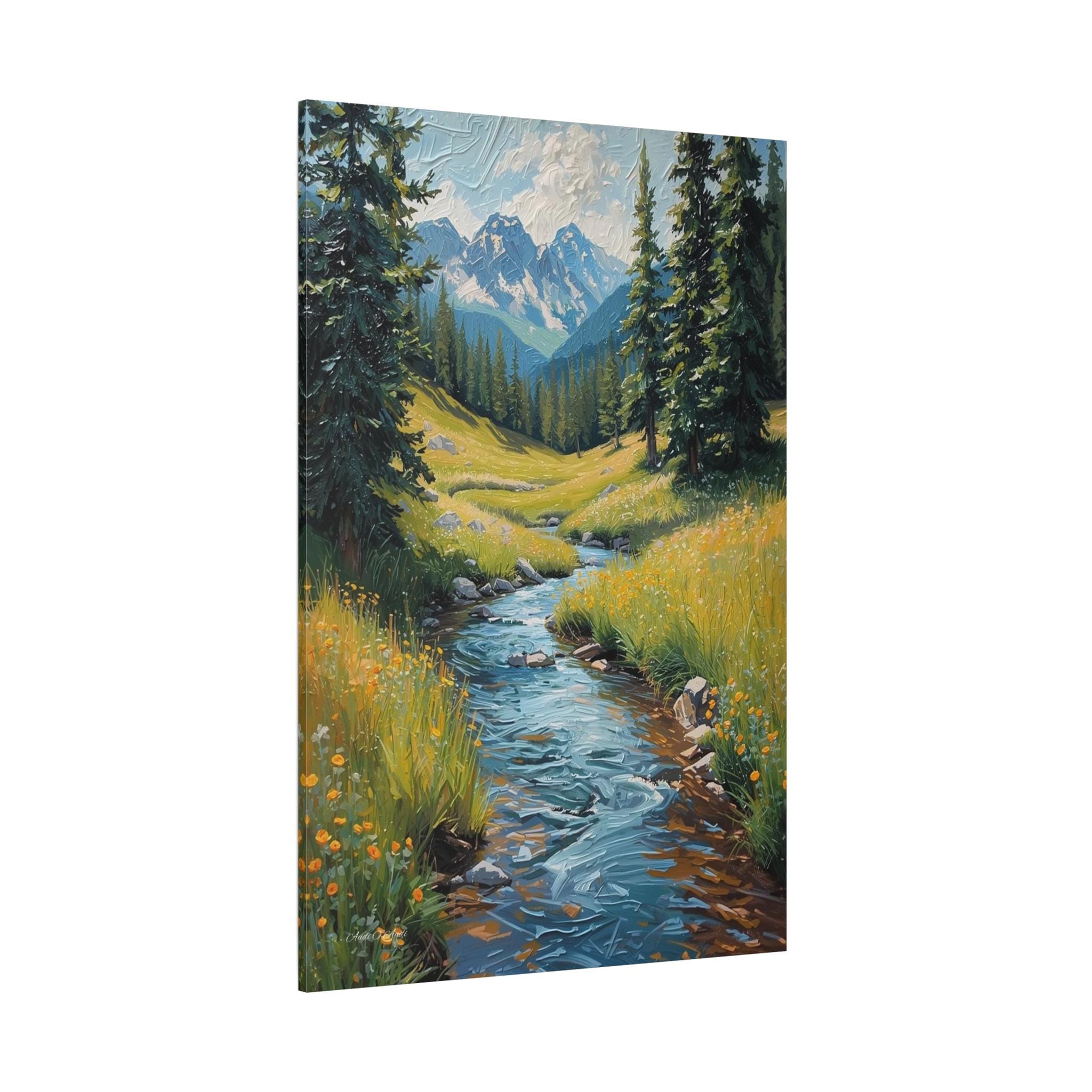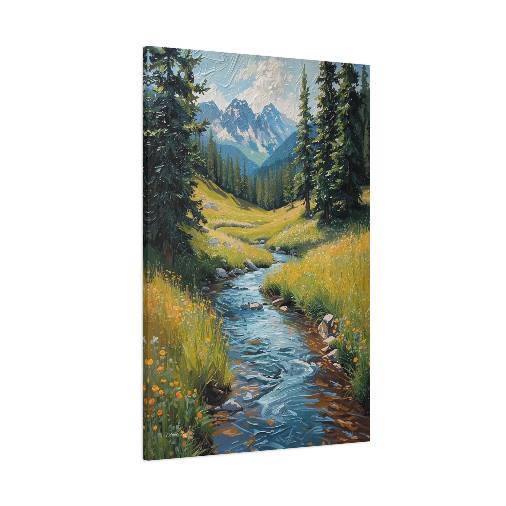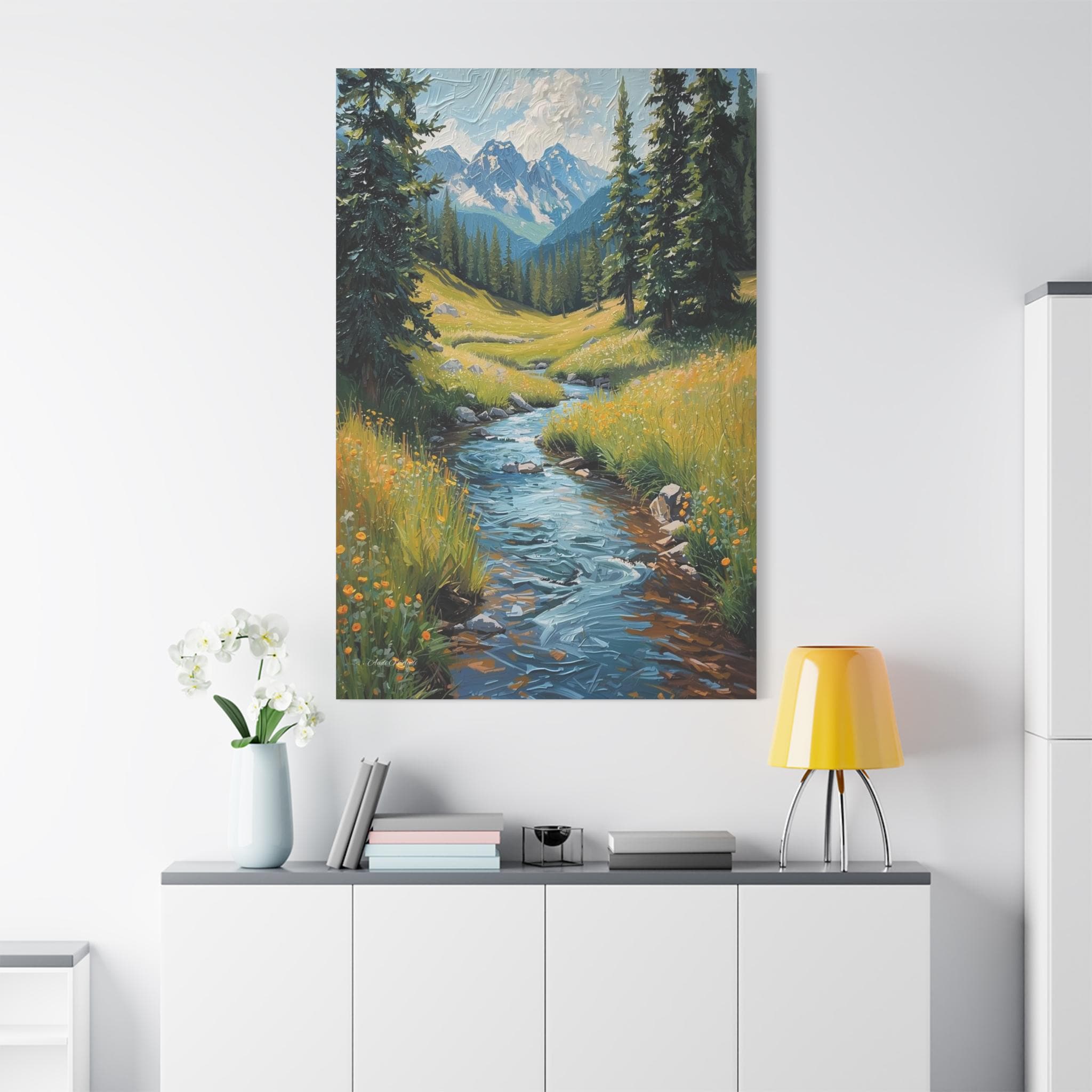 Bring the crisp, rejuvenating energy of a pristine alpine wilderness into your home with this stunning vertical mountain stream canvas print. This captivating artwork features a rushing, vibrant blue river cascading down through a lush green meadow dotted with bright yellow wildflowers. Framed by towering pine trees, the stream leads the eye perfectly toward a breathtaking background of majestic, snow-capped mountain peaks beneath a dynamic, cloudy sky.