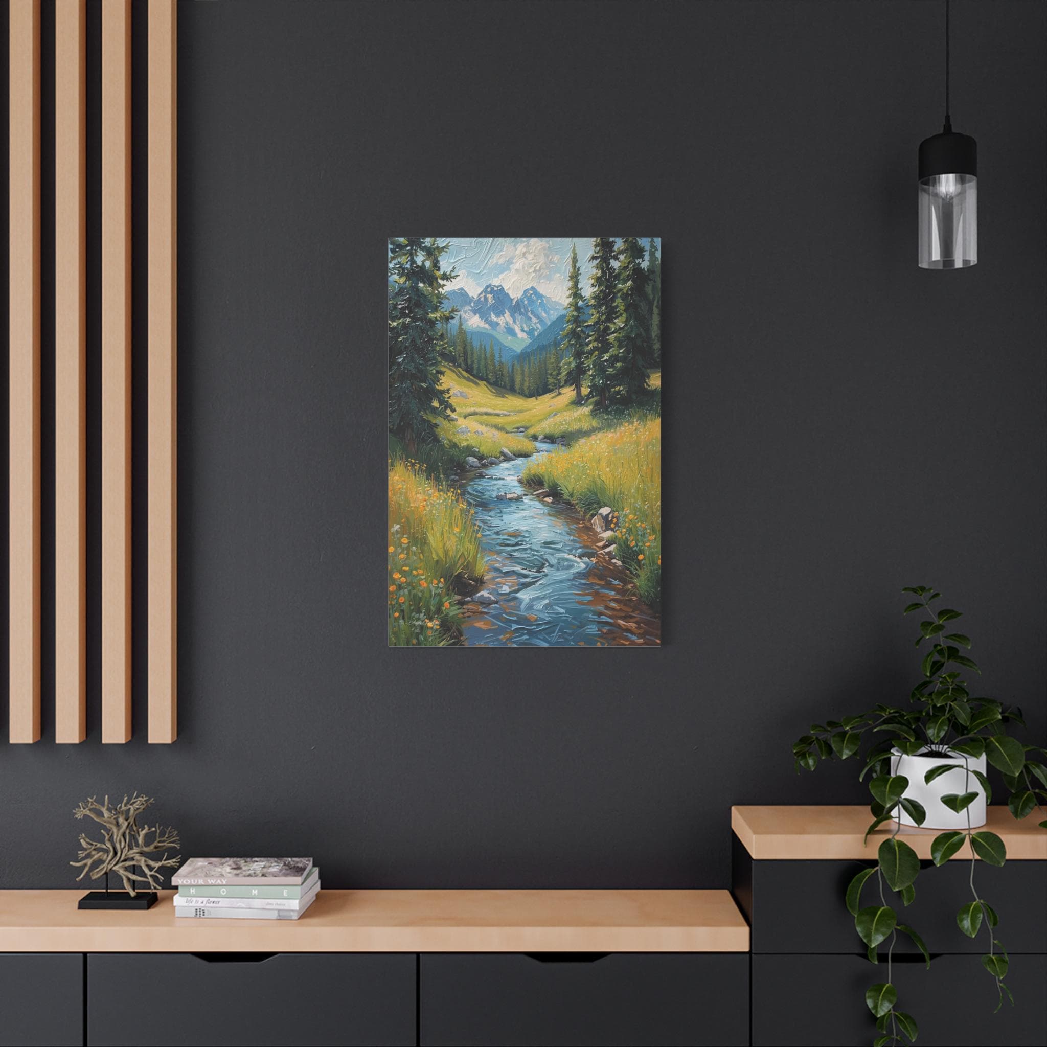 The composition radiates peace, grounding energy, and the spectacular beauty of the great outdoors. The design utilizes a rich, heavy impasto oil painting style, beautifully capturing the textured look of the flowing water, the thick grass, and the rugged mountain faces. Its vertical orientation makes it the perfect, uplifting statement piece to brighten up narrow walls, entryways, bathrooms, or cozy cabin living spaces.