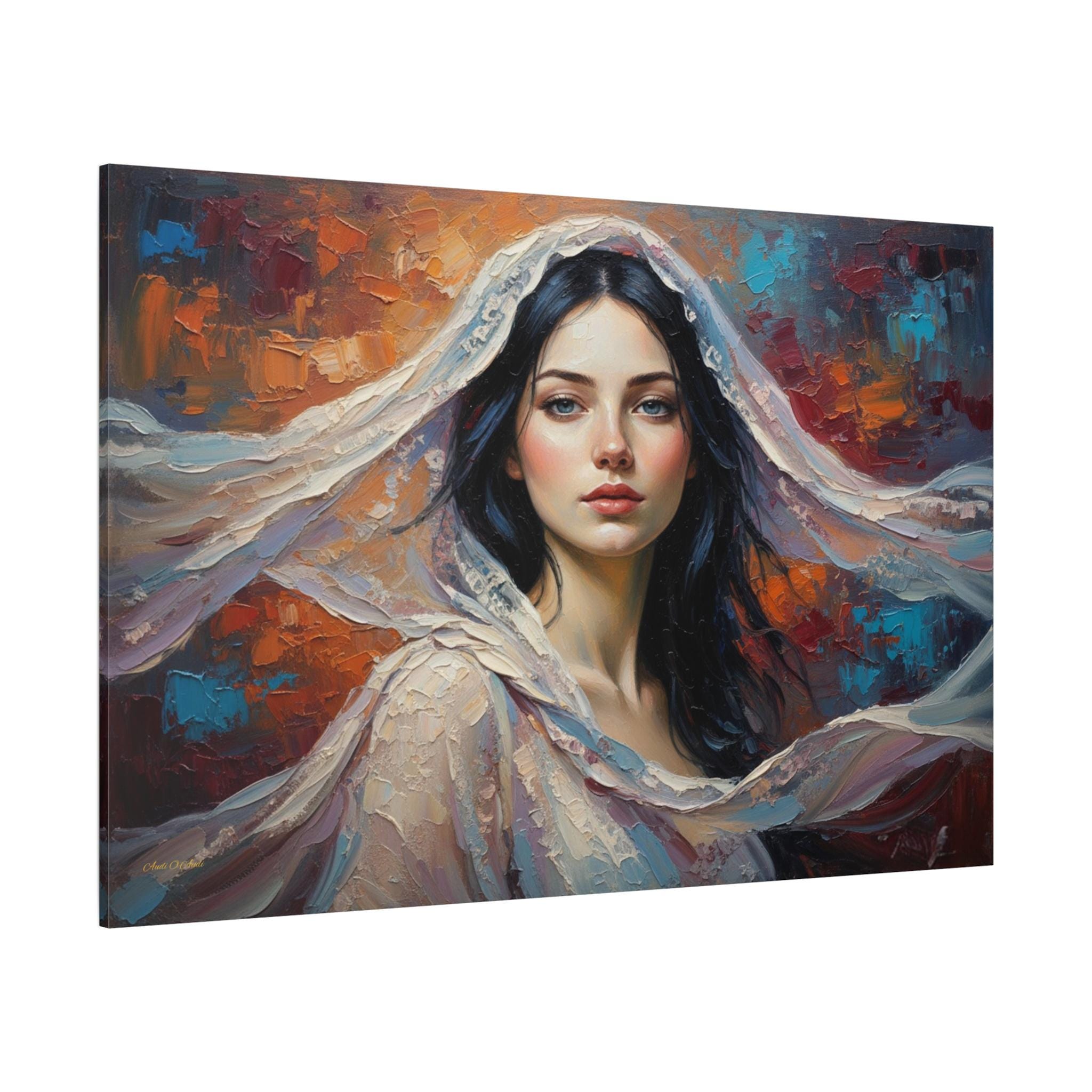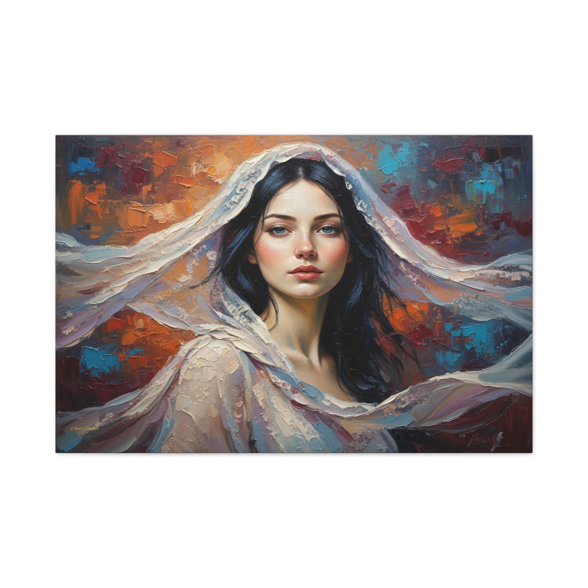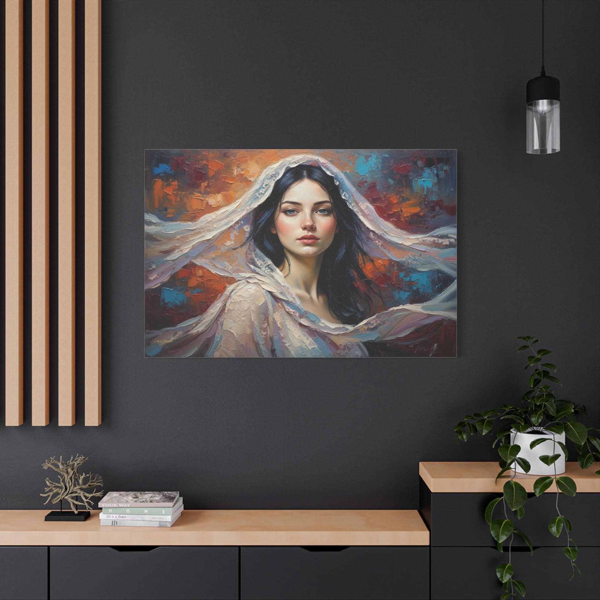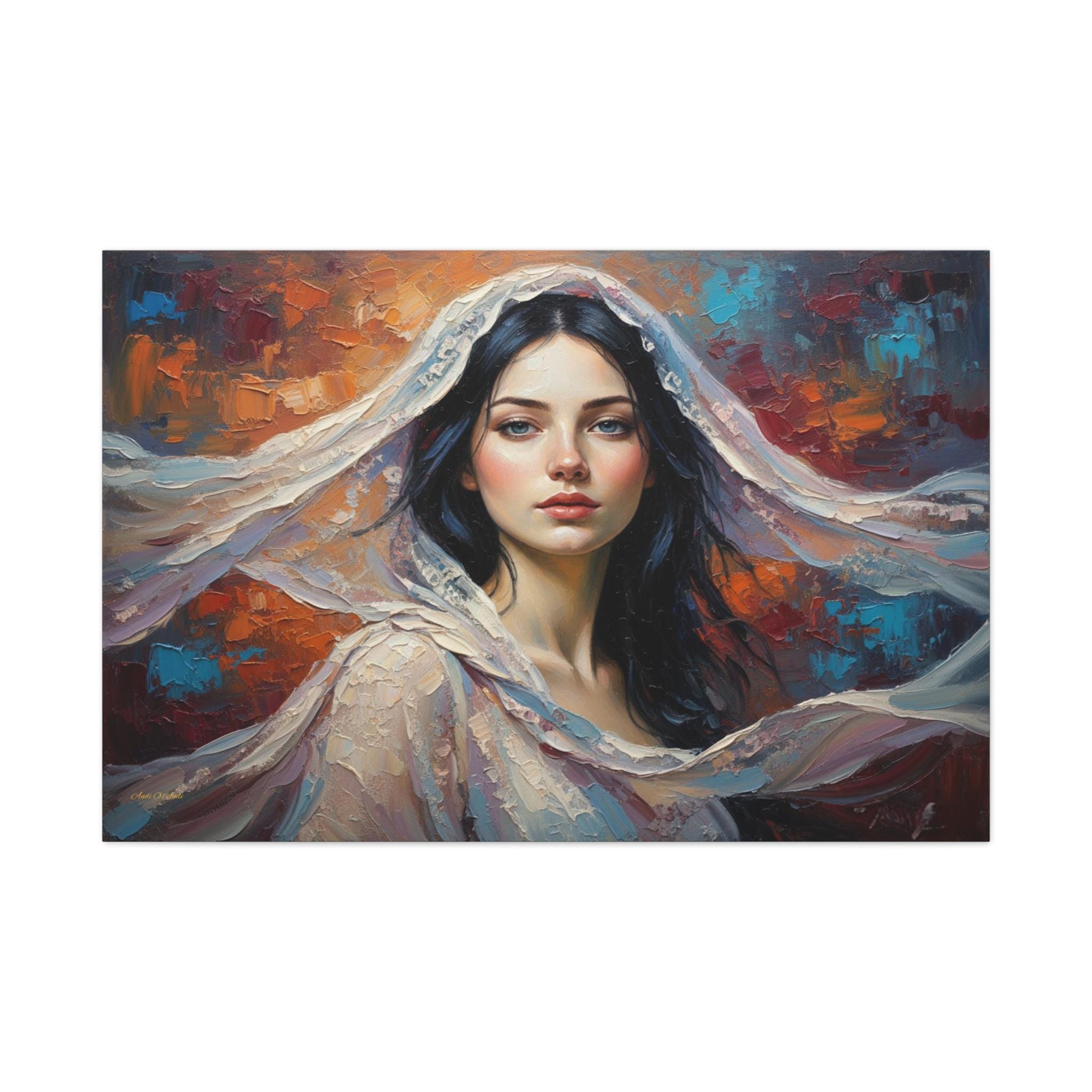 Bring captivating emotion and bold, contemporary energy into your space with this striking ethereal portrait canvas print. This gorgeous artwork features the soft, realistic face of a beautiful woman framed by flowing, sheer white fabric that sweeps across the canvas. She is set against a deeply textured, abstract background bursting with vibrant shades of rust orange, deep crimson, and cool teal blue.