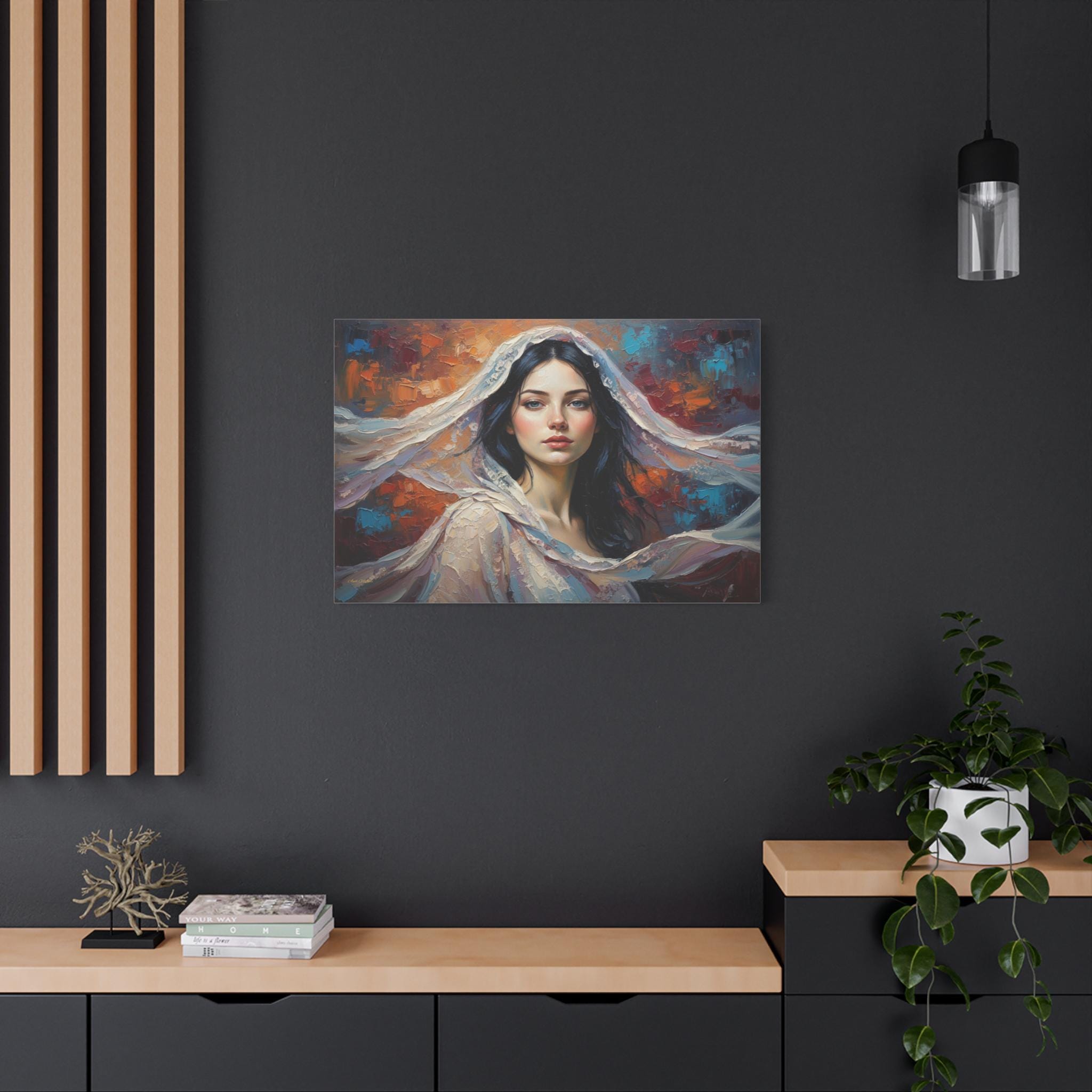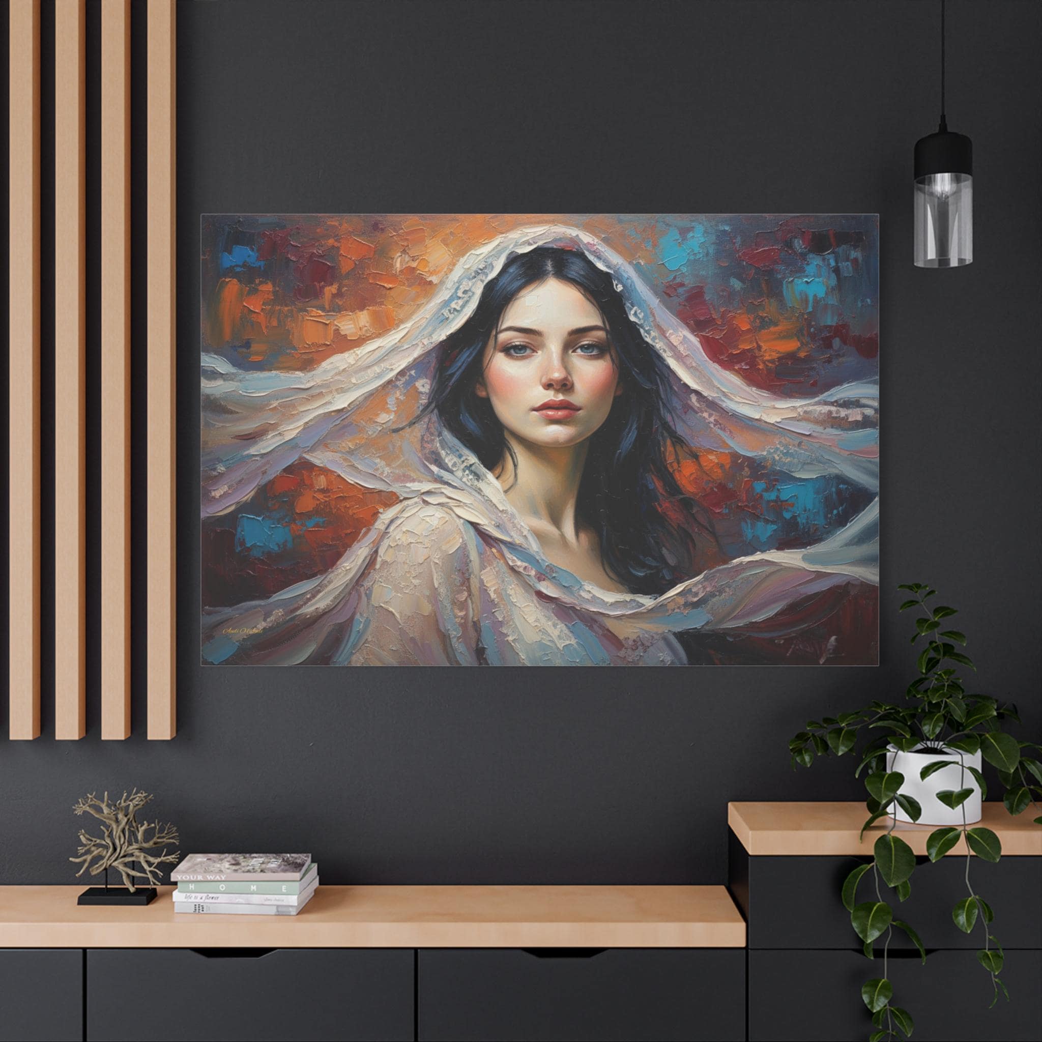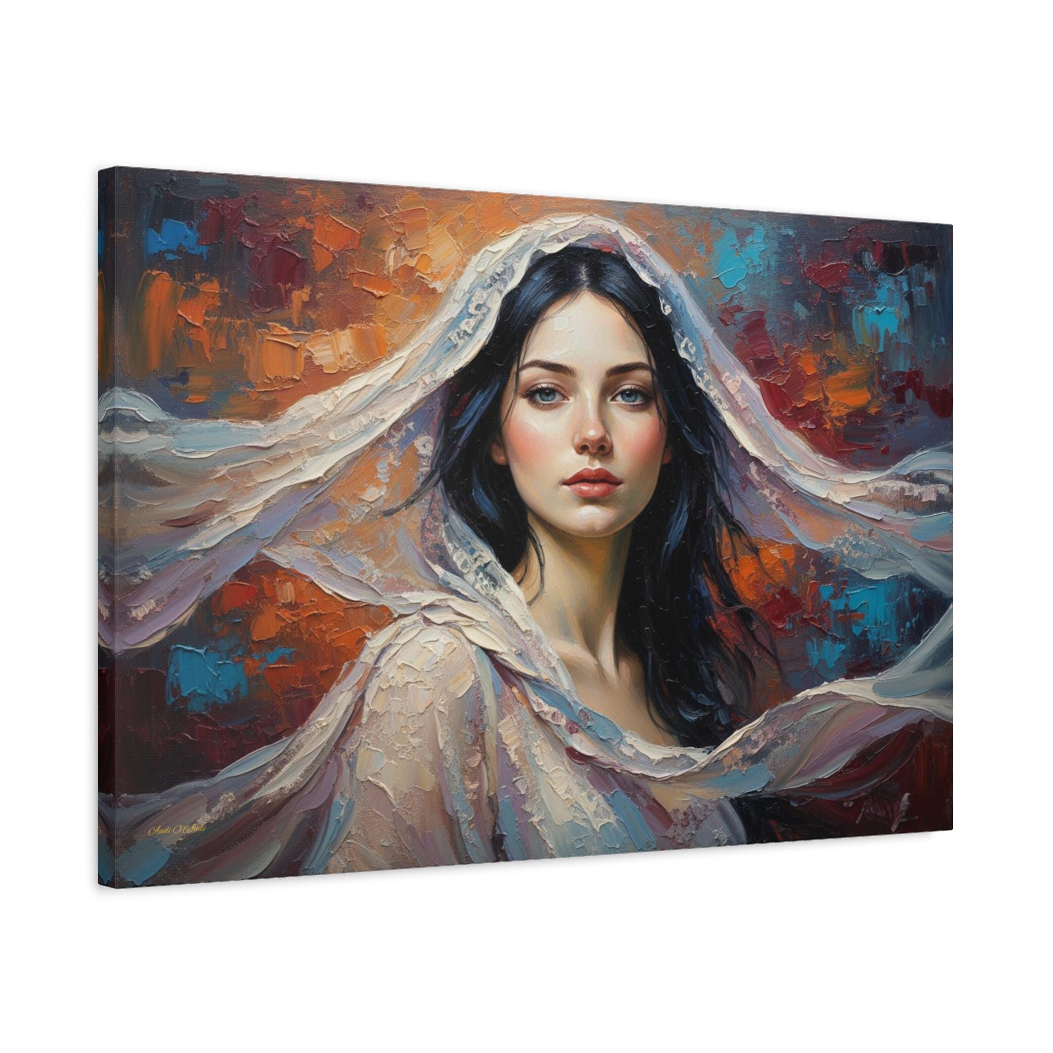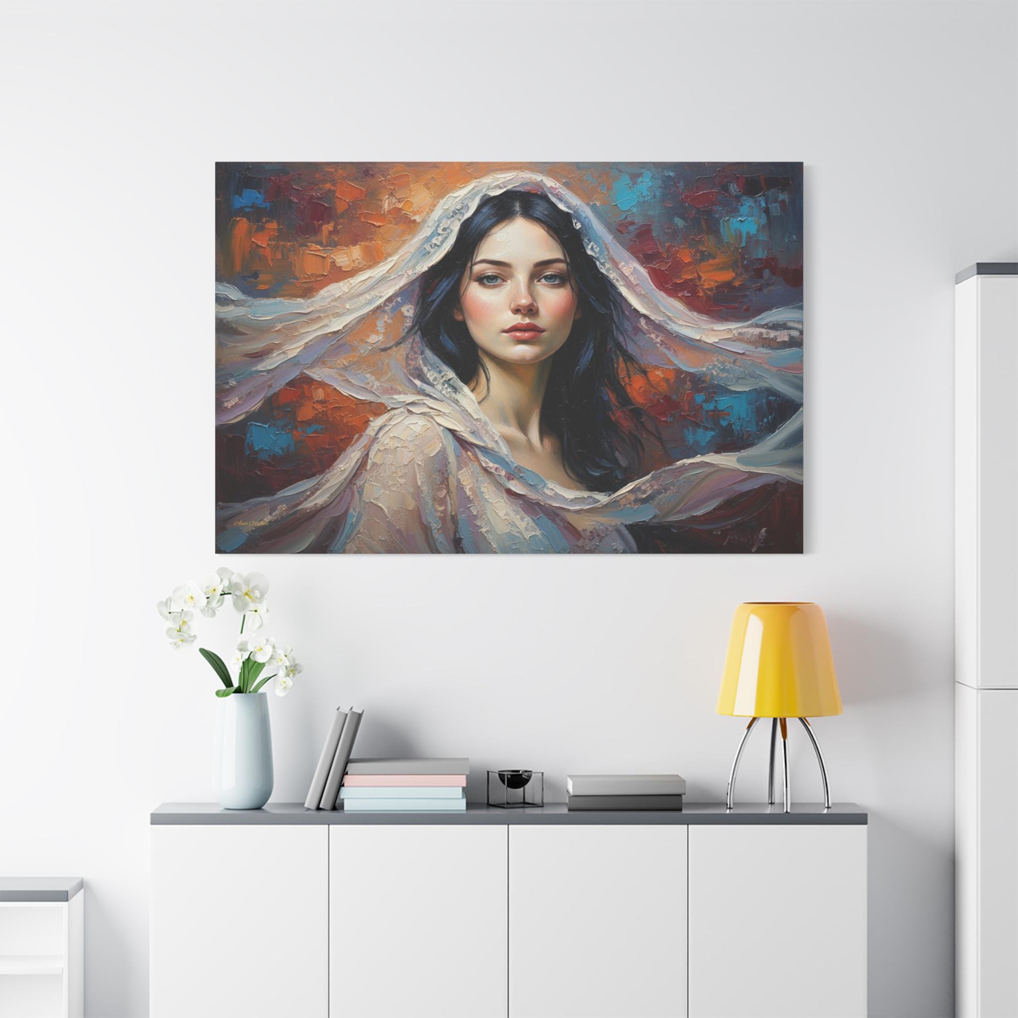 Bring captivating emotion and bold, contemporary energy into your space with this striking ethereal portrait canvas print. This gorgeous artwork features the soft, realistic face of a beautiful woman framed by flowing, sheer white fabric that sweeps across the canvas. She is set against a deeply textured, abstract background bursting with vibrant shades of rust orange, deep crimson, and cool teal blue.