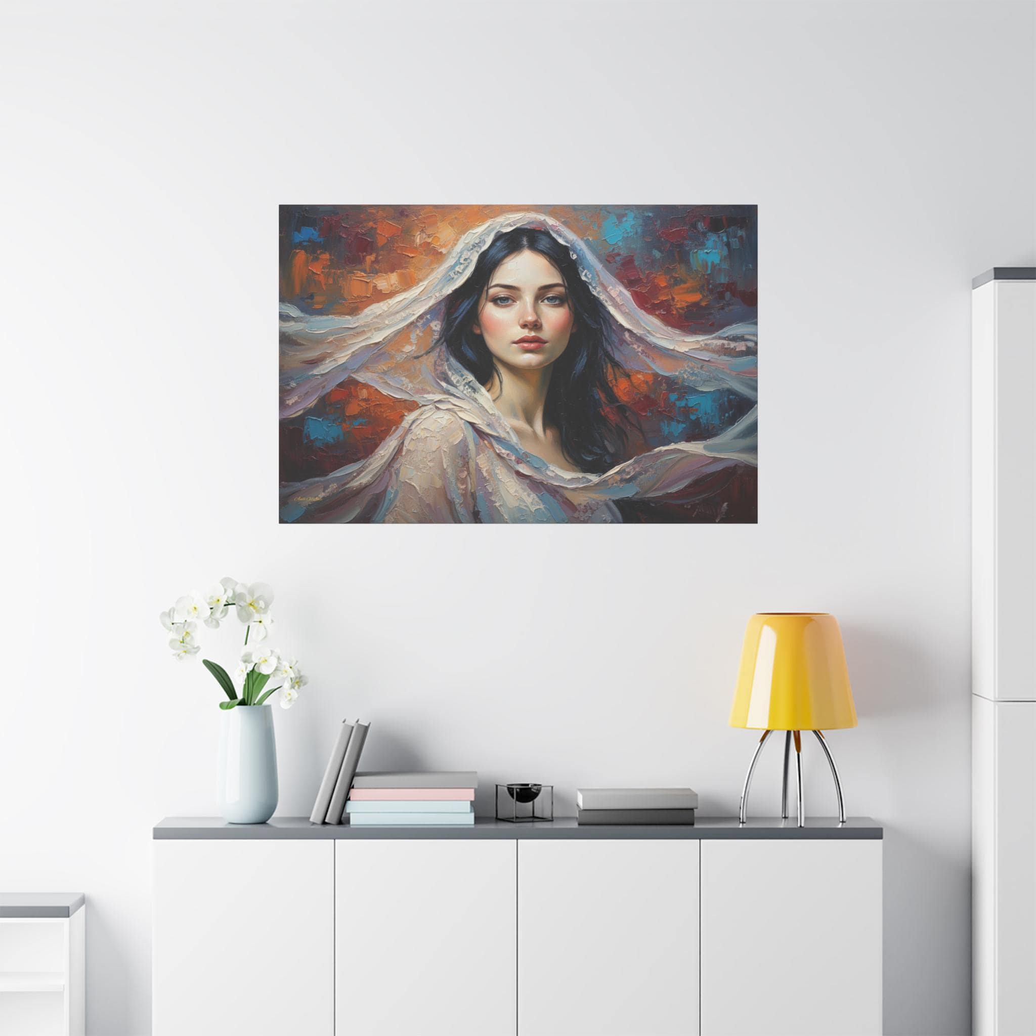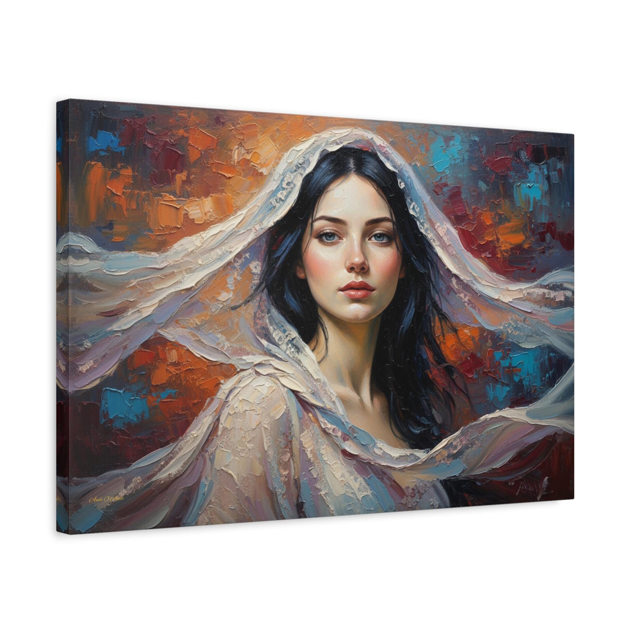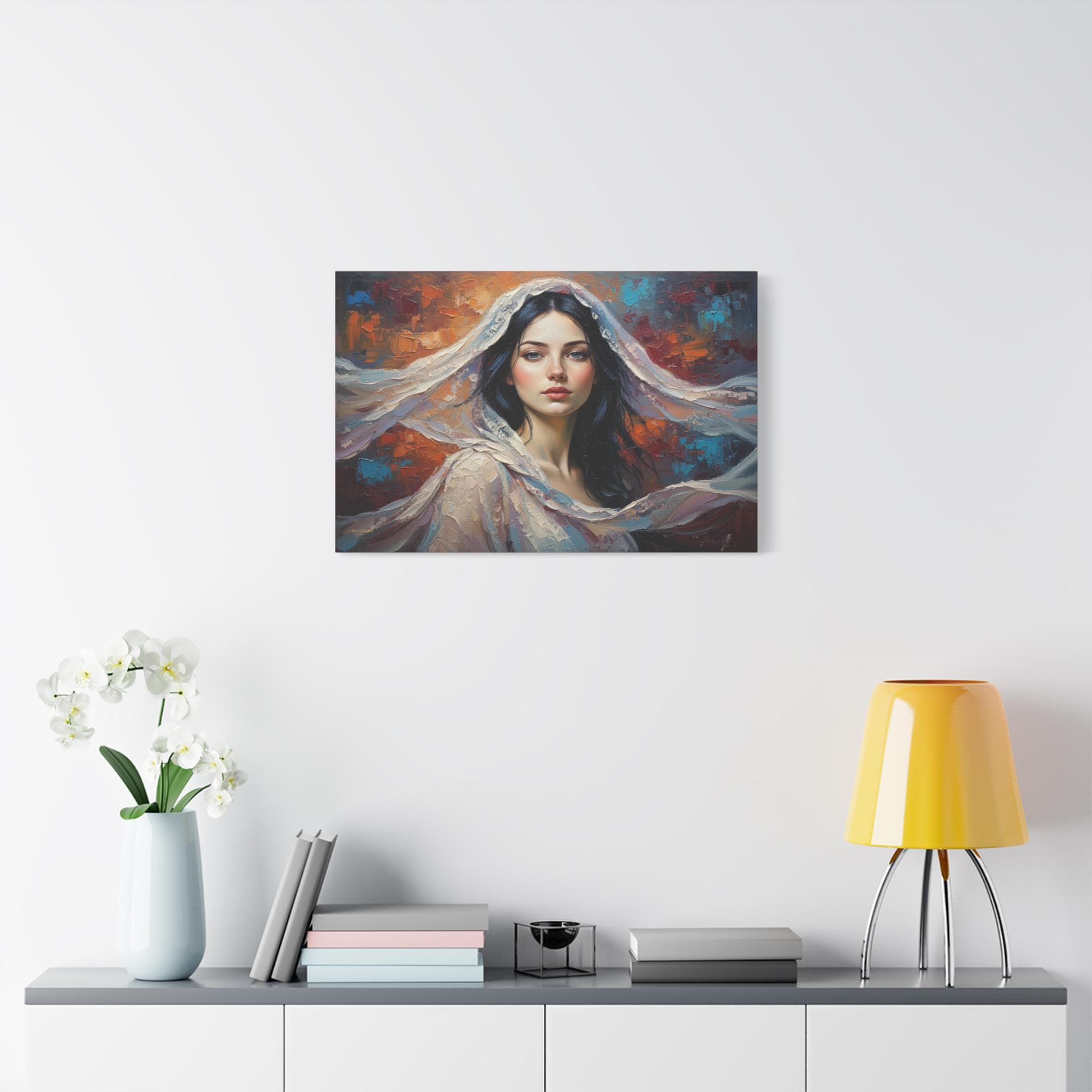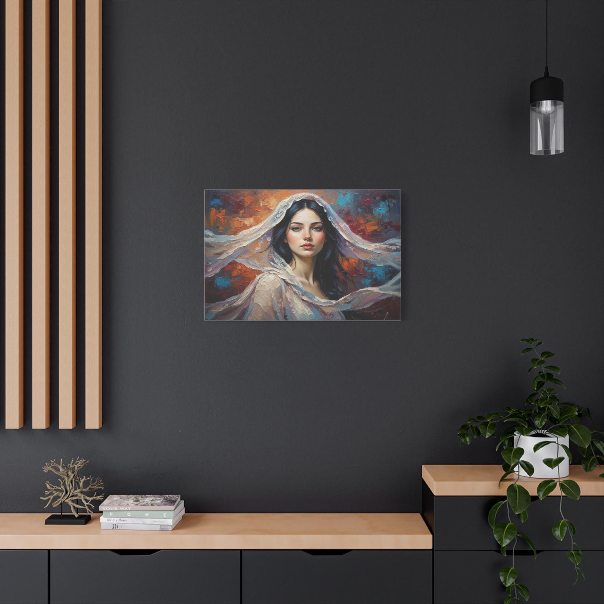 Bring captivating emotion and bold, contemporary energy into your space with this striking ethereal portrait canvas print. This gorgeous artwork features the soft, realistic face of a beautiful woman framed by flowing, sheer white fabric that sweeps across the canvas. She is set against a deeply textured, abstract background bursting with vibrant shades of rust orange, deep crimson, and cool teal blue.