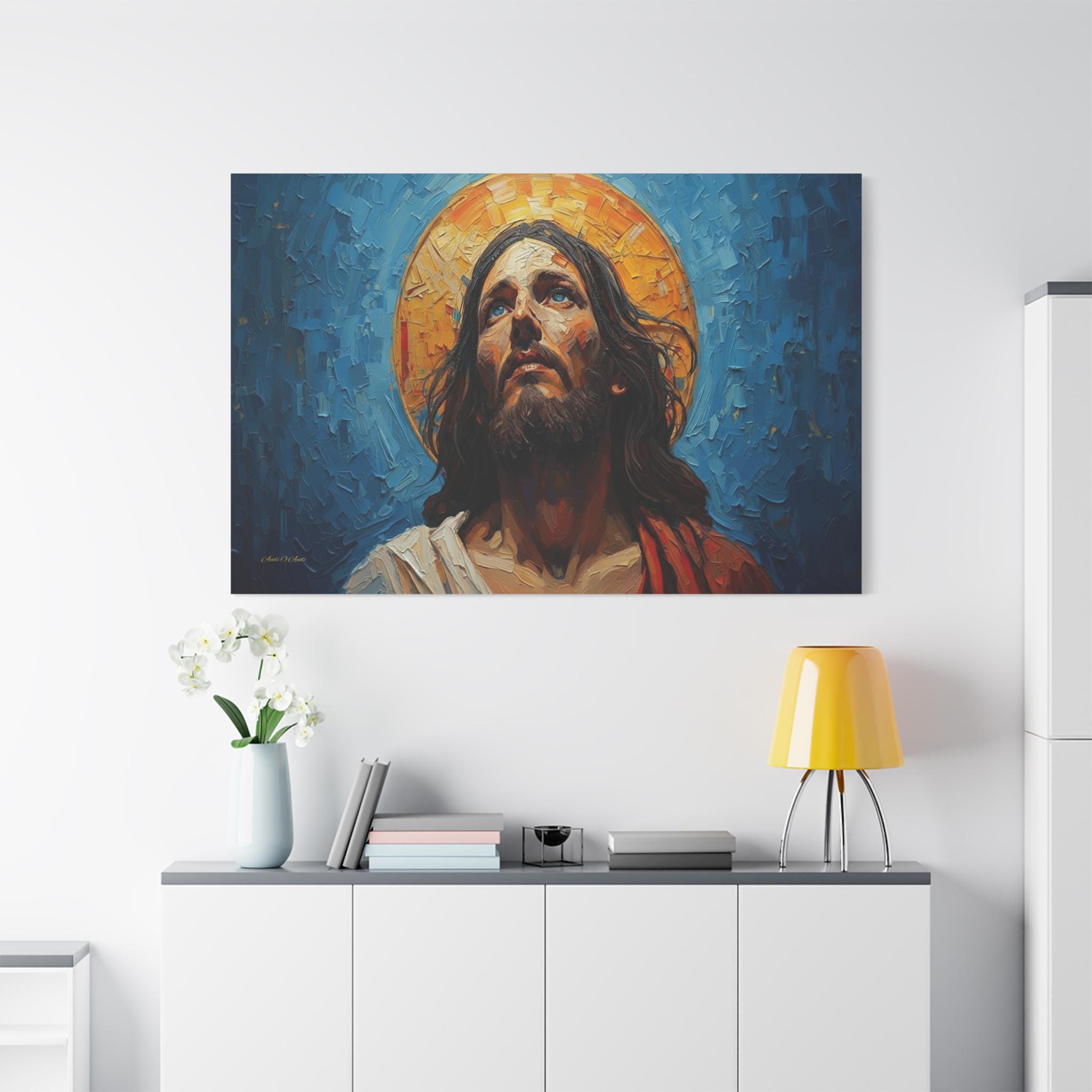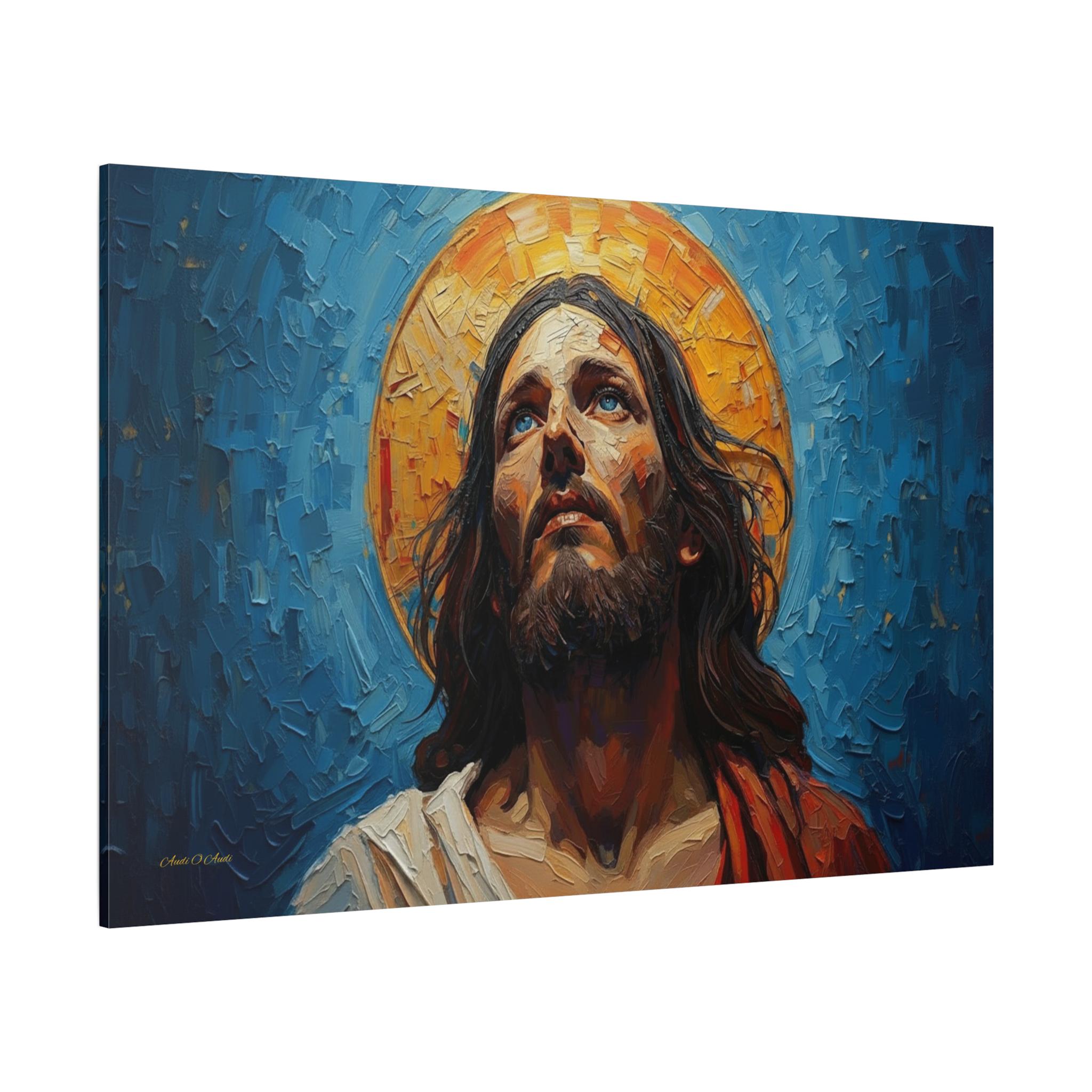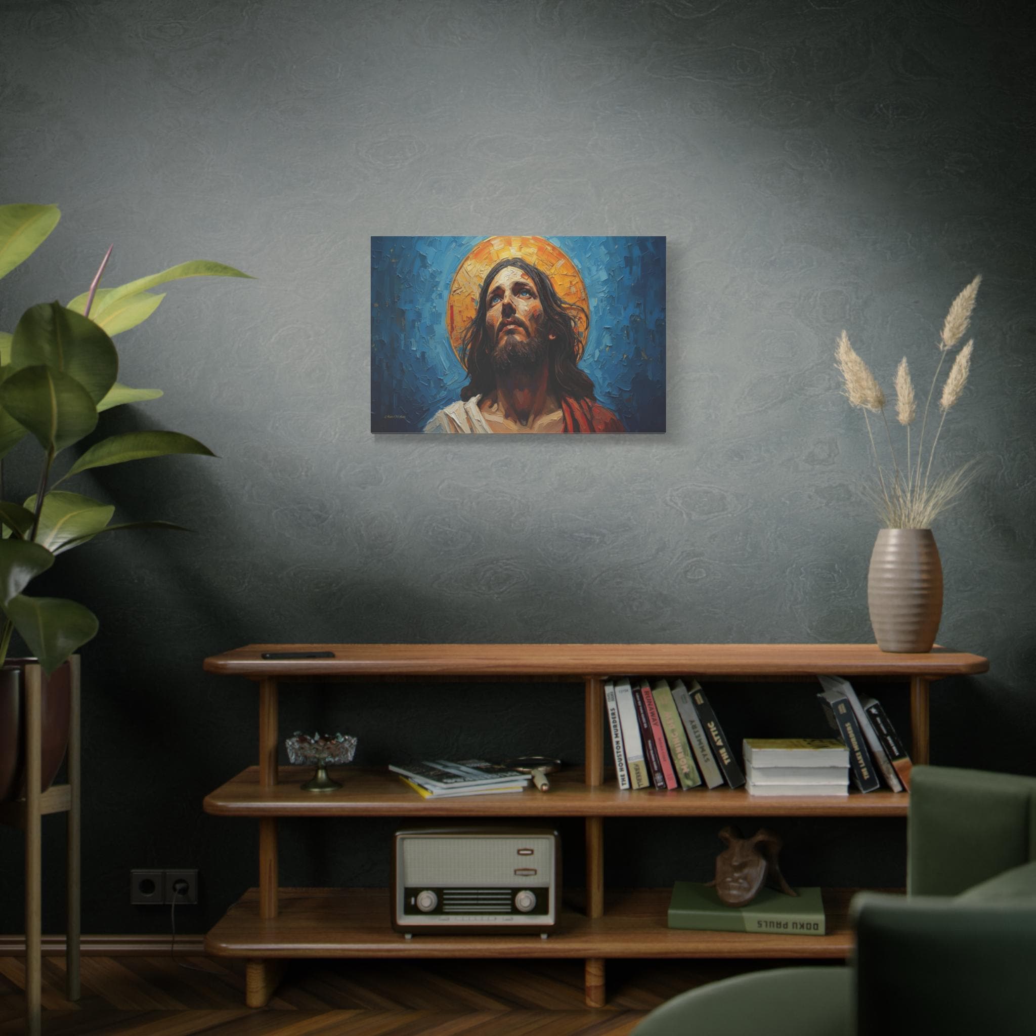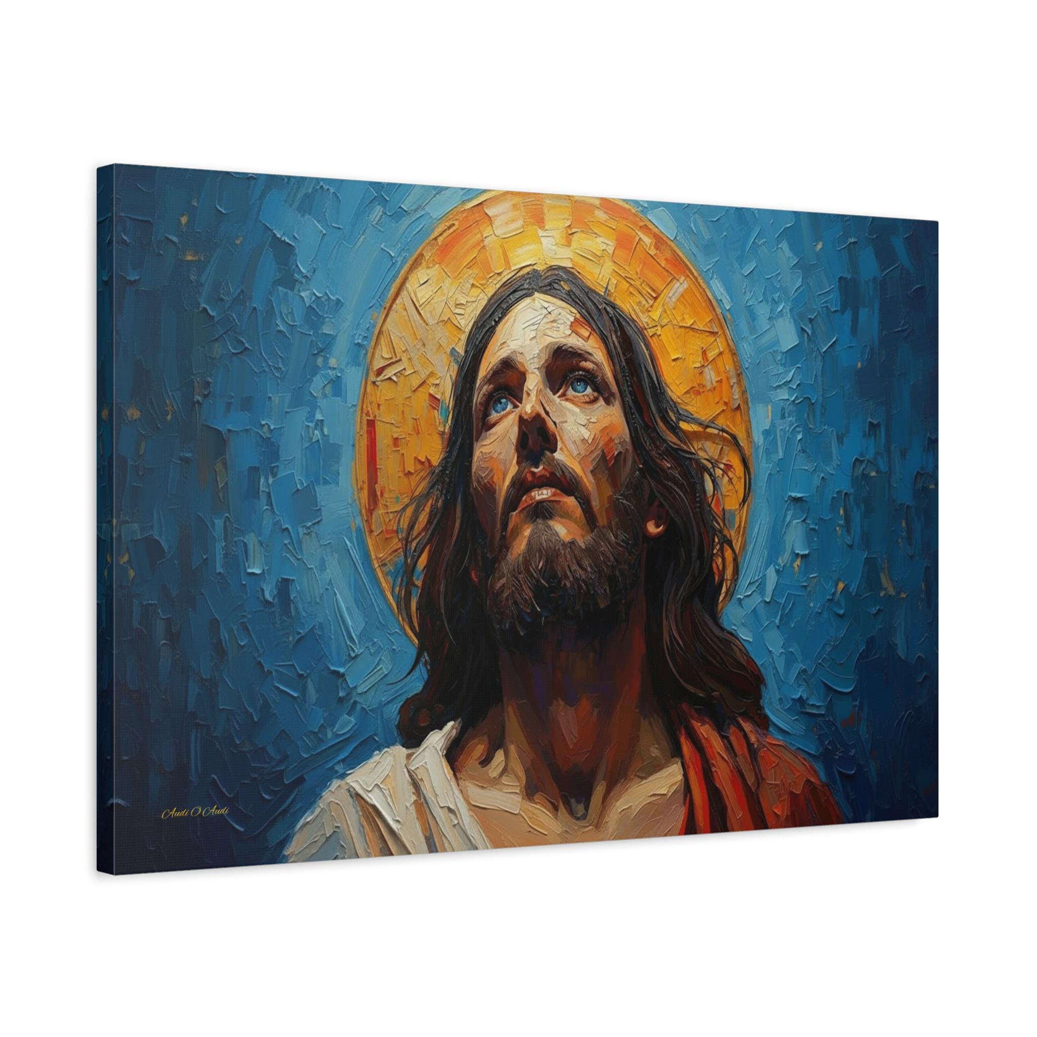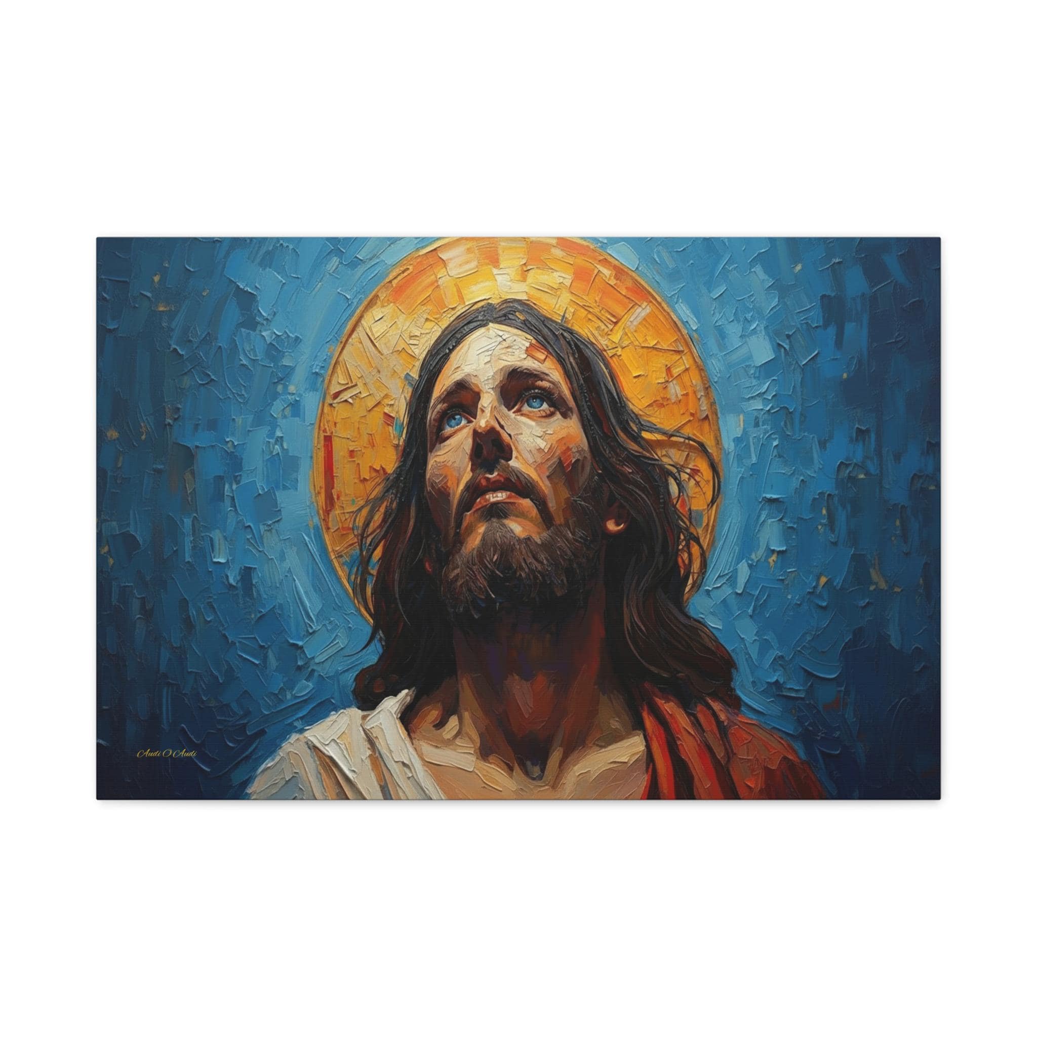 Bring profound inspiration and striking contemporary beauty into your home with this stunning Jesus Christ portrait canvas print. This captivating artwork features a deeply moving, upward-gazing portrait of Jesus, crowned by a radiant, heavily textured golden halo. The warm tones of His face and flowing garments are set beautifully against a rich, sweeping background of vibrant sapphire blue.