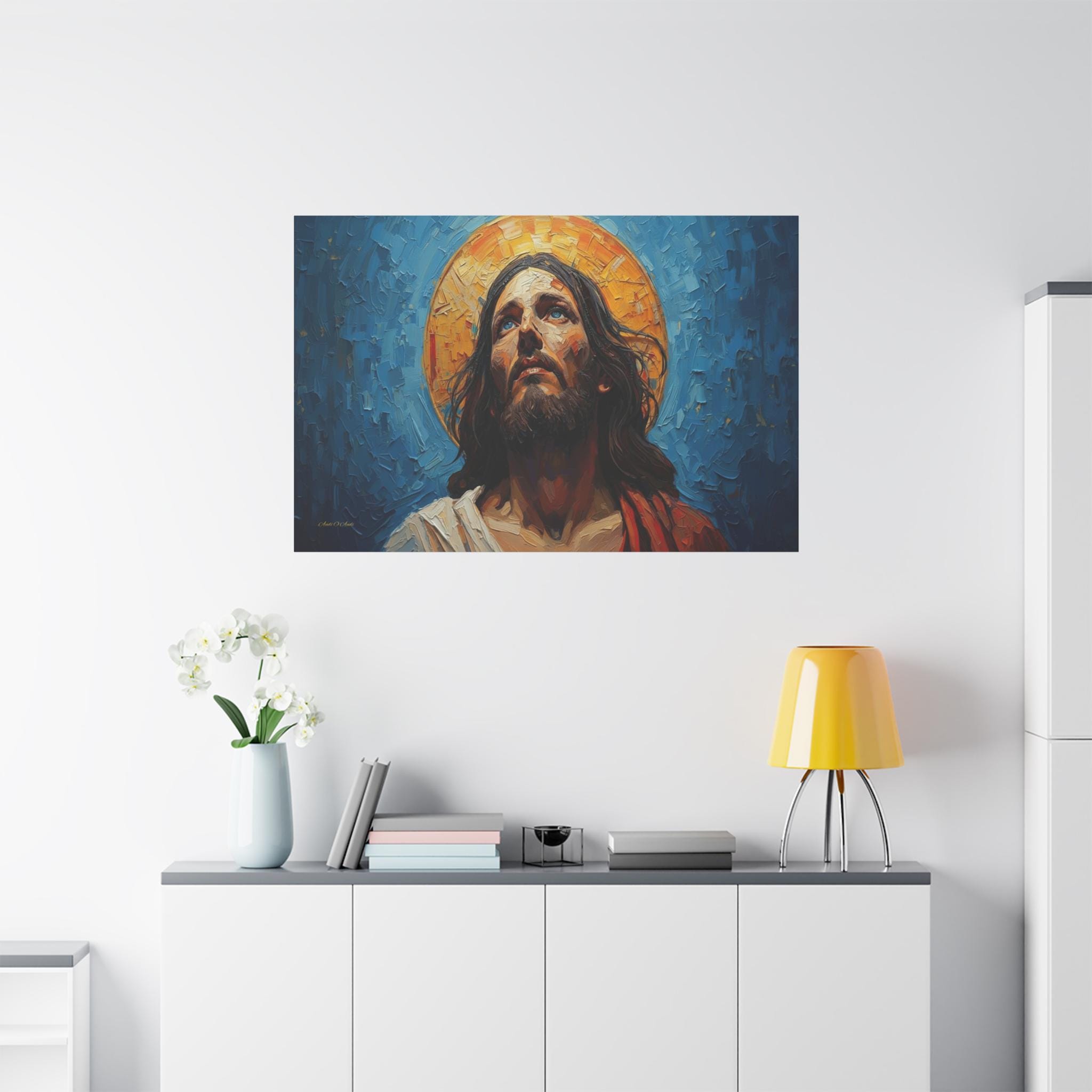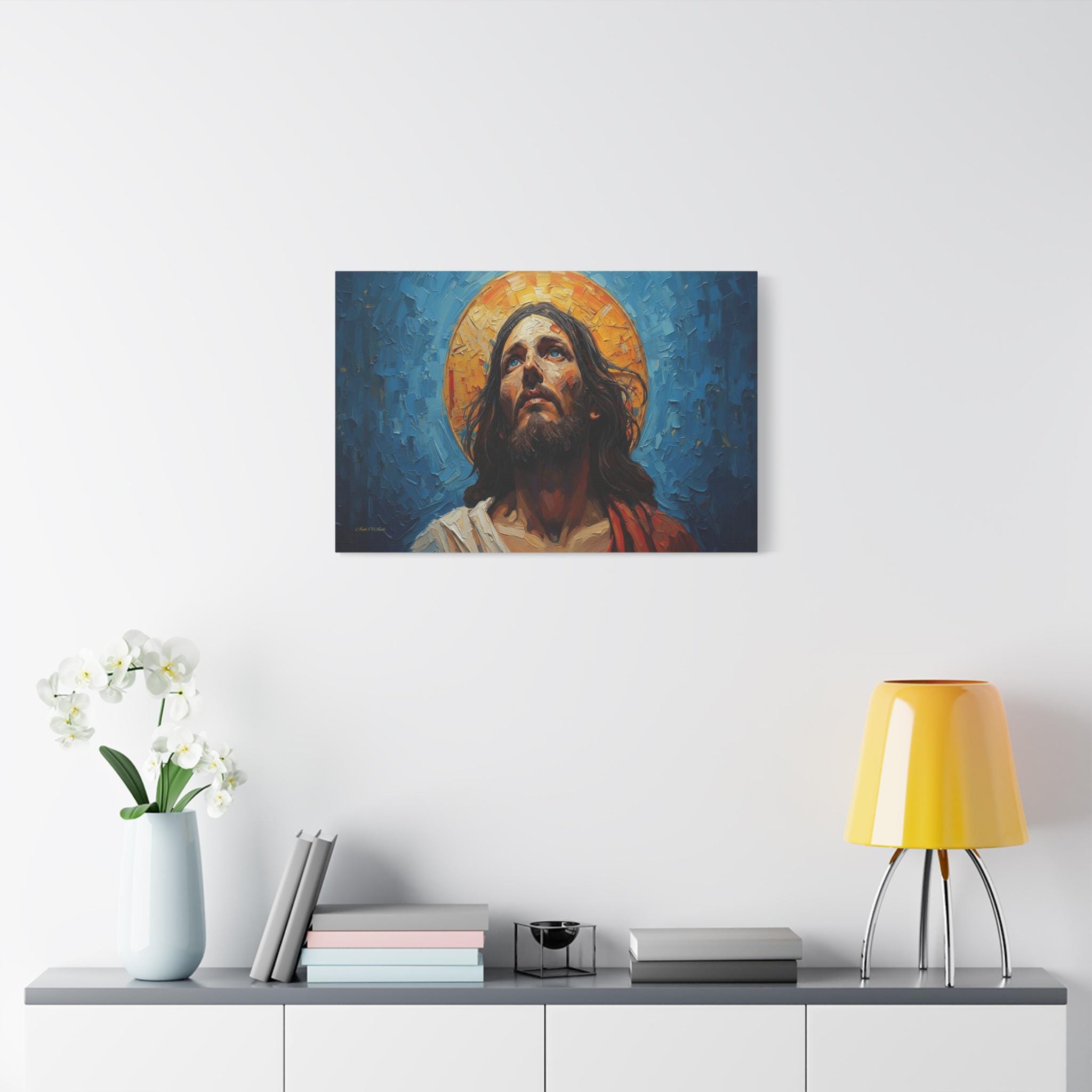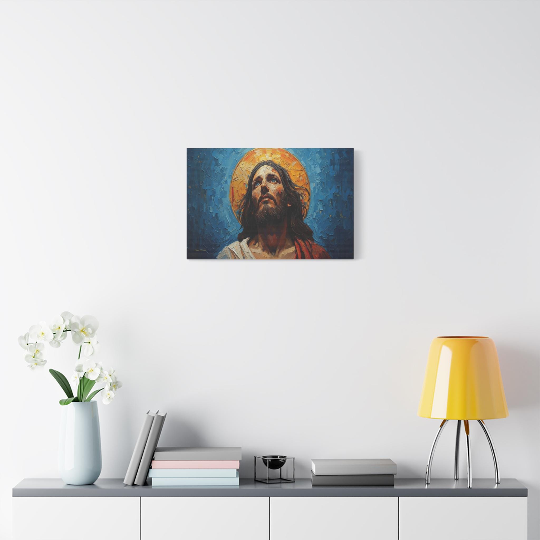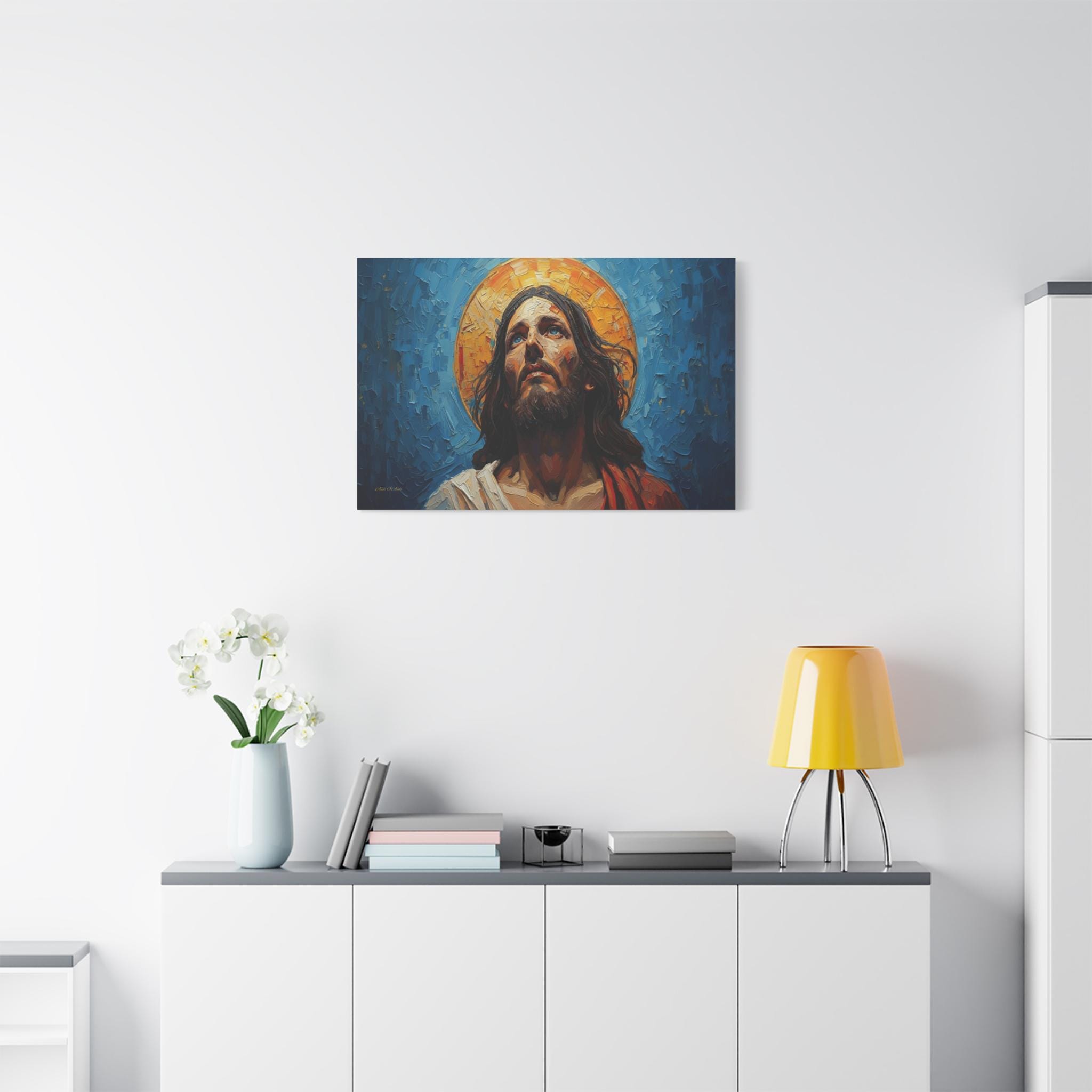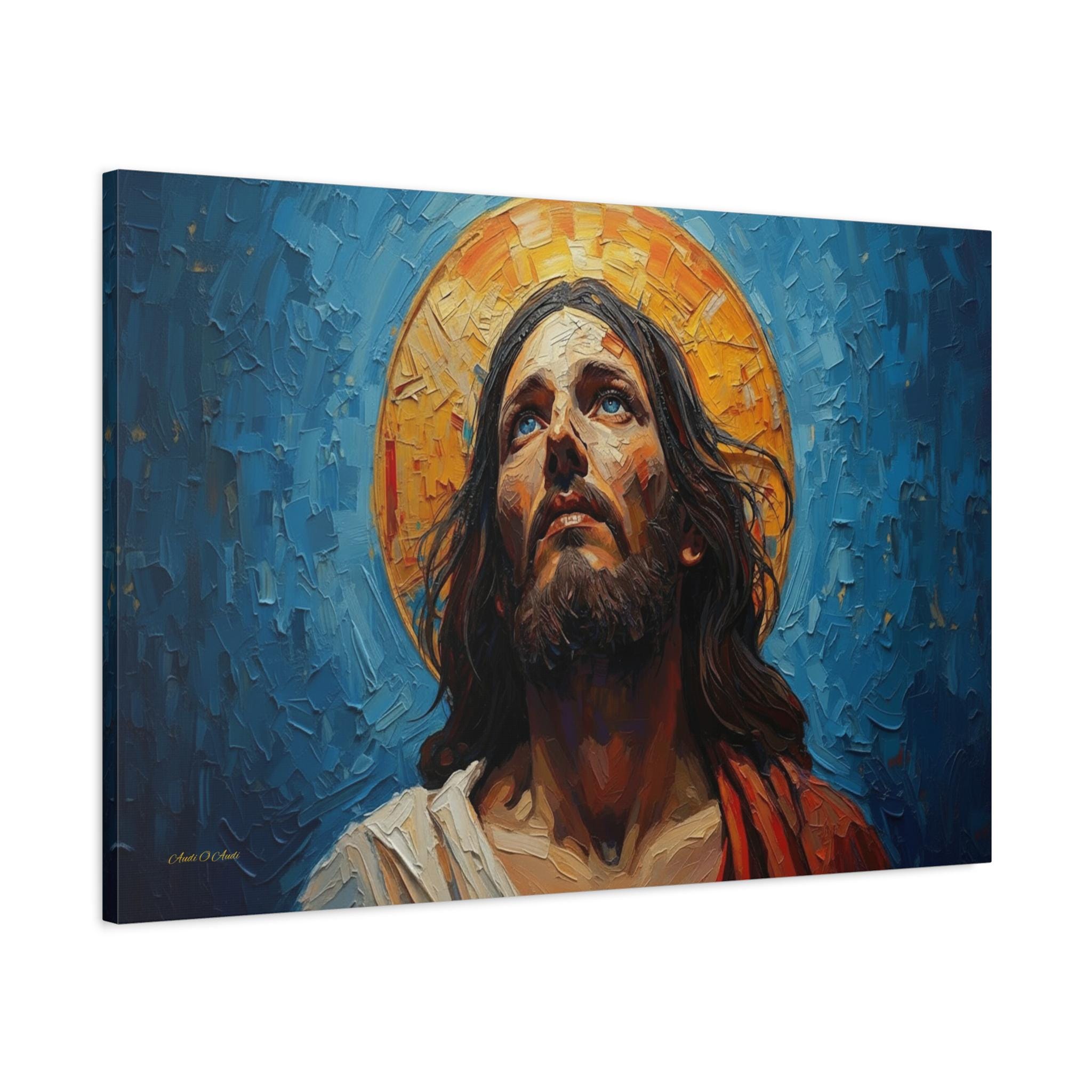 Bring profound inspiration and striking contemporary beauty into your home with this stunning Jesus Christ portrait canvas print. This captivating artwork features a deeply moving, upward-gazing portrait of Jesus, crowned by a radiant, heavily textured golden halo. The warm tones of His face and flowing garments are set beautifully against a rich, sweeping background of vibrant sapphire blue.