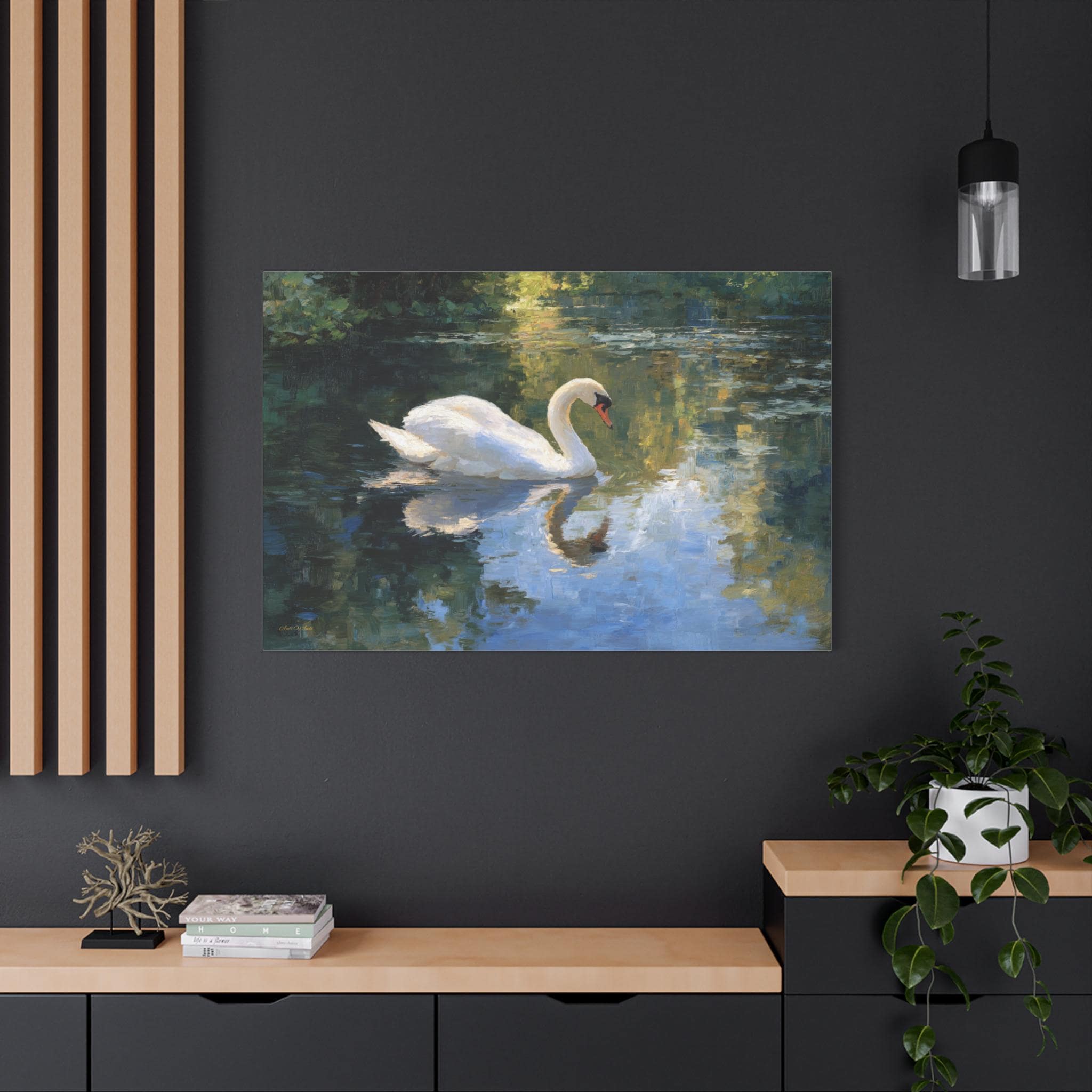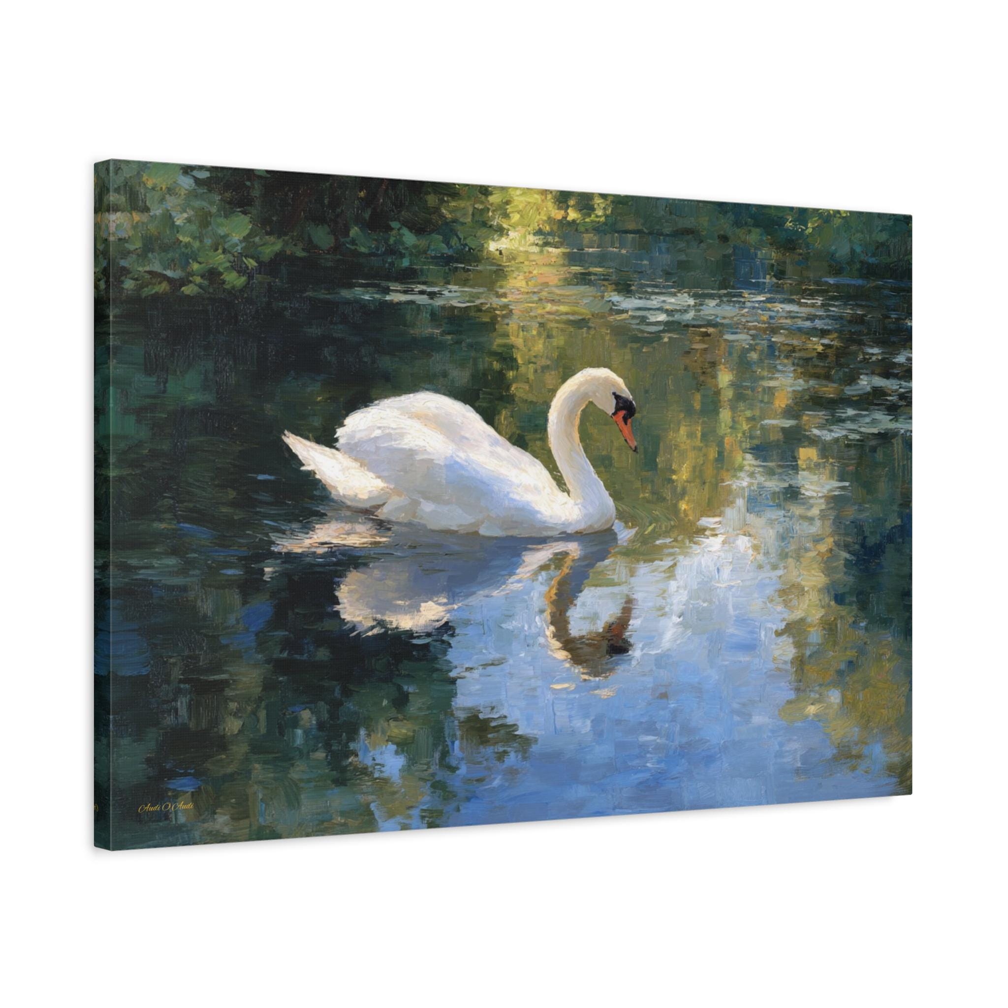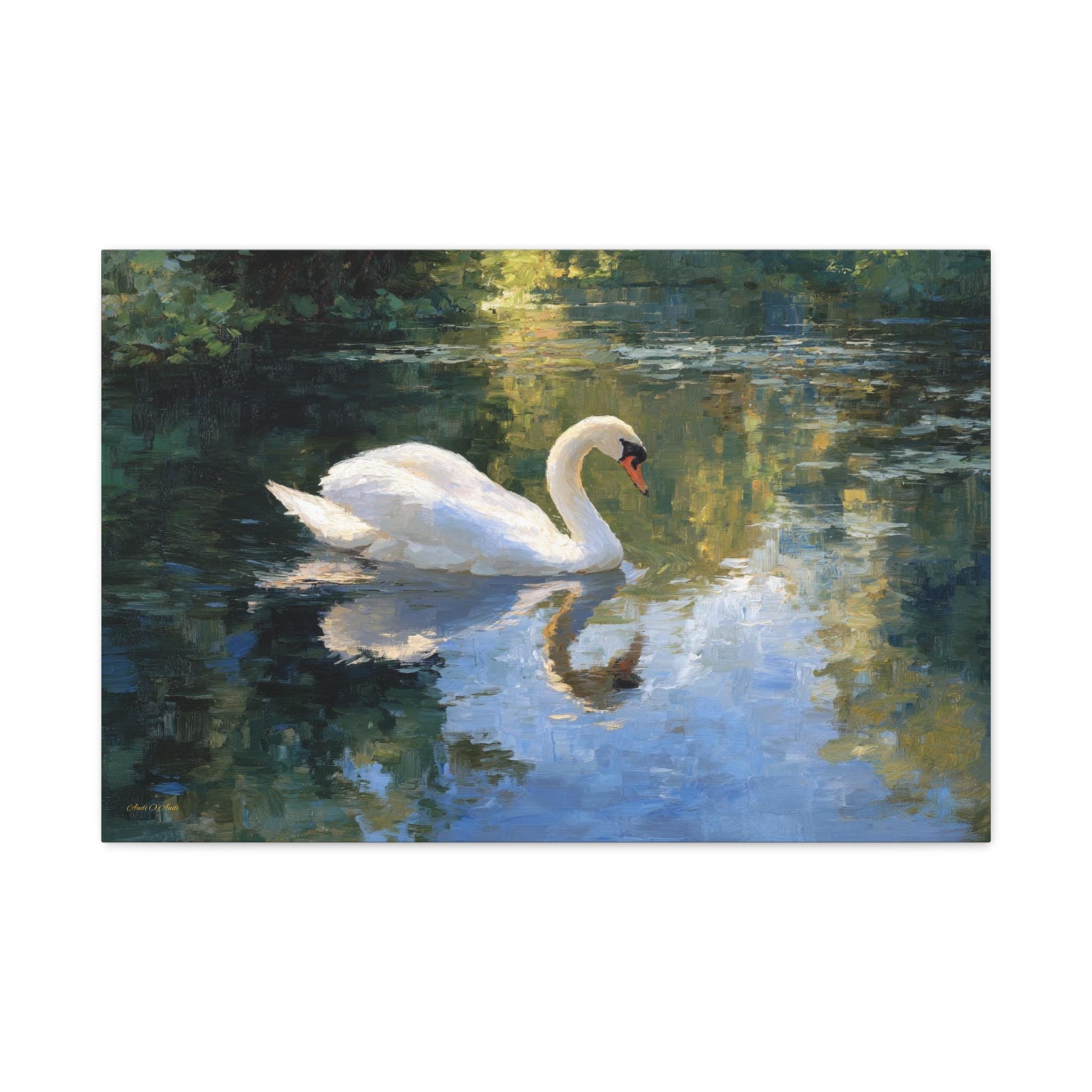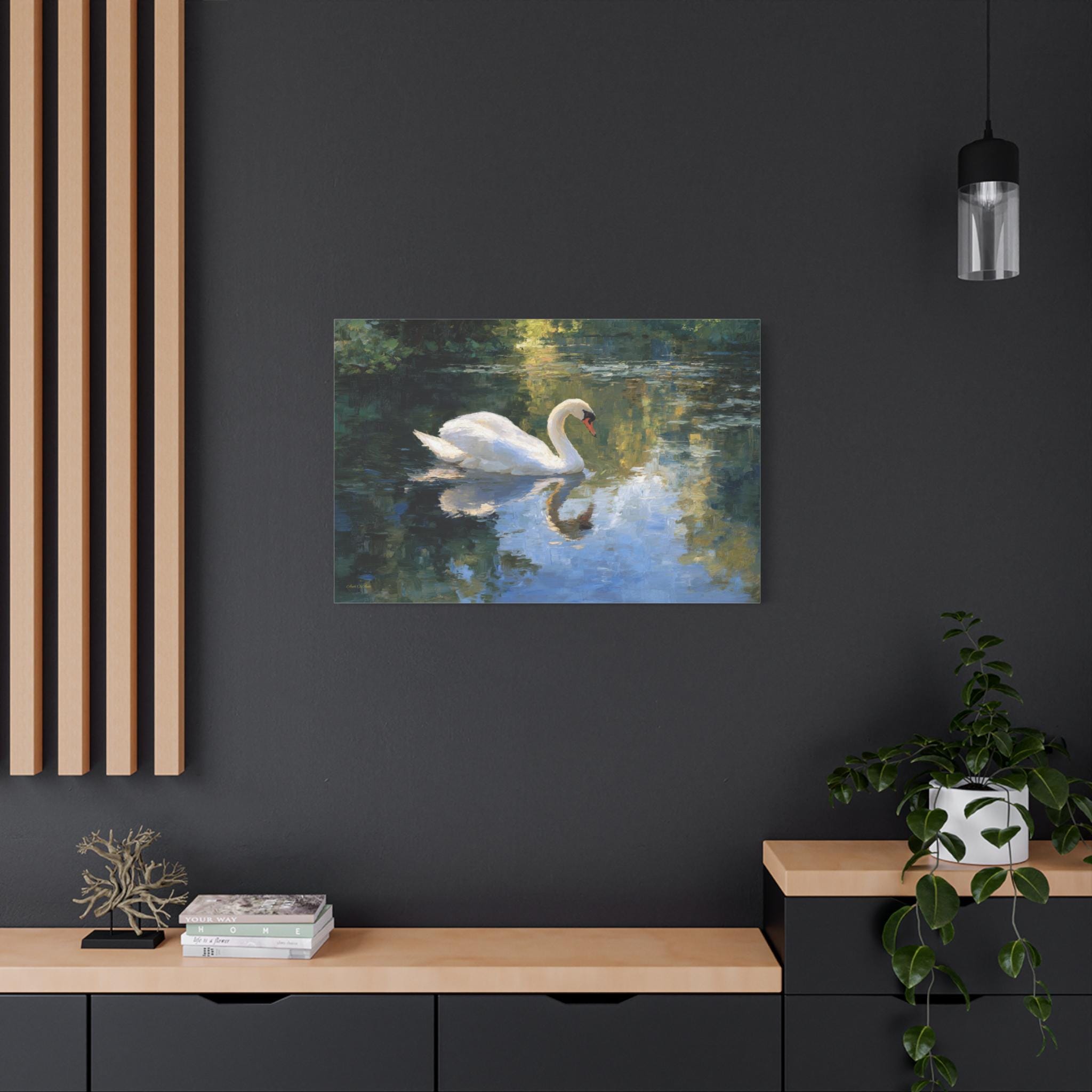 Bring the profound peace and classic elegance of nature into your home with this stunning impressionist swan canvas print. This captivating artwork features a graceful white swan gliding effortlessly across a tranquil pond. The scene is beautifully illuminated by dappled golden sunlight, creating a mesmerizing reflection in the deep, moody blue and green water.