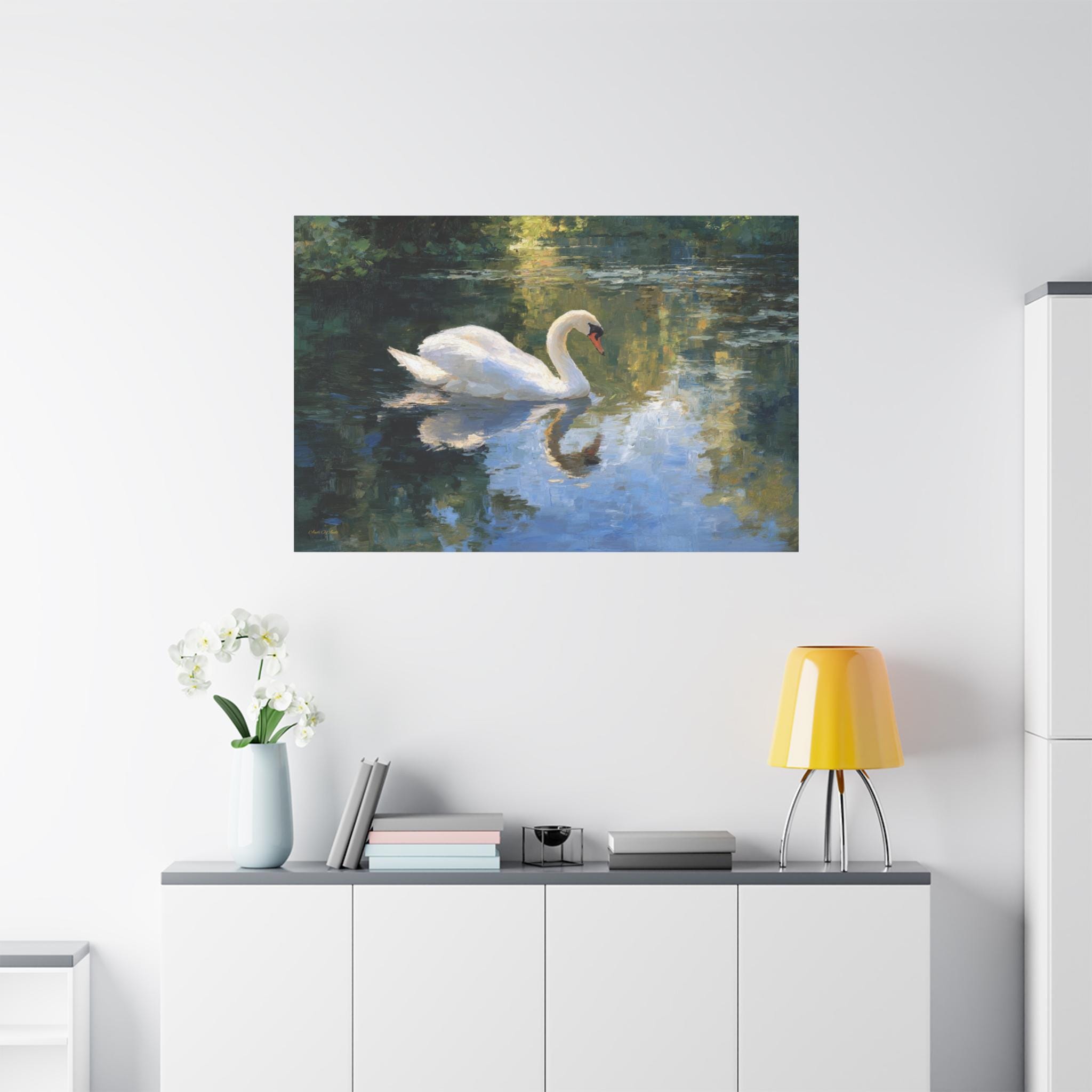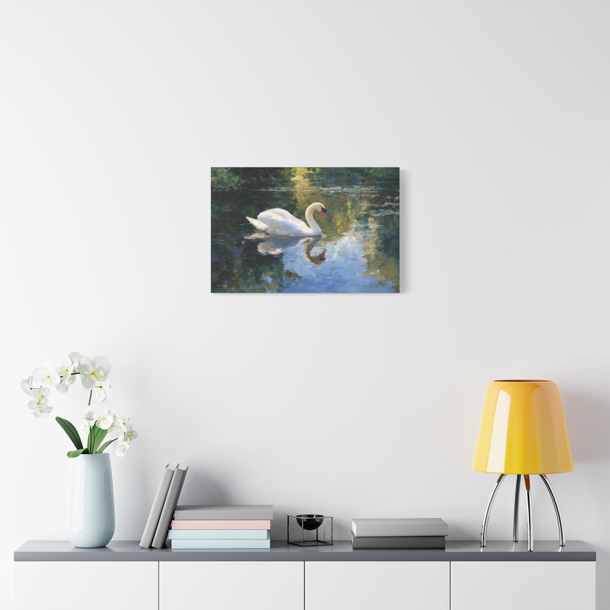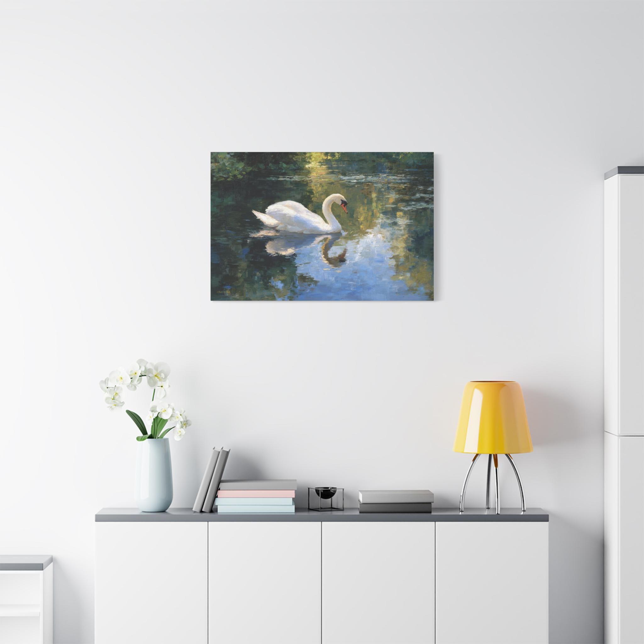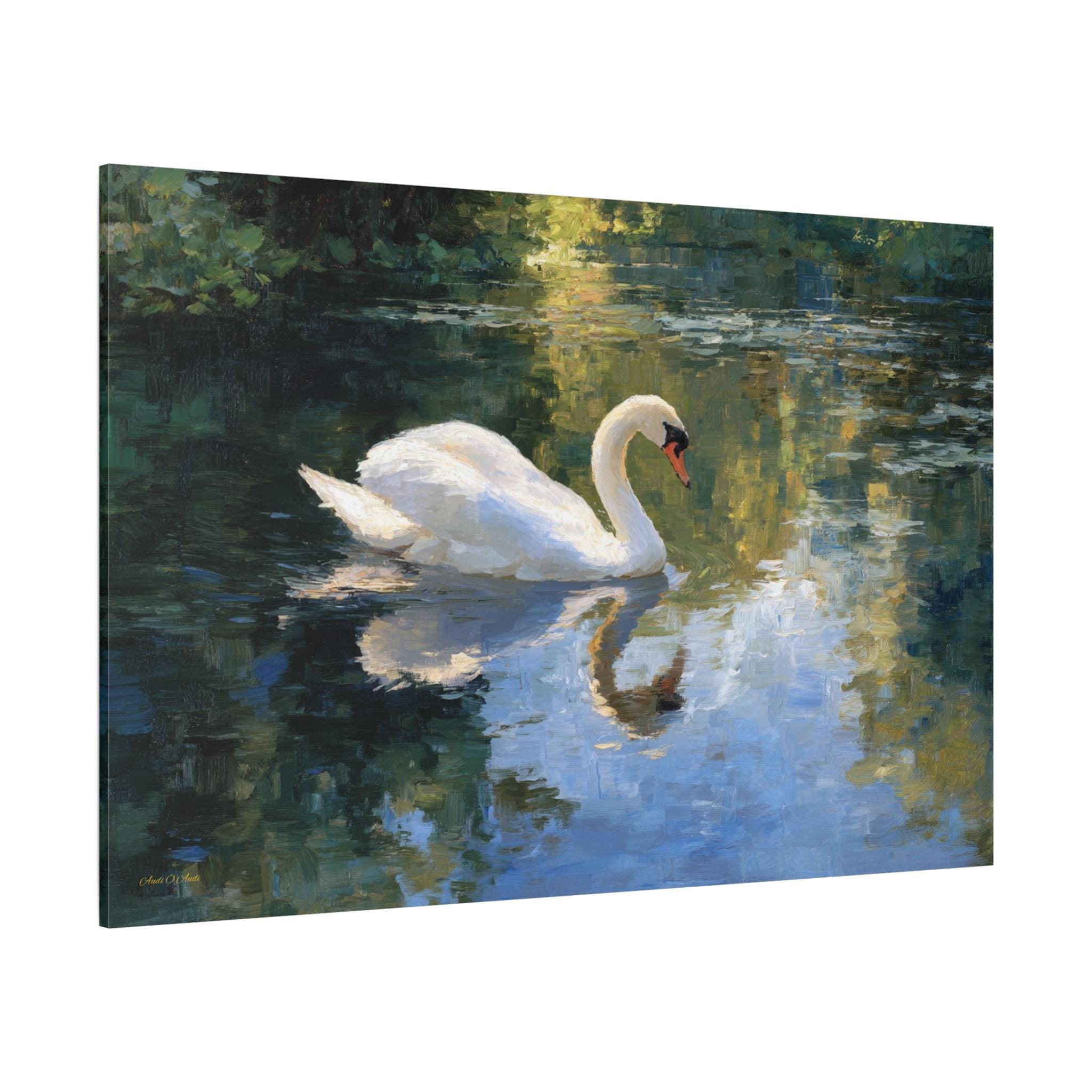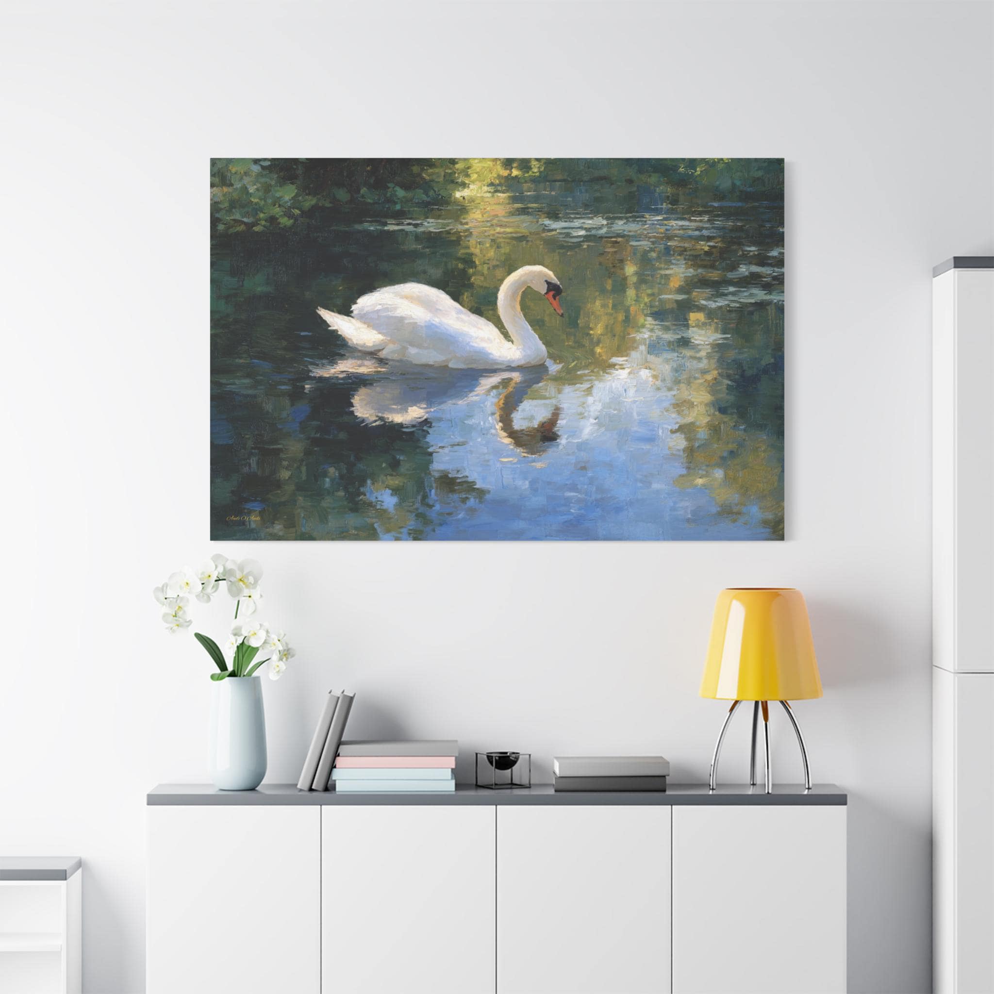 Bring the profound peace and classic elegance of nature into your home with this stunning impressionist swan canvas print. This captivating artwork features a graceful white swan gliding effortlessly across a tranquil pond. The scene is beautifully illuminated by dappled golden sunlight, creating a mesmerizing reflection in the deep, moody blue and green water.