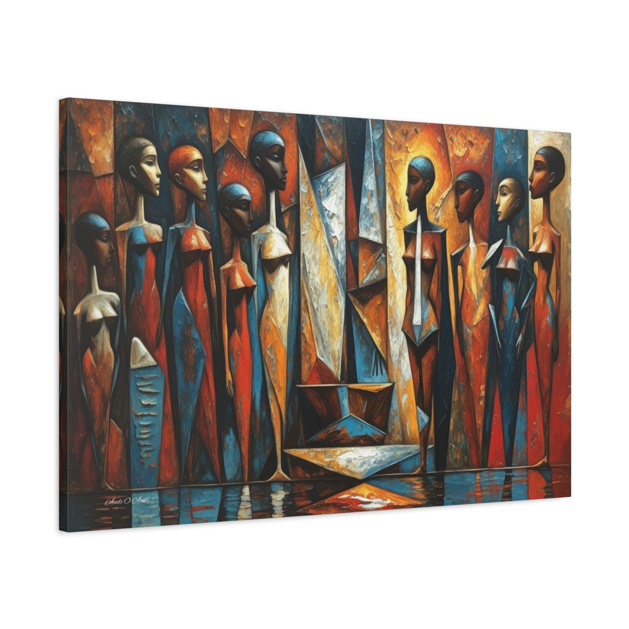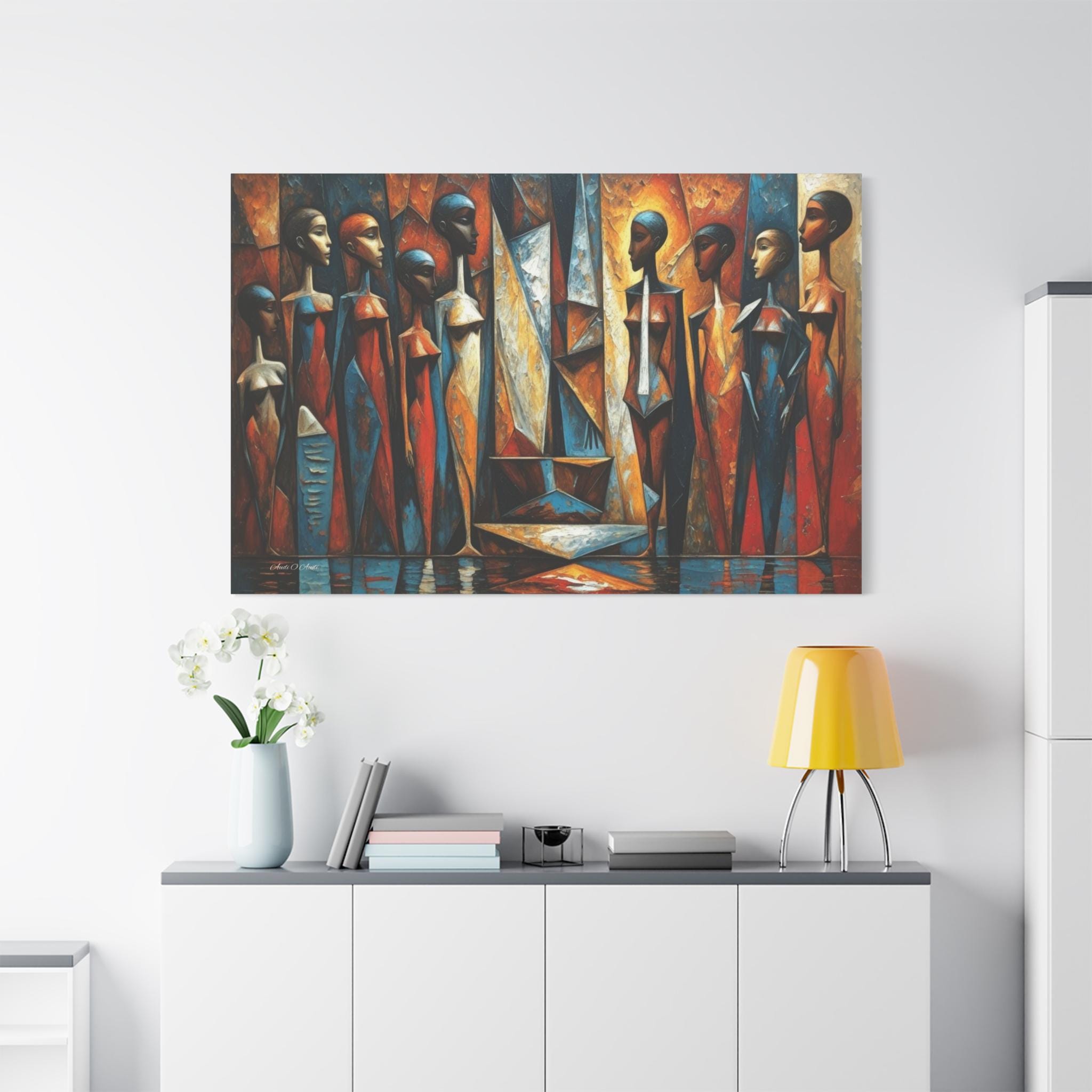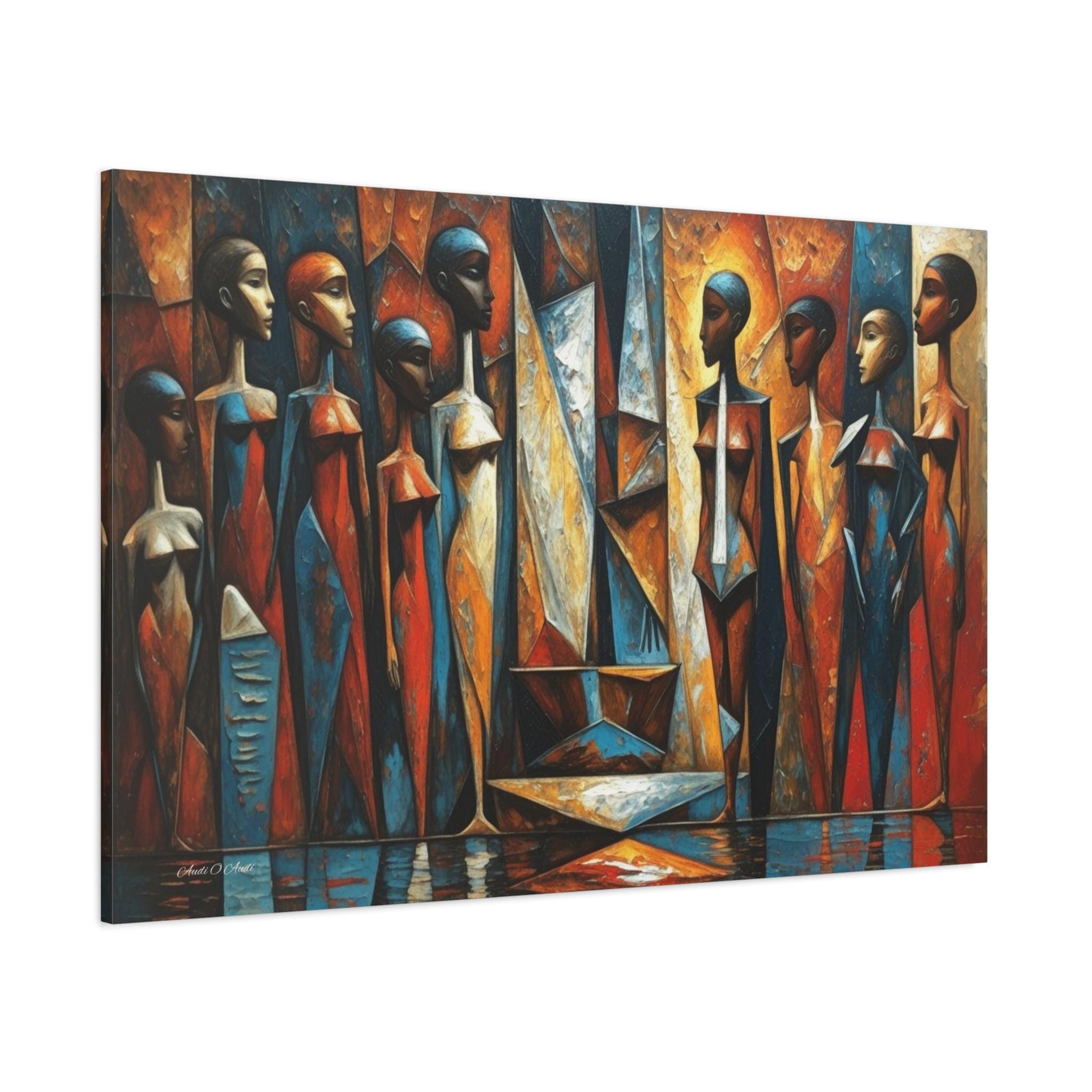 Bring powerful cultural elegance and bold, geometric modernism into your space with this stunning African cubist canvas print. This captivating horizontal artwork features a rhythmic gathering of elongated, stylized female figures rendered in a masterful Cubist aesthetic. The composition bursts with a vibrant, earthy color palette of rich rust oranges, warm golds, and deep, contrasting sapphire blues.
