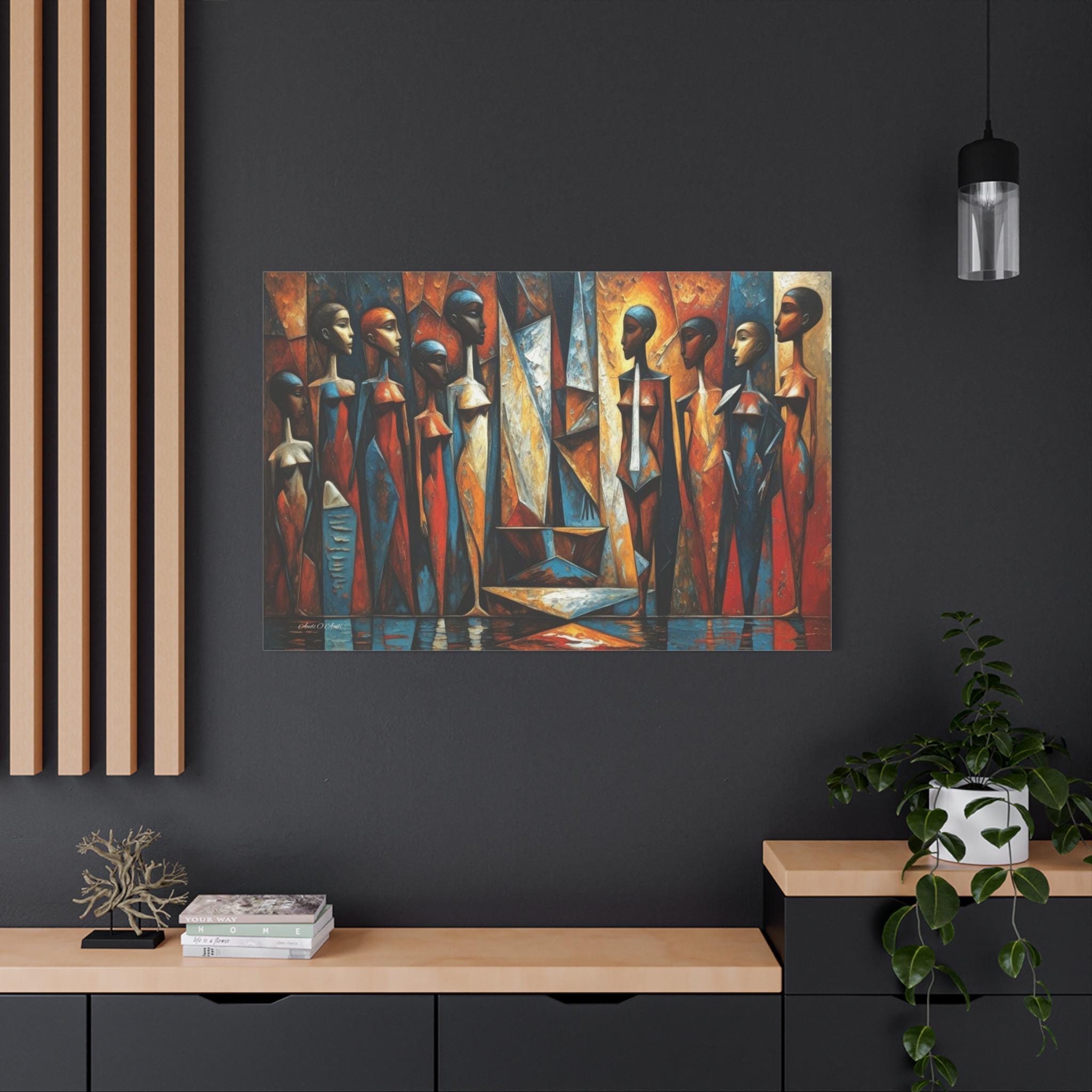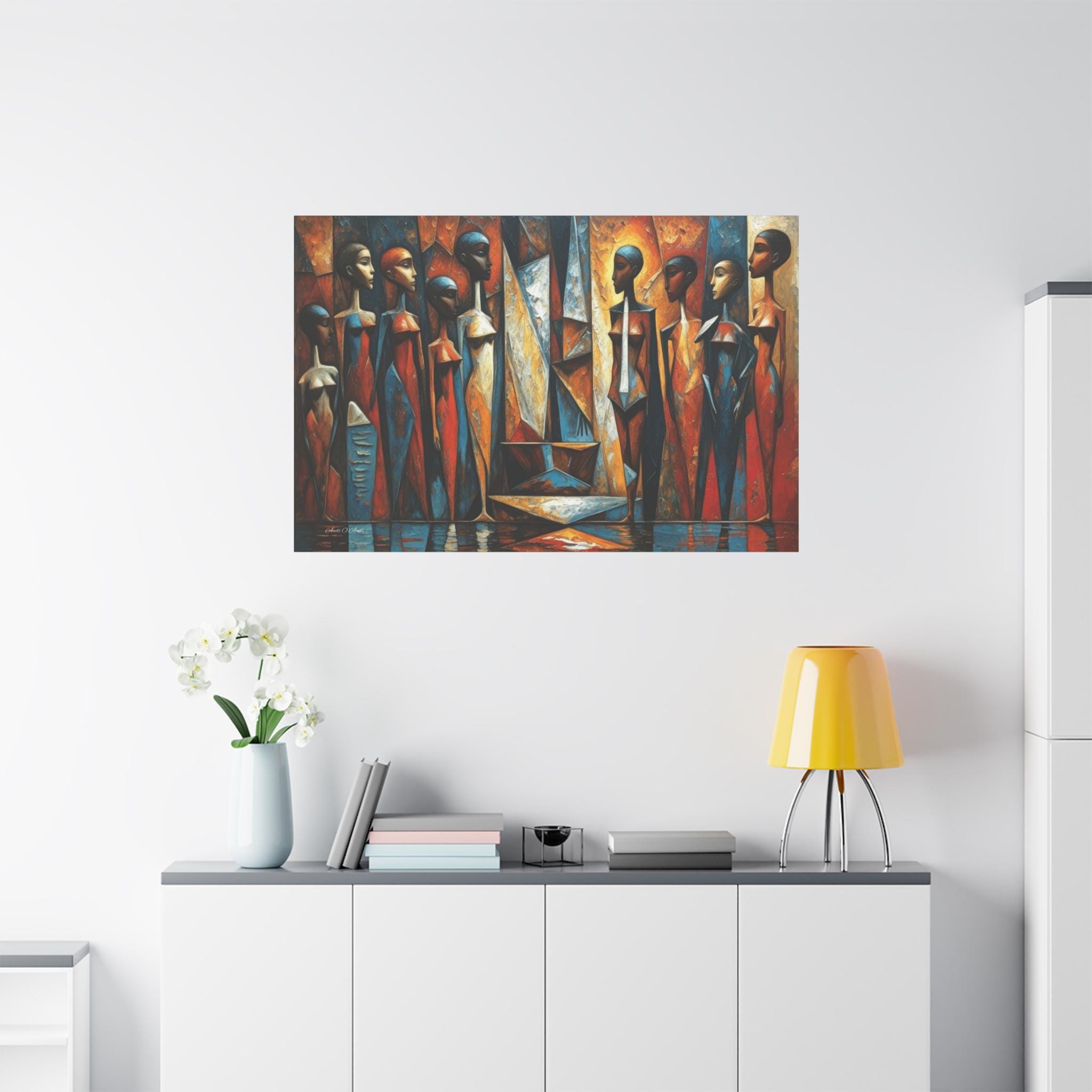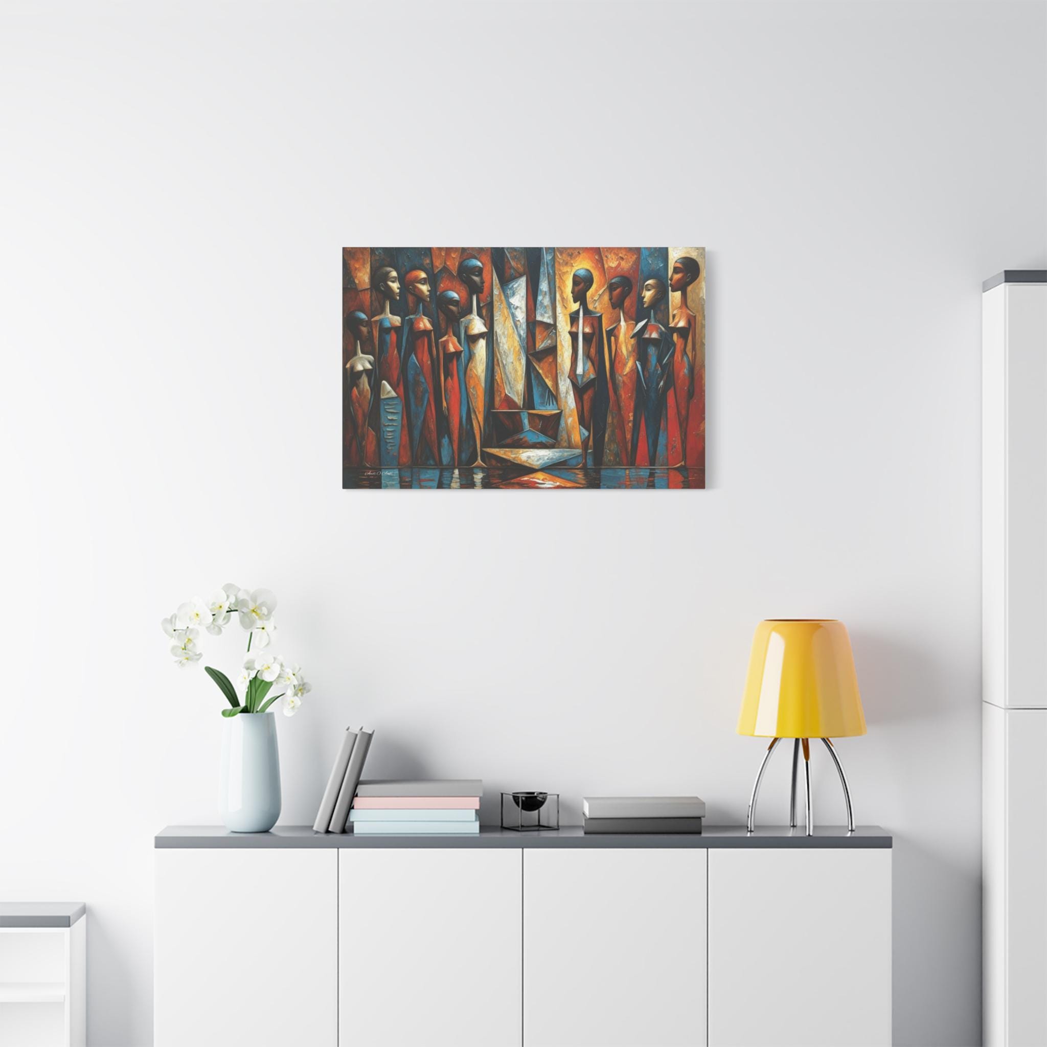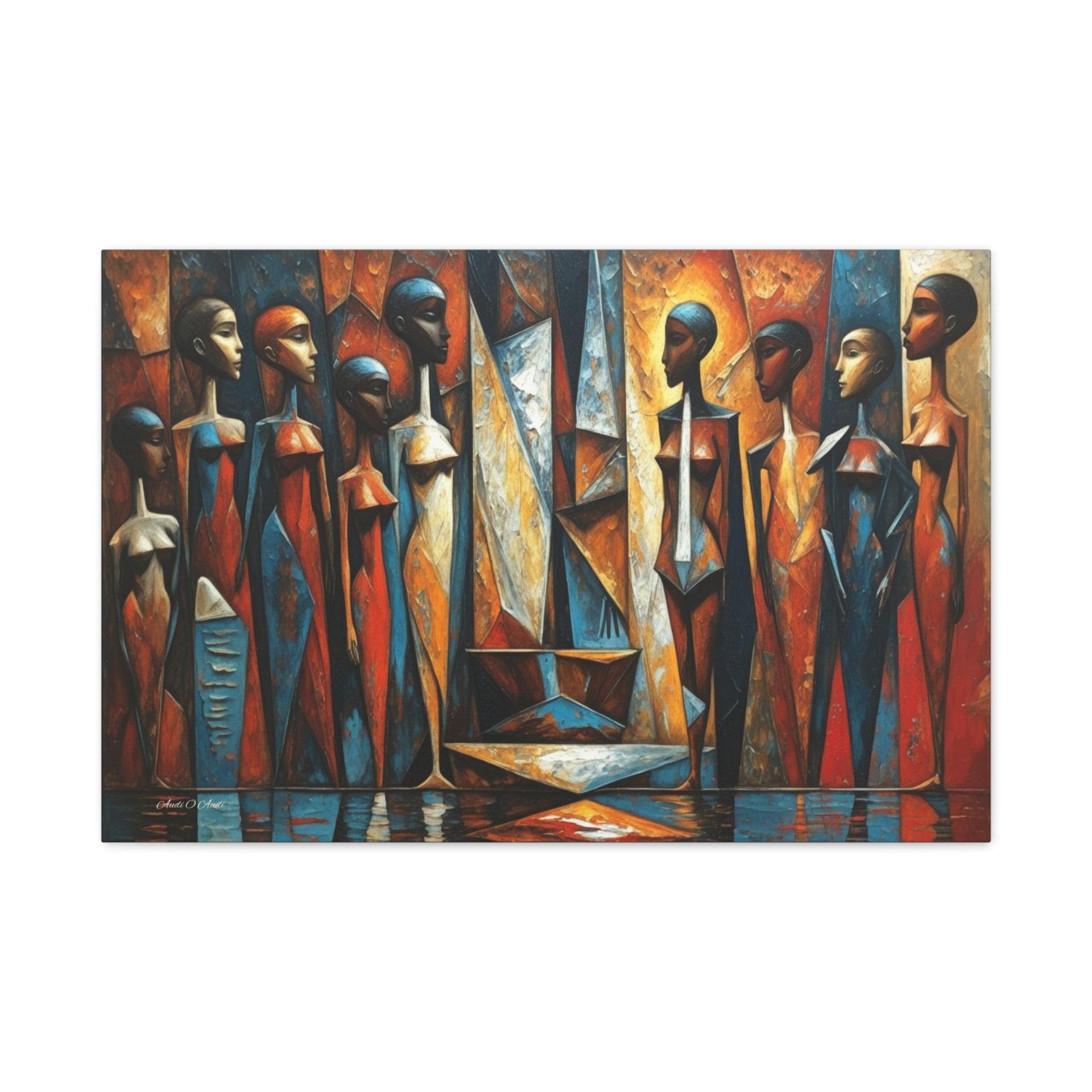 Bring powerful cultural elegance and bold, geometric modernism into your space with this stunning African cubist canvas print. This captivating horizontal artwork features a rhythmic gathering of elongated, stylized female figures rendered in a masterful Cubist aesthetic. The composition bursts with a vibrant, earthy color palette of rich rust oranges, warm golds, and deep, contrasting sapphire blues.