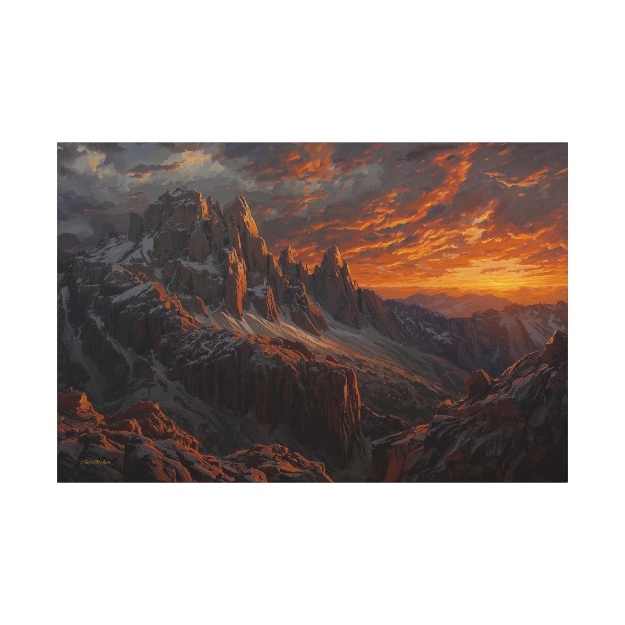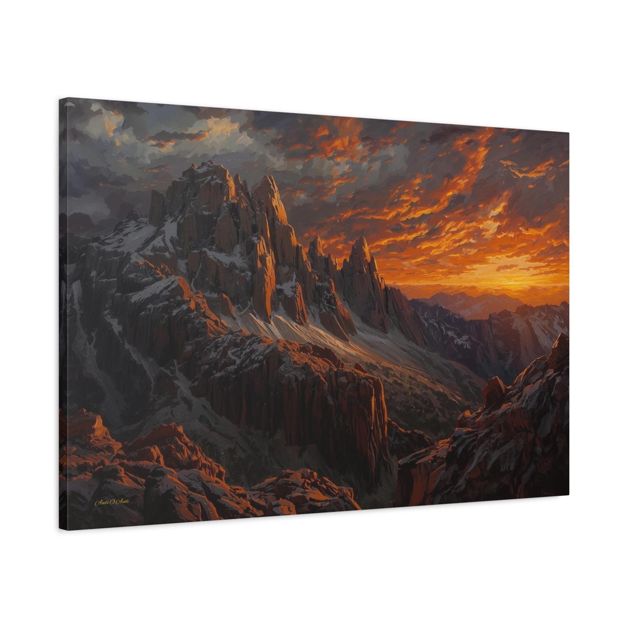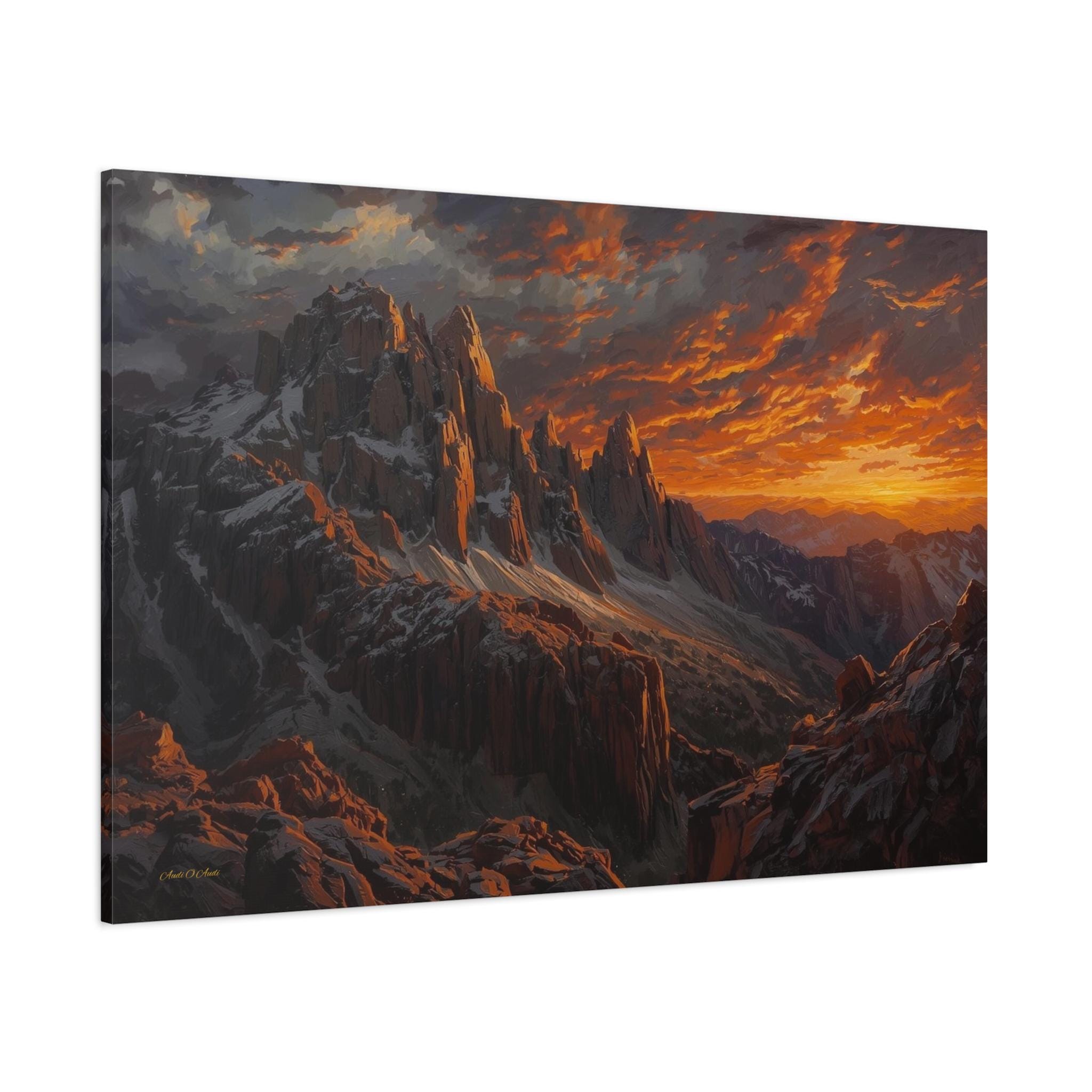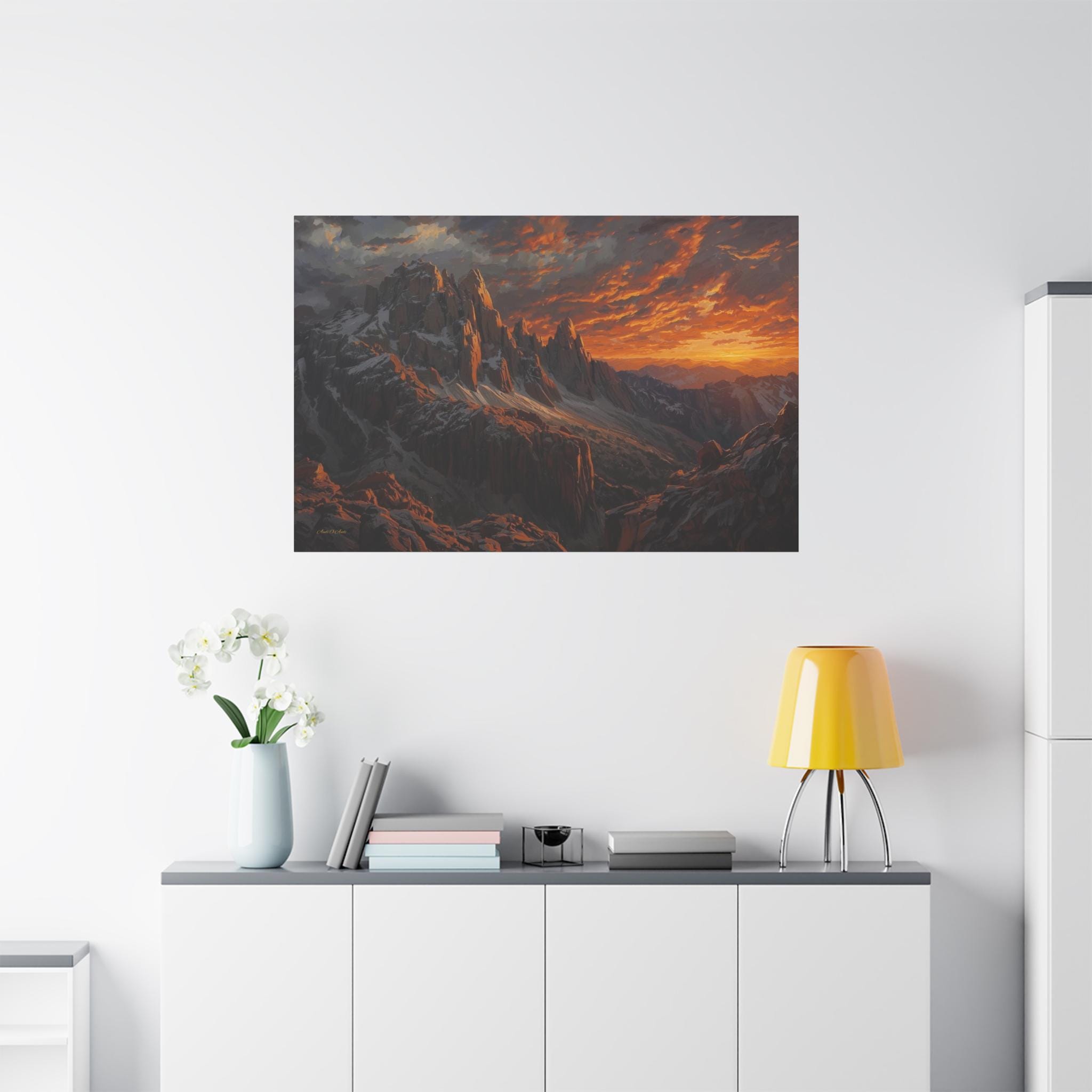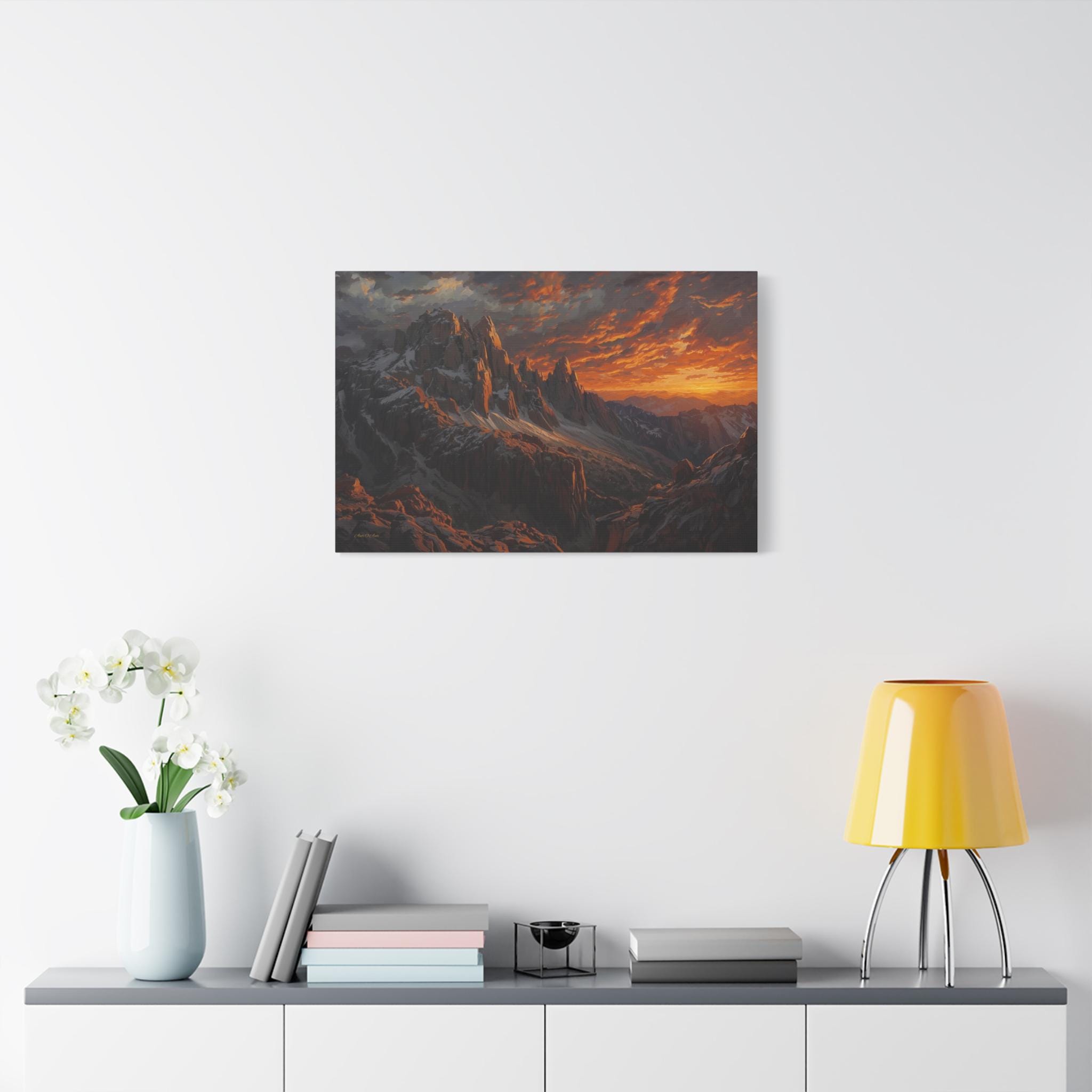 Bring the awe-inspiring, raw power of nature into your space with this stunning dramatic mountain sunset canvas print. This captivating artwork features rugged, jagged mountain peaks dusted with snow, towering beneath an incredibly dynamic sky ablaze with fiery oranges, deep reds, and glowing golds. The intense light of the setting sun casts magnificent, warm highlights across the dark, moody stone of the mountain face.