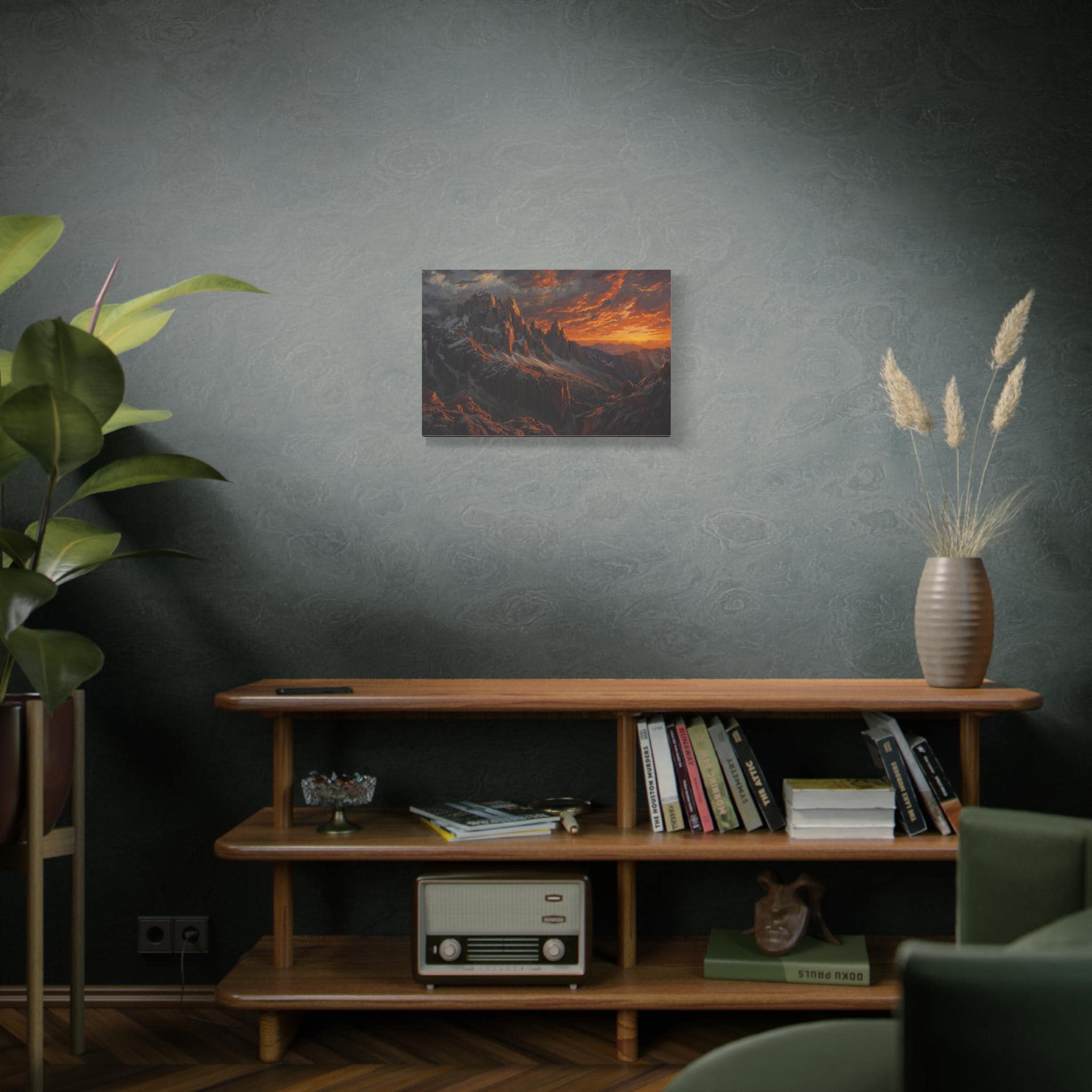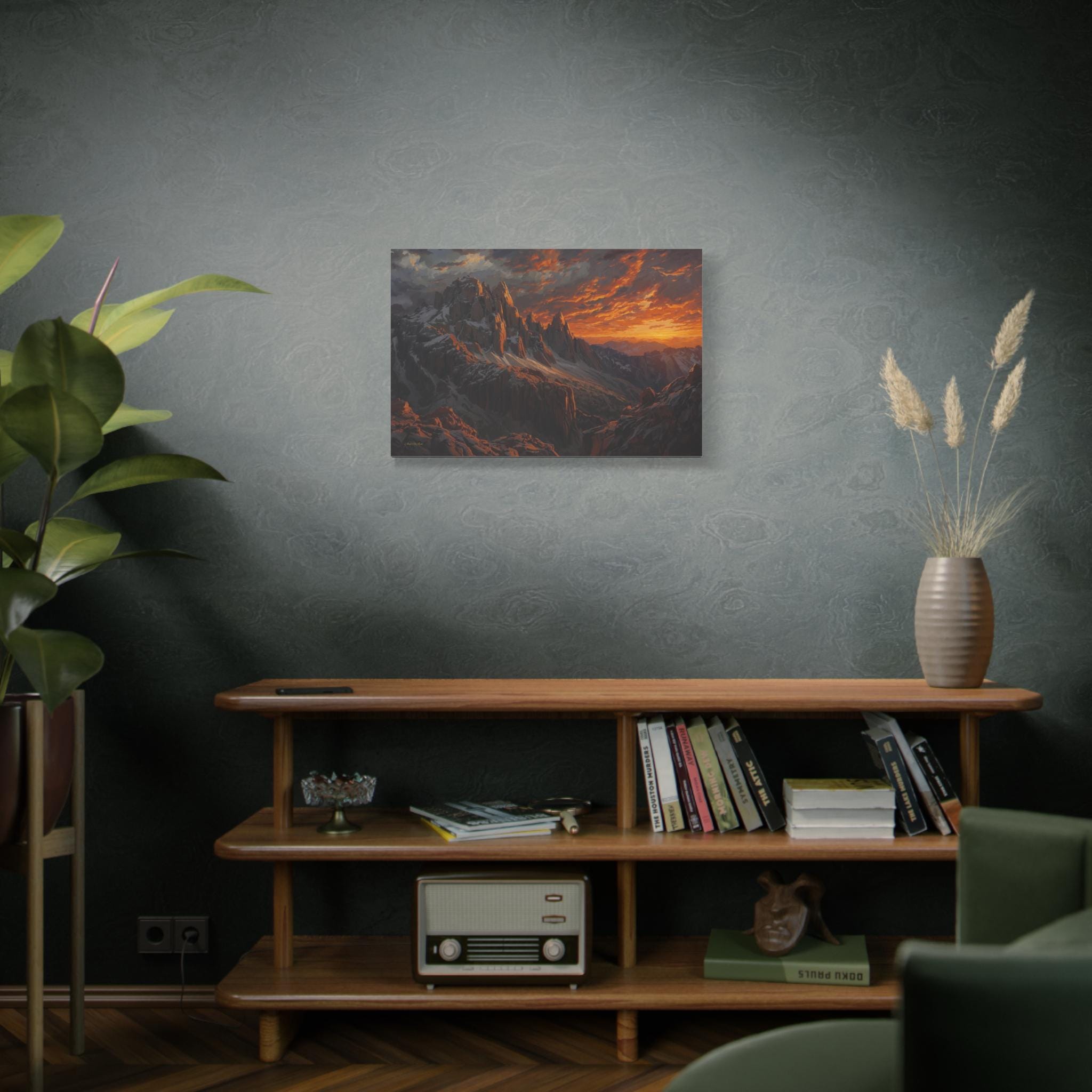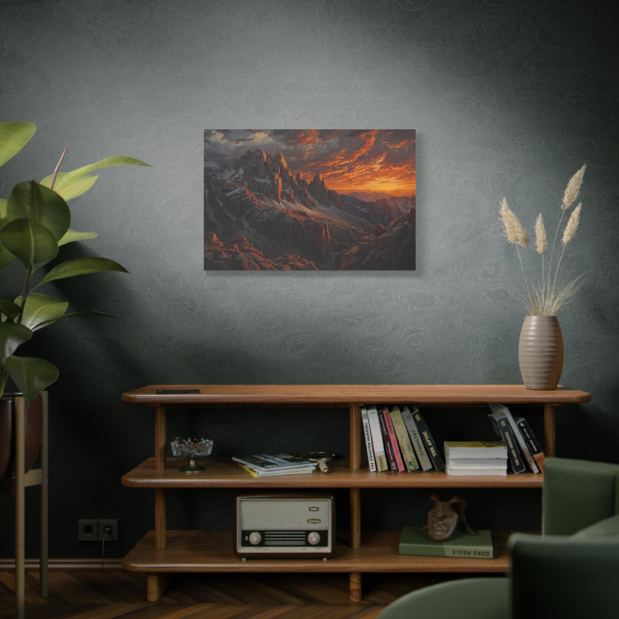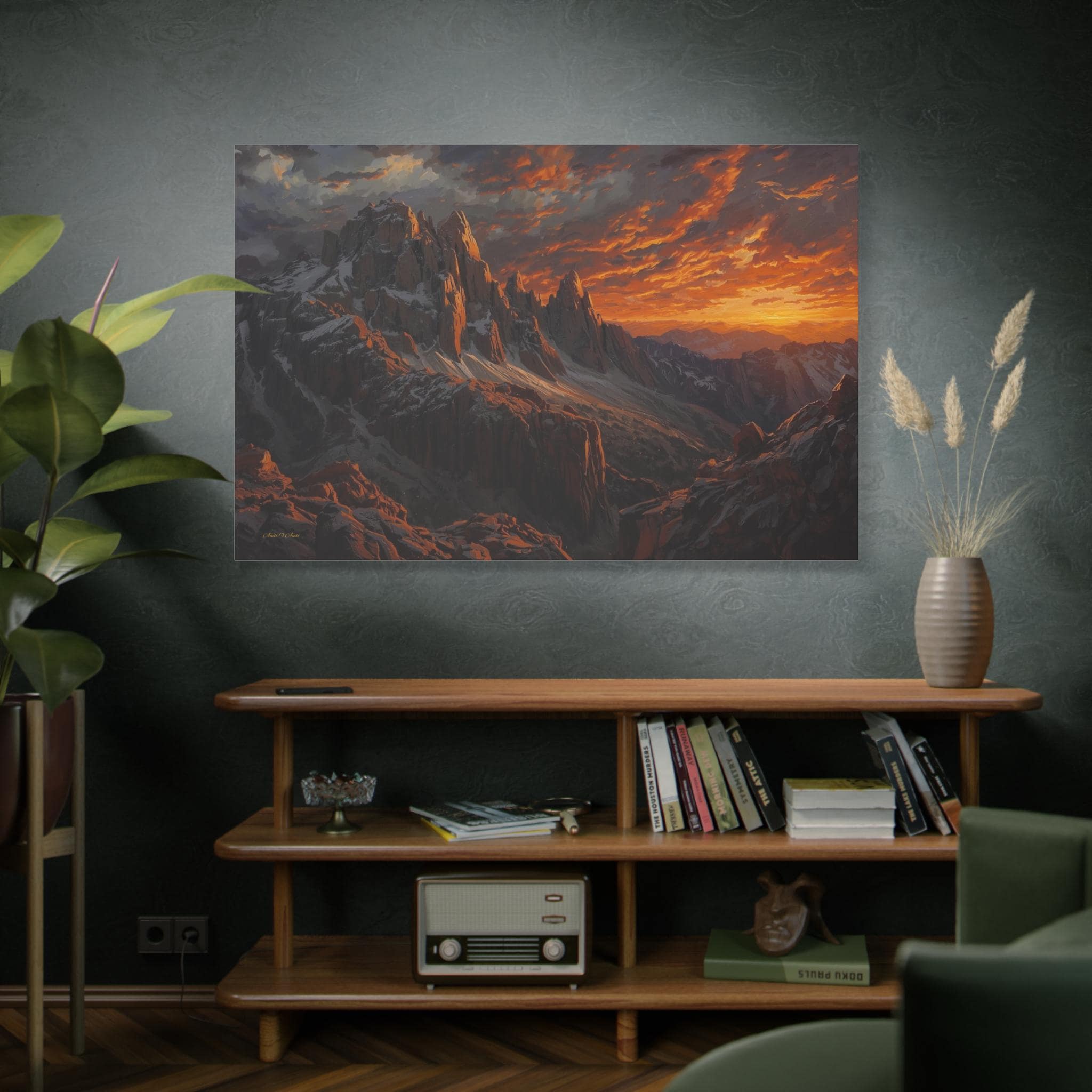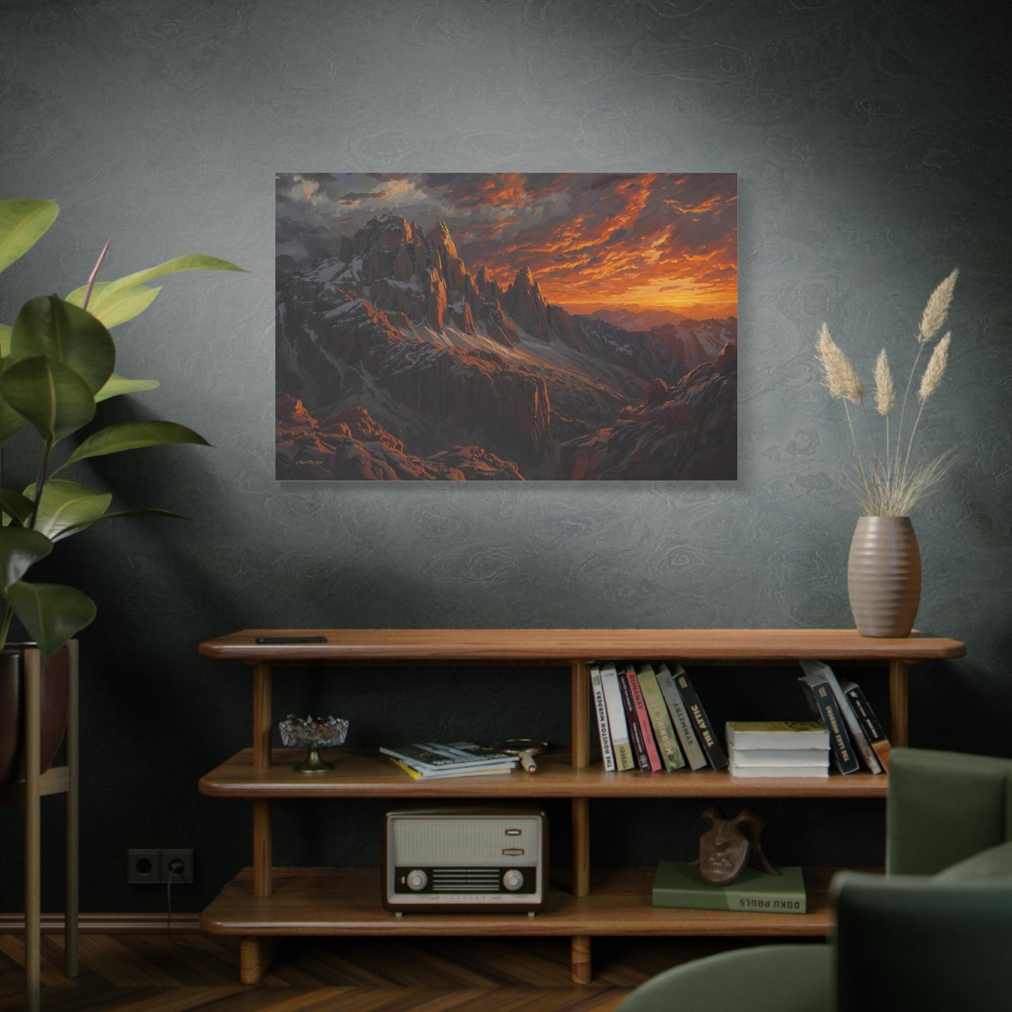 Bring the awe-inspiring, raw power of nature into your space with this stunning dramatic mountain sunset canvas print. This captivating artwork features rugged, jagged mountain peaks dusted with snow, towering beneath an incredibly dynamic sky ablaze with fiery oranges, deep reds, and glowing golds. The intense light of the setting sun casts magnificent, warm highlights across the dark, moody stone of the mountain face.