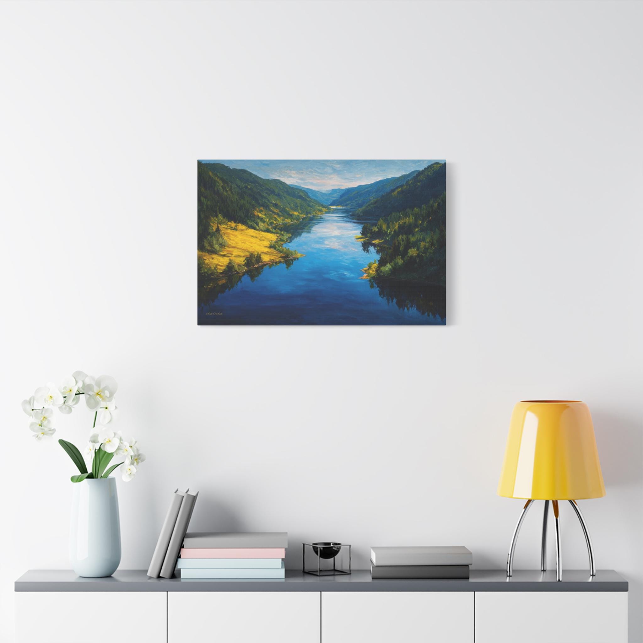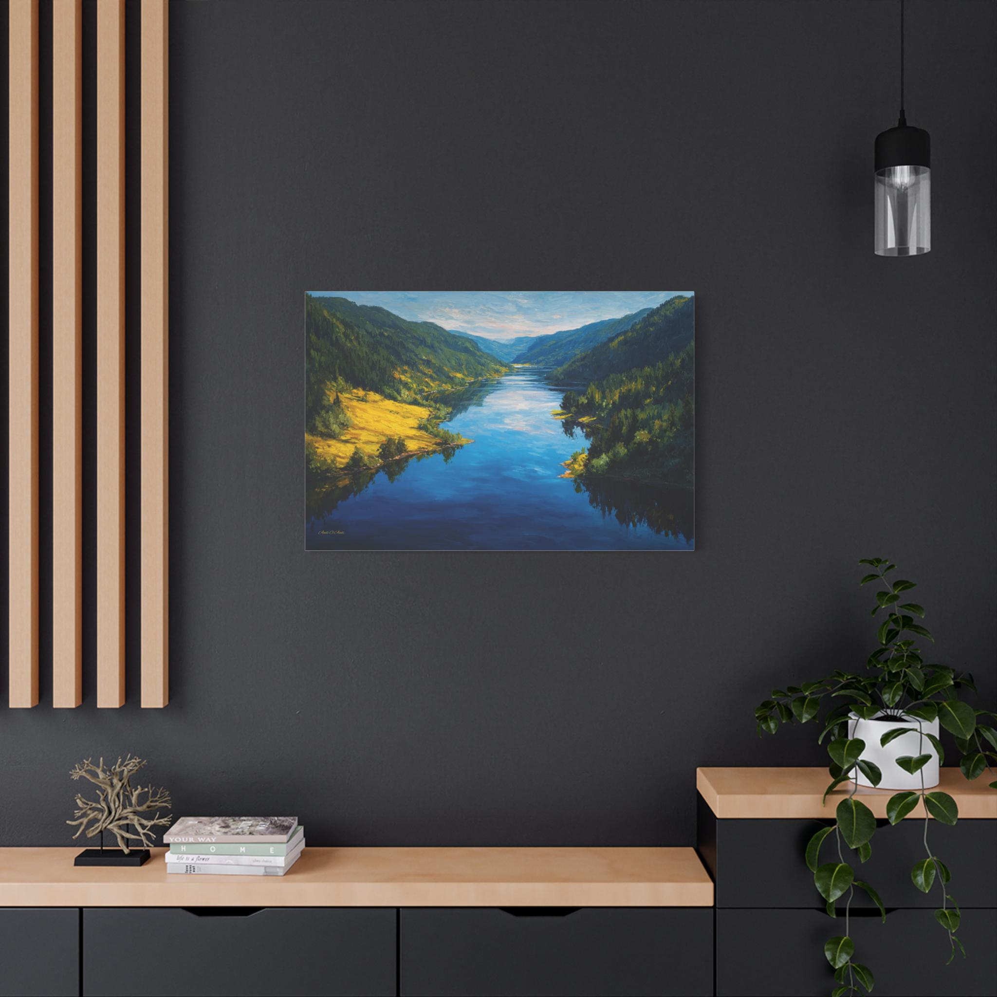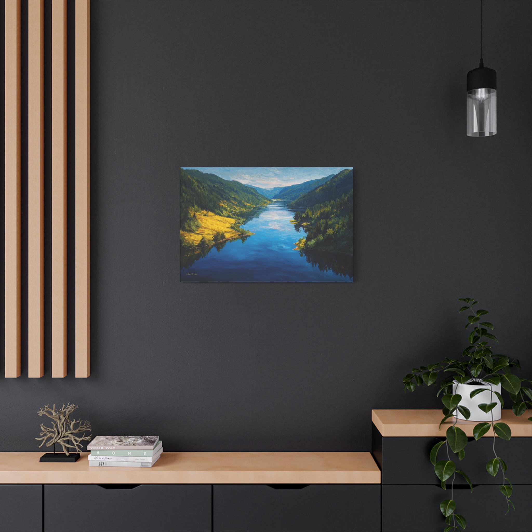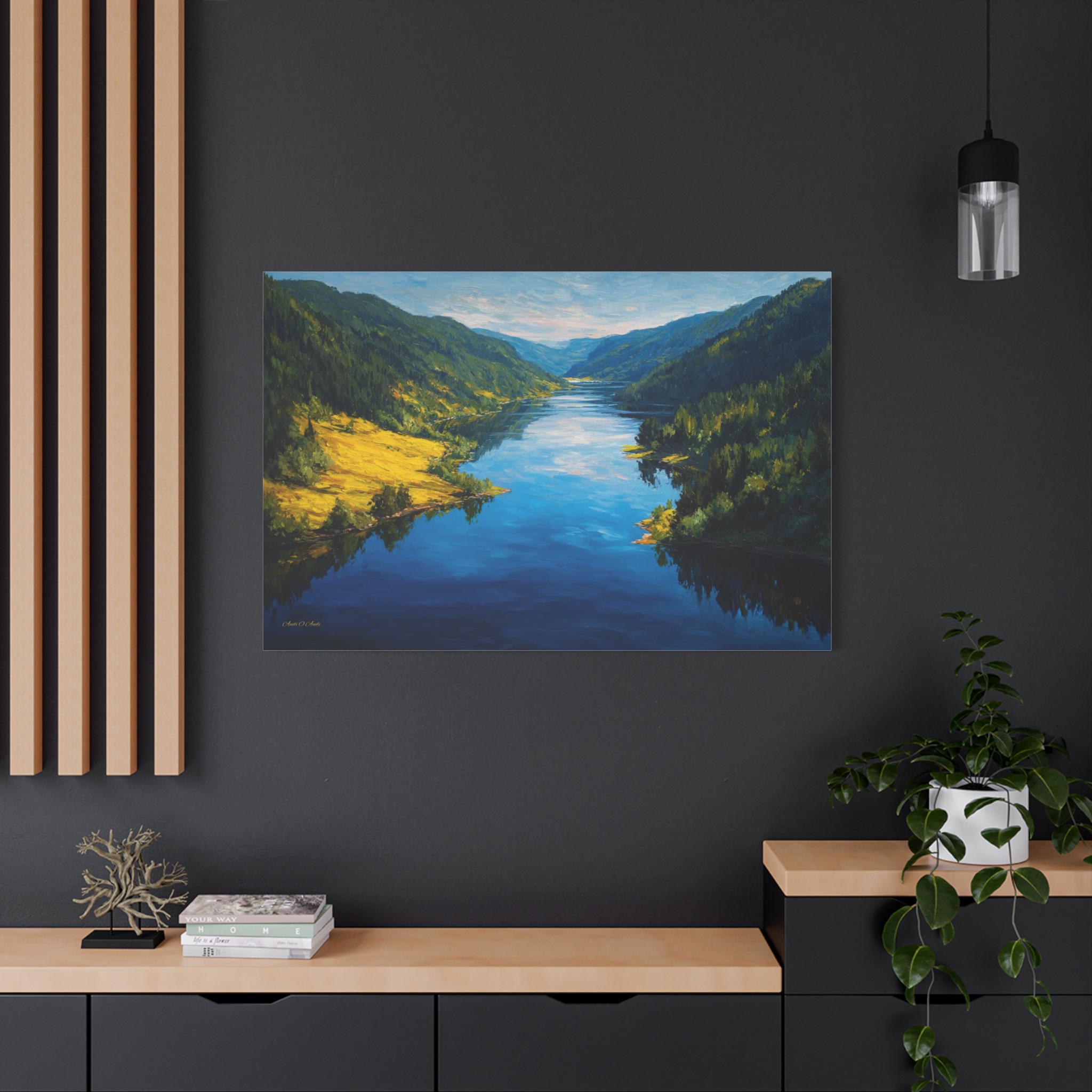 Bring the awe-inspiring beauty and crisp, refreshing energy of a grand alpine valley into your home with this stunning mountain river canvas print. This captivating horizontal artwork features a wide, deep blue river flowing gracefully through a majestic valley. The shores are lined with lush, dense evergreen forests, while a brilliant patch of sunlit, golden-green grass illuminates the left bank, perfectly reflecting in the water's surface.