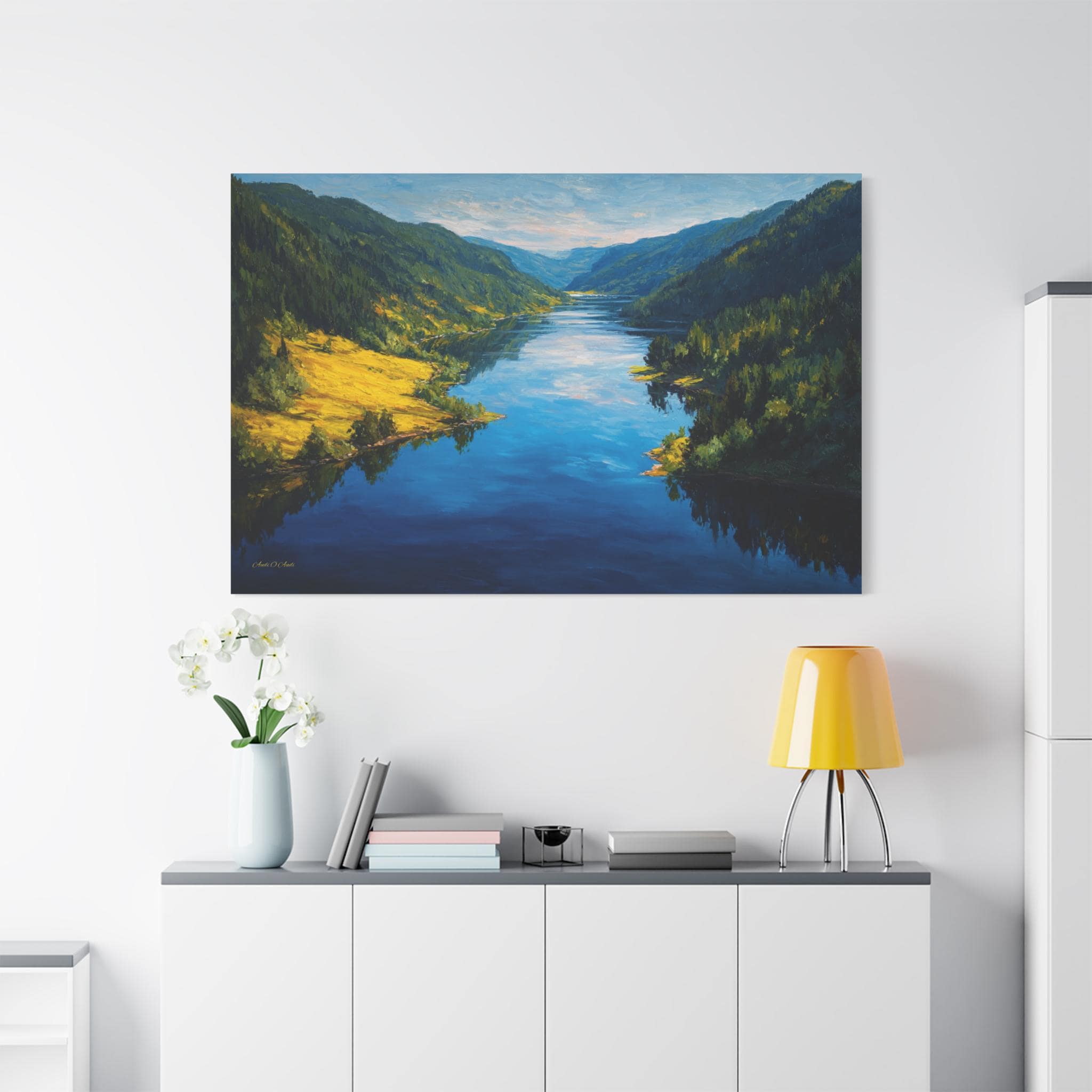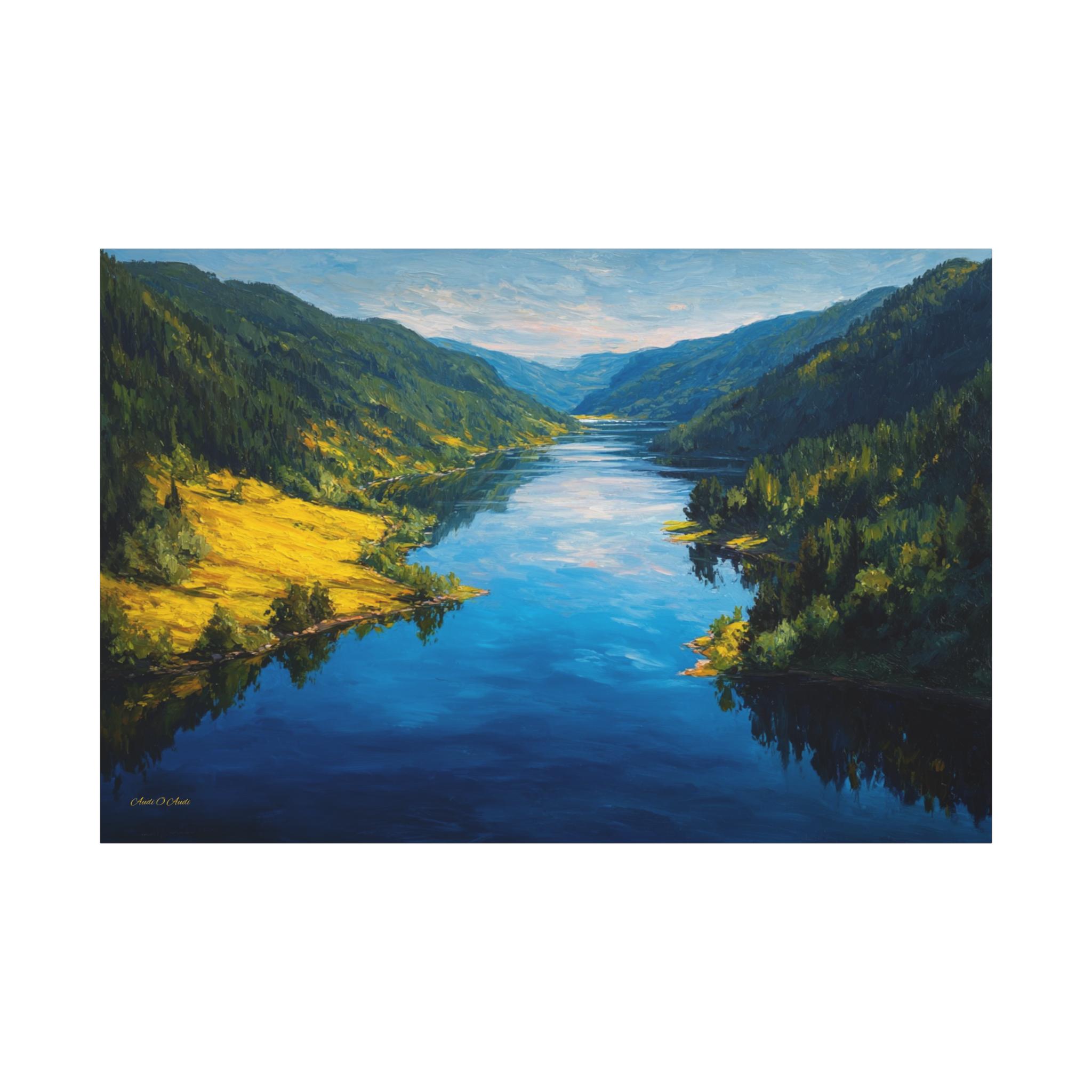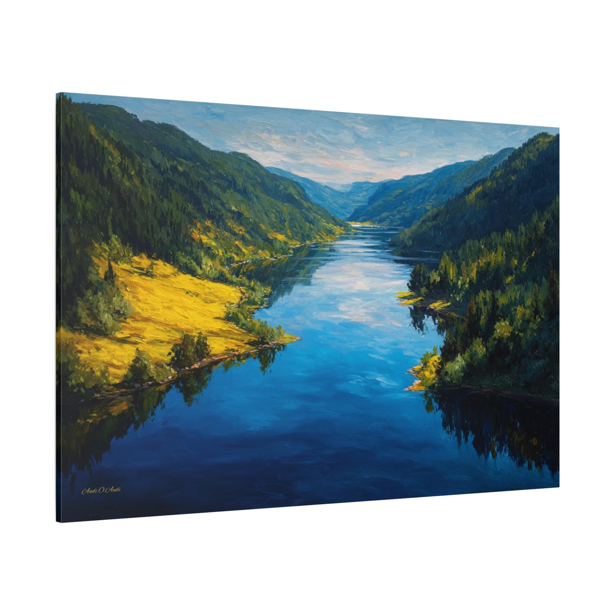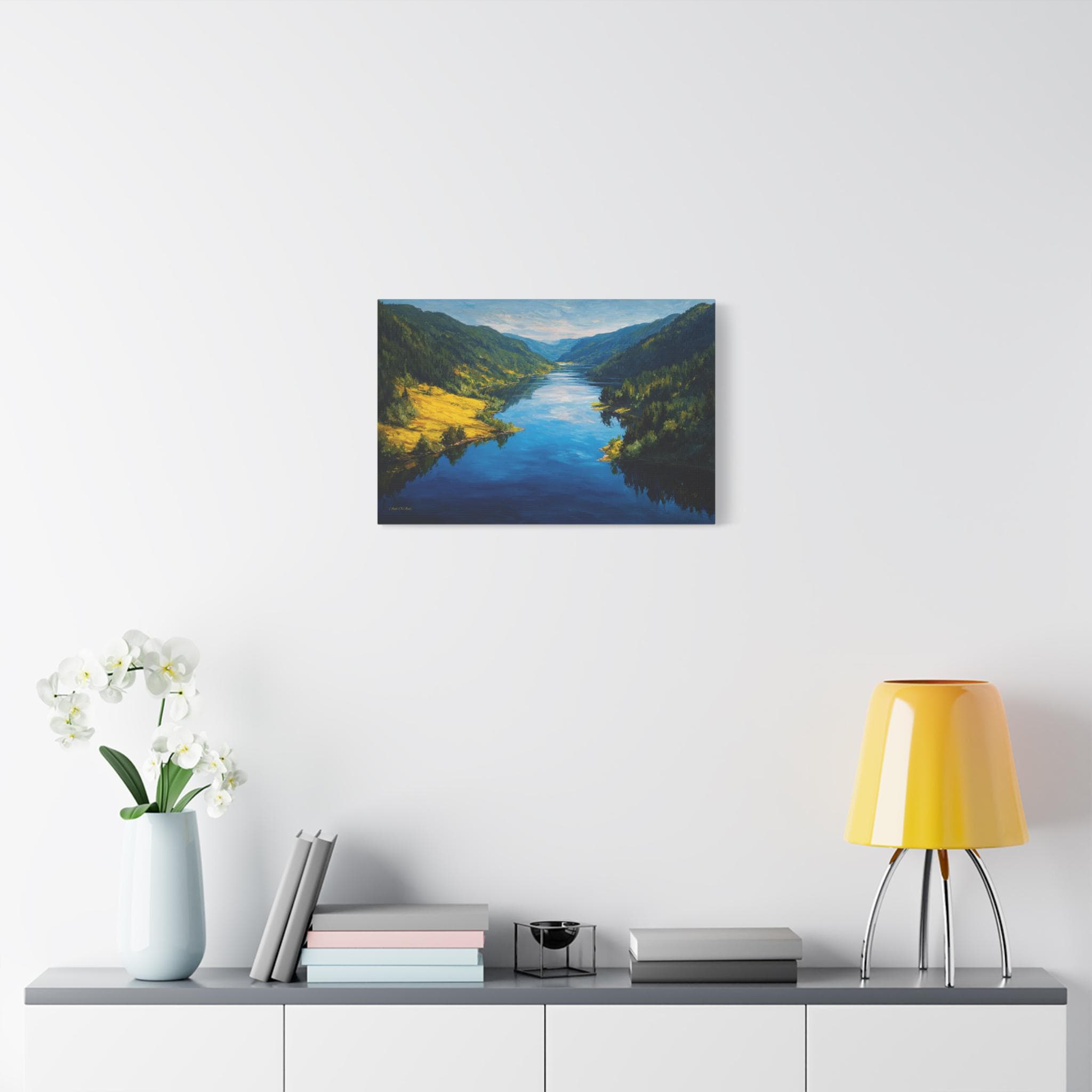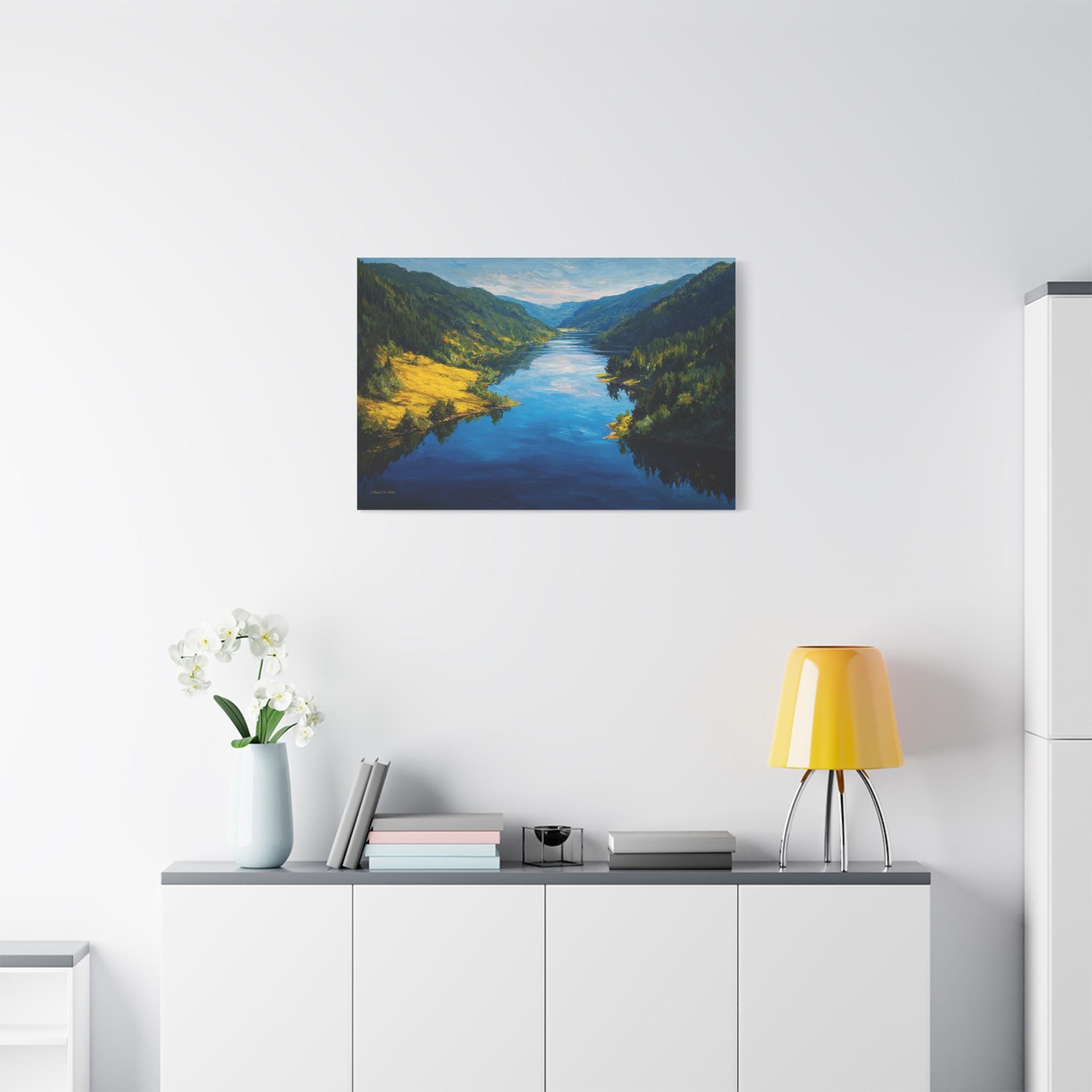 Bring the awe-inspiring beauty and crisp, refreshing energy of a grand alpine valley into your home with this stunning mountain river canvas print. This captivating horizontal artwork features a wide, deep blue river flowing gracefully through a majestic valley. The shores are lined with lush, dense evergreen forests, while a brilliant patch of sunlit, golden-green grass illuminates the left bank, perfectly reflecting in the water's surface.