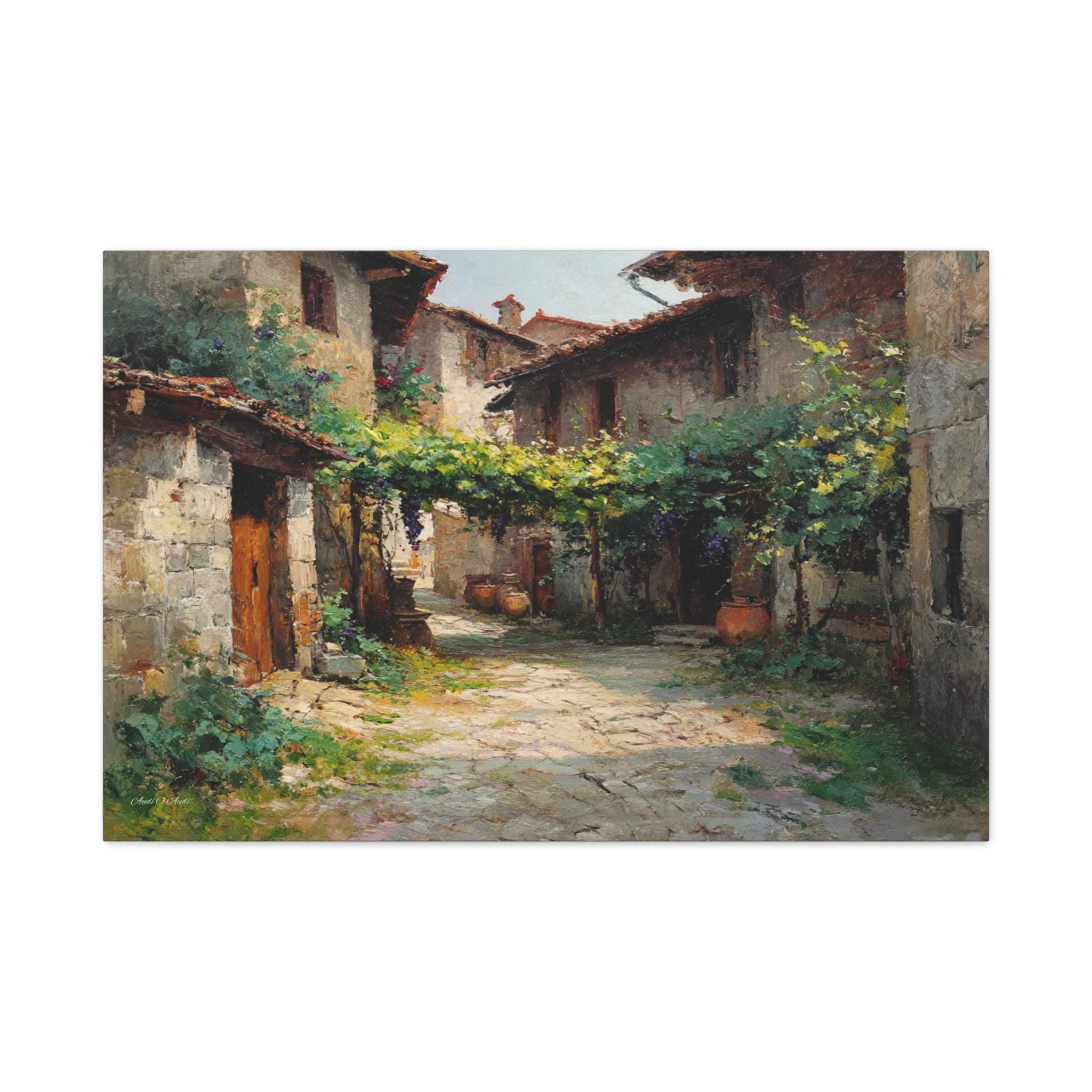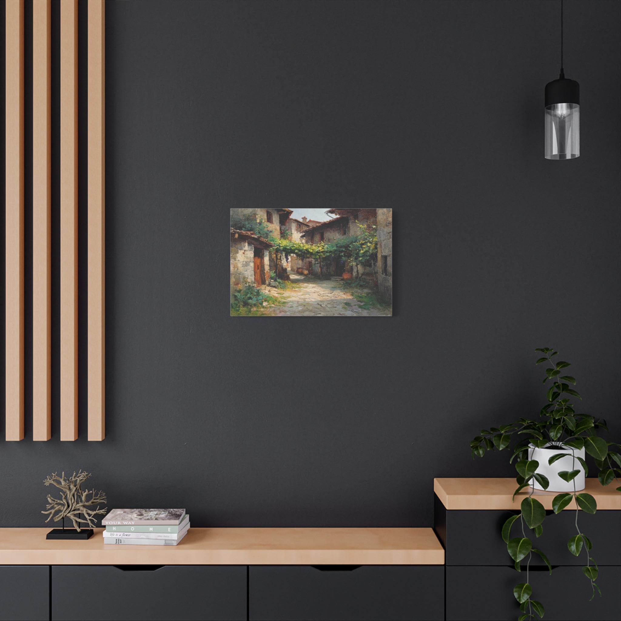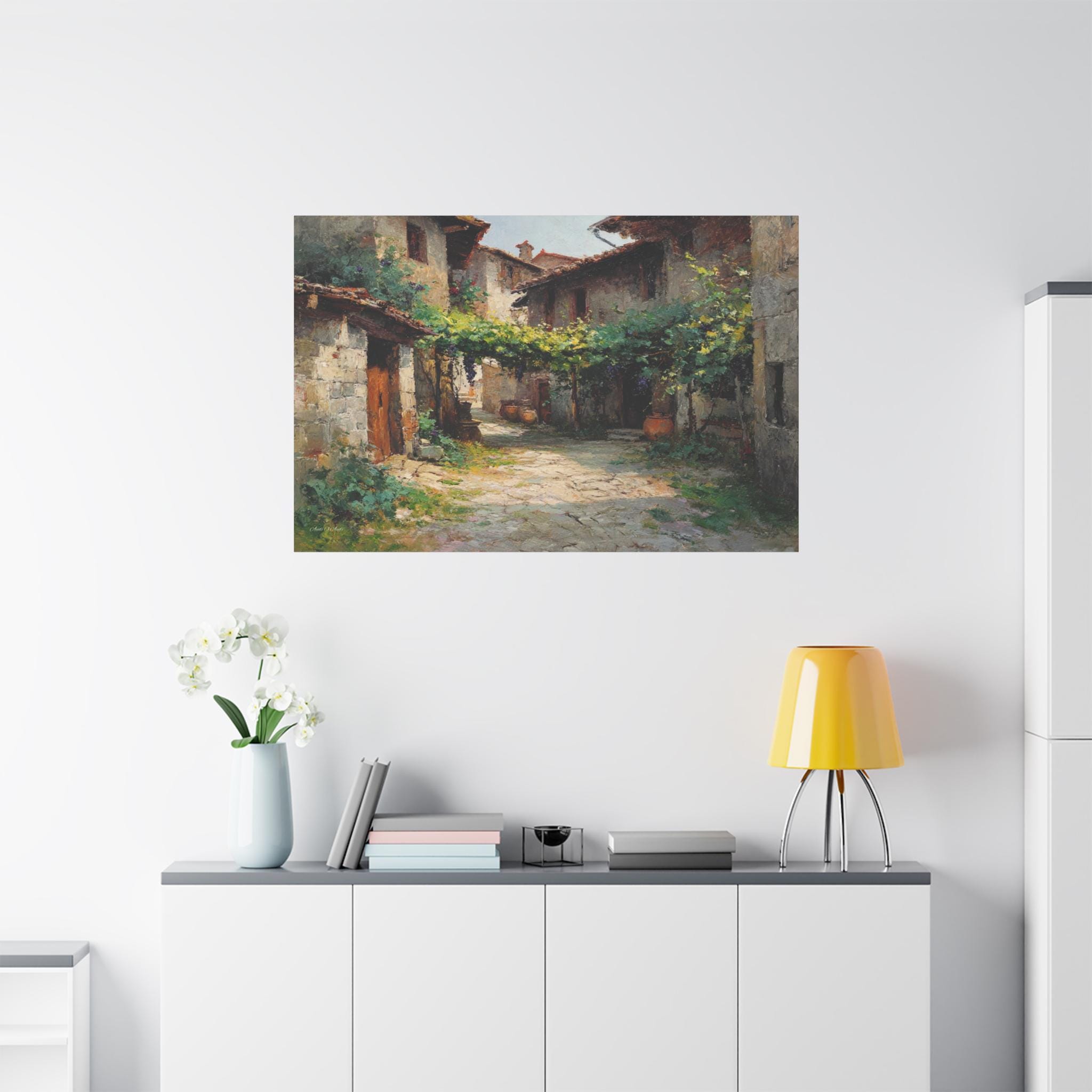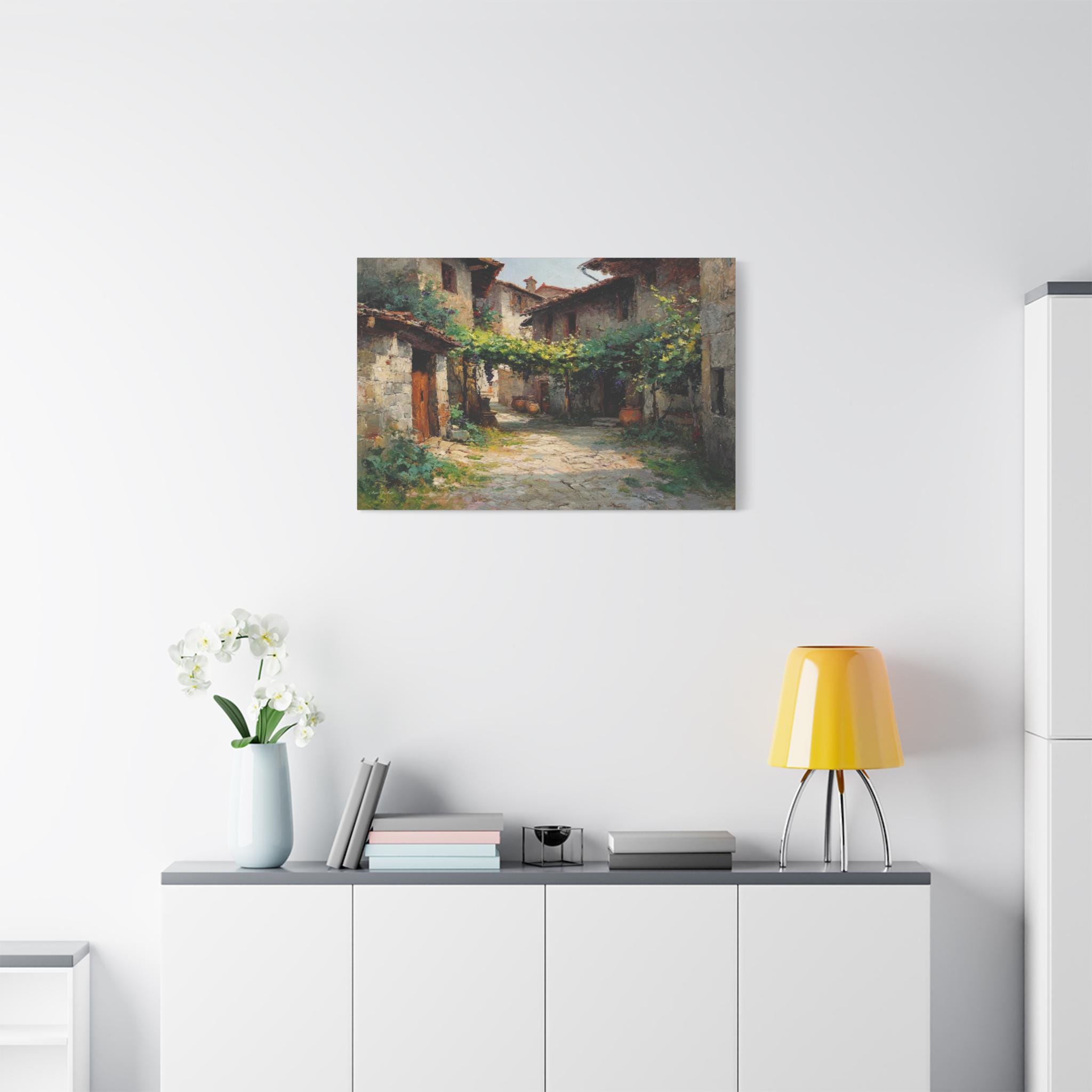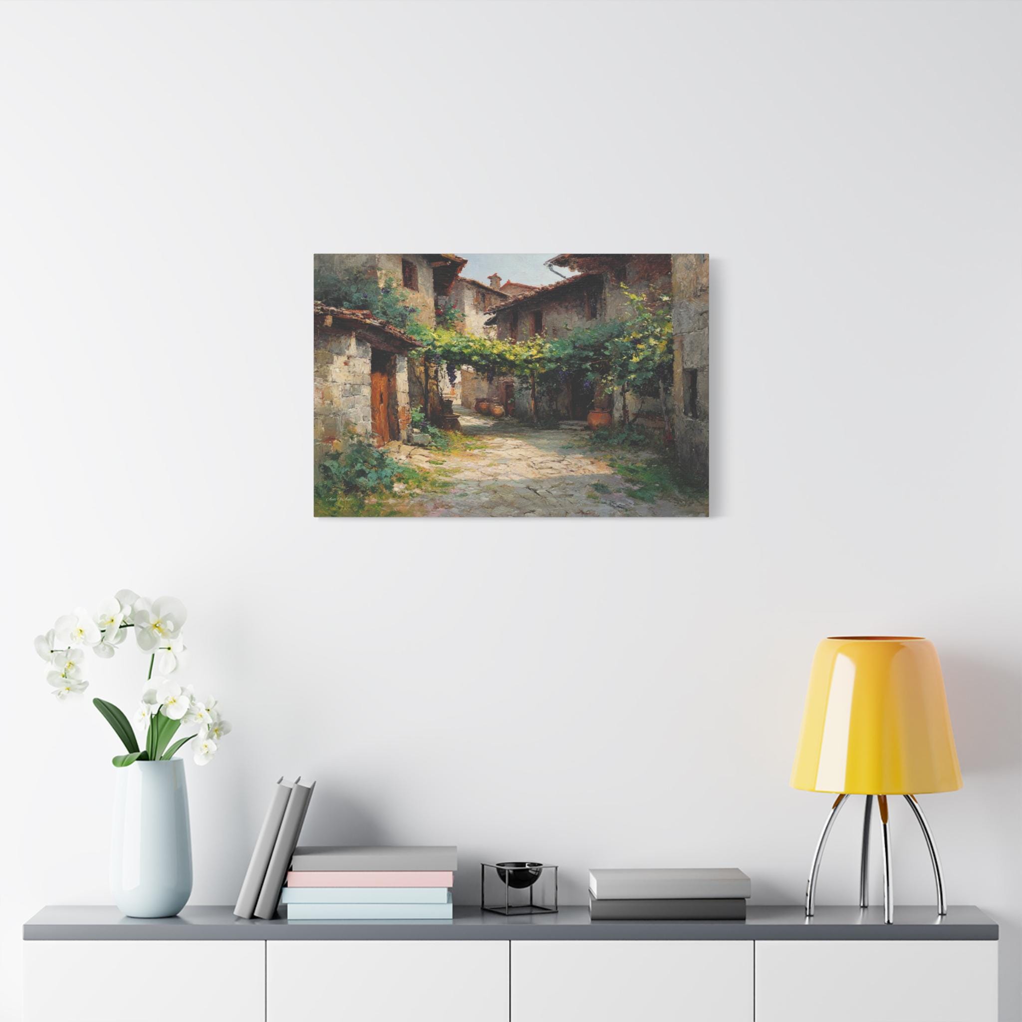 Bring the profound peace and sun-drenched beauty of the European countryside into your home with this stunning Tuscan village canvas print. This captivating horizontal artwork features a quiet, rustic alleyway winding between historic stone houses with classic terracotta roofs. A lush canopy of grapevines stretches across the path, casting beautiful, dappled shadows on the sunlit stone street below.