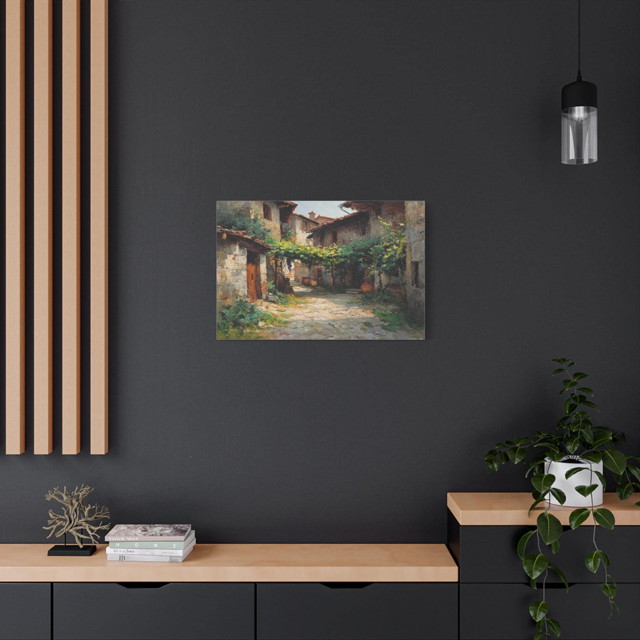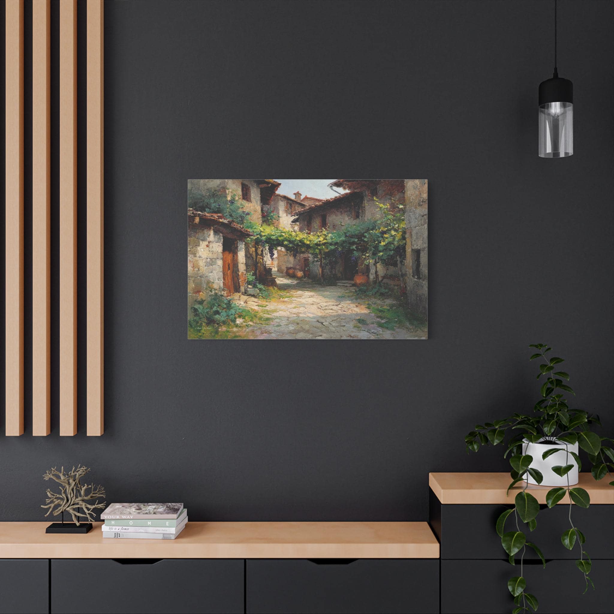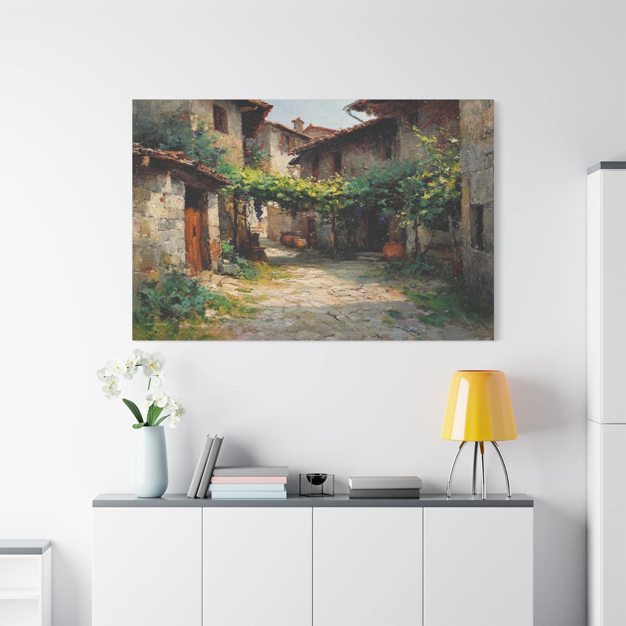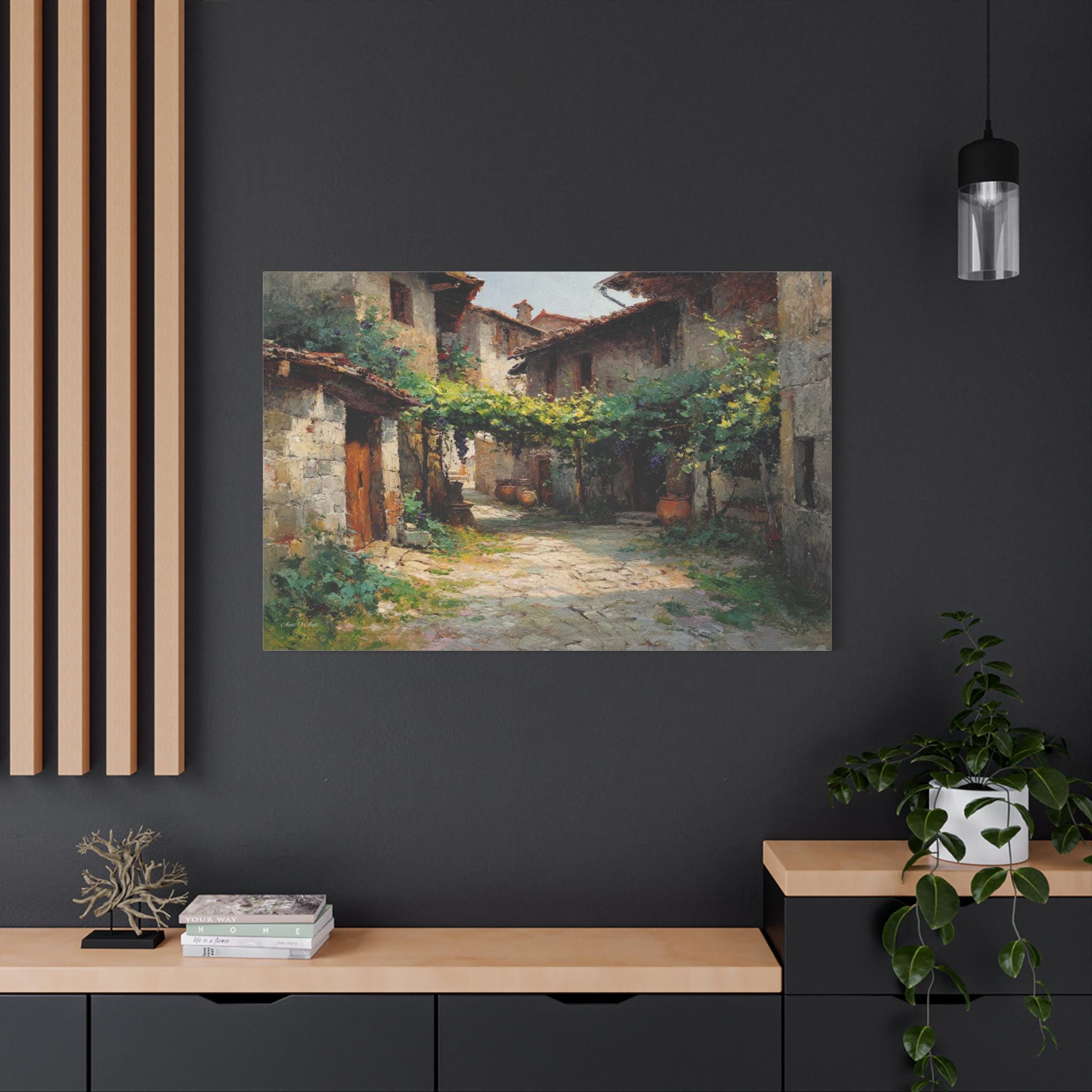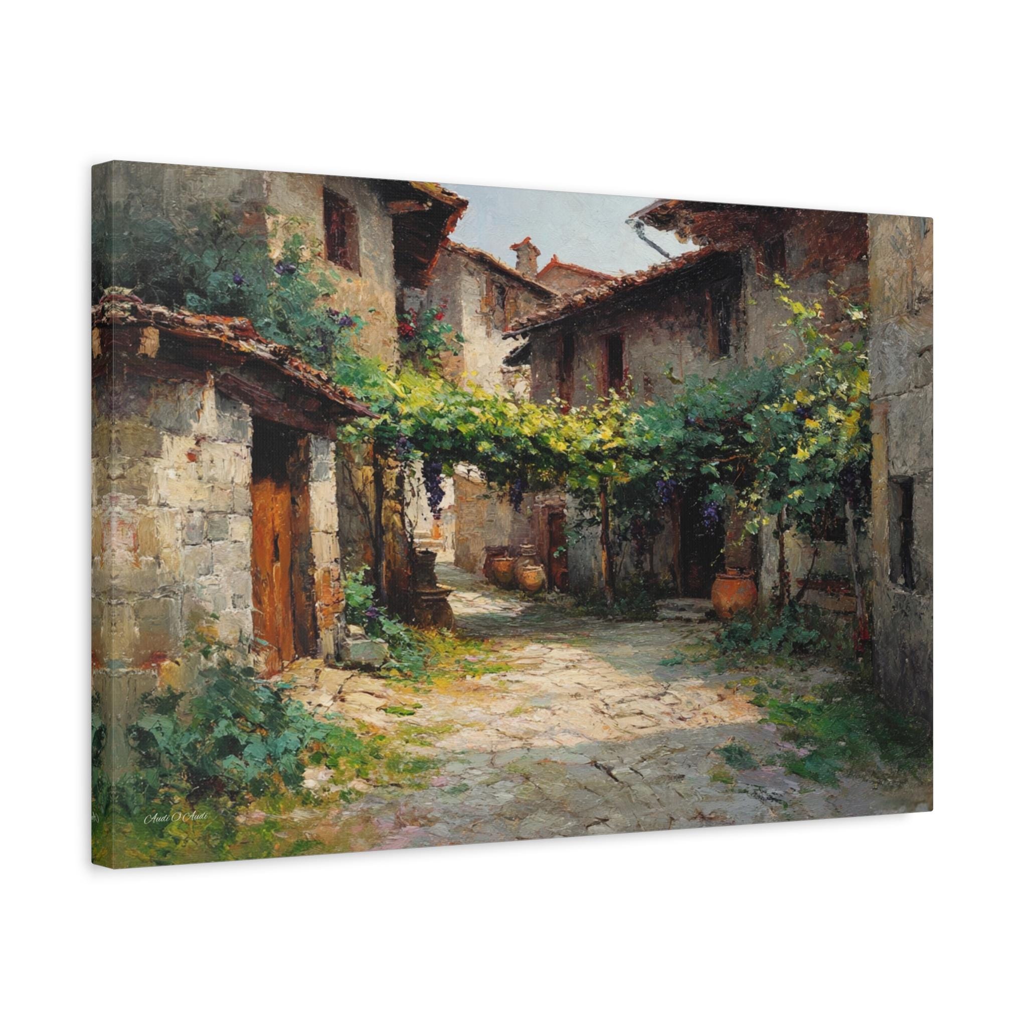 Bring the profound peace and sun-drenched beauty of the European countryside into your home with this stunning Tuscan village canvas print. This captivating horizontal artwork features a quiet, rustic alleyway winding between historic stone houses with classic terracotta roofs. A lush canopy of grapevines stretches across the path, casting beautiful, dappled shadows on the sunlit stone street below.