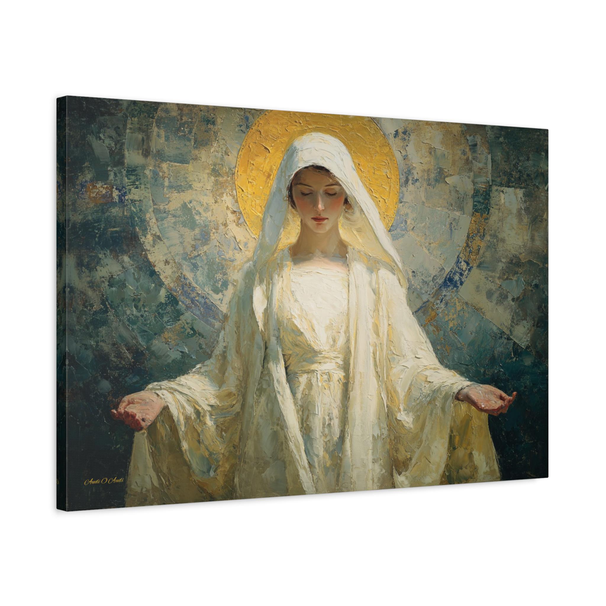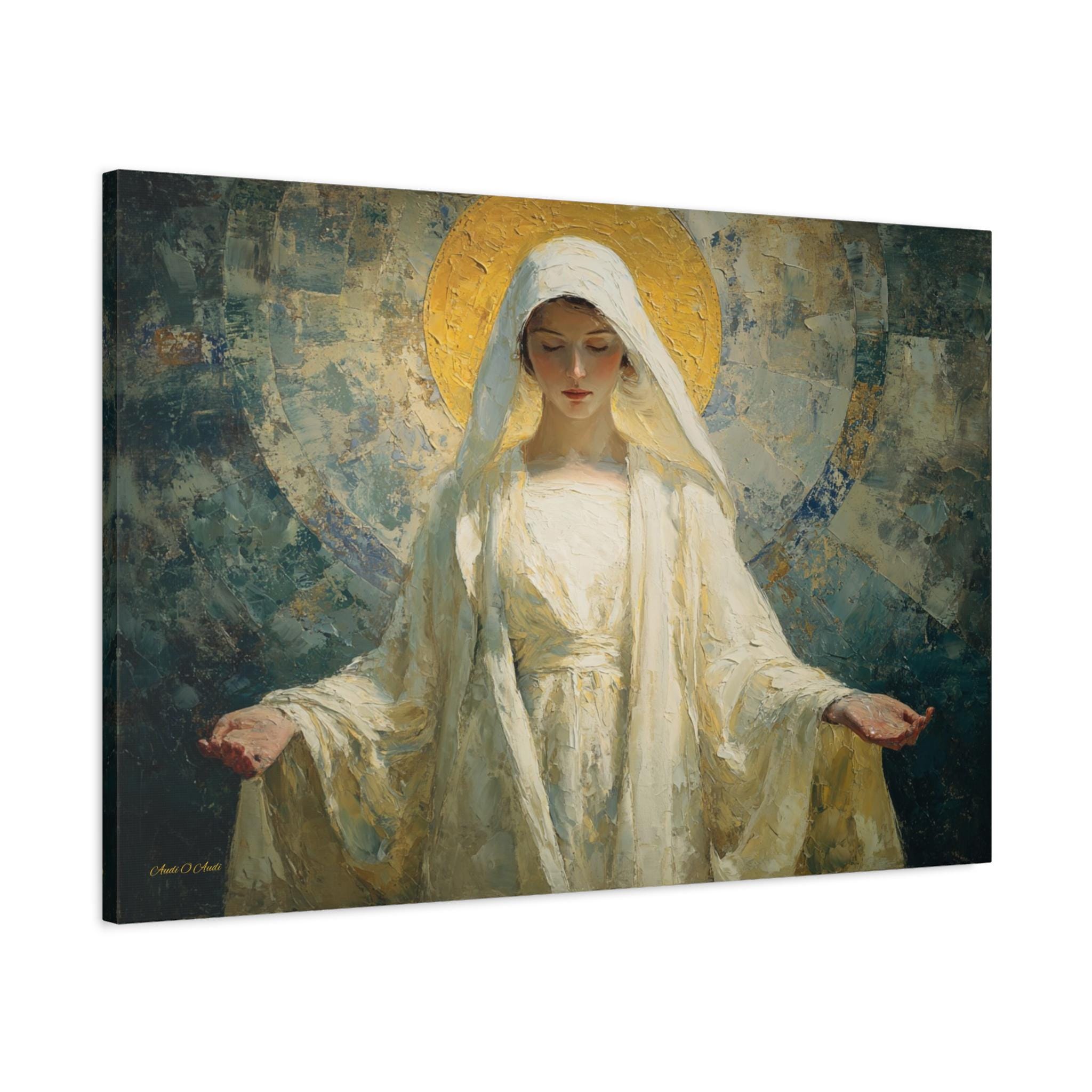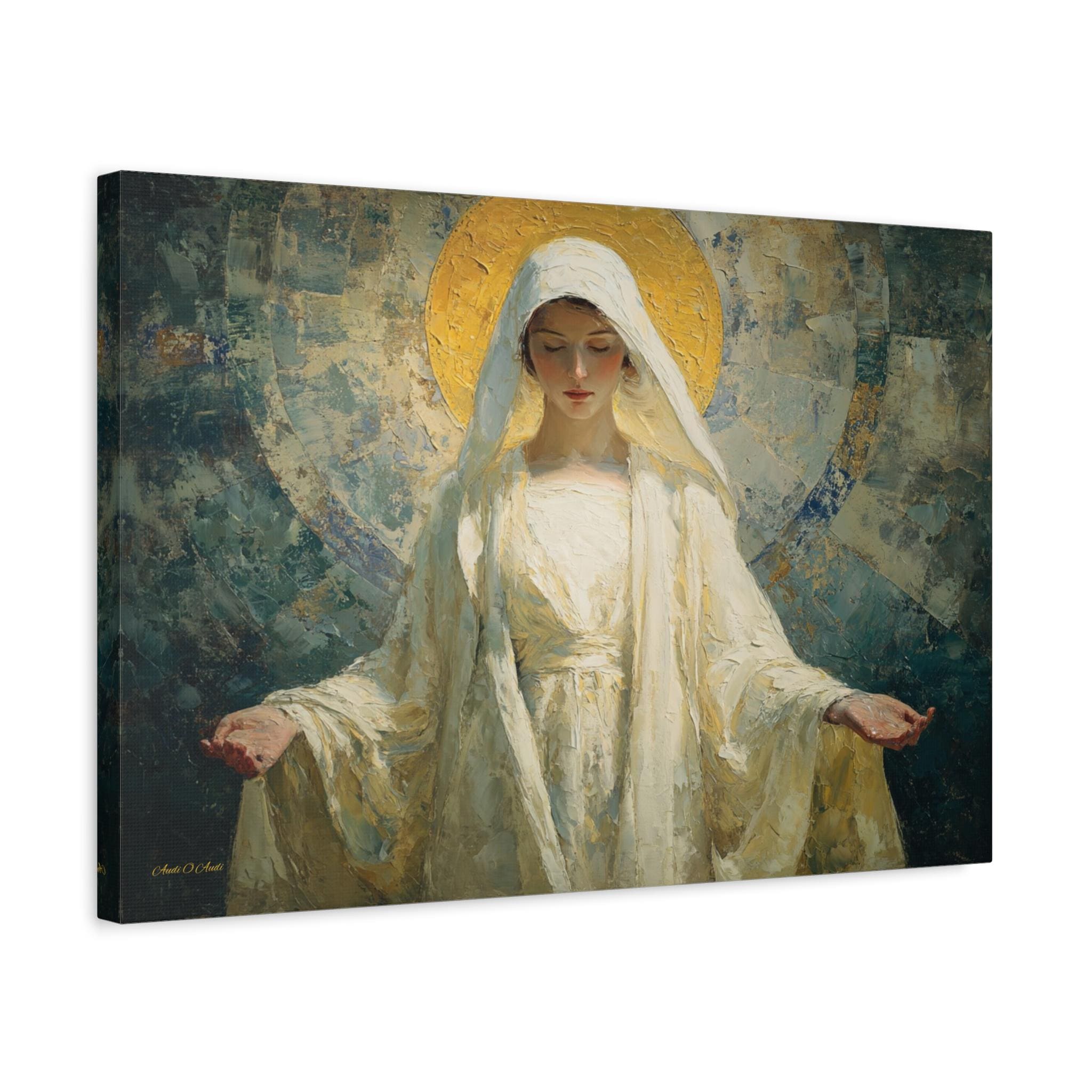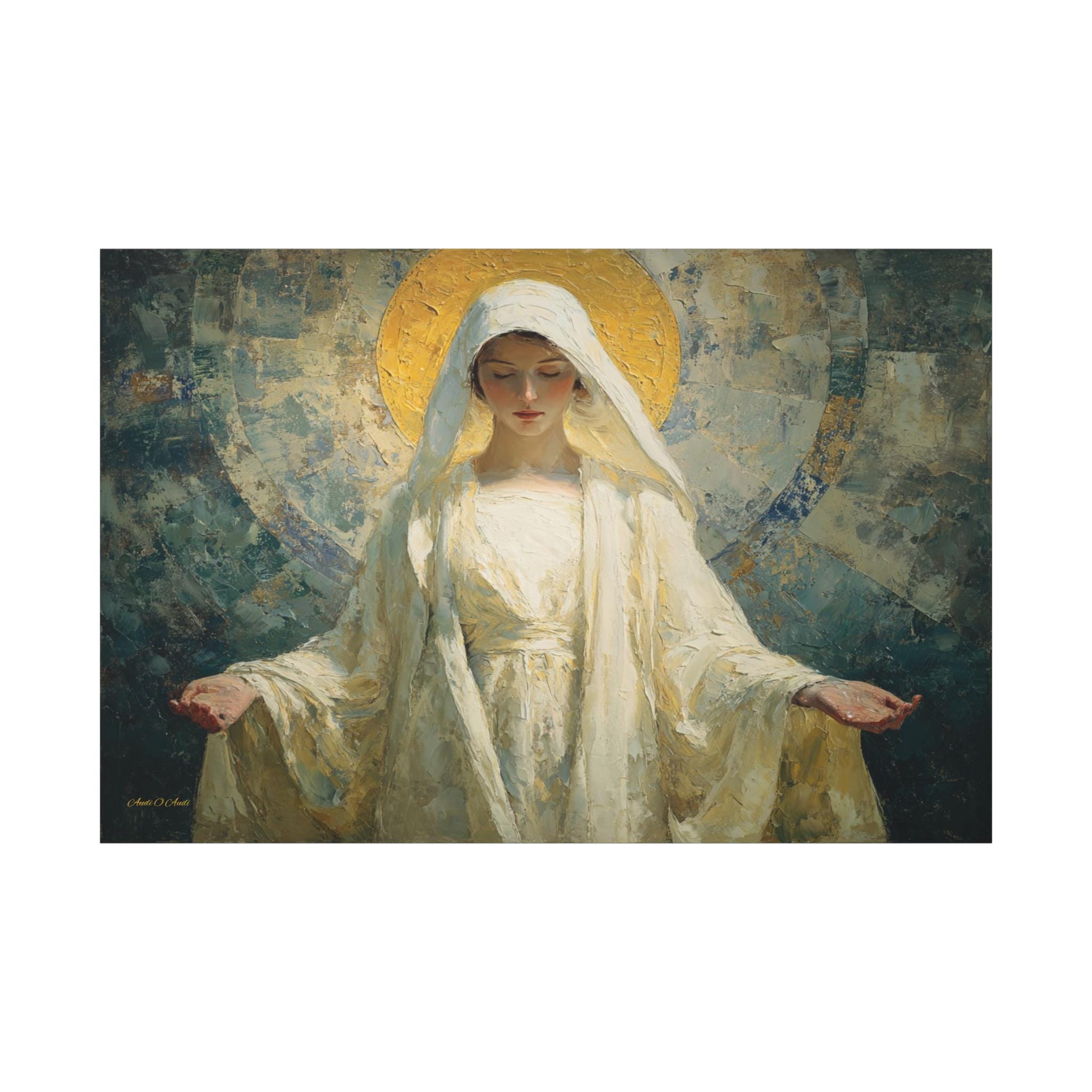 Bring profound peace, divine grace, and contemporary elegance into your space with this stunning spiritual portrait canvas print. This captivating artwork features a deeply moving depiction of the Sacred Feminine, reminiscent of the Virgin Mary, with her hands gently opened in a welcoming gesture of blessing. She is draped in flowing white robes and crowned by a radiant, heavily textured golden halo, all set against a beautiful, abstract background of soothing teals and earthy blues.