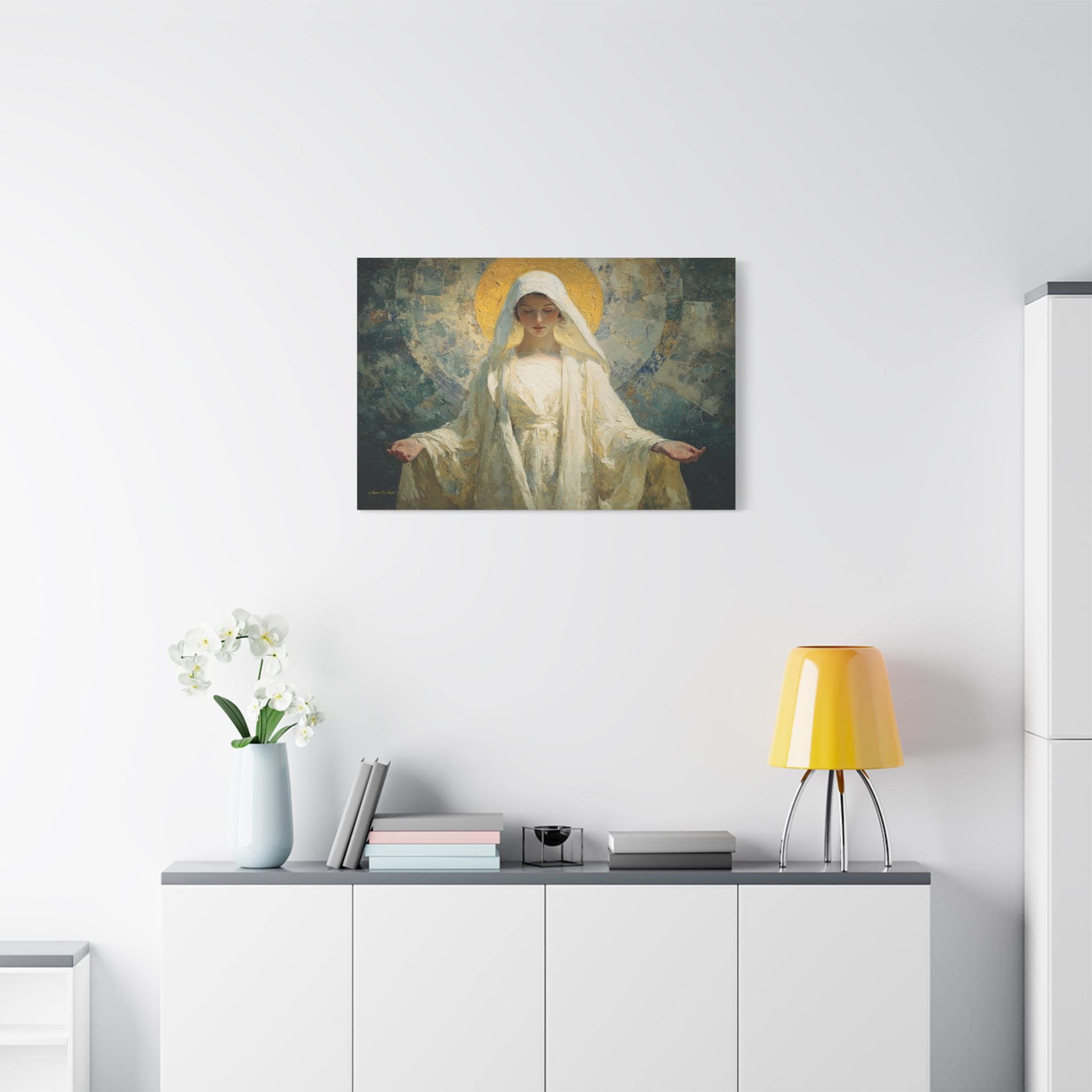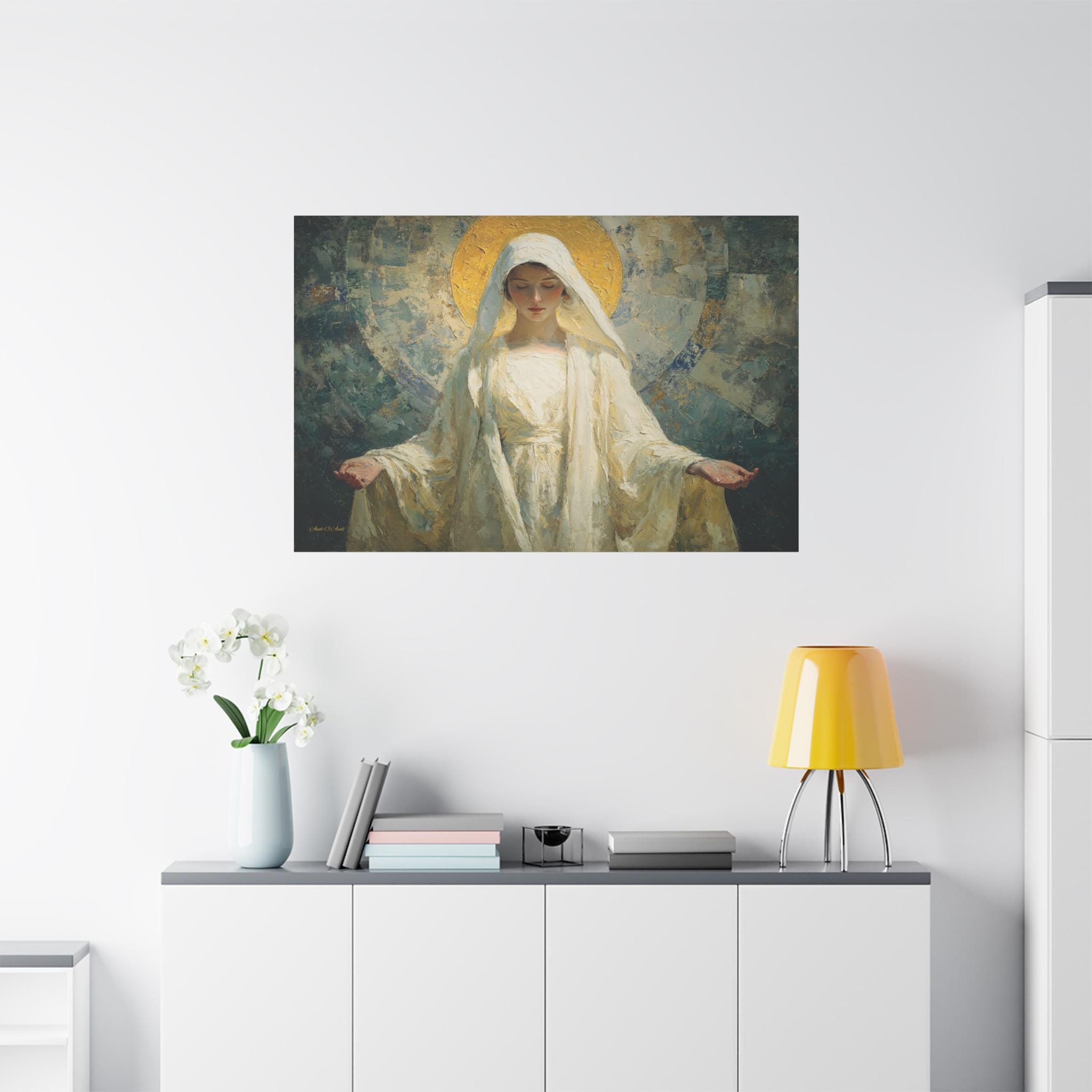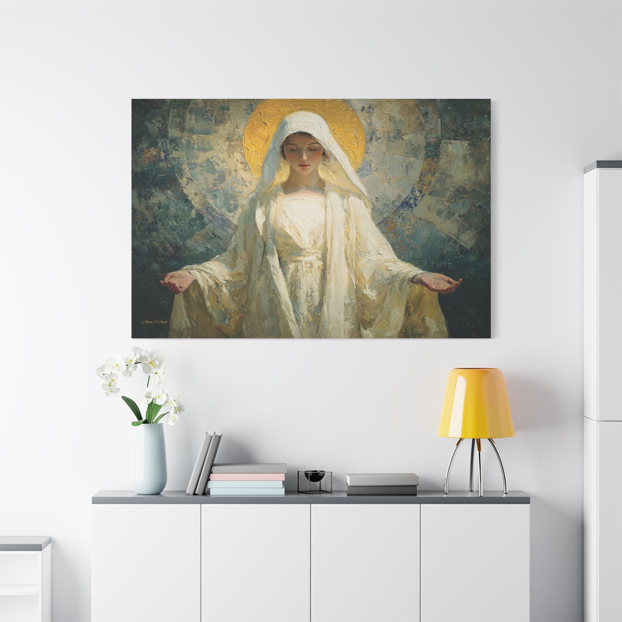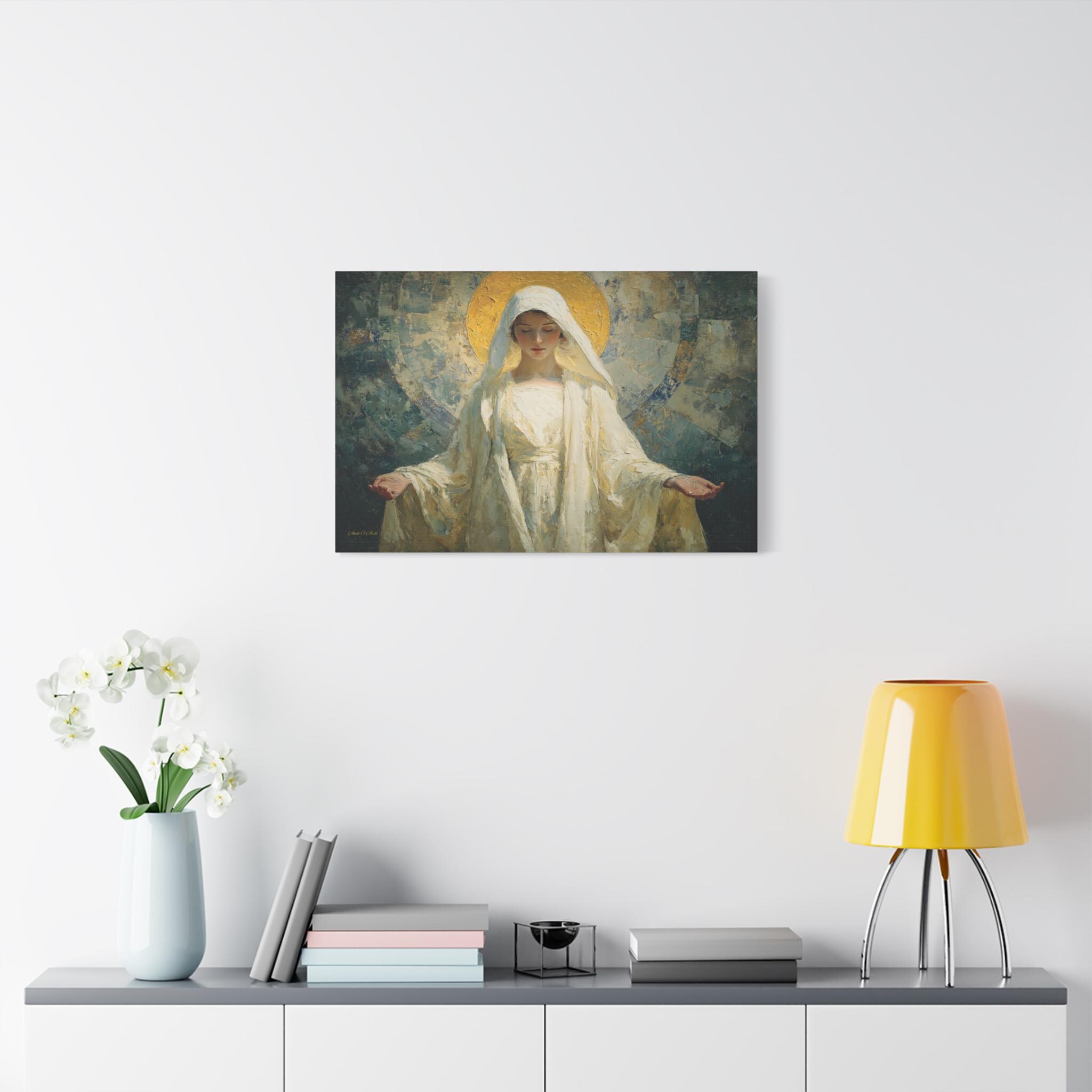 Bring profound peace, divine grace, and contemporary elegance into your space with this stunning spiritual portrait canvas print. This captivating artwork features a deeply moving depiction of the Sacred Feminine, reminiscent of the Virgin Mary, with her hands gently opened in a welcoming gesture of blessing. She is draped in flowing white robes and crowned by a radiant, heavily textured golden halo, all set against a beautiful, abstract background of soothing teals and earthy blues.