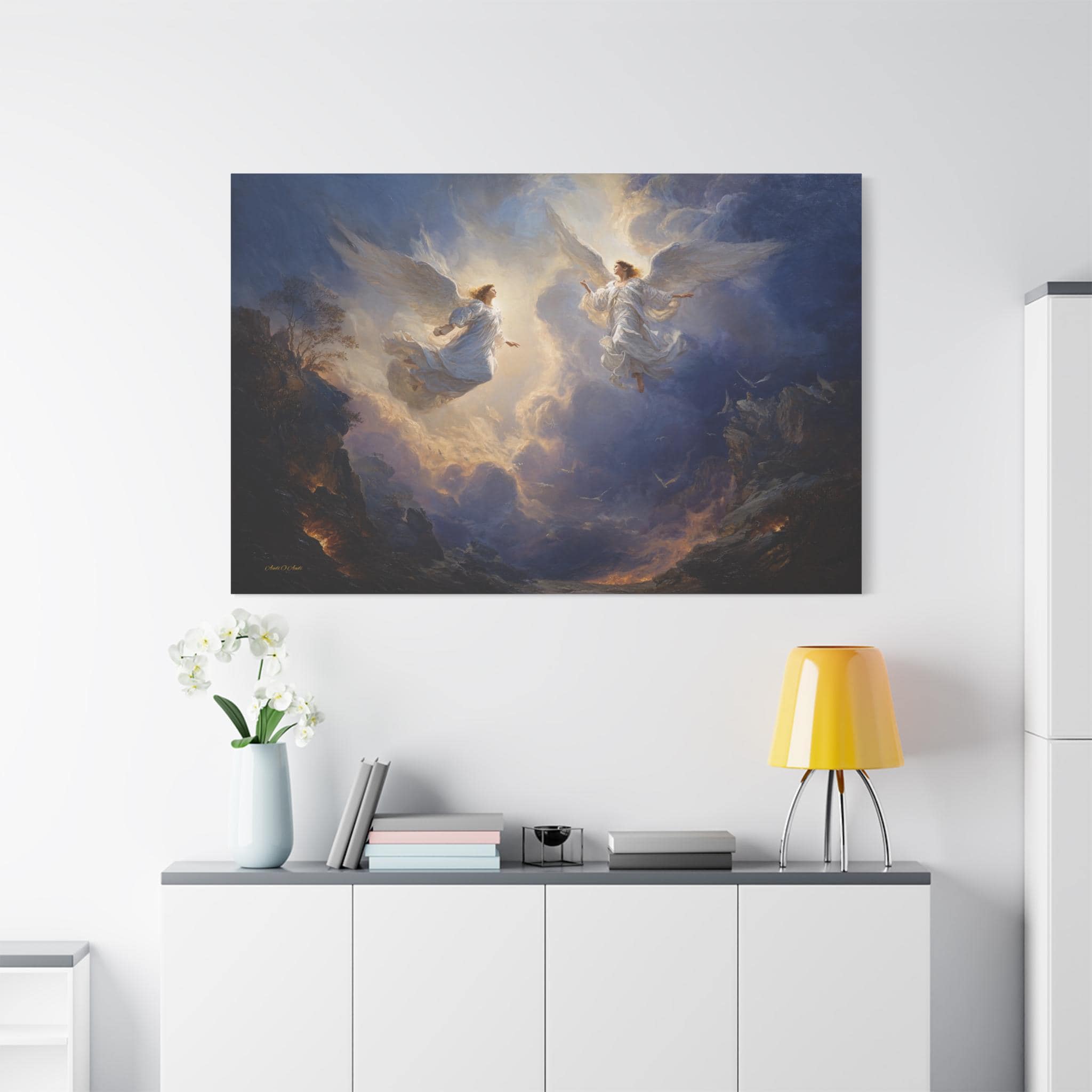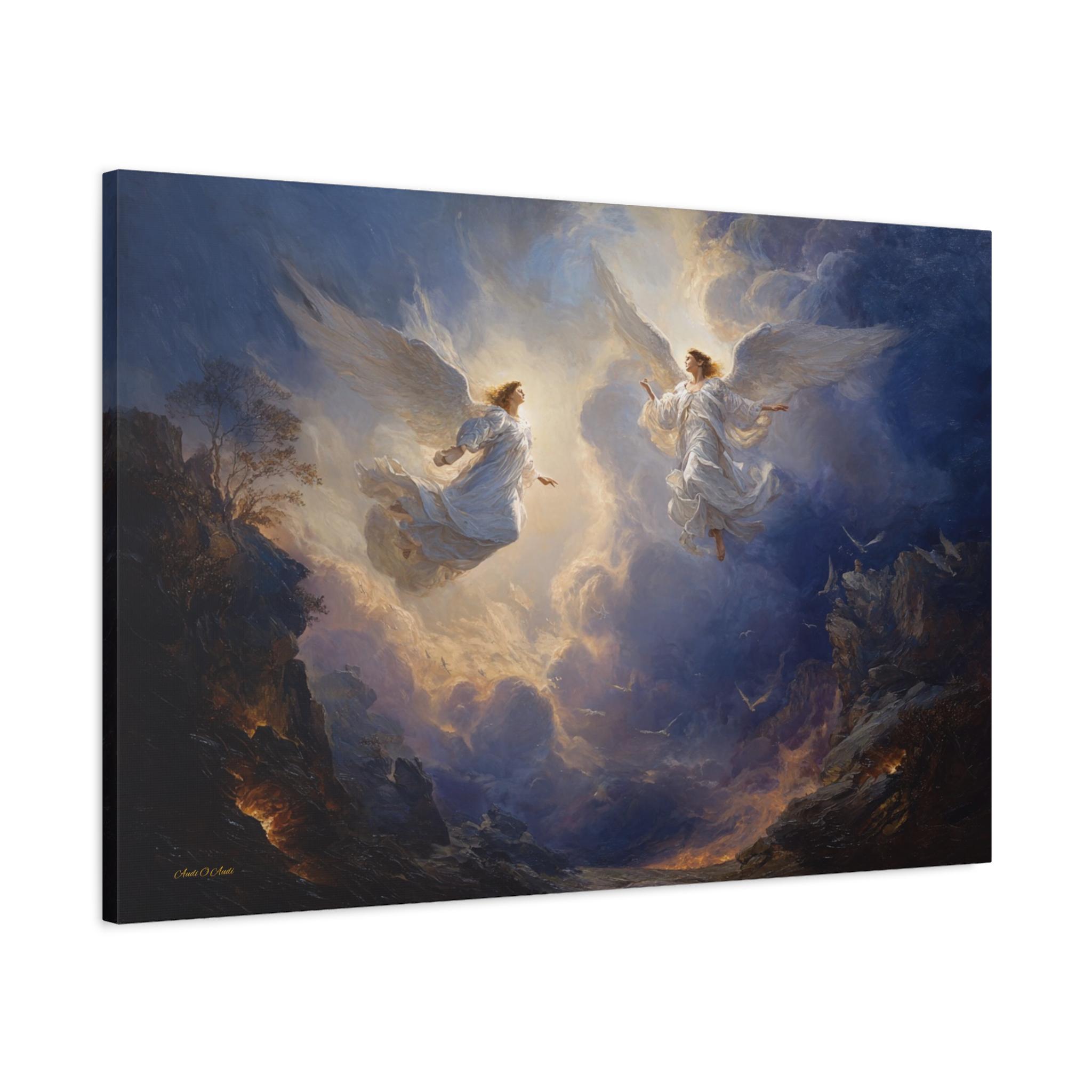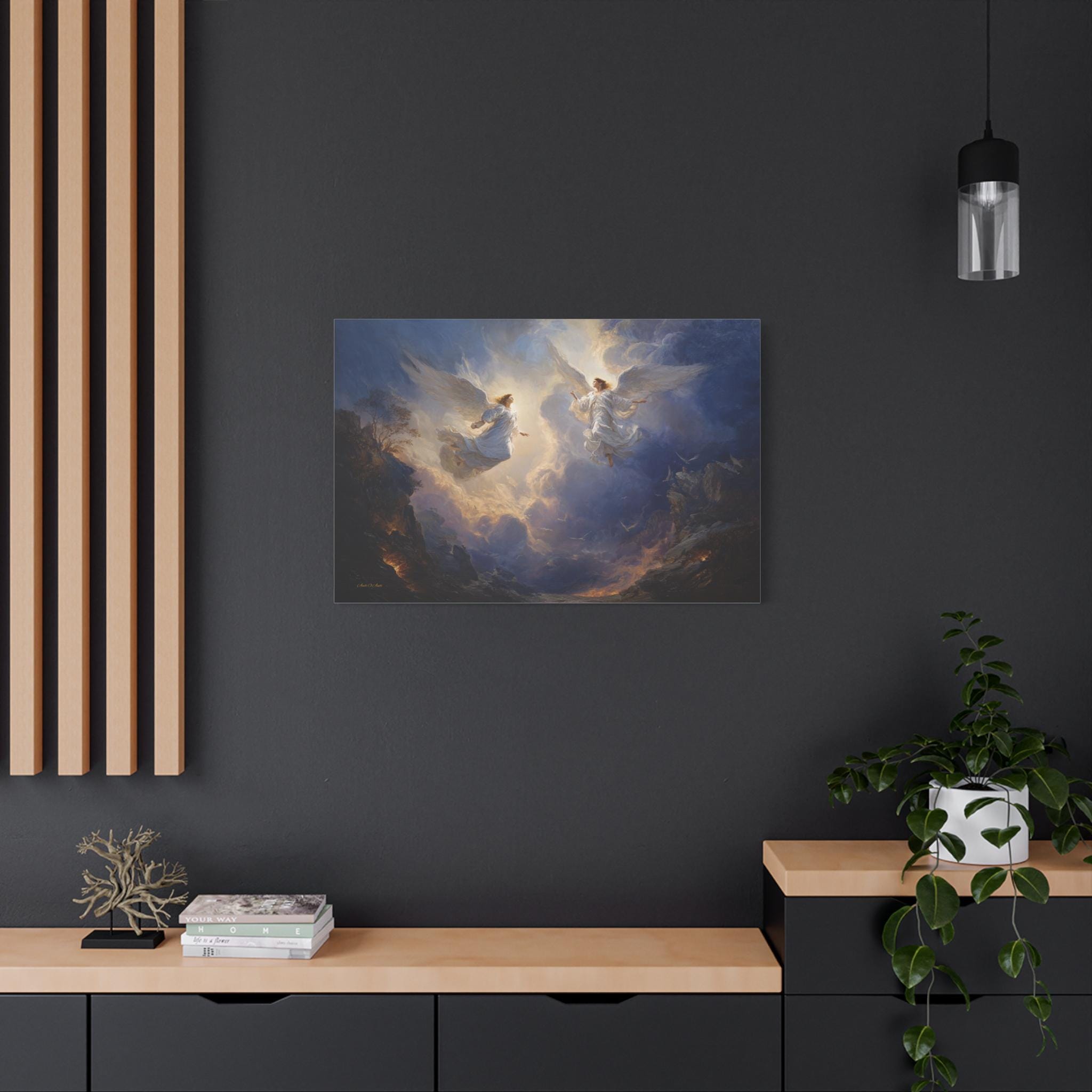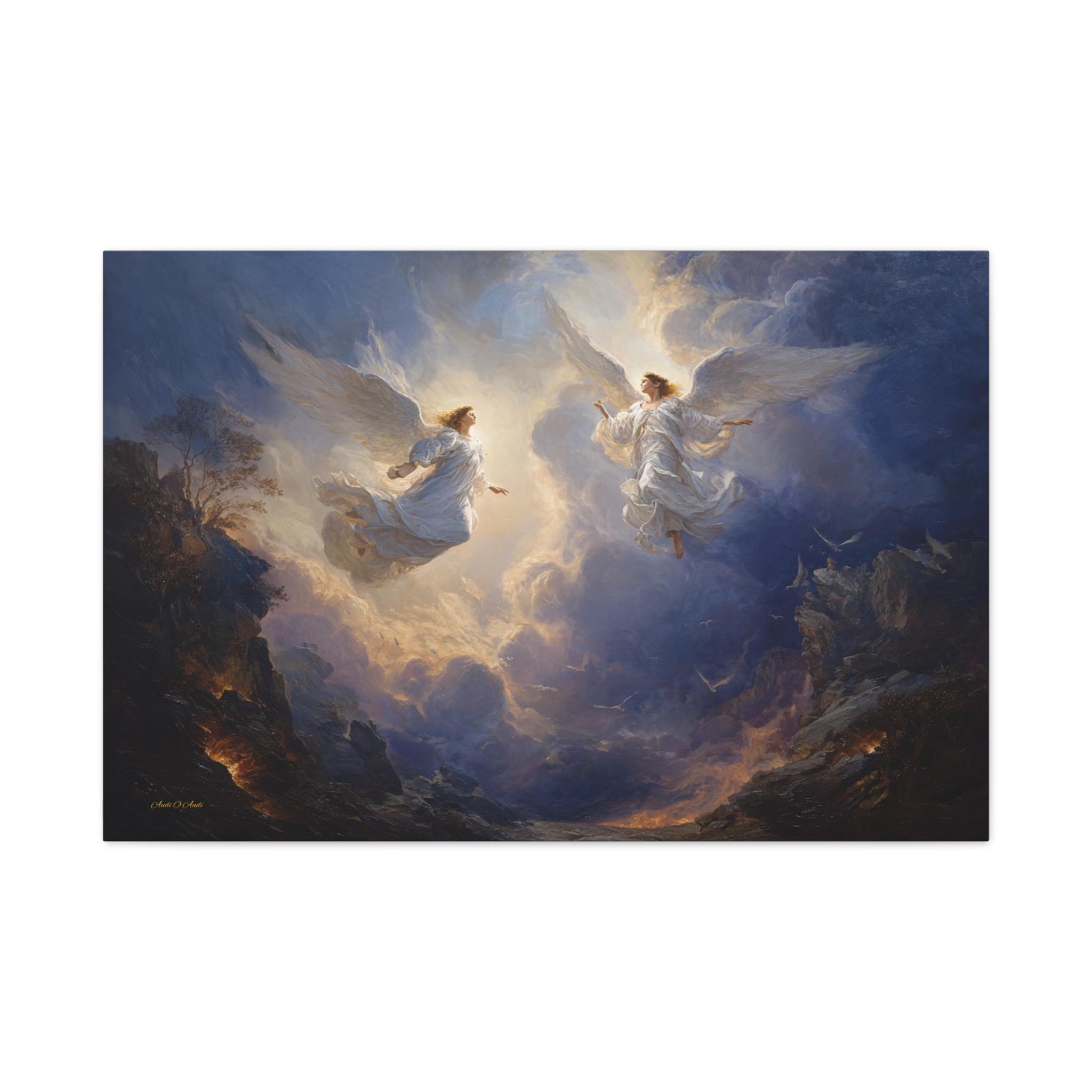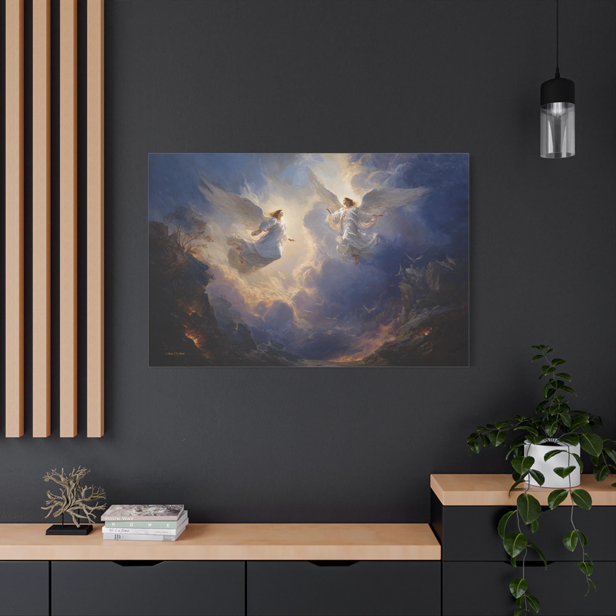 Bring the epic drama and breathtaking beauty of classical spiritual art into your space with this stunning Angels canvas print. This captivating artwork features two majestic angels with flowing white robes and expansive wings, illuminated by a radiant burst of celestial light. They descend through heavily textured, dramatic clouds toward a dark, rugged, and moody rocky landscape below.