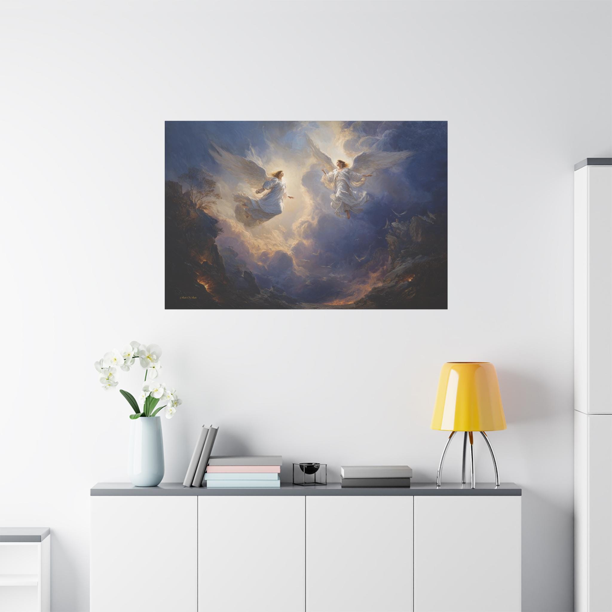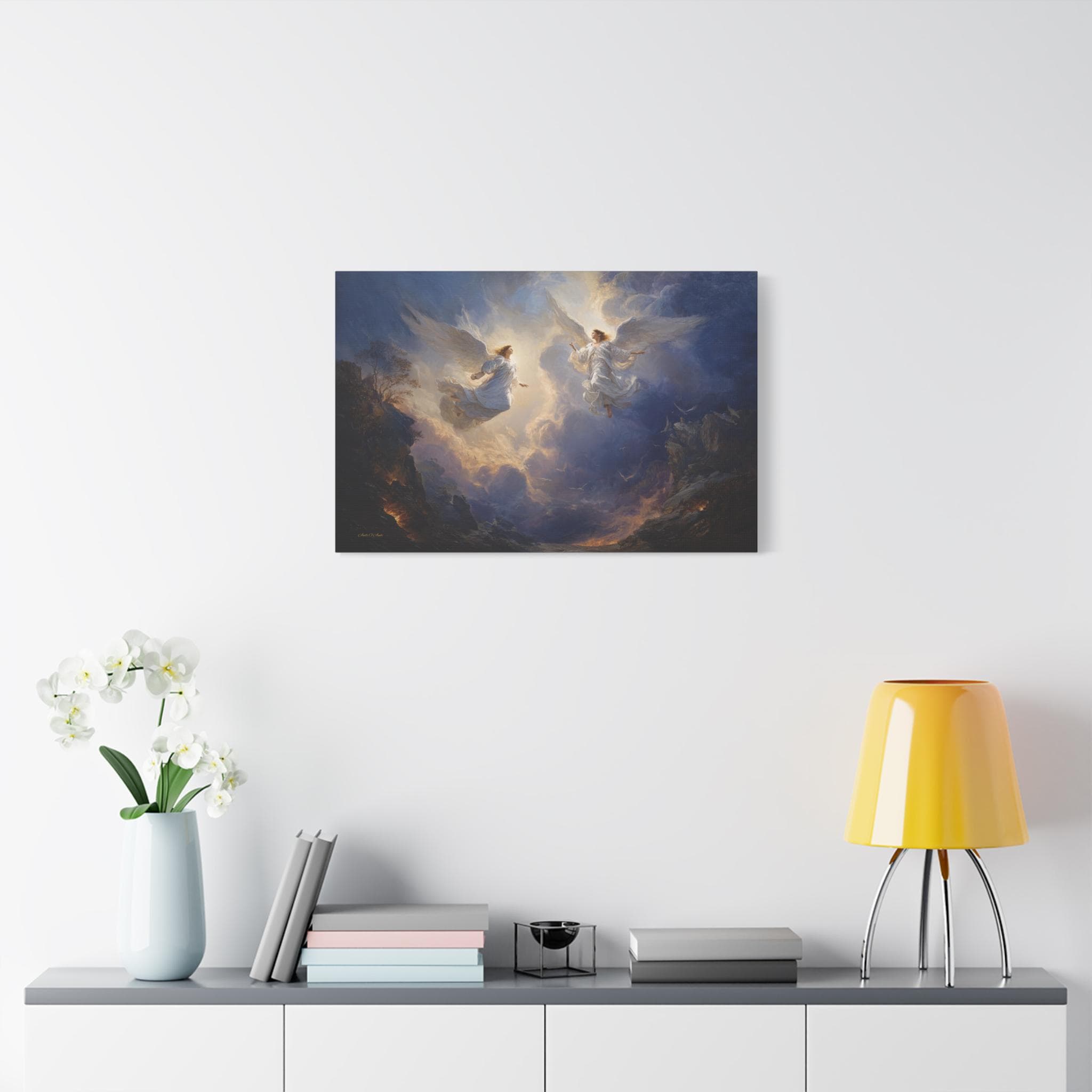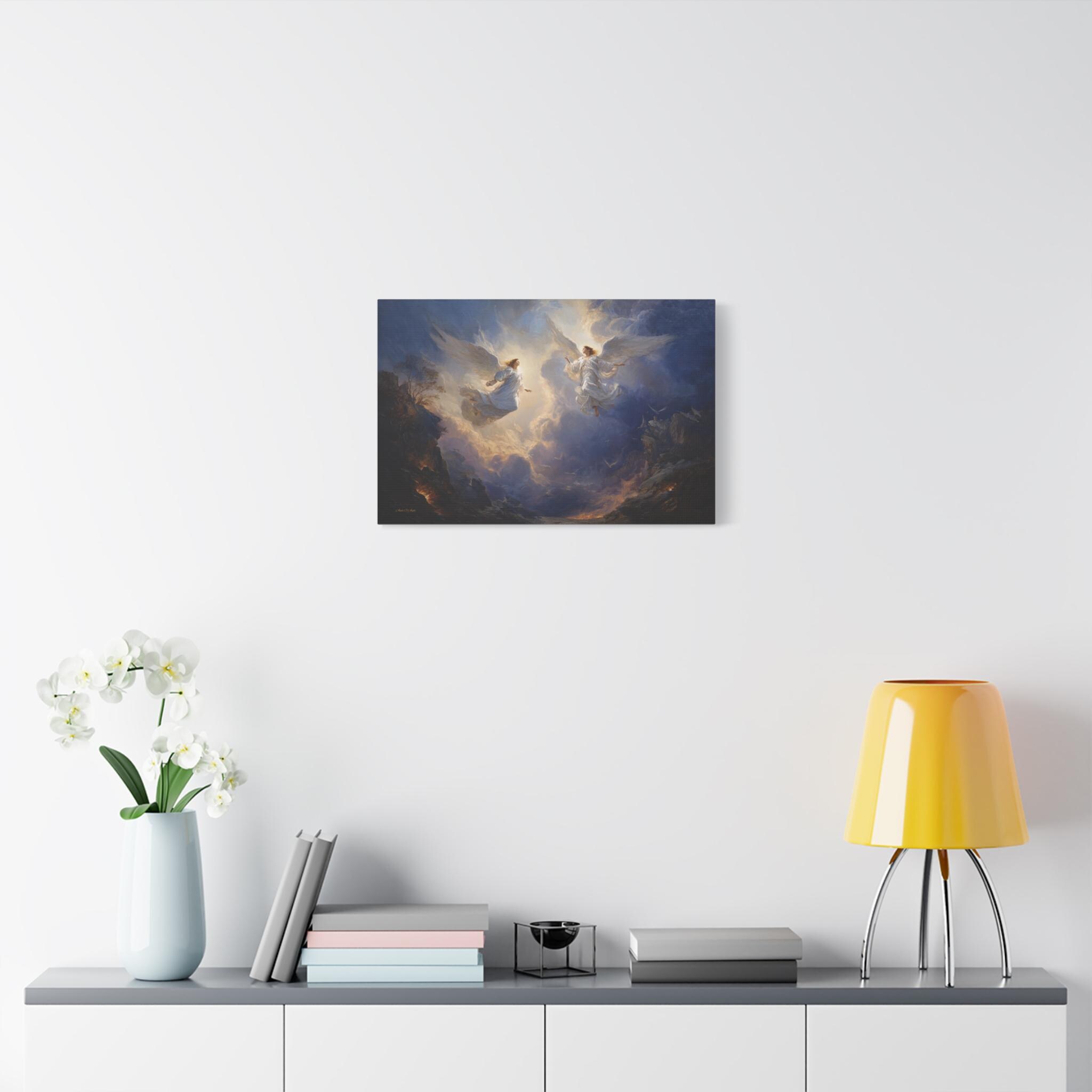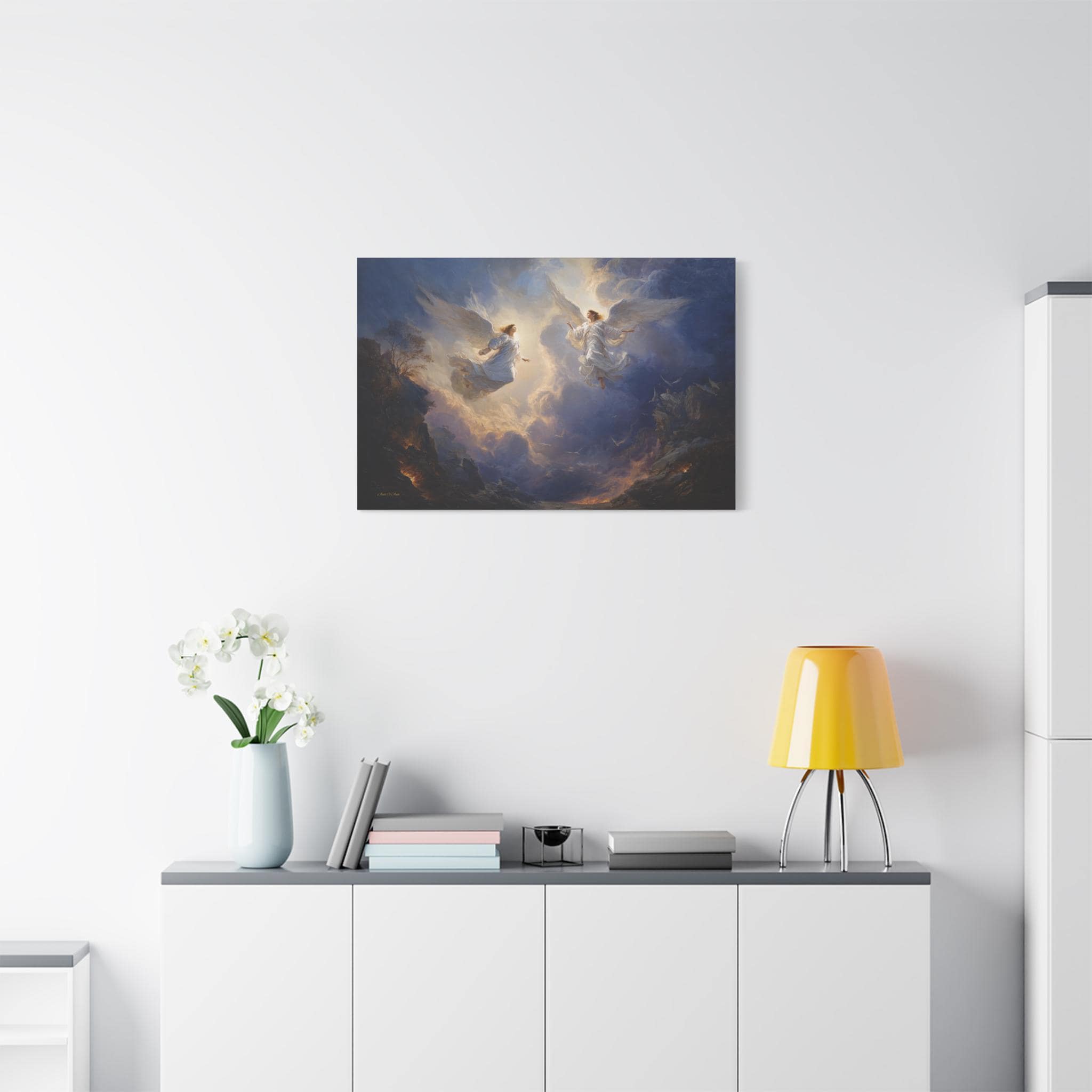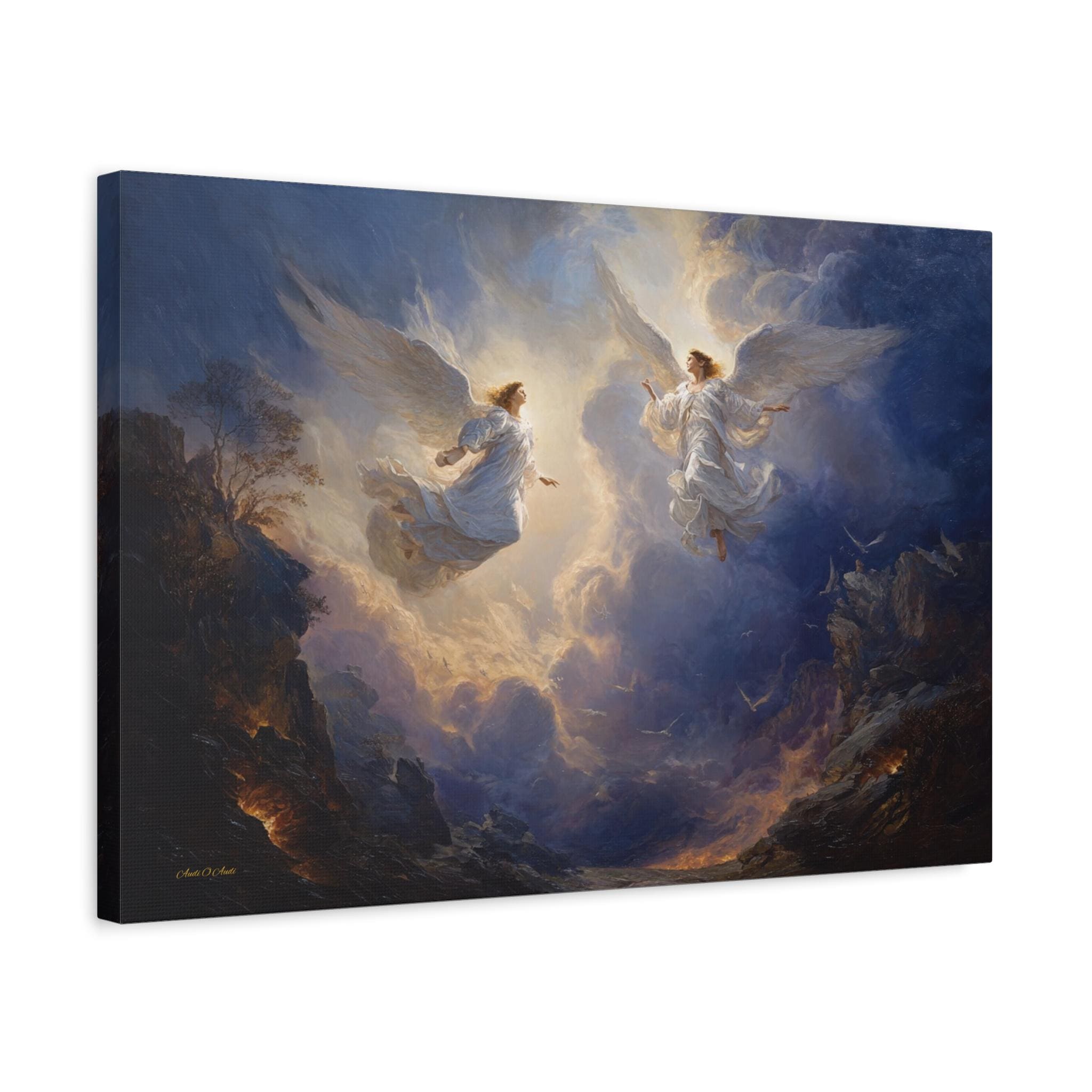Bring the epic drama and breathtaking beauty of classical spiritual art into your space with this stunning Angels canvas print. This captivating artwork features two majestic angels with flowing white robes and expansive wings, illuminated by a radiant burst of celestial light. They descend through heavily textured, dramatic clouds toward a dark, rugged, and moody rocky landscape below.