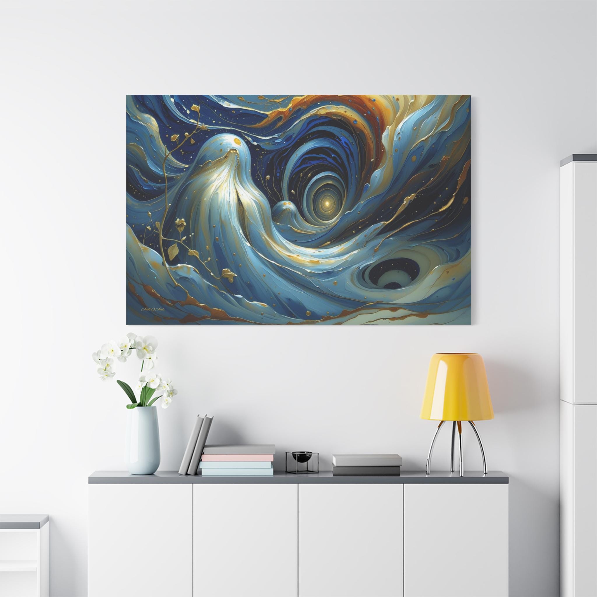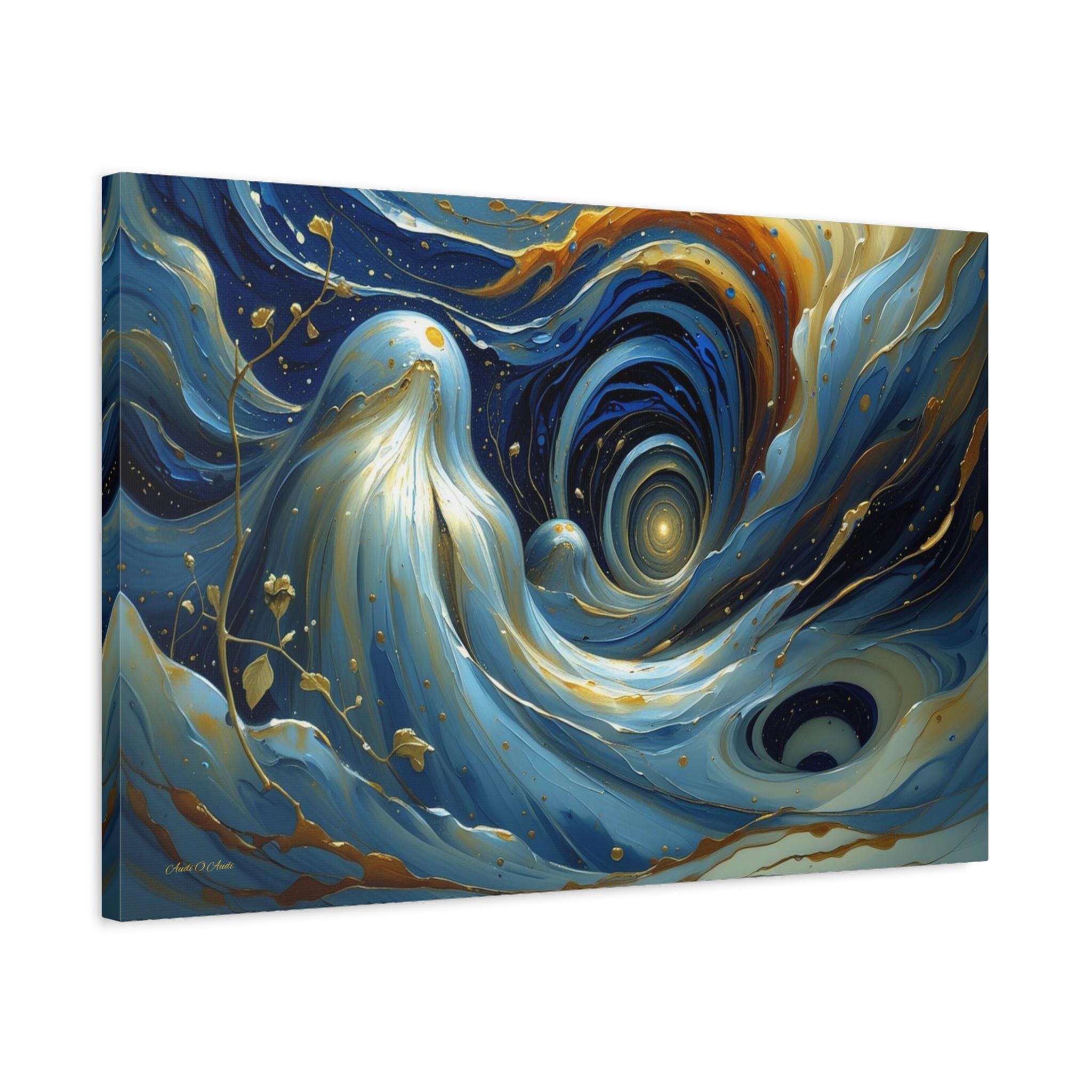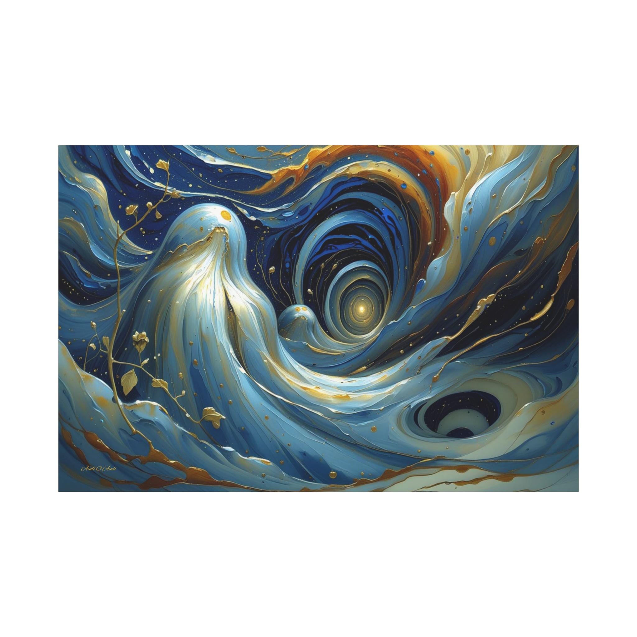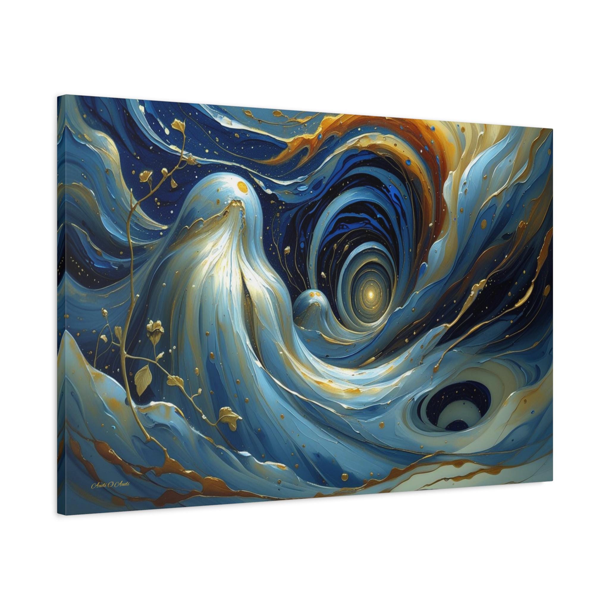Bring mesmerizing, fluid movement and modern luxury into your space with this stunning blue and gold abstract canvas print. This captivating horizontal artwork features sweeping, ethereal waves of deep navy, rich teal, and soft cerulean blue, beautifully intertwined with radiant, metallic-looking gold veins and glowing cosmic droplets. The dynamic, swirling composition draws the eye into a luminous, dreamlike vortex.