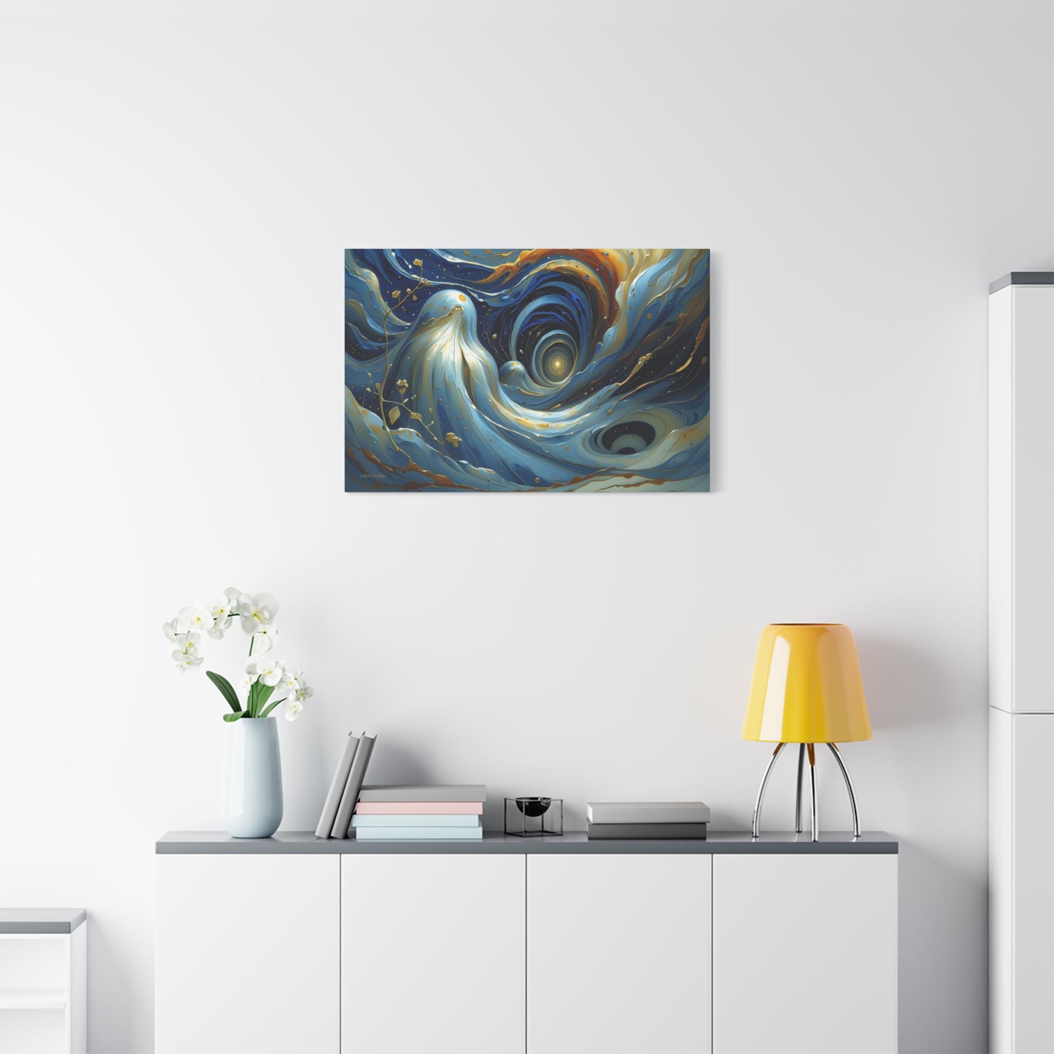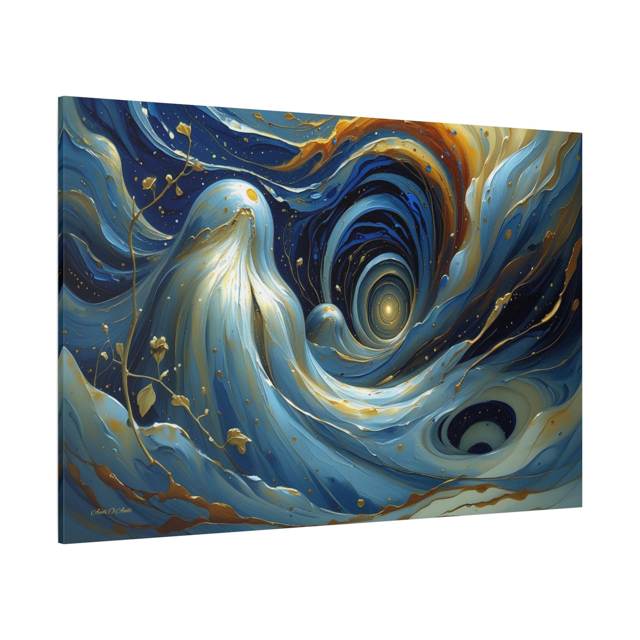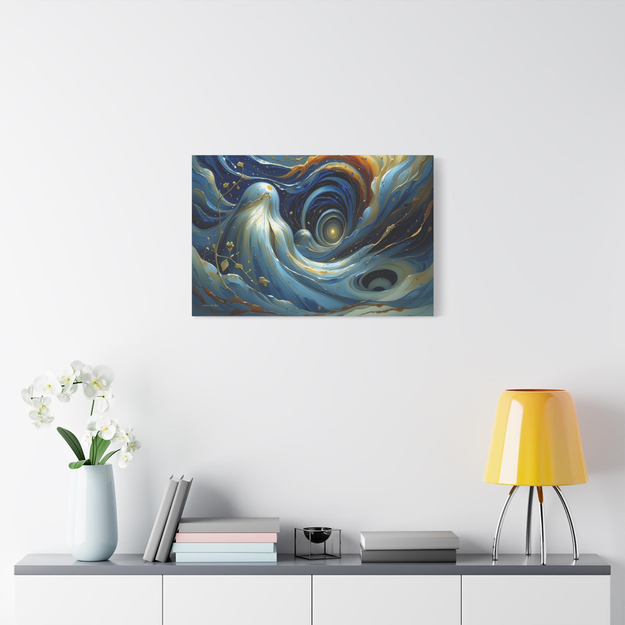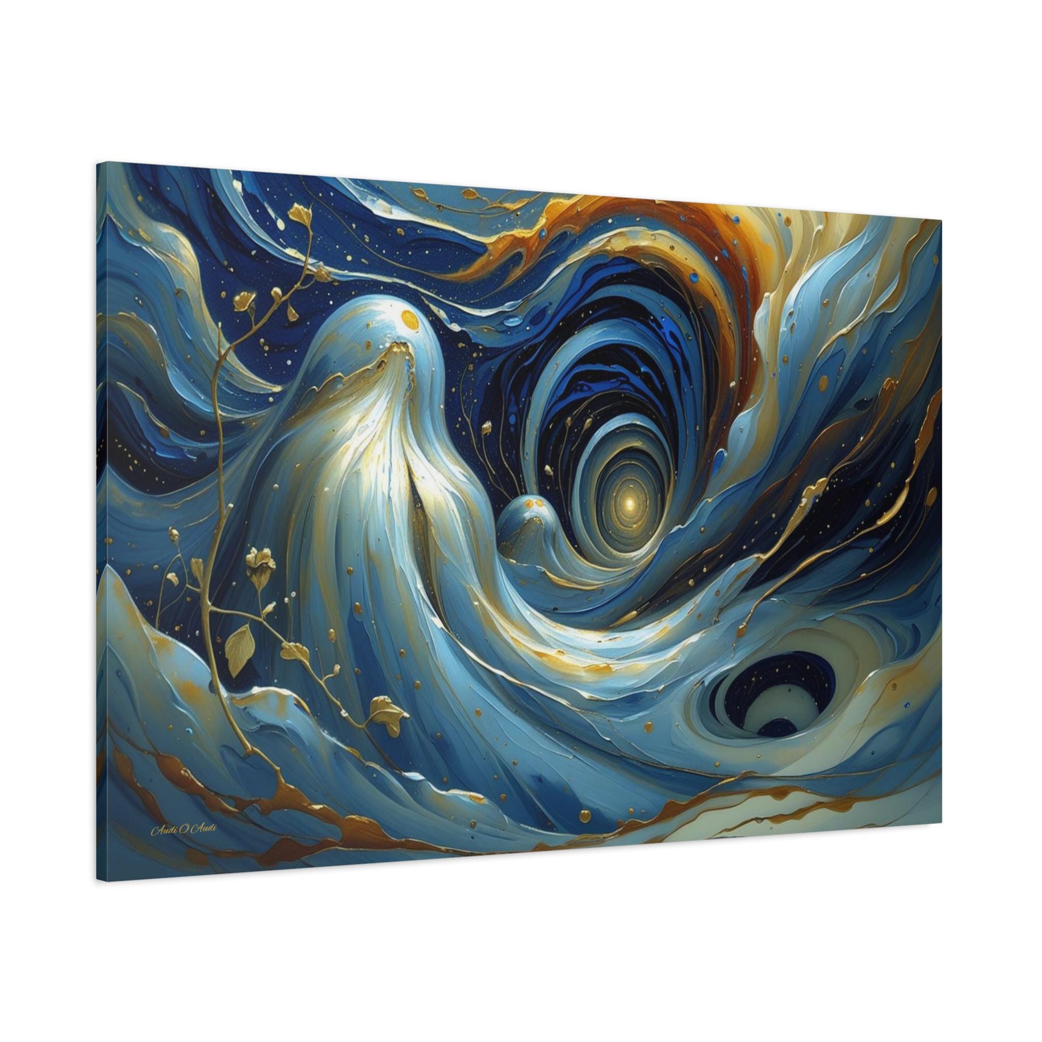 Bring mesmerizing, fluid movement and modern luxury into your space with this stunning blue and gold abstract canvas print. This captivating horizontal artwork features sweeping, ethereal waves of deep navy, rich teal, and soft cerulean blue, beautifully intertwined with radiant, metallic-looking gold veins and glowing cosmic droplets. The dynamic, swirling composition draws the eye into a luminous, dreamlike vortex.