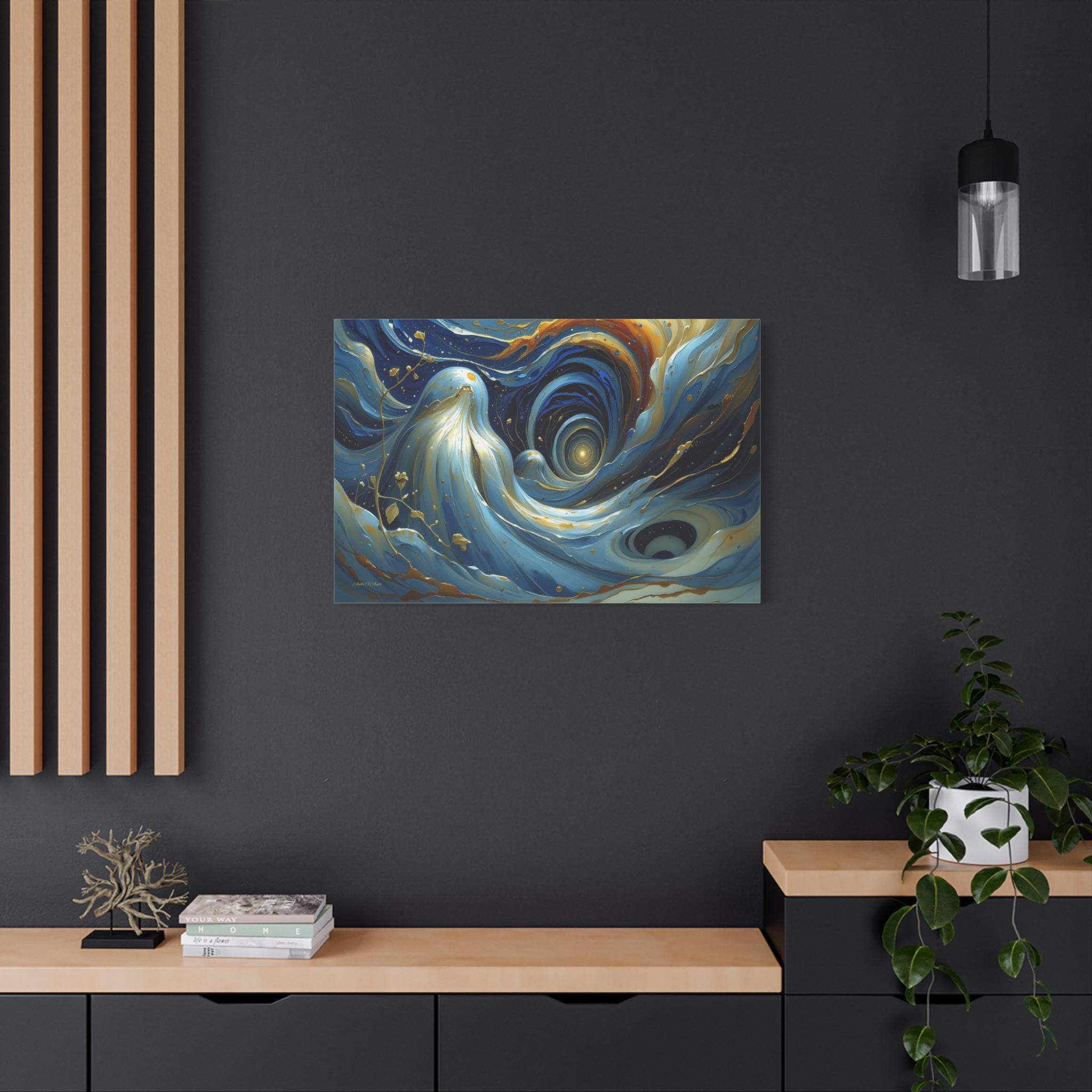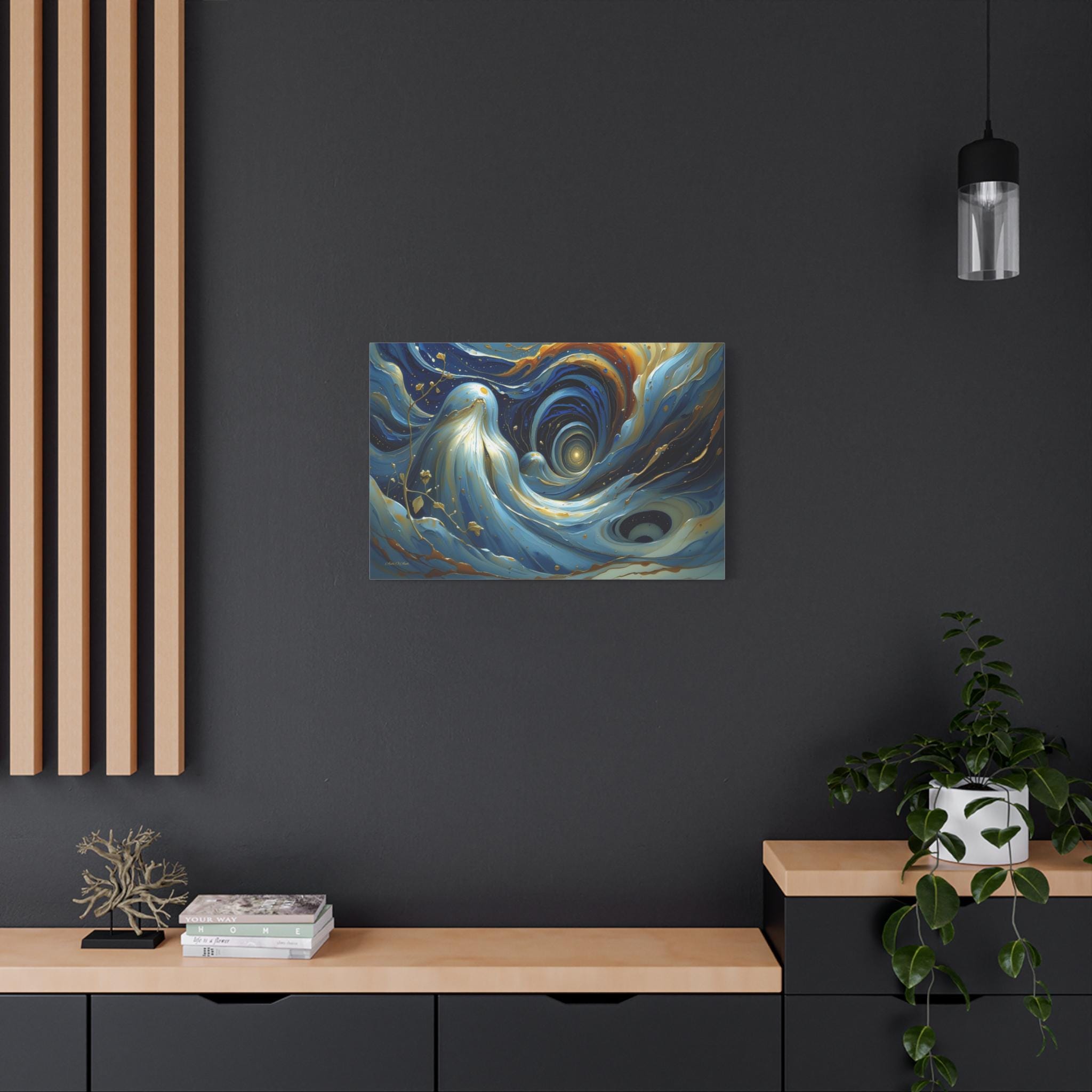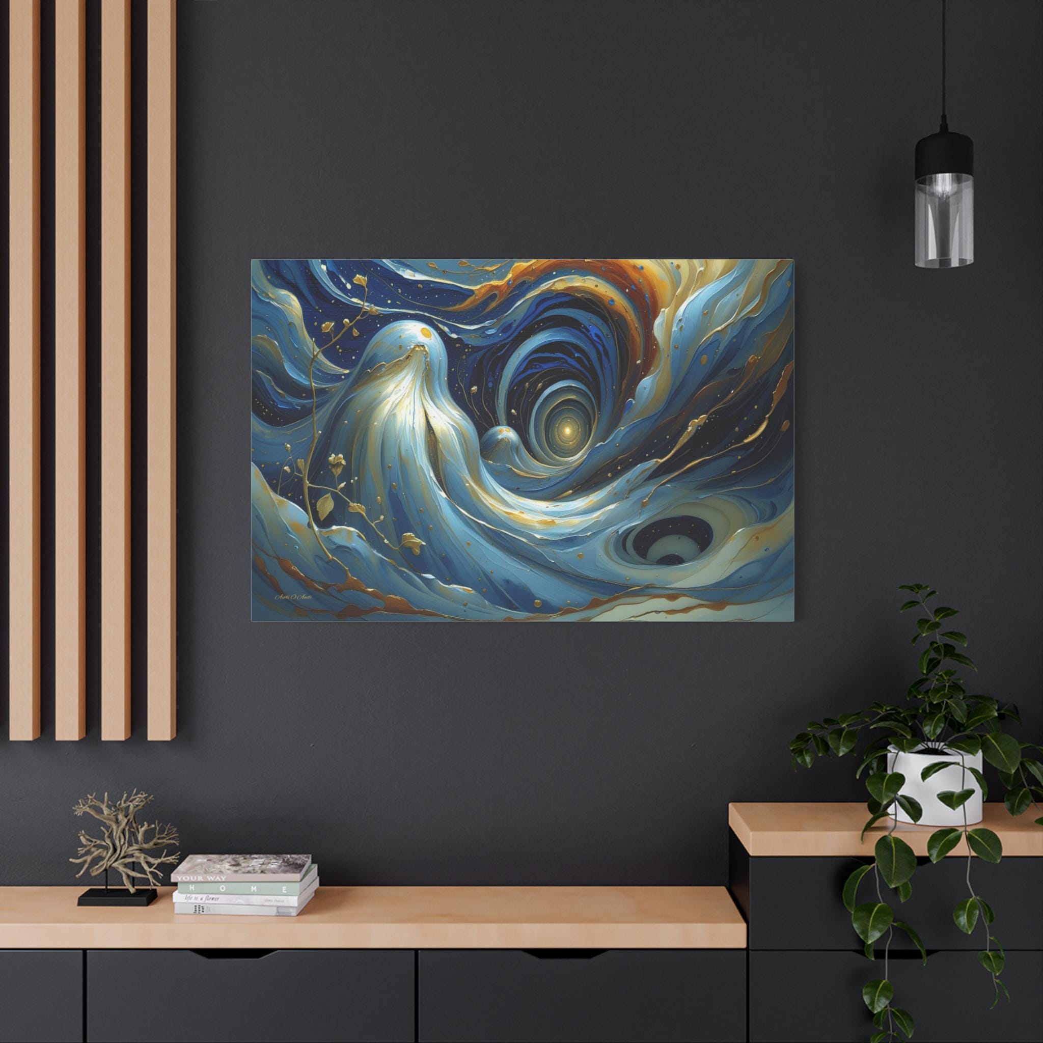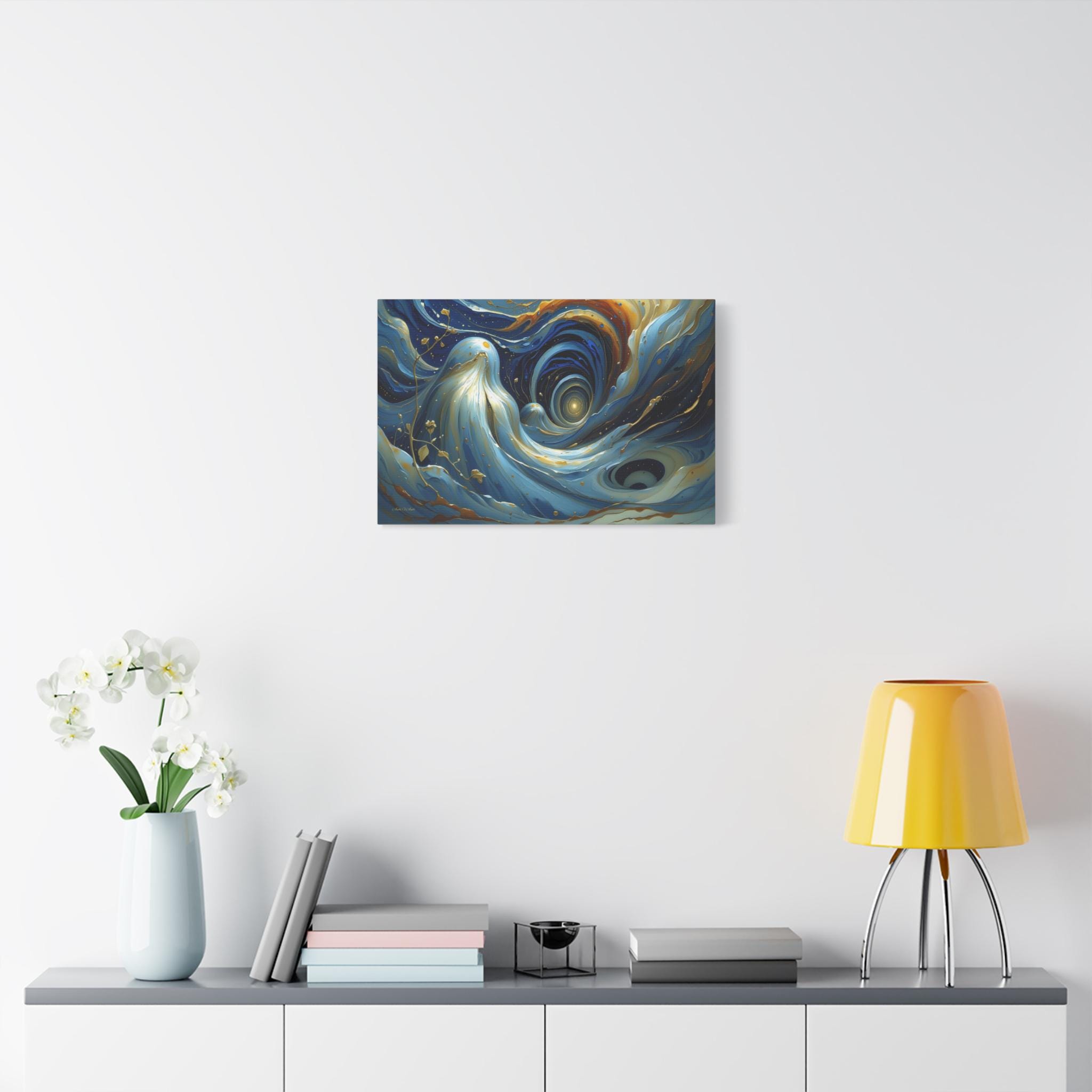 Bring mesmerizing, fluid movement and modern luxury into your space with this stunning blue and gold abstract canvas print. This captivating horizontal artwork features sweeping, ethereal waves of deep navy, rich teal, and soft cerulean blue, beautifully intertwined with radiant, metallic-looking gold veins and glowing cosmic droplets. The dynamic, swirling composition draws the eye into a luminous, dreamlike vortex.