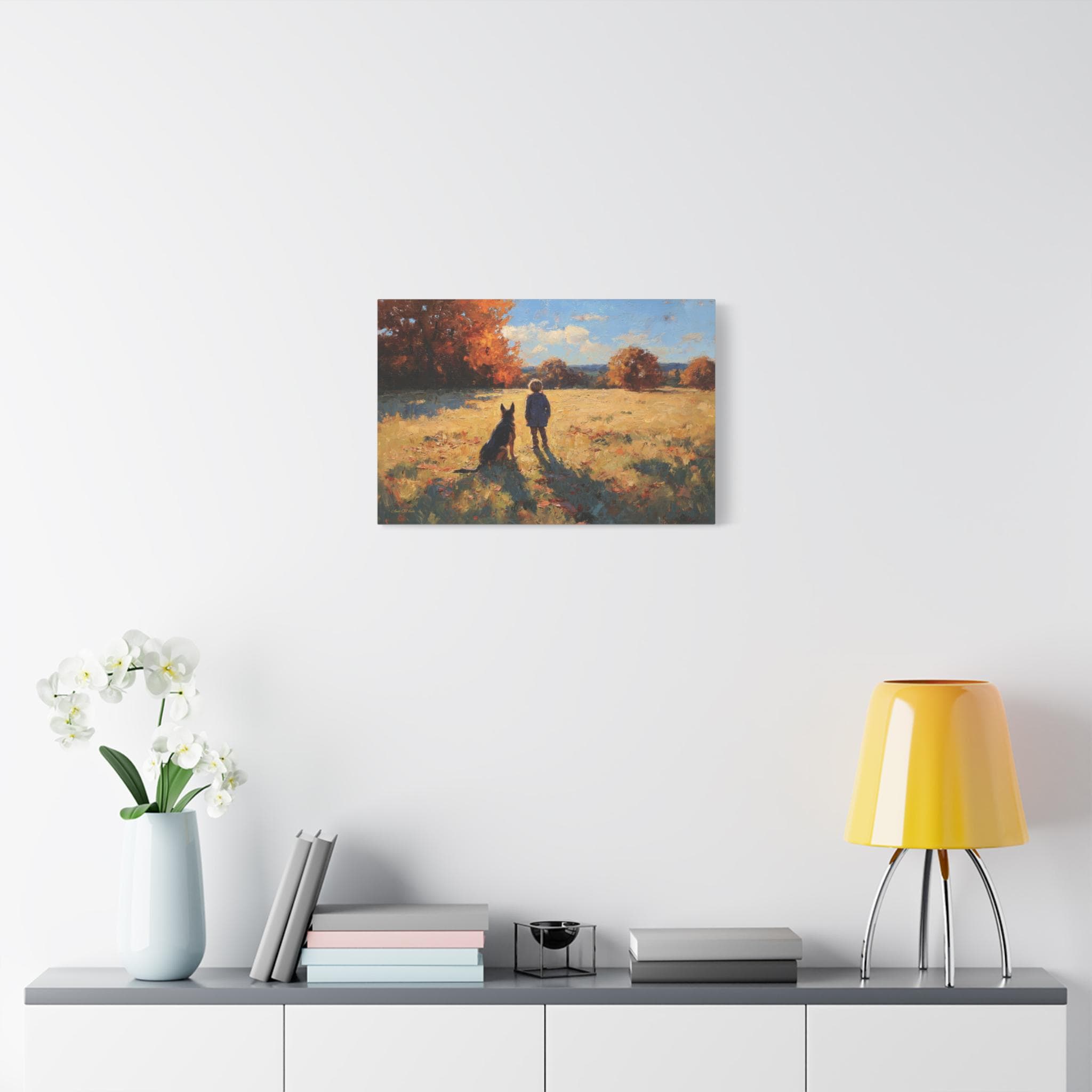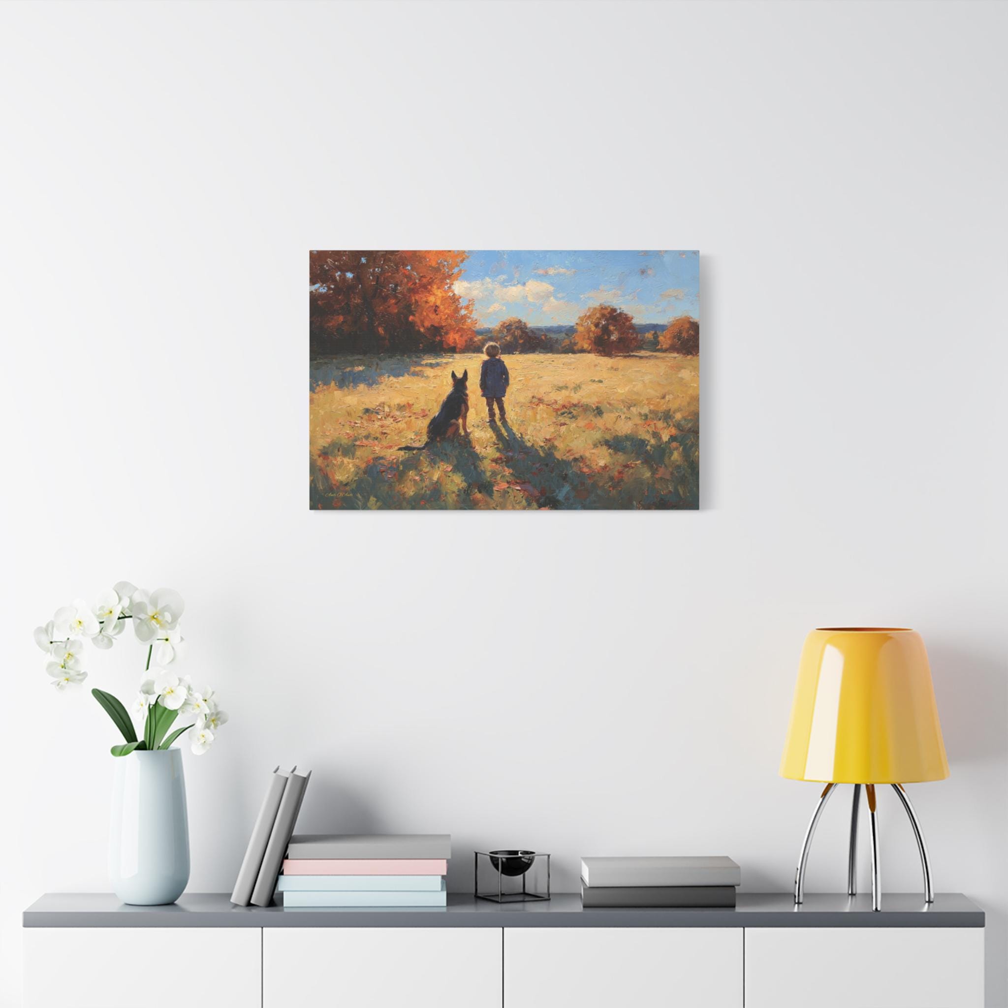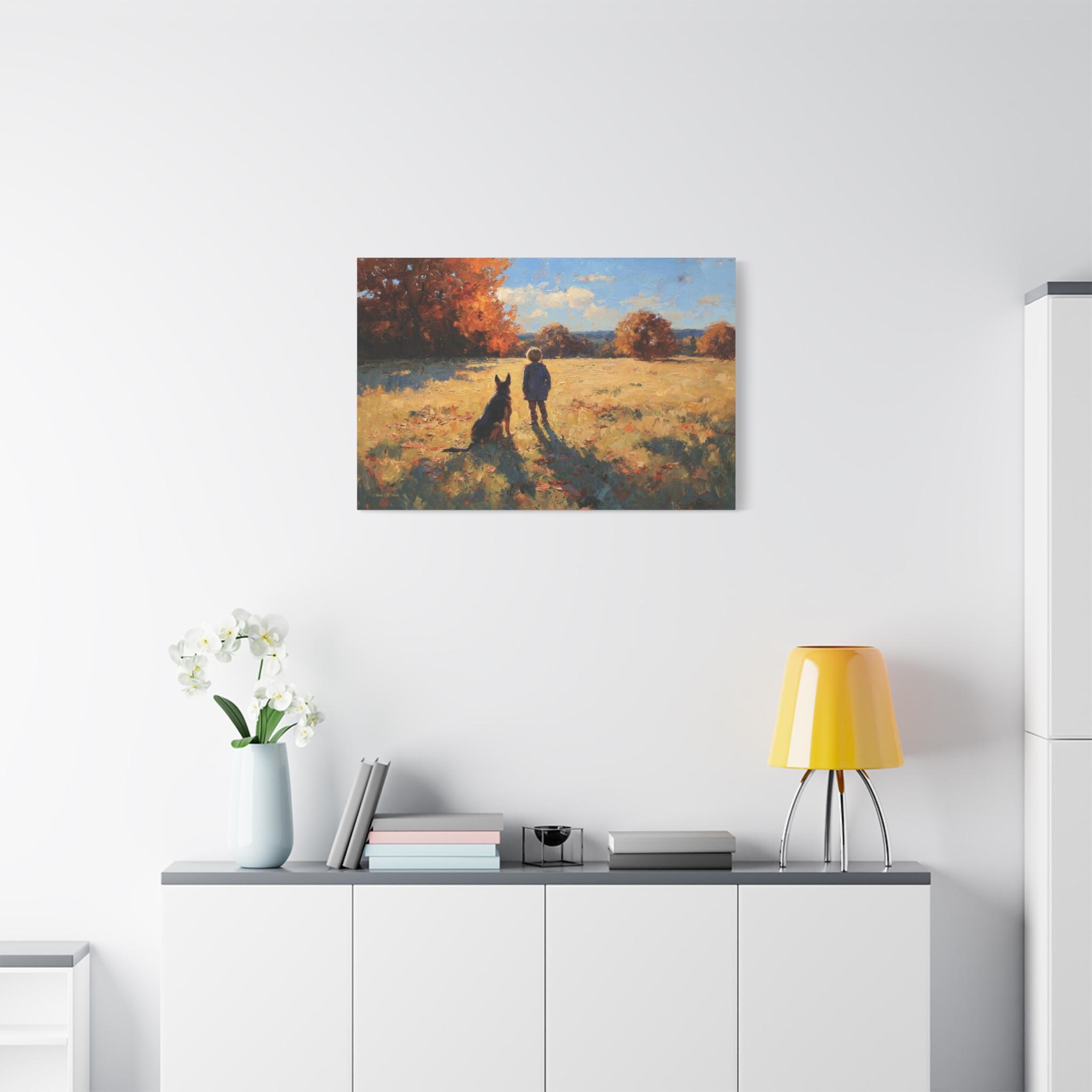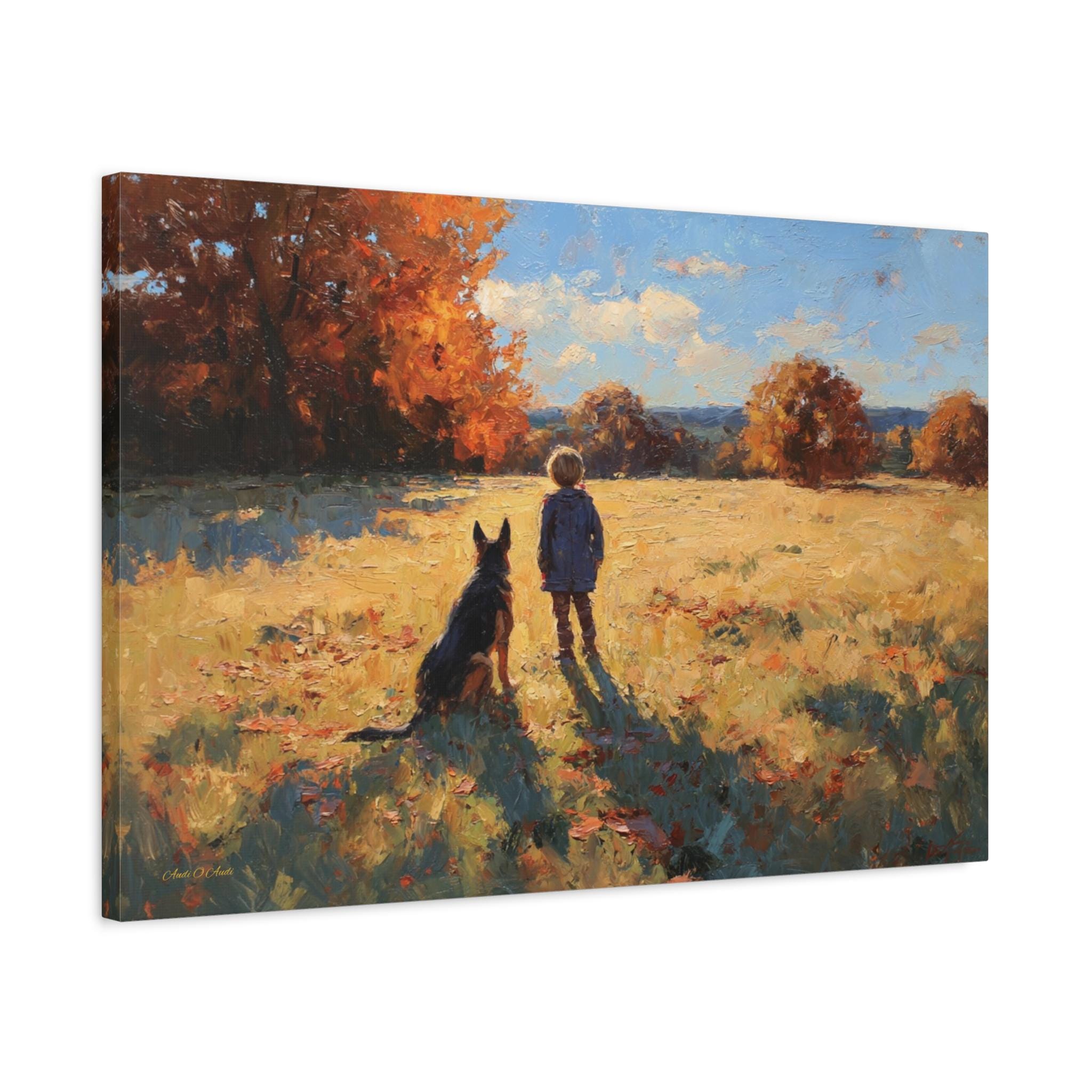 Bring the profound warmth, nostalgic beauty, and unbreakable bond of childhood friendship into your home with this stunning autumn landscape canvas print. This captivating artwork features a young boy and his loyal dog standing side-by-side in a sun-drenched, golden field, looking out together toward a beautifully textured forest of vibrant fall foliage.