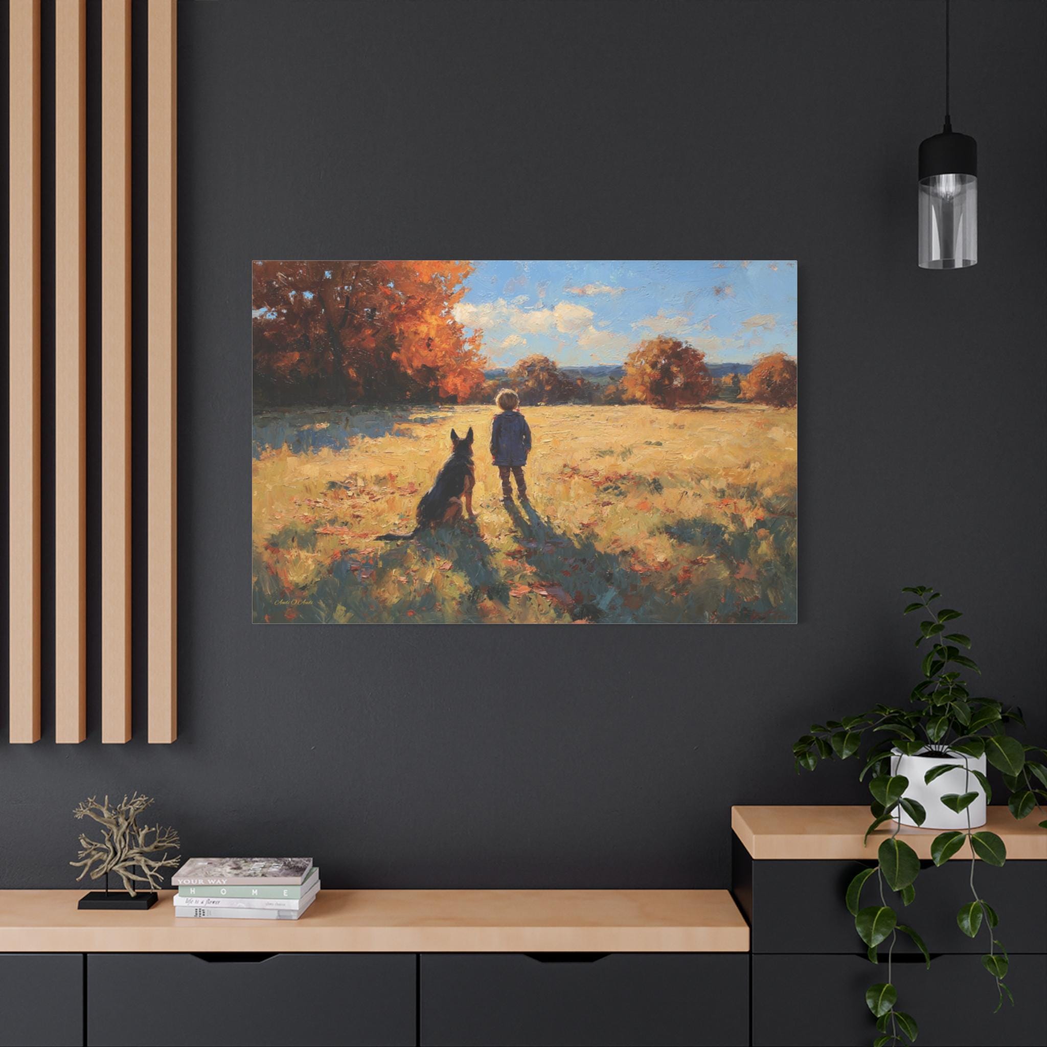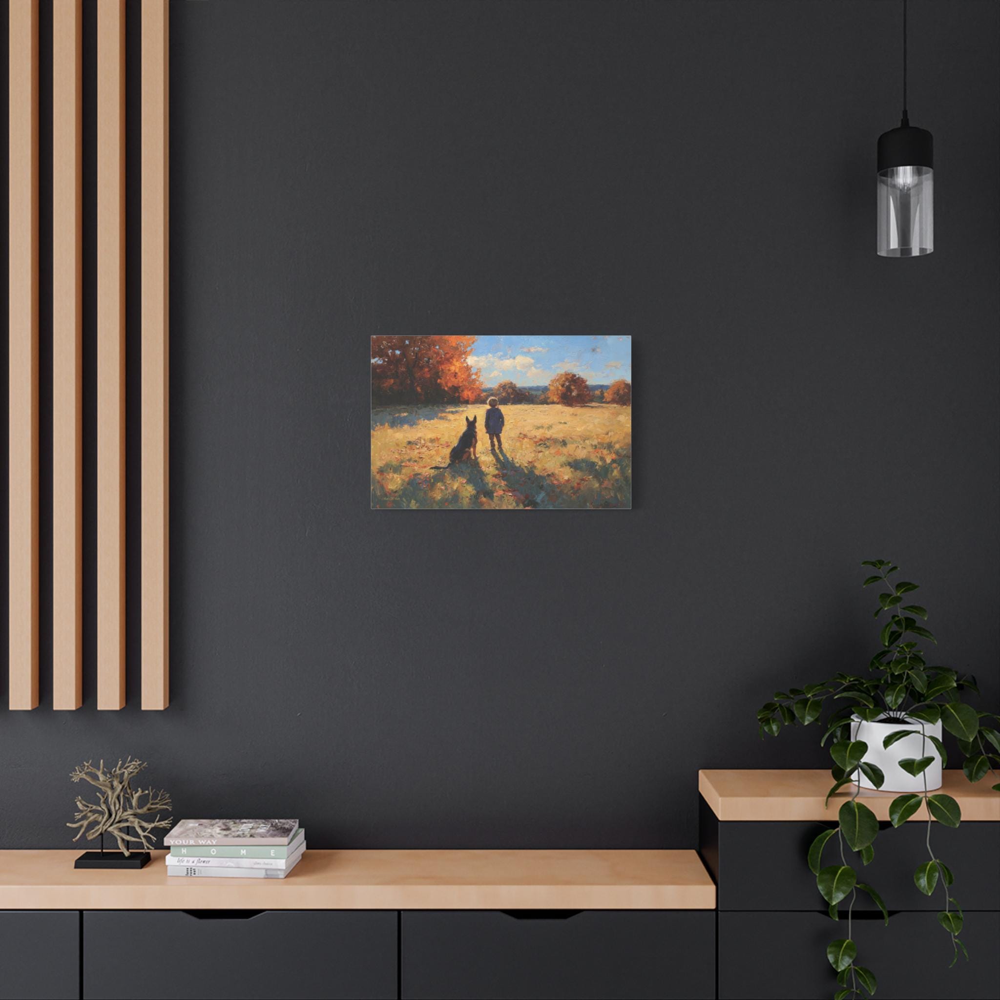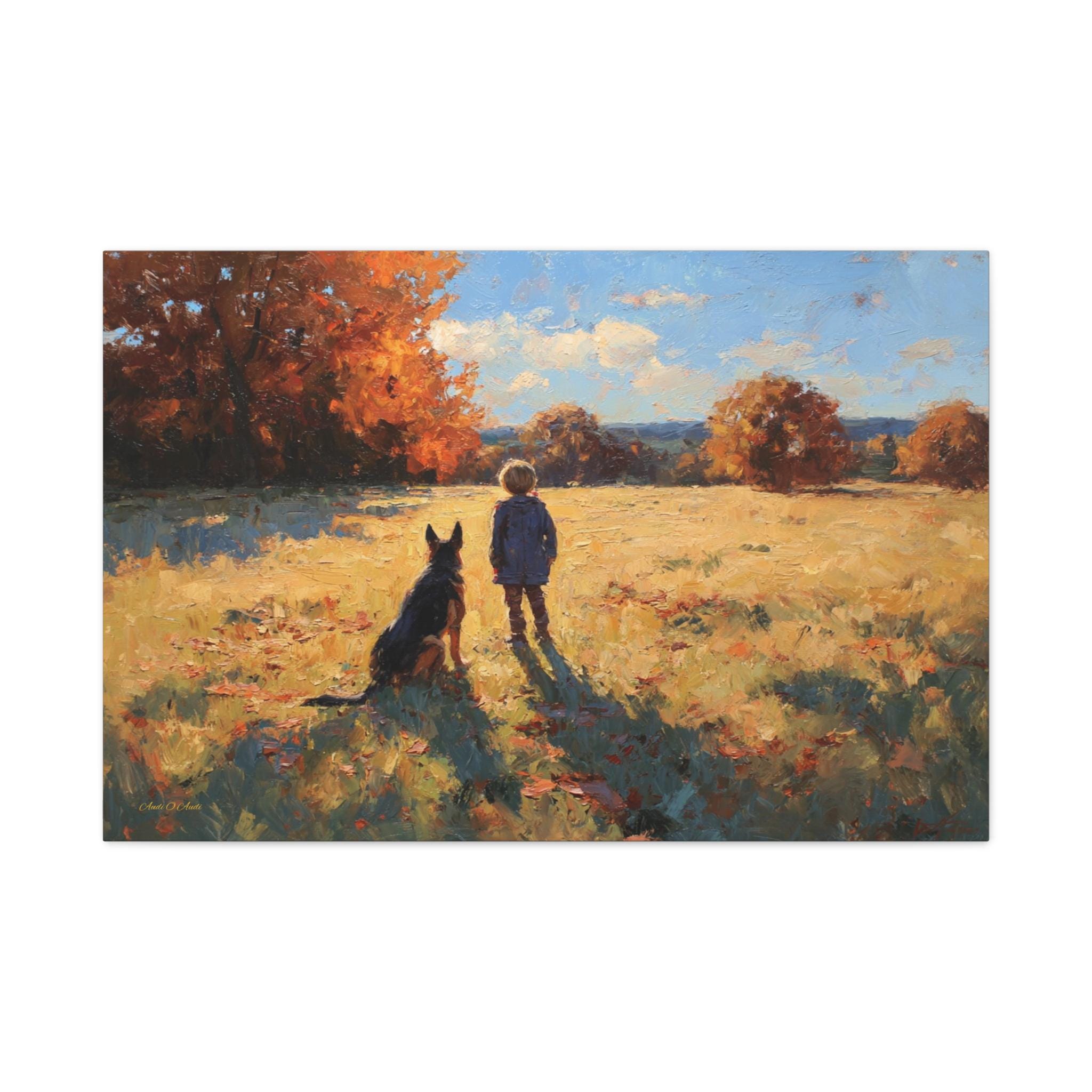 Bring the profound warmth, nostalgic beauty, and unbreakable bond of childhood friendship into your home with this stunning autumn landscape canvas print. This captivating artwork features a young boy and his loyal dog standing side-by-side in a sun-drenched, golden field, looking out together toward a beautifully textured forest of vibrant fall foliage.