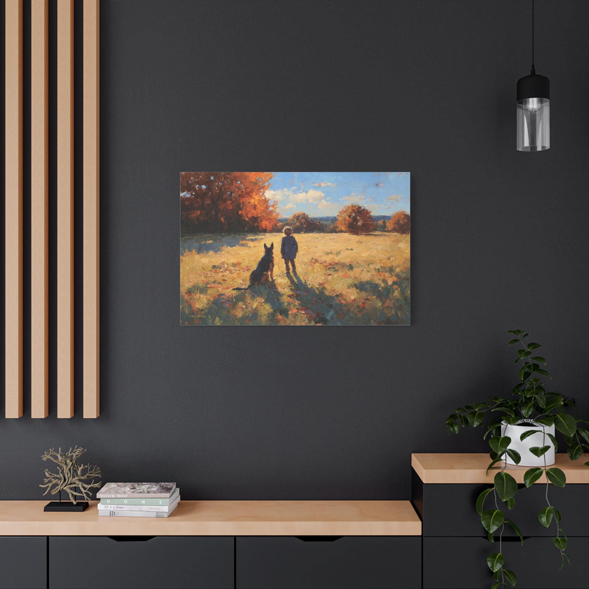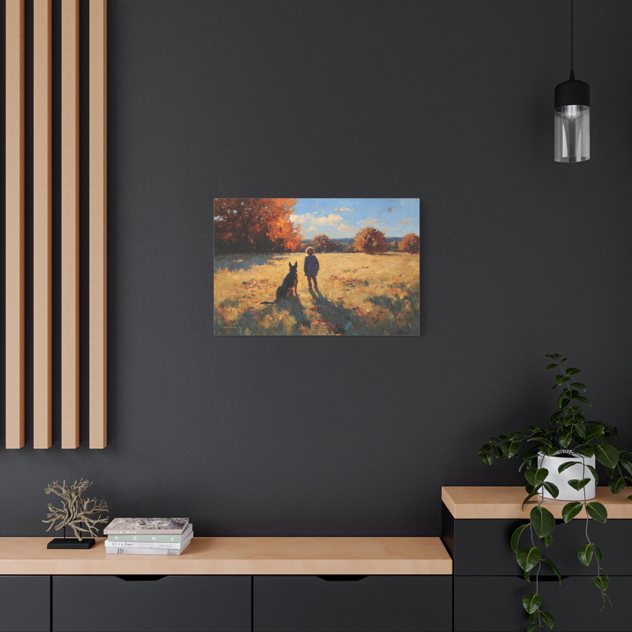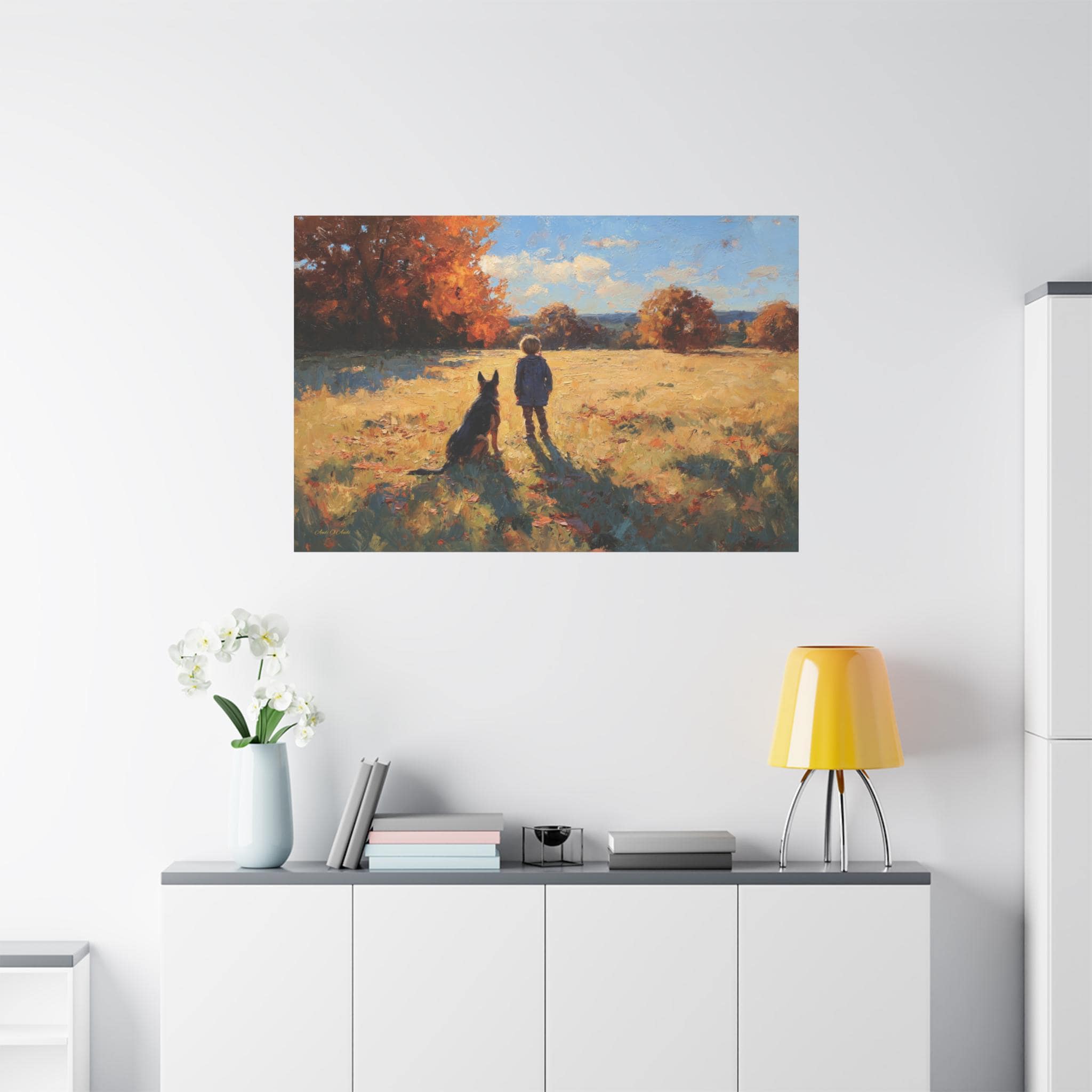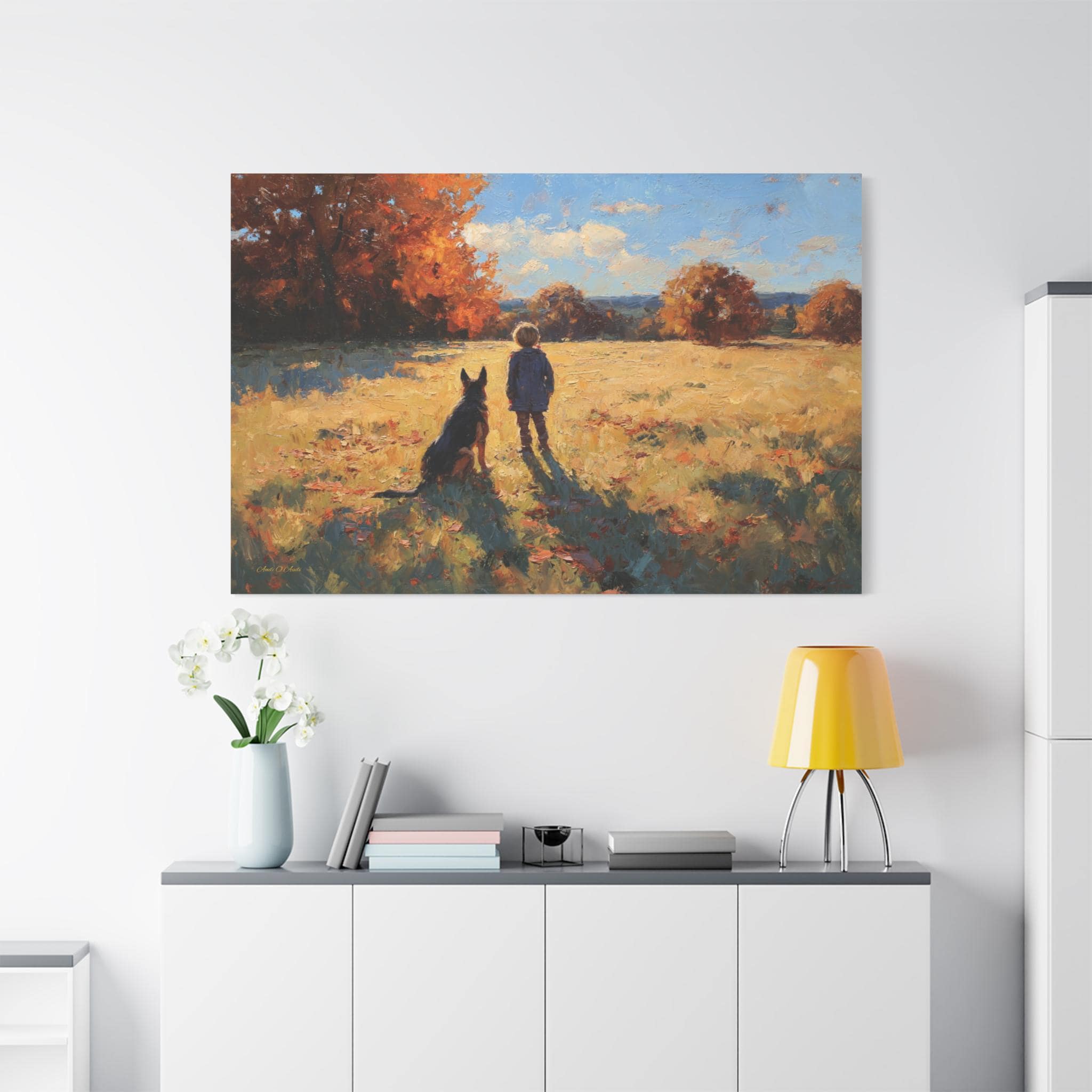 Bring the profound warmth, nostalgic beauty, and unbreakable bond of childhood friendship into your home with this stunning autumn landscape canvas print. This captivating artwork features a young boy and his loyal dog standing side-by-side in a sun-drenched, golden field, looking out together toward a beautifully textured forest of vibrant fall foliage.