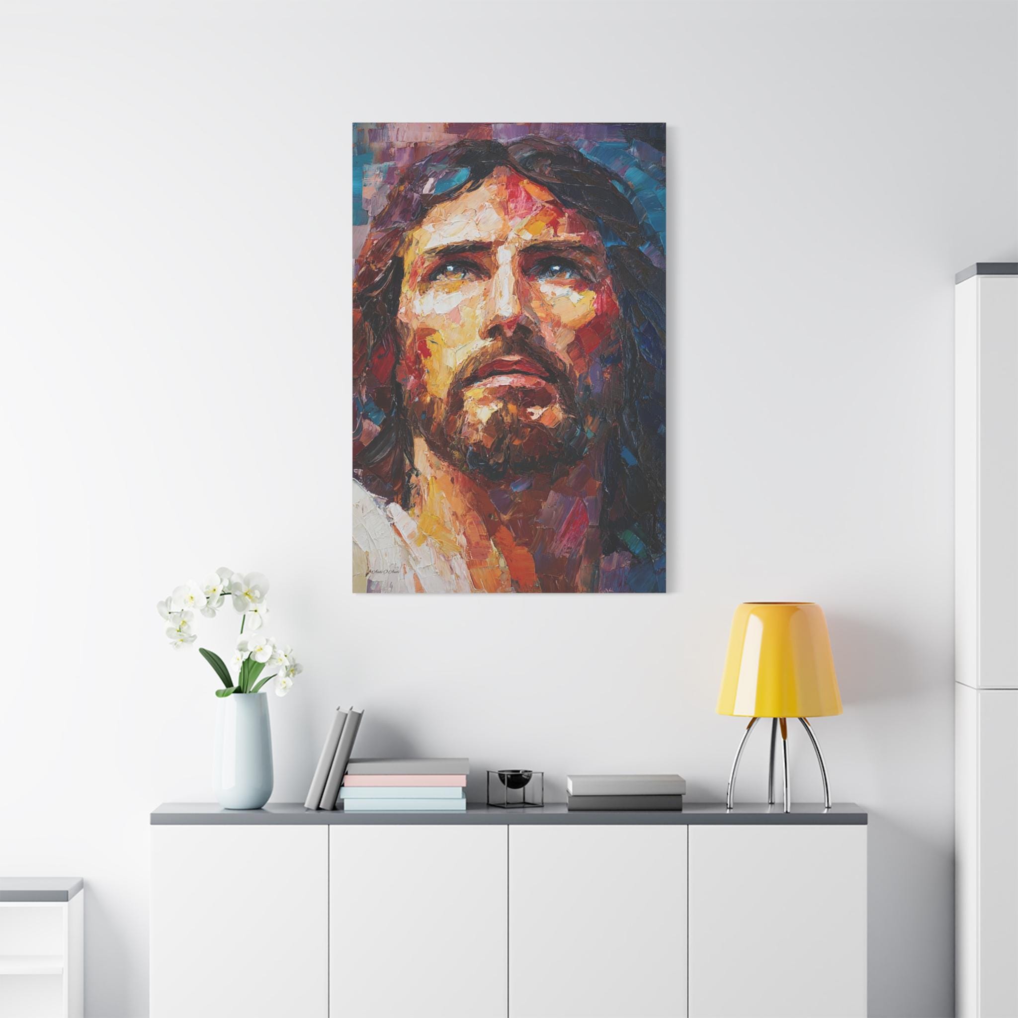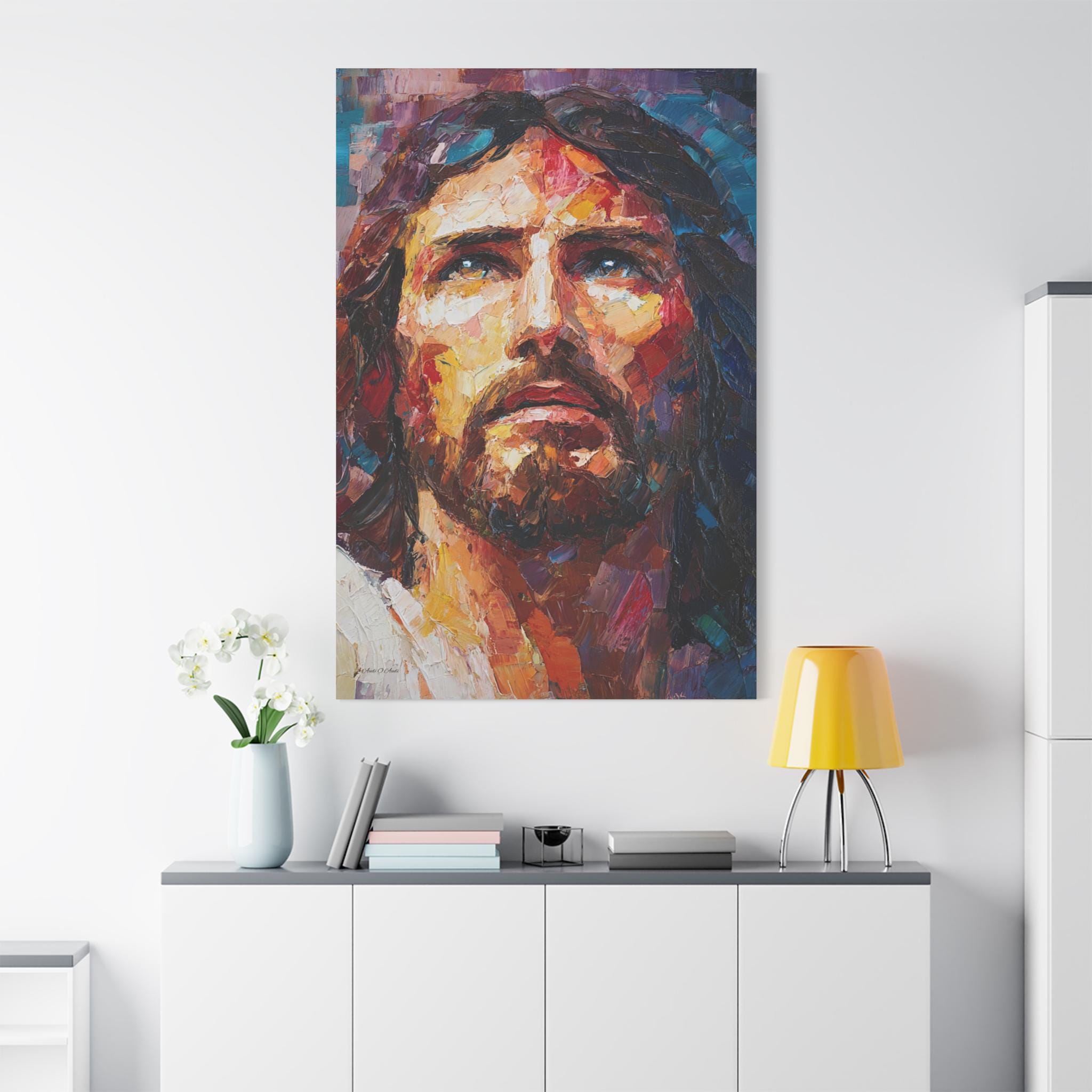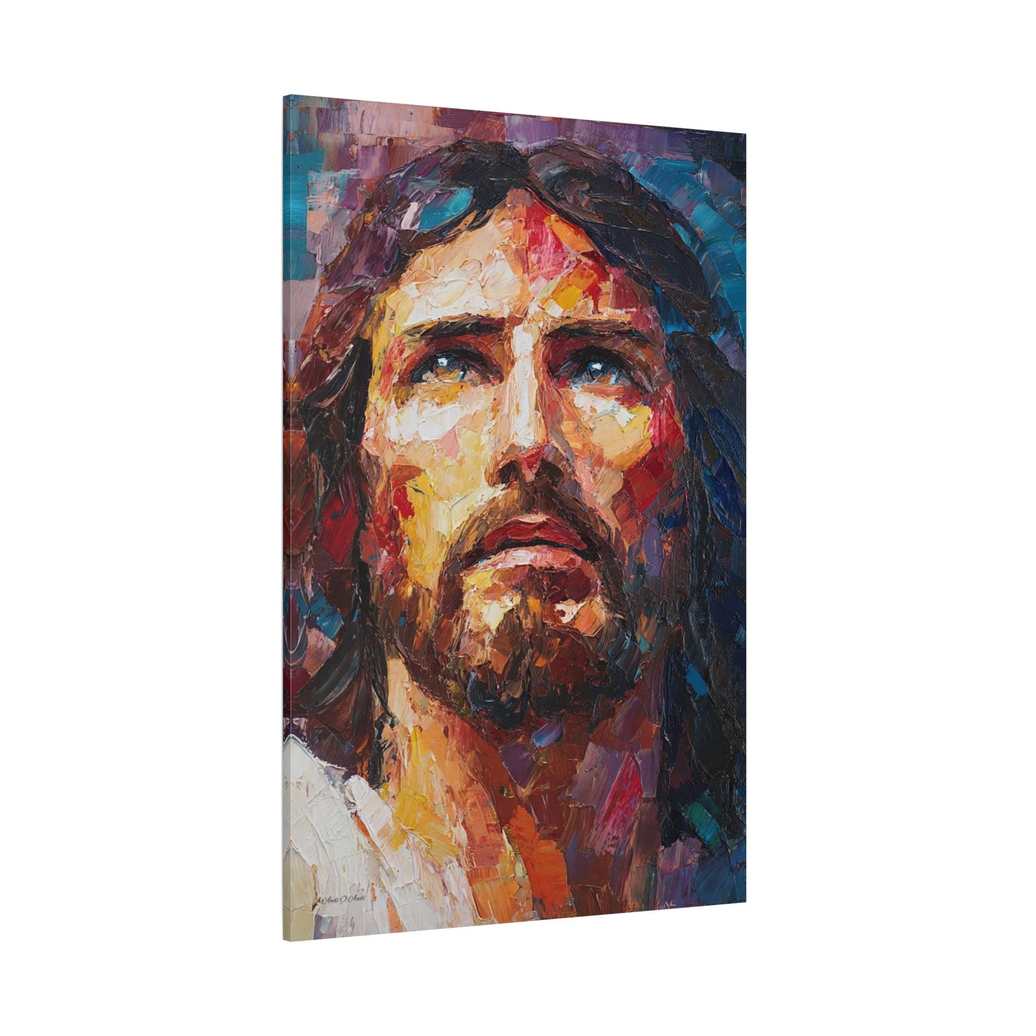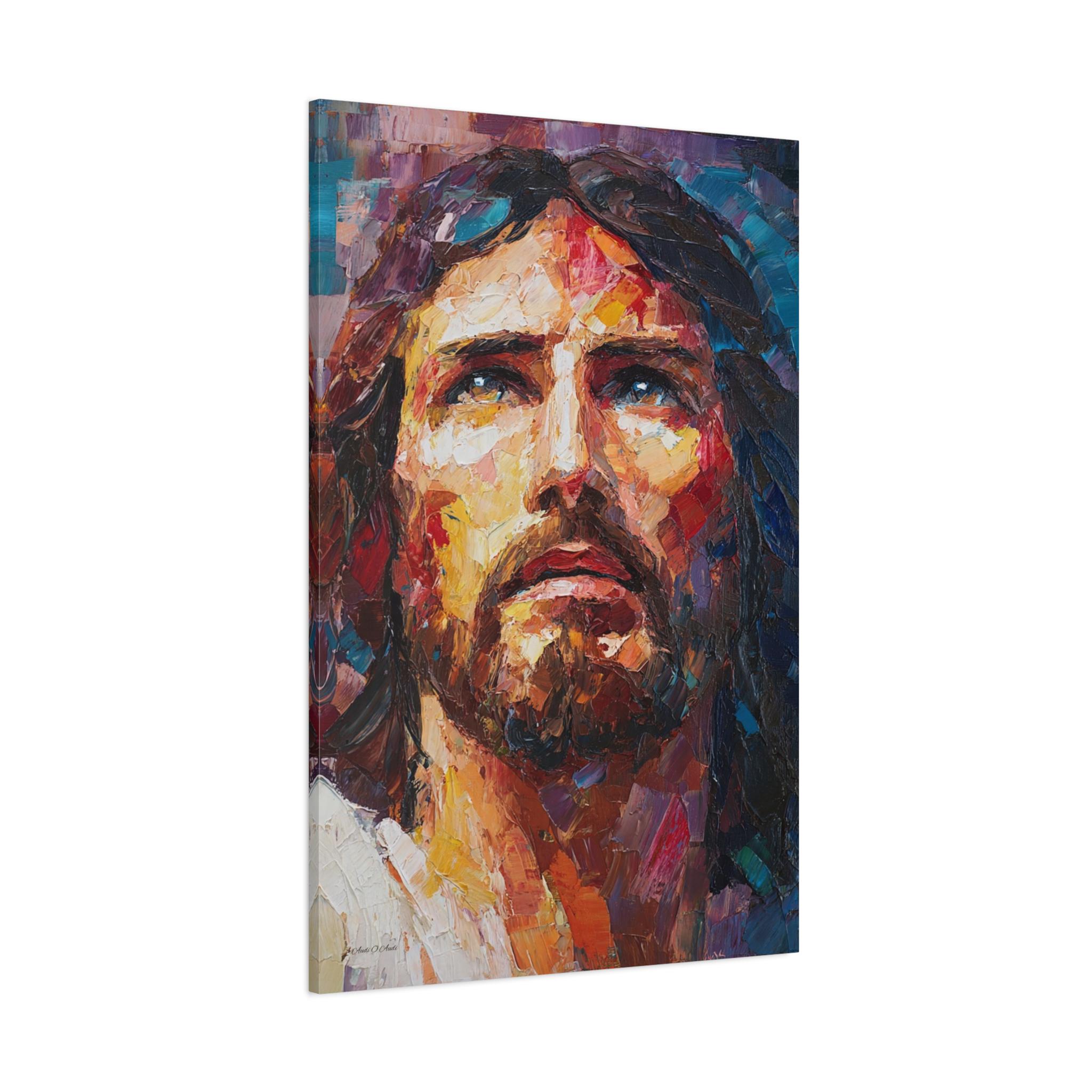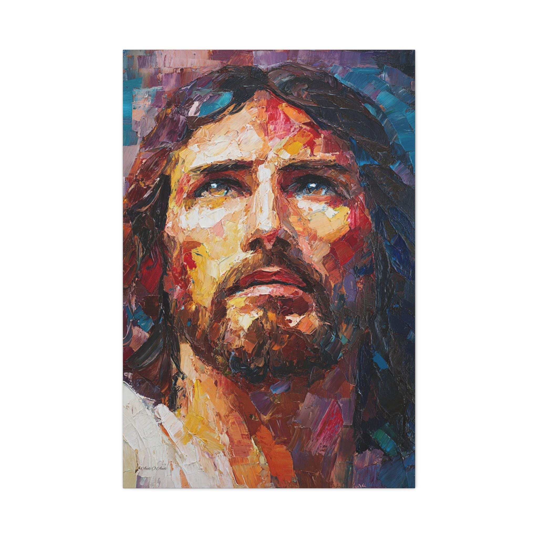 Bring profound peace, majestic grace, and vibrant modern artistry into your home with this stunning Jesus Christ canvas print. This captivating vertical portrait features a close-up, expressive depiction of Christ gazing upward. The artwork is alive with a breathtaking array of colors, from the warm, luminous golds and reds of the face to the deep, reverent blues and purples framing the portrait.