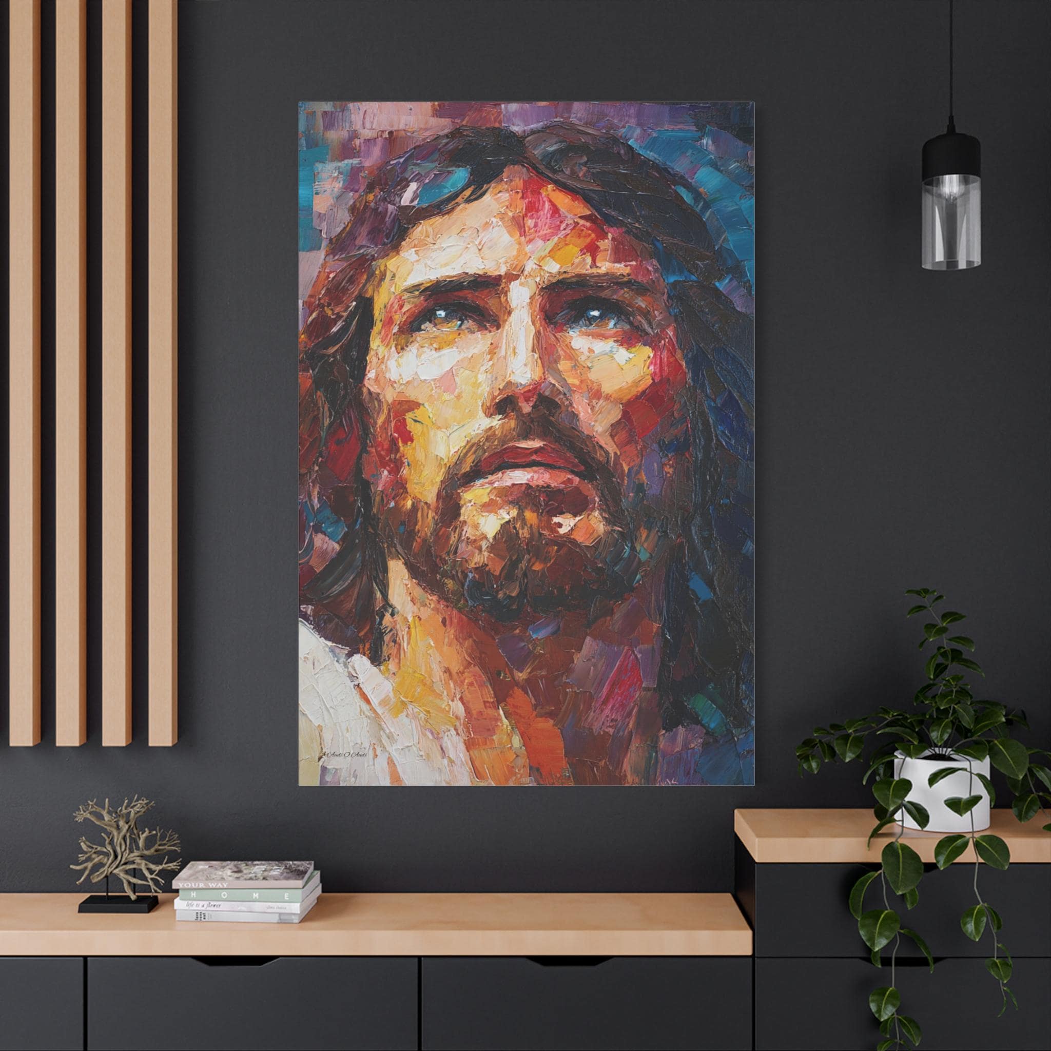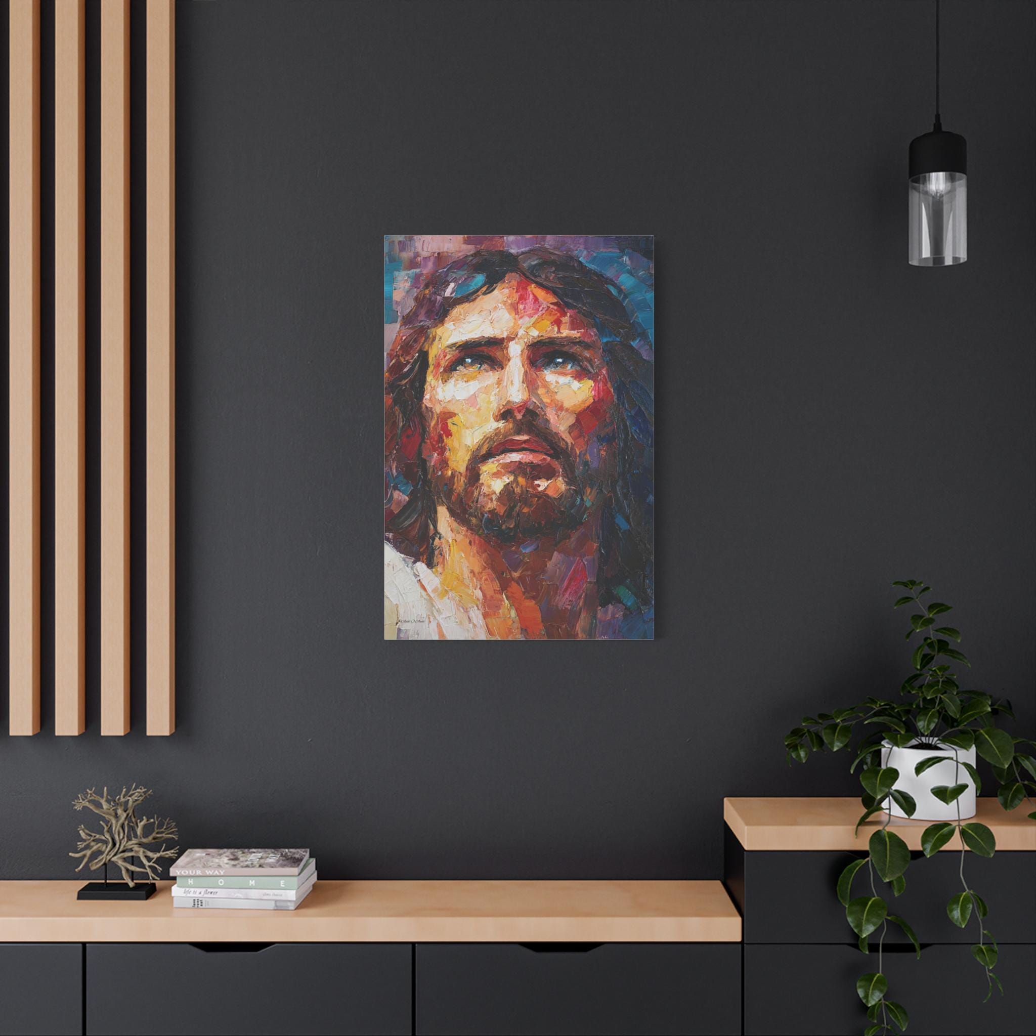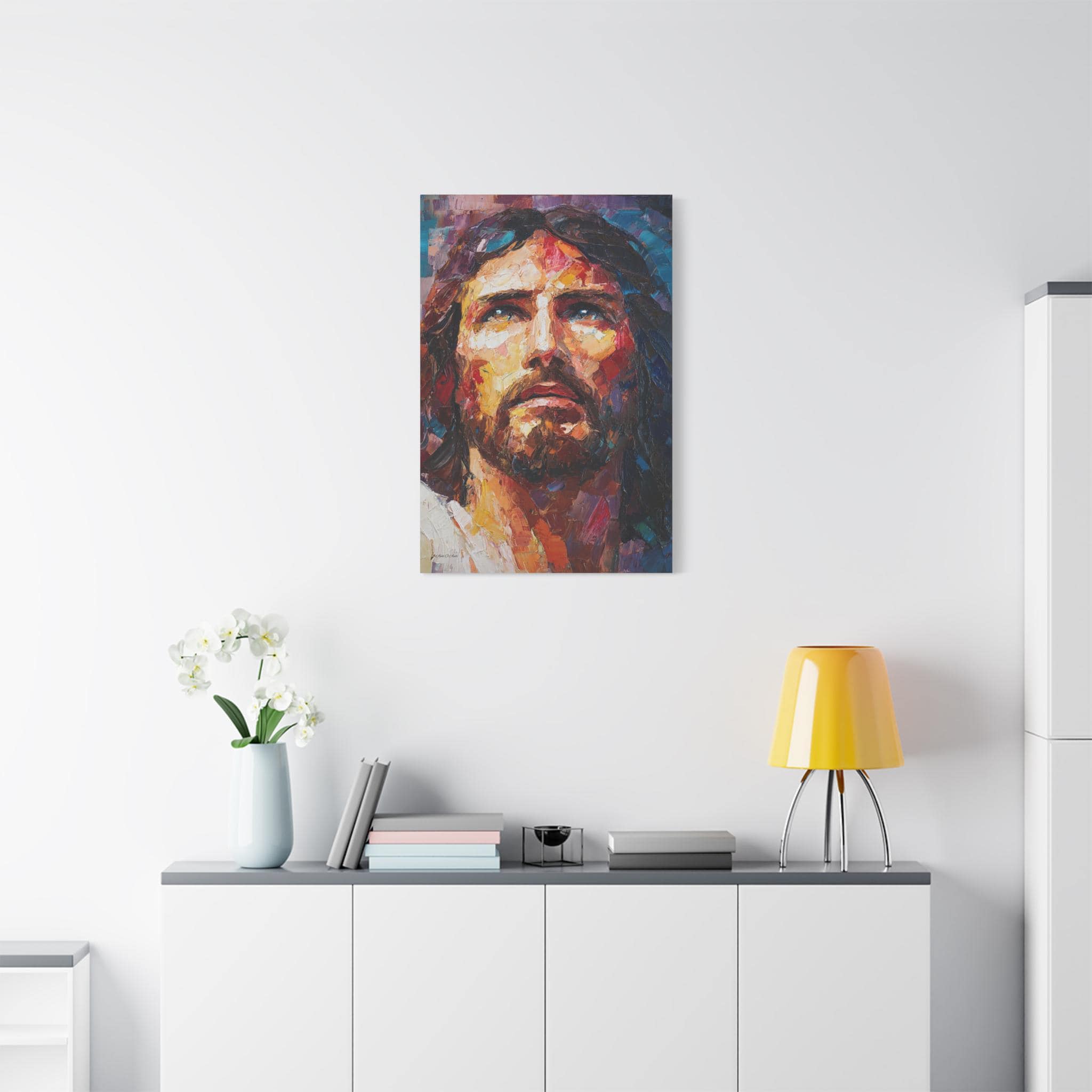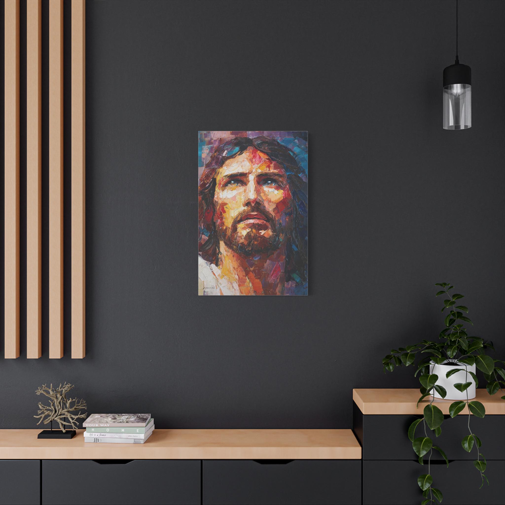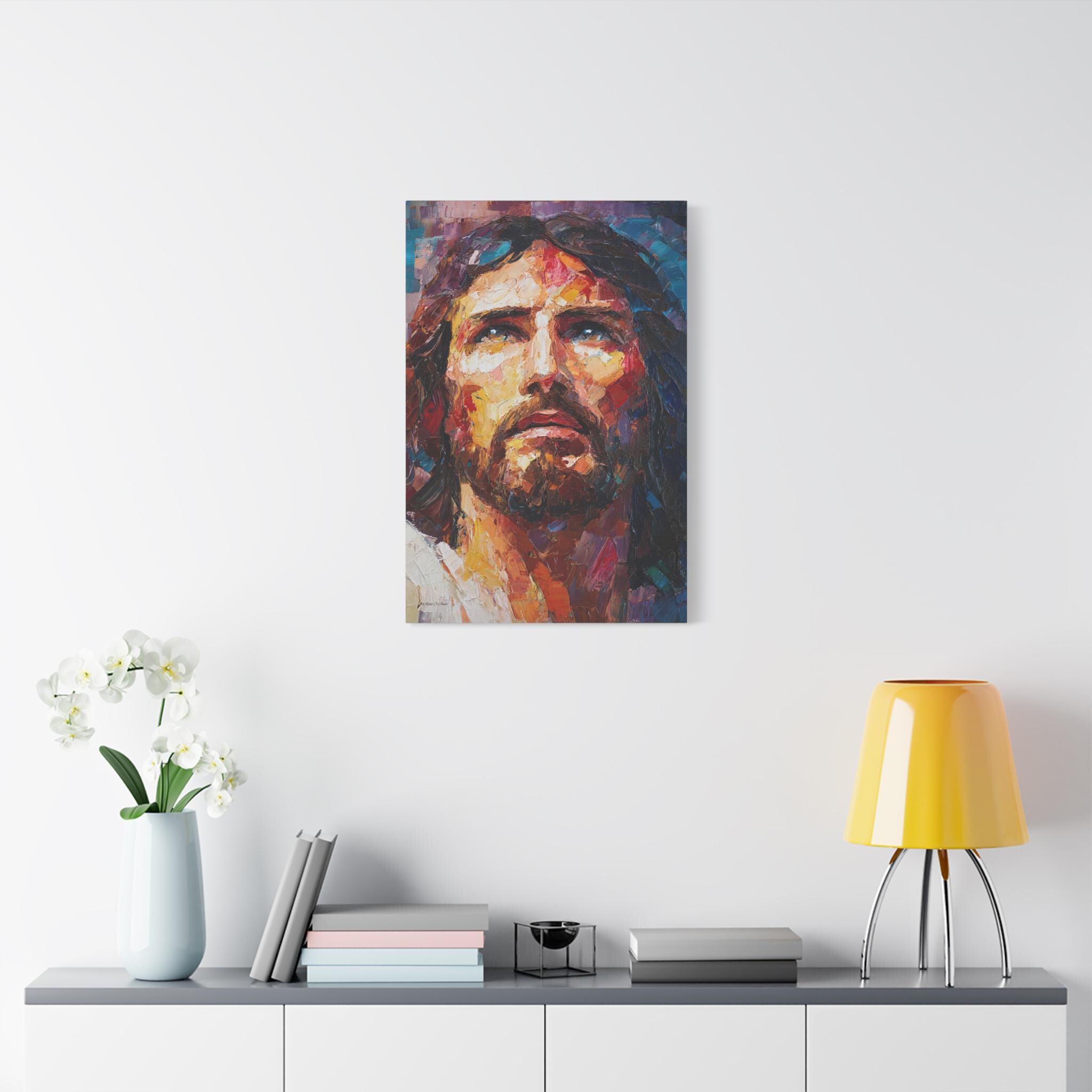 Bring profound peace, majestic grace, and vibrant modern artistry into your home with this stunning Jesus Christ canvas print. This captivating vertical portrait features a close-up, expressive depiction of Christ gazing upward. The artwork is alive with a breathtaking array of colors, from the warm, luminous golds and reds of the face to the deep, reverent blues and purples framing the portrait.