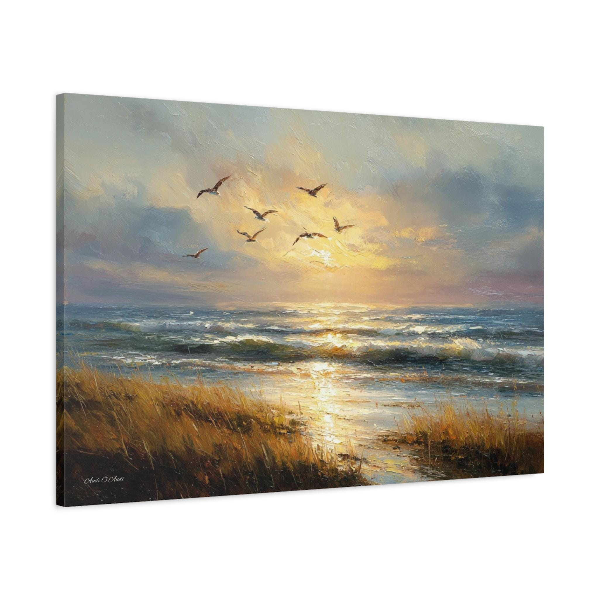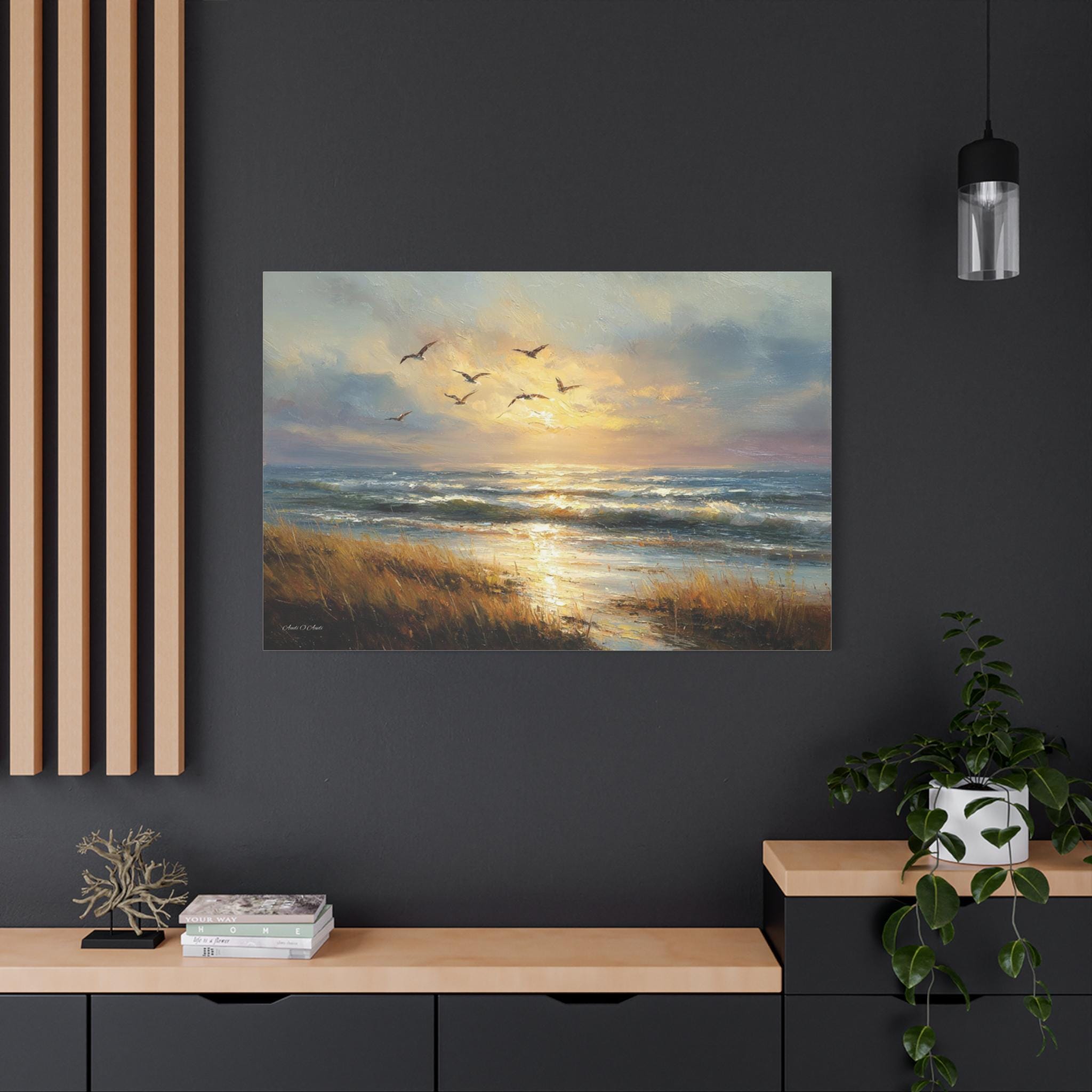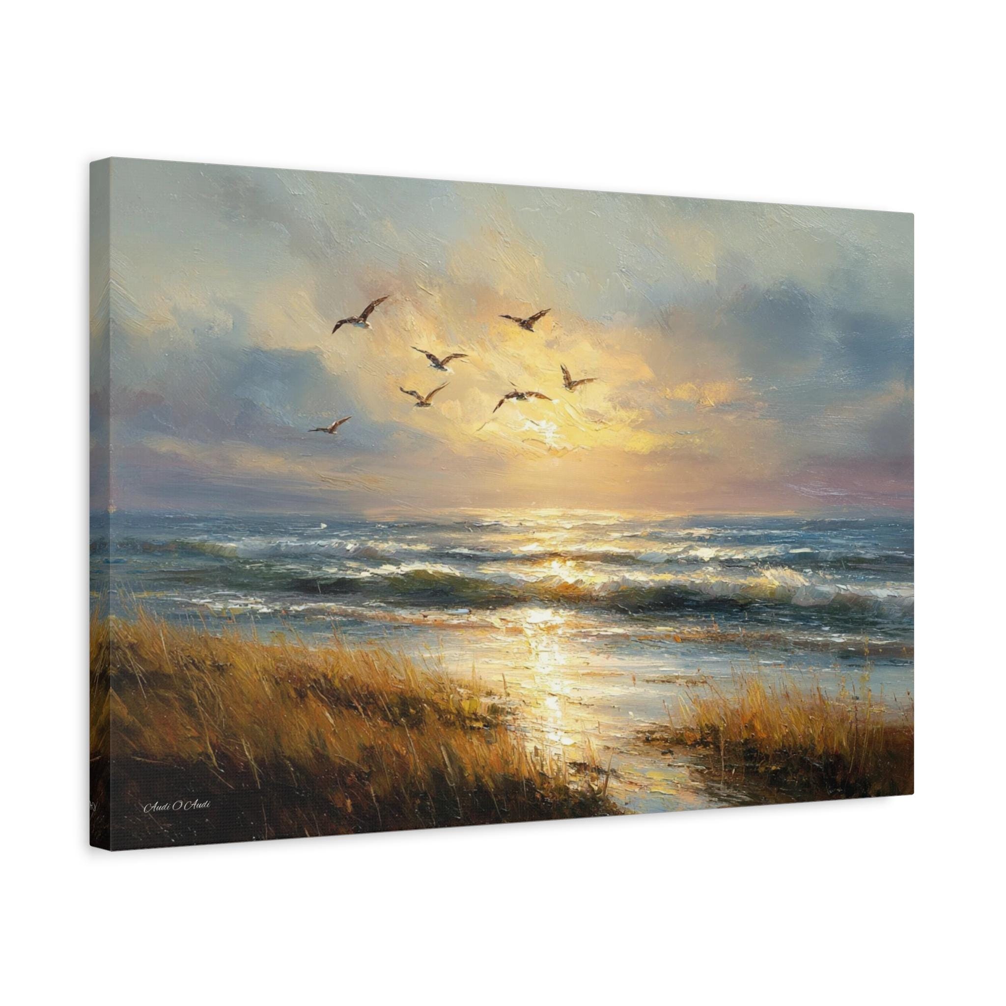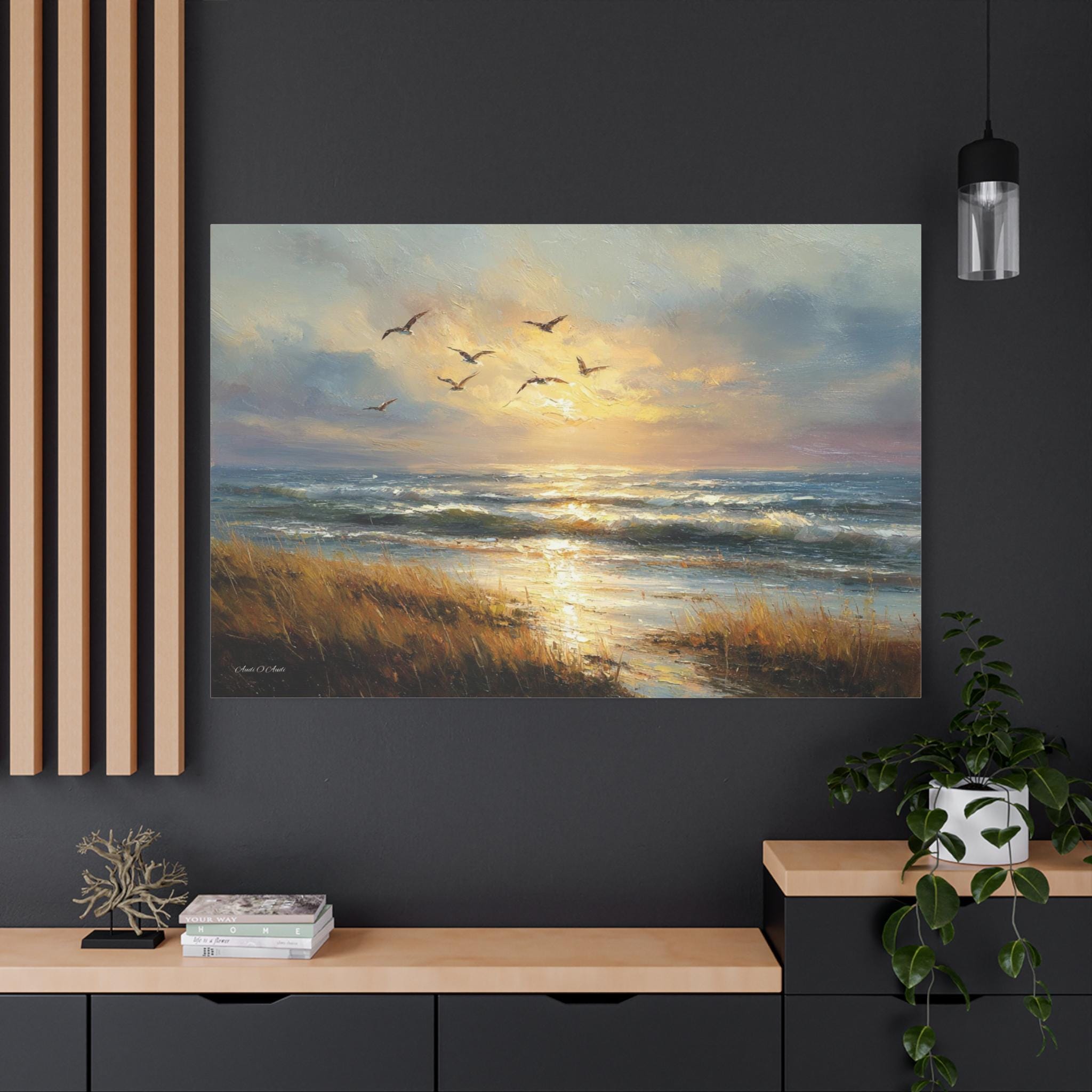 Bring the calming breeze, radiant warmth, and serene beauty of the golden hour into your home with this stunning seascape canvas print. This captivating horizontal artwork features a peaceful beach scene with a flock of birds soaring toward a brilliant, glowing sun. The sky is a breathtaking blend of soft clouds and golden light that reflects beautifully across the textured, crashing ocean waves and the sea grass-lined dunes in the foreground.