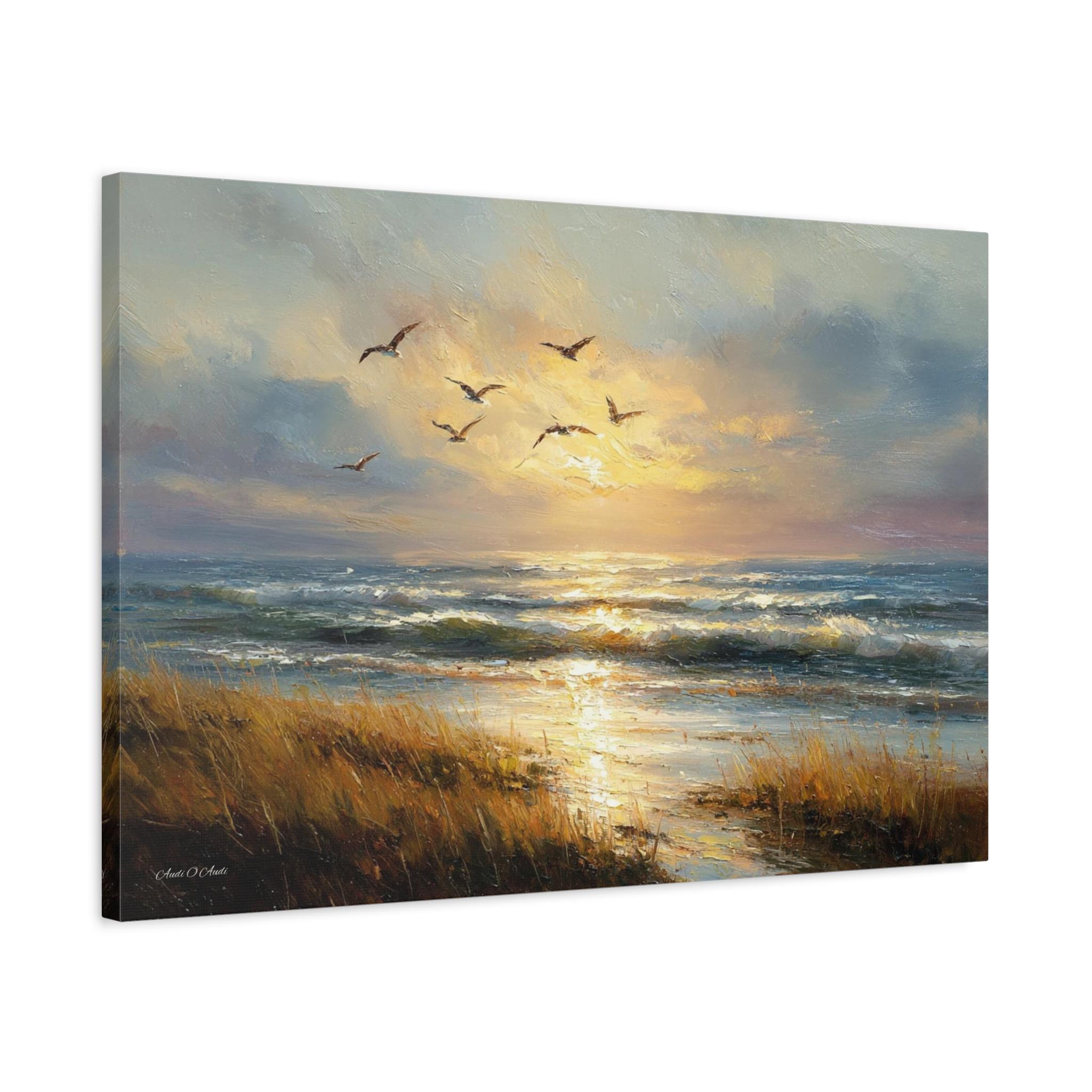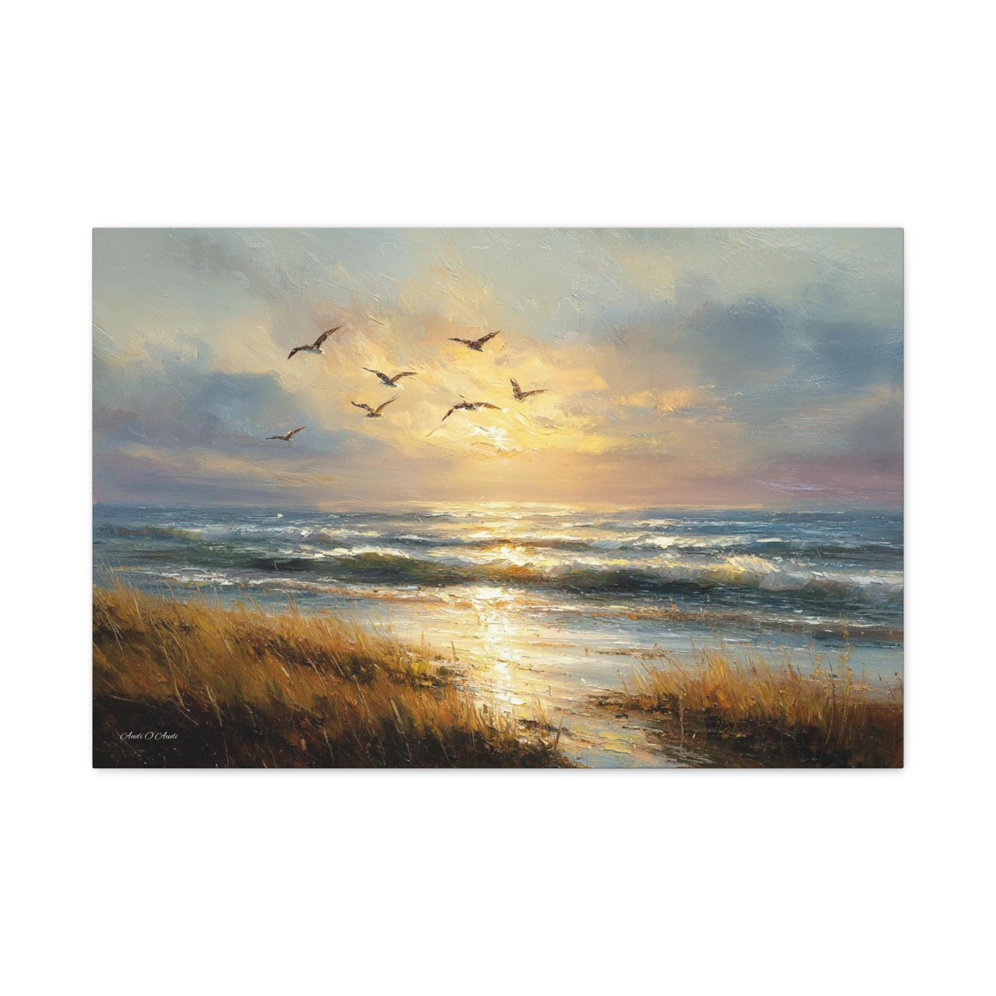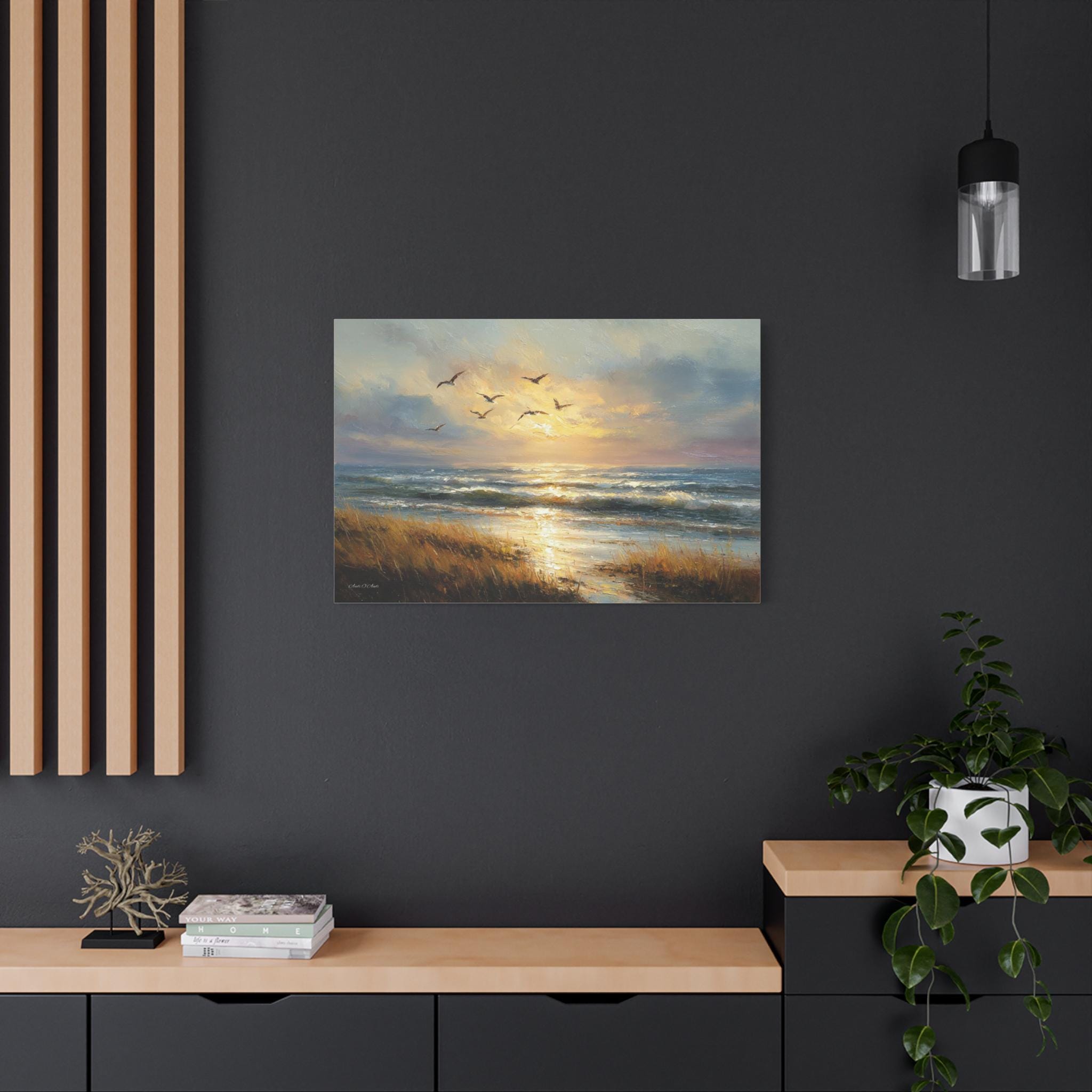 Bring the calming breeze, radiant warmth, and serene beauty of the golden hour into your home with this stunning seascape canvas print. This captivating horizontal artwork features a peaceful beach scene with a flock of birds soaring toward a brilliant, glowing sun. The sky is a breathtaking blend of soft clouds and golden light that reflects beautifully across the textured, crashing ocean waves and the sea grass-lined dunes in the foreground.