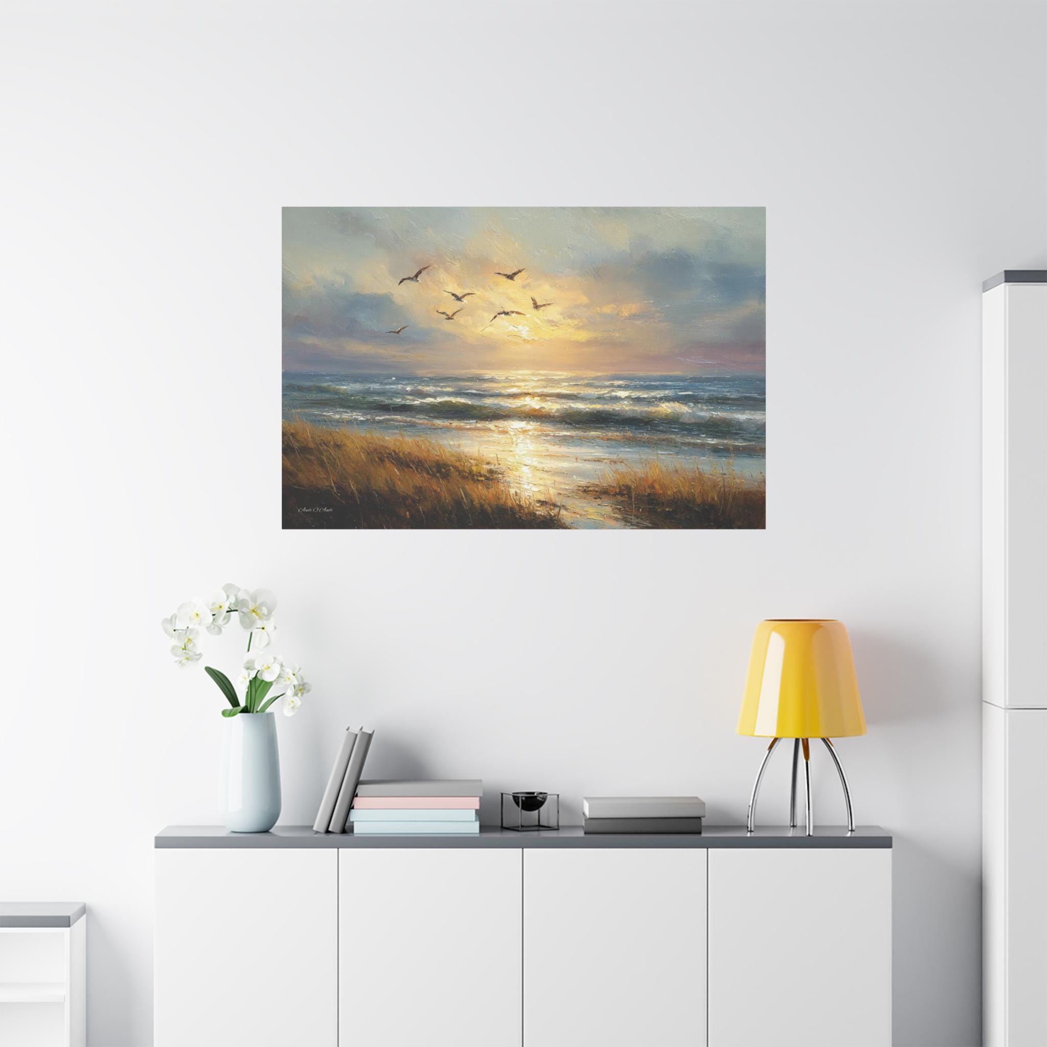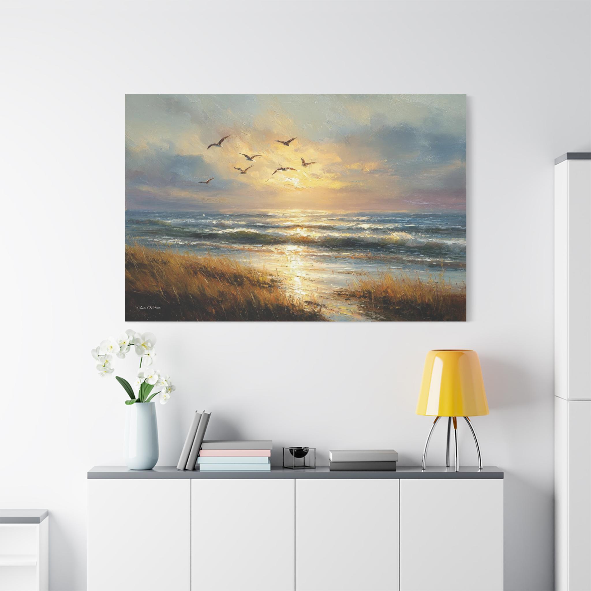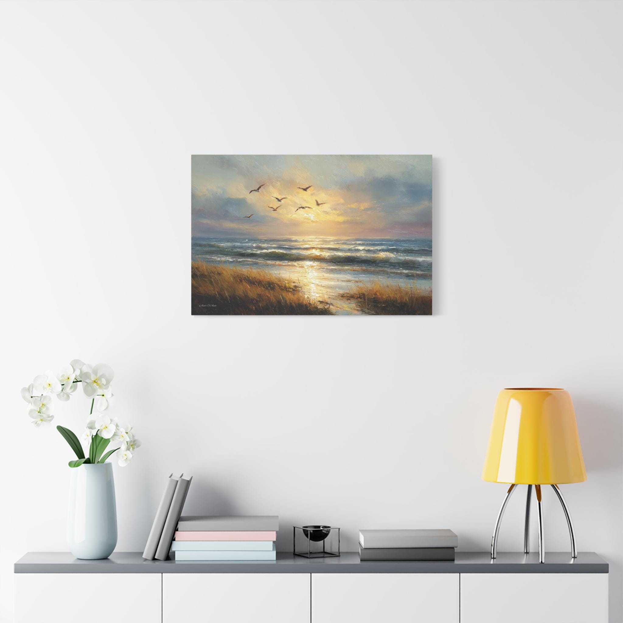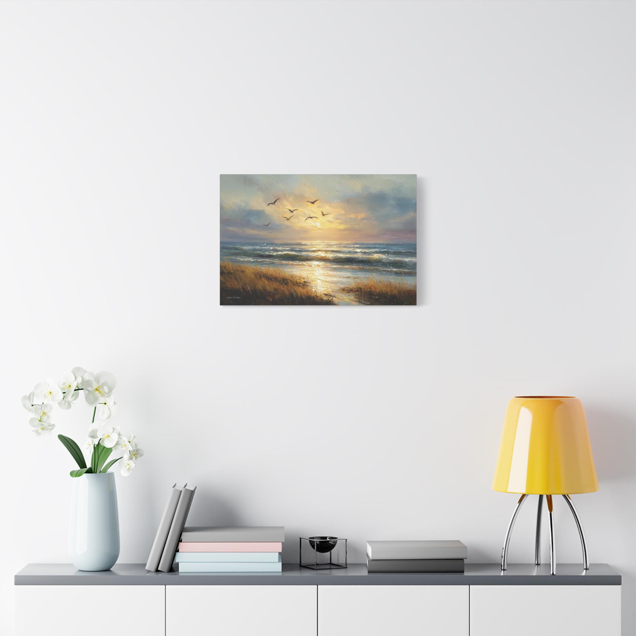 Bring the calming breeze, radiant warmth, and serene beauty of the golden hour into your home with this stunning seascape canvas print. This captivating horizontal artwork features a peaceful beach scene with a flock of birds soaring toward a brilliant, glowing sun. The sky is a breathtaking blend of soft clouds and golden light that reflects beautifully across the textured, crashing ocean waves and the sea grass-lined dunes in the foreground.