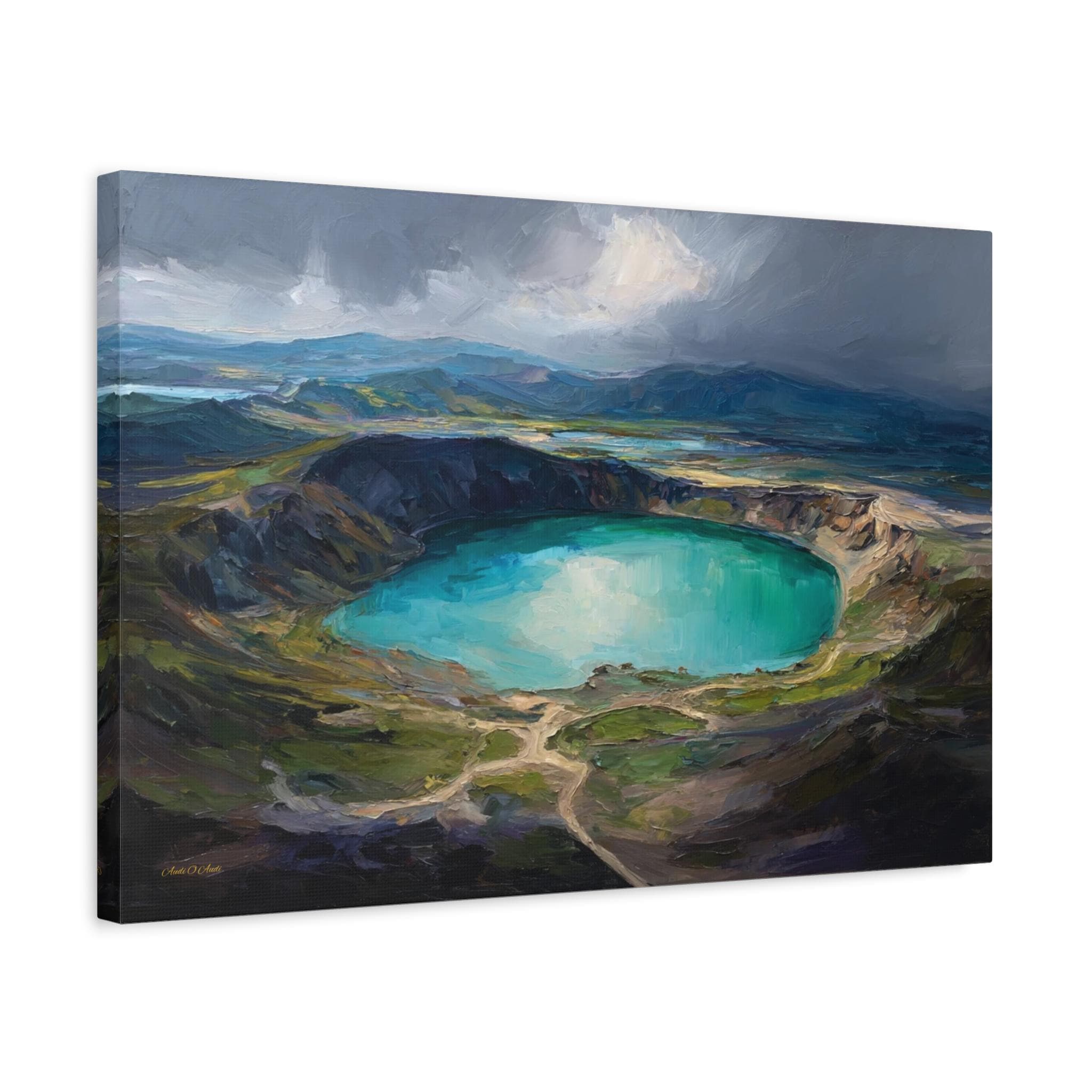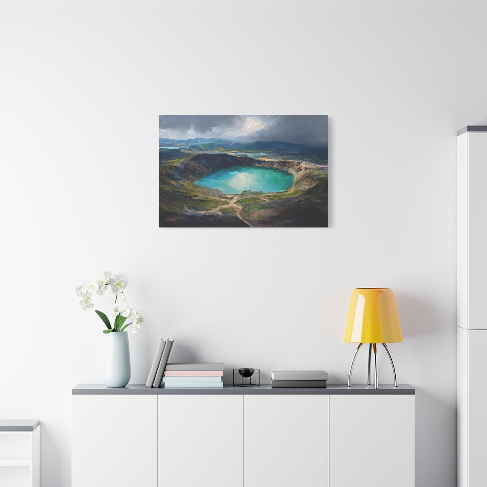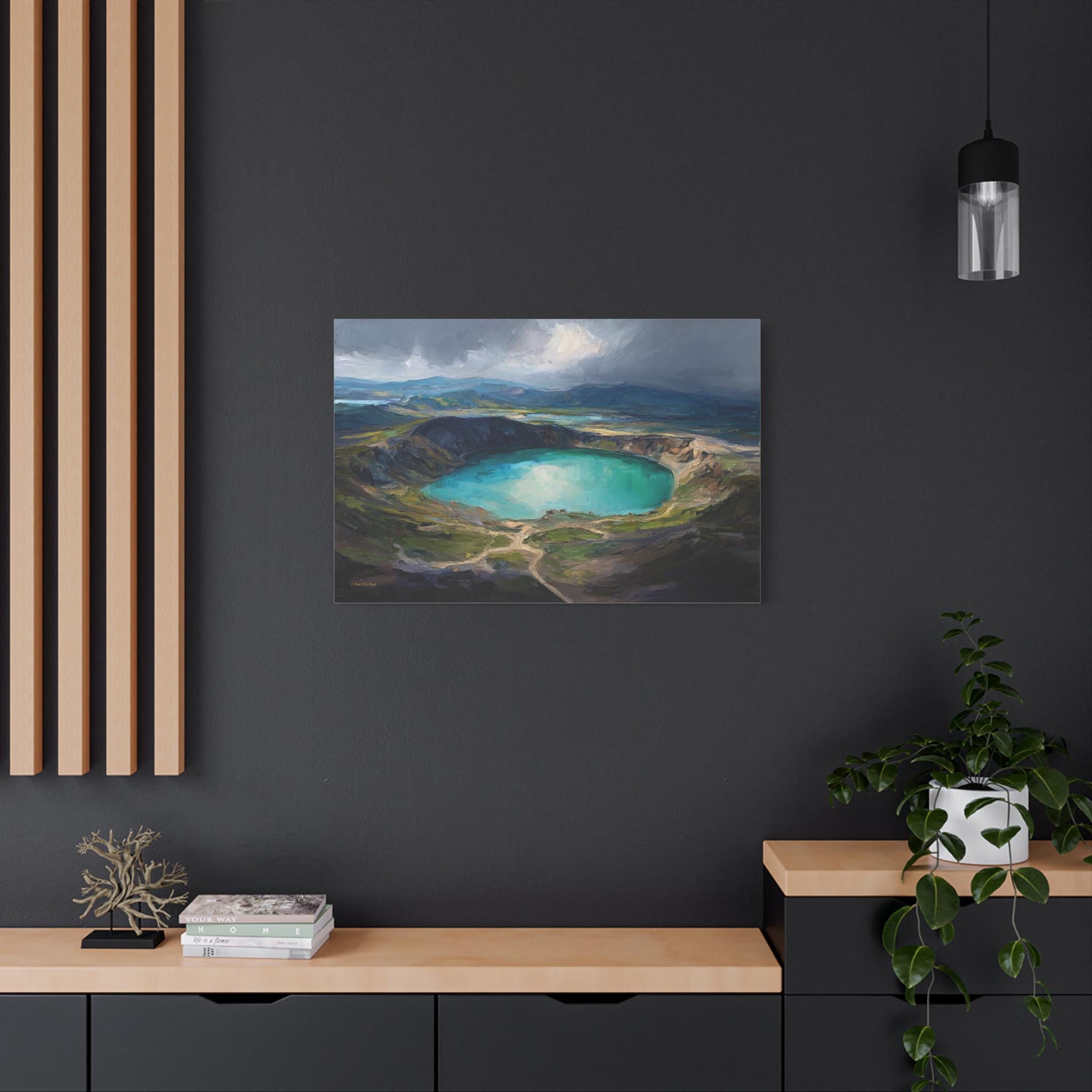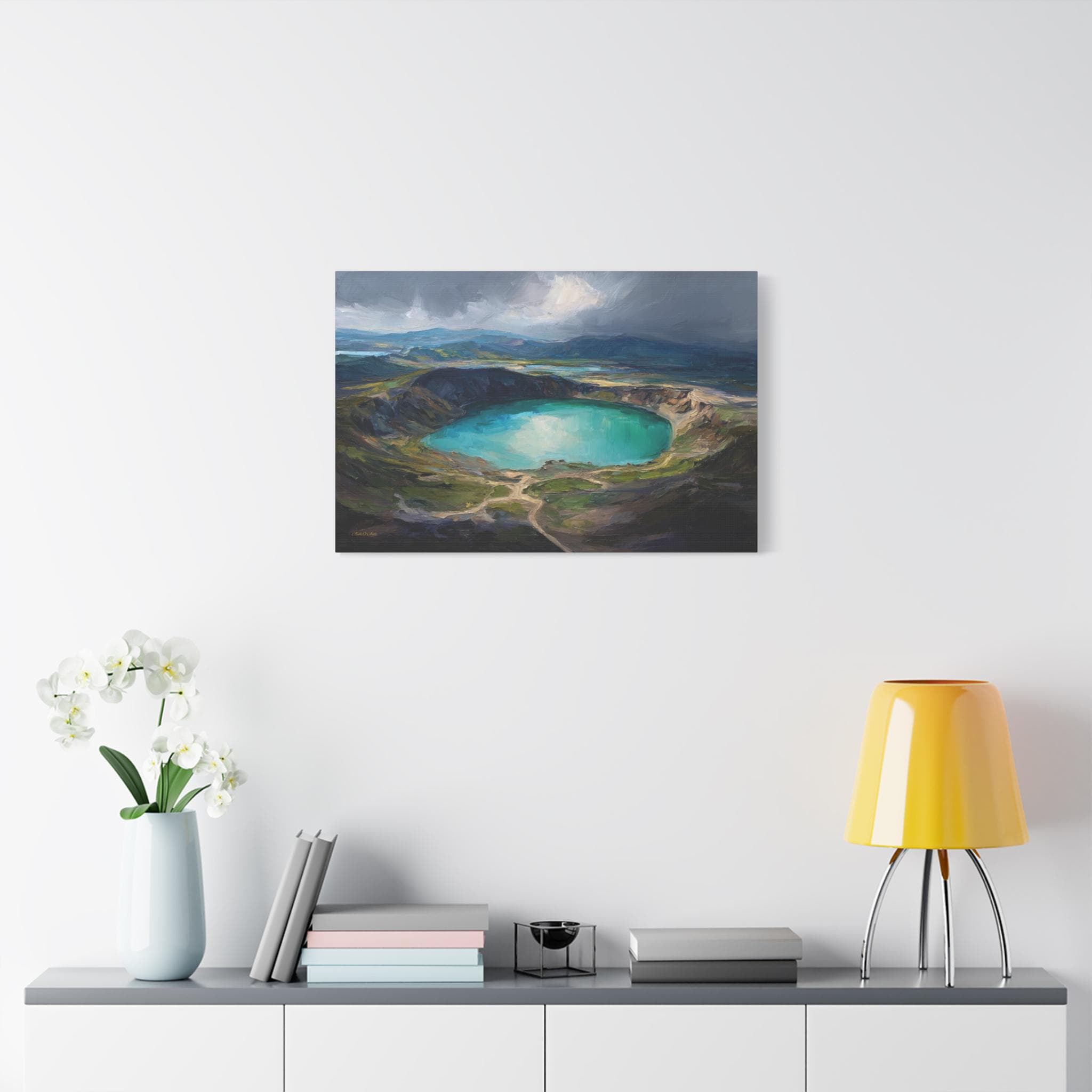 Bring the awe-inspiring scale, dramatic lighting, and rugged beauty of nature's hidden wonders into your home with this stunning moody crater lake canvas print. This captivating horizontal artwork features a sweeping, elevated view of a magnificent volcanic crater filled with brilliant, luminous turquoise water. The scene is incredibly atmospheric, with a break in the dark, stormy clouds casting a spotlight of divine sunlight directly onto the lake, beautifully contrasting with the deep, textured shadows of the surrounding earthy green and brown mountains.