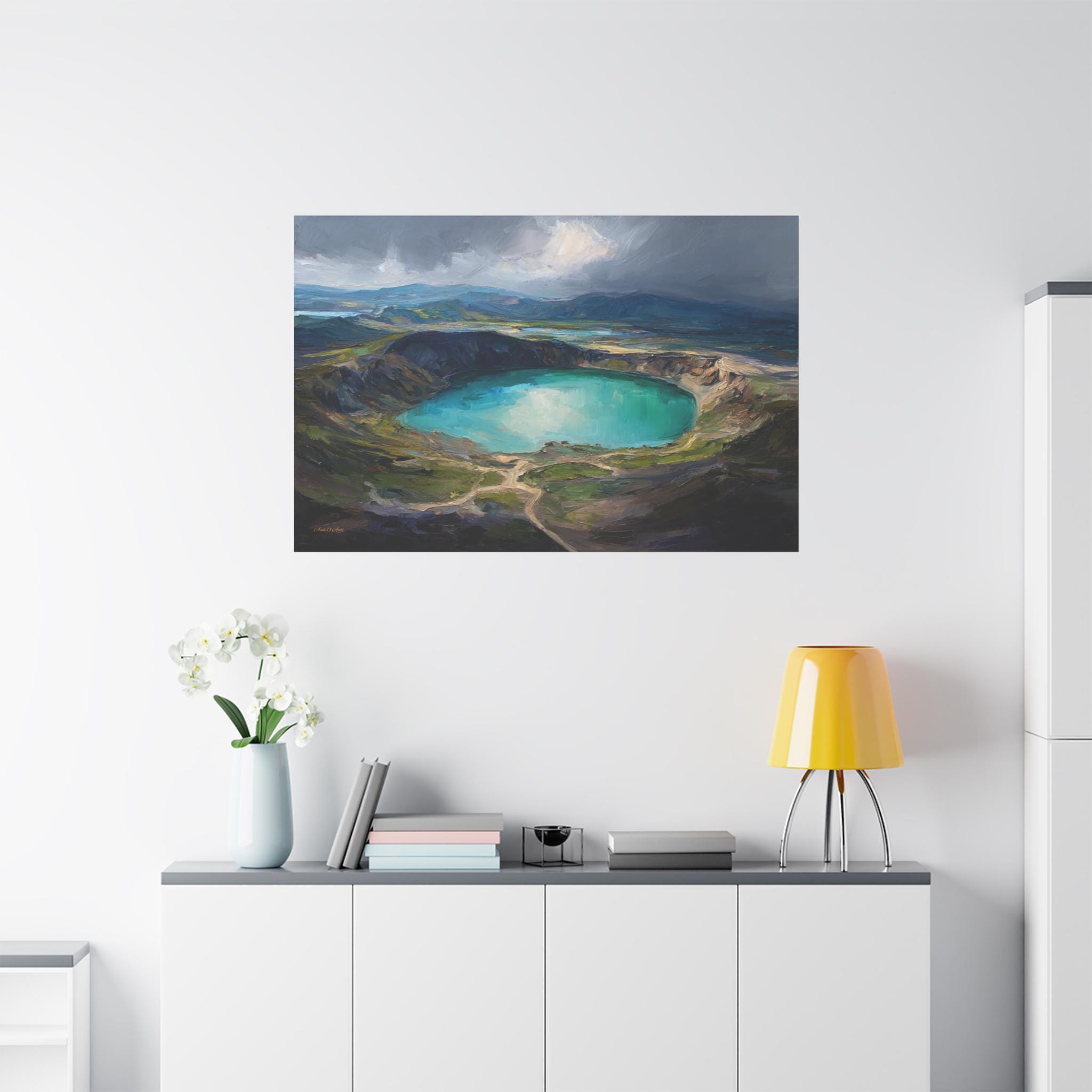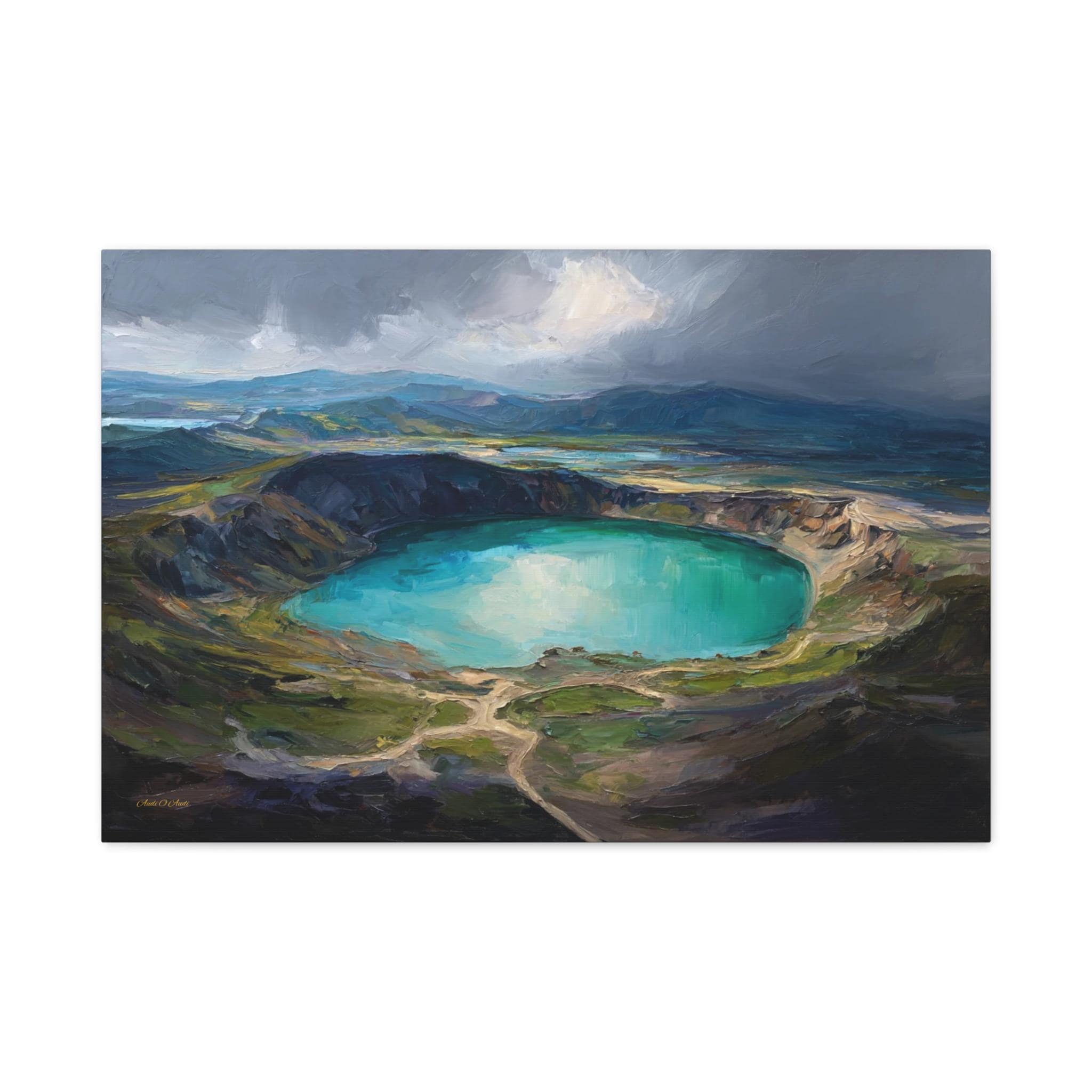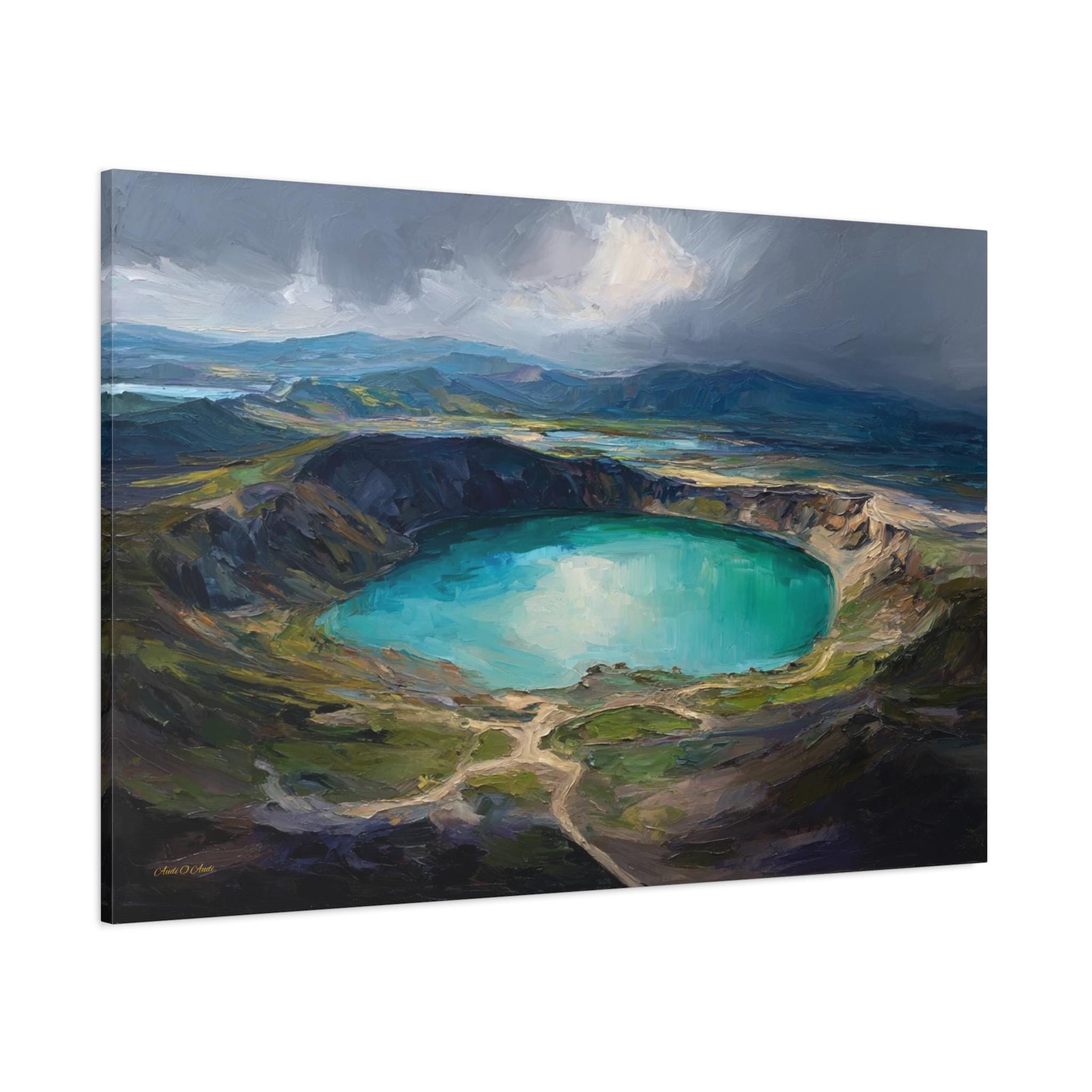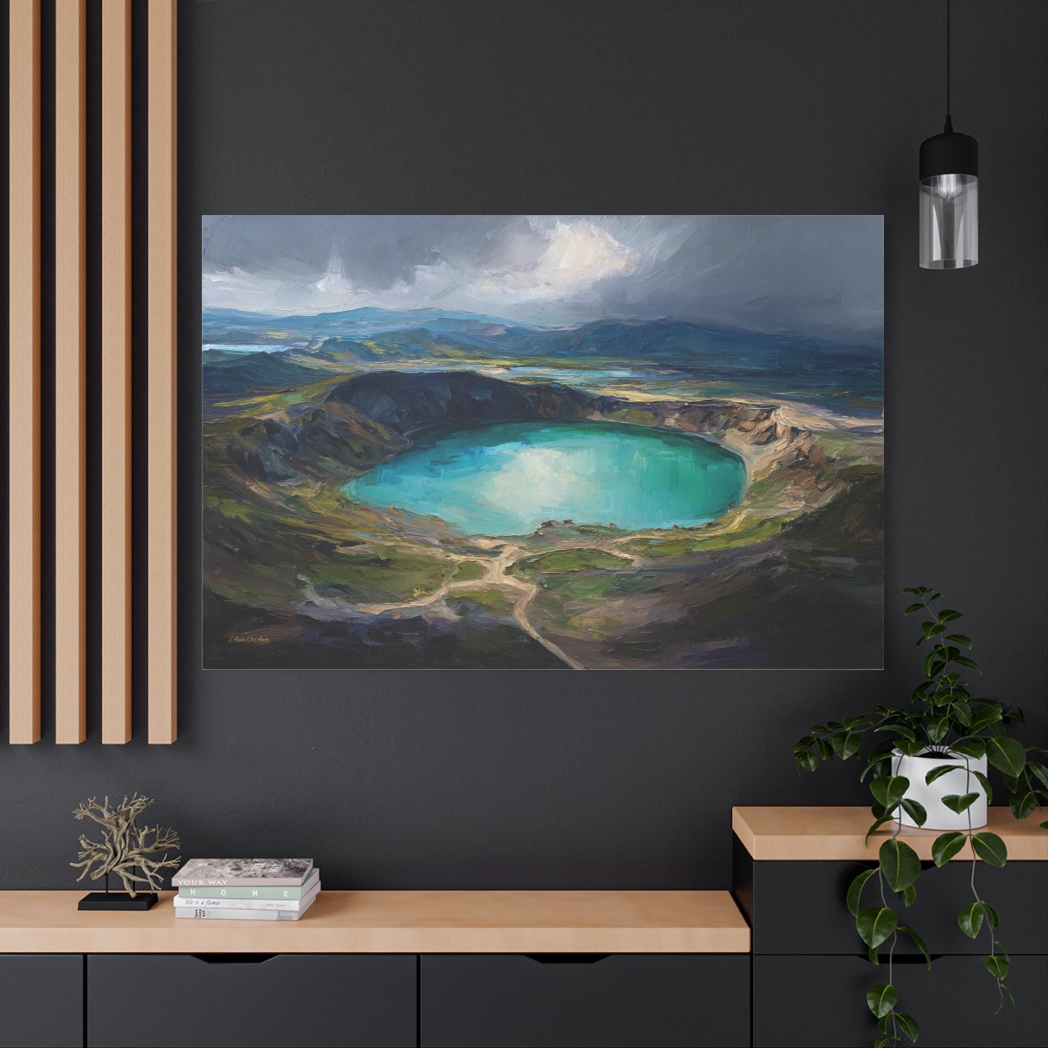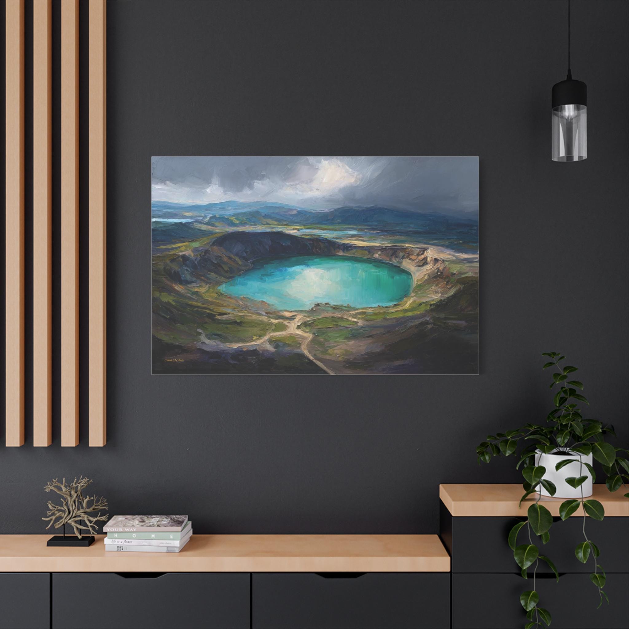 Bring the awe-inspiring scale, dramatic lighting, and rugged beauty of nature's hidden wonders into your home with this stunning moody crater lake canvas print. This captivating horizontal artwork features a sweeping, elevated view of a magnificent volcanic crater filled with brilliant, luminous turquoise water. The scene is incredibly atmospheric, with a break in the dark, stormy clouds casting a spotlight of divine sunlight directly onto the lake, beautifully contrasting with the deep, textured shadows of the surrounding earthy green and brown mountains.