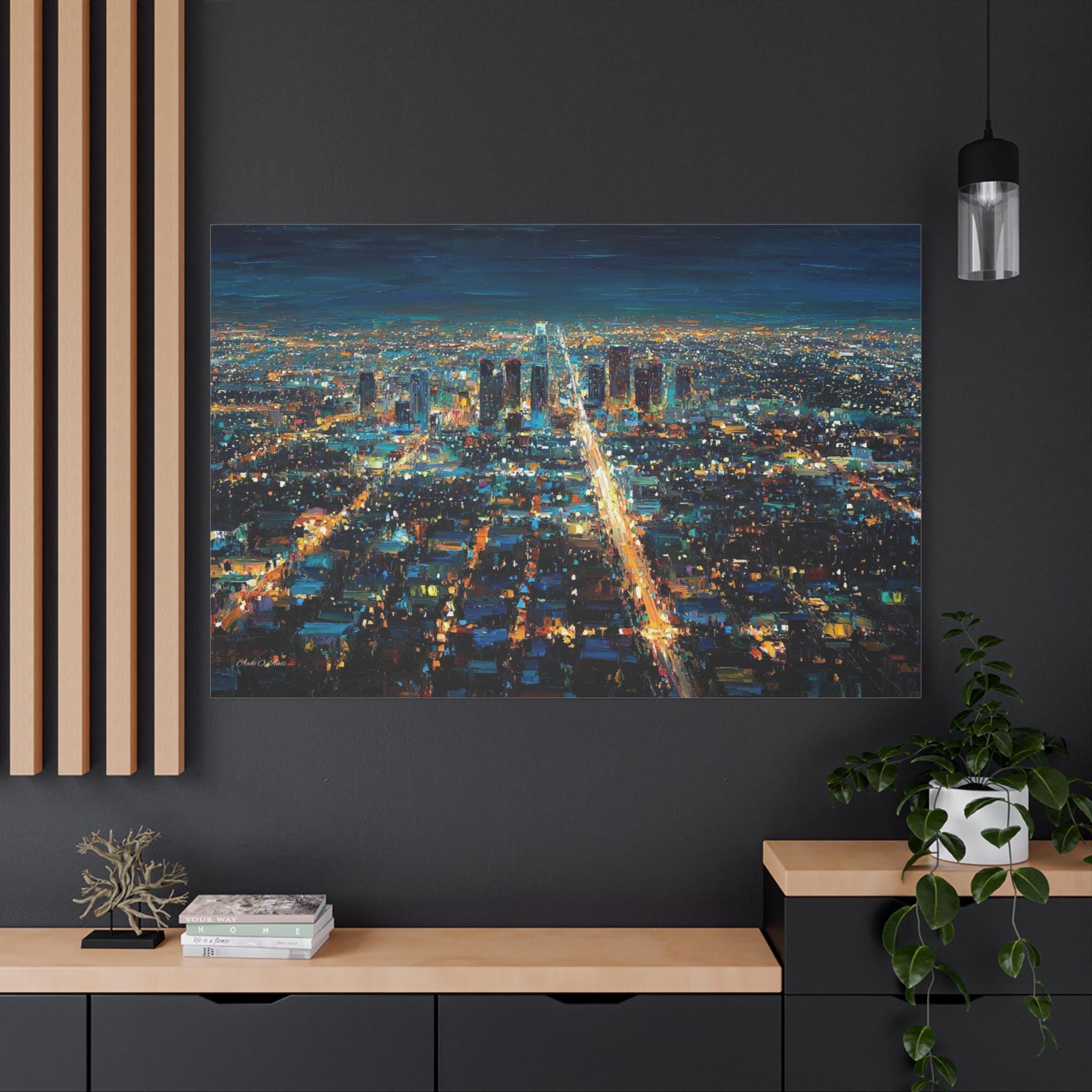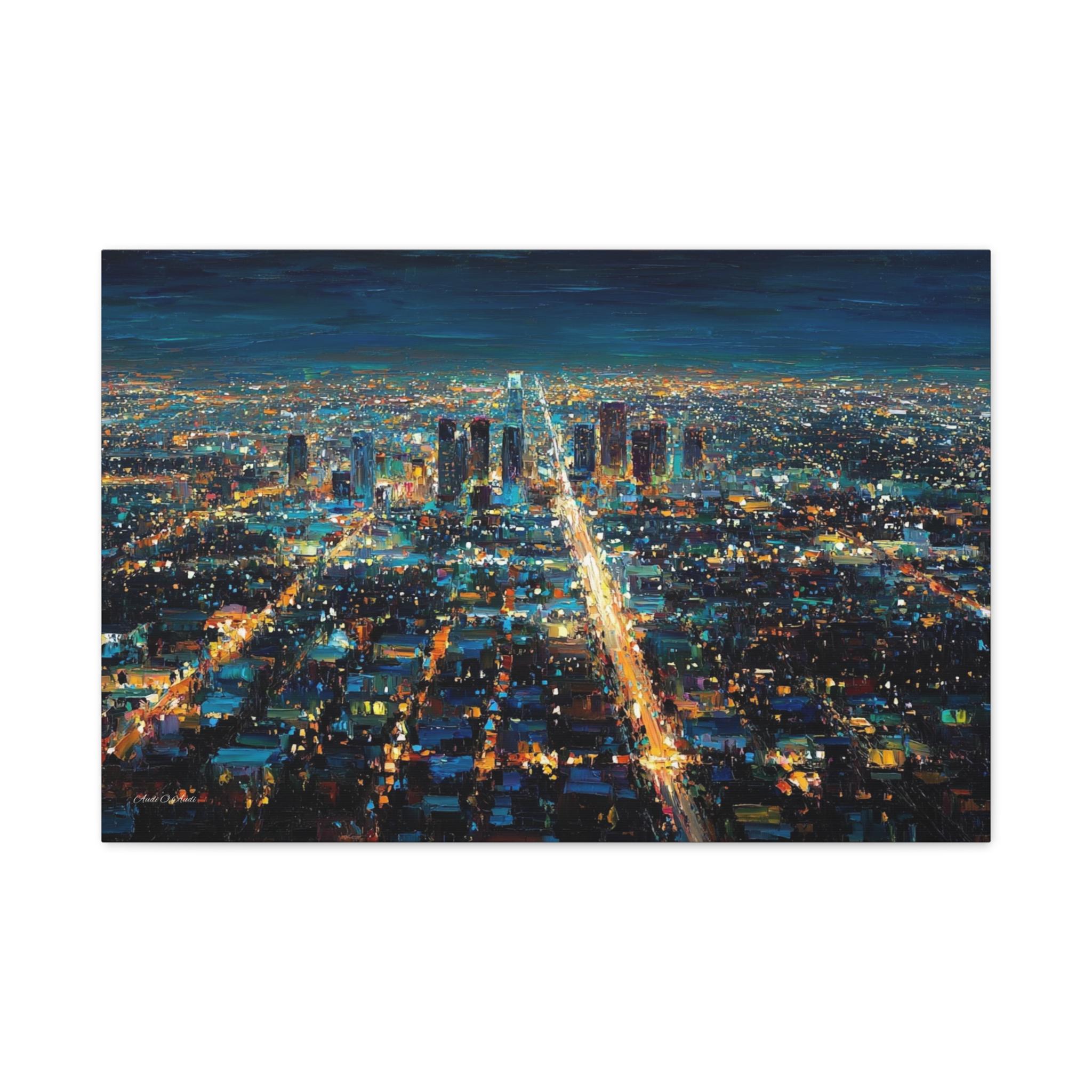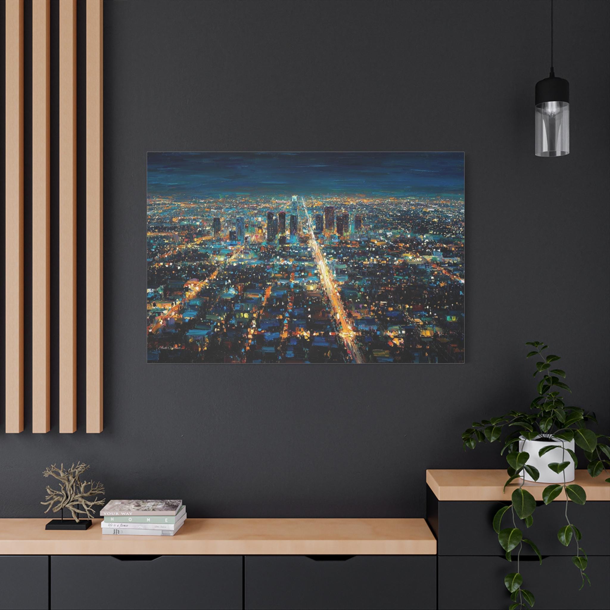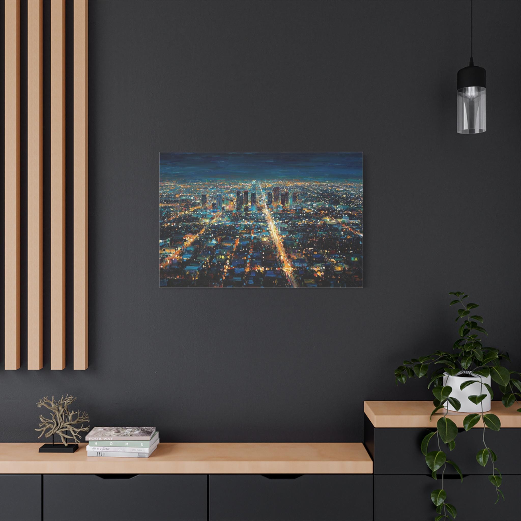 Bring the electric, vibrant energy and breathtaking scale of the city at night into your space with this stunning aerial cityscape canvas print. This captivating horizontal artwork features a sprawling metropolis illuminated by a glowing, golden grid of streetlights and rushing traffic. The brilliantly textured skyscrapers of the downtown skyline rise majestically against the deep, moody indigos, teals, and purples of the night sky.