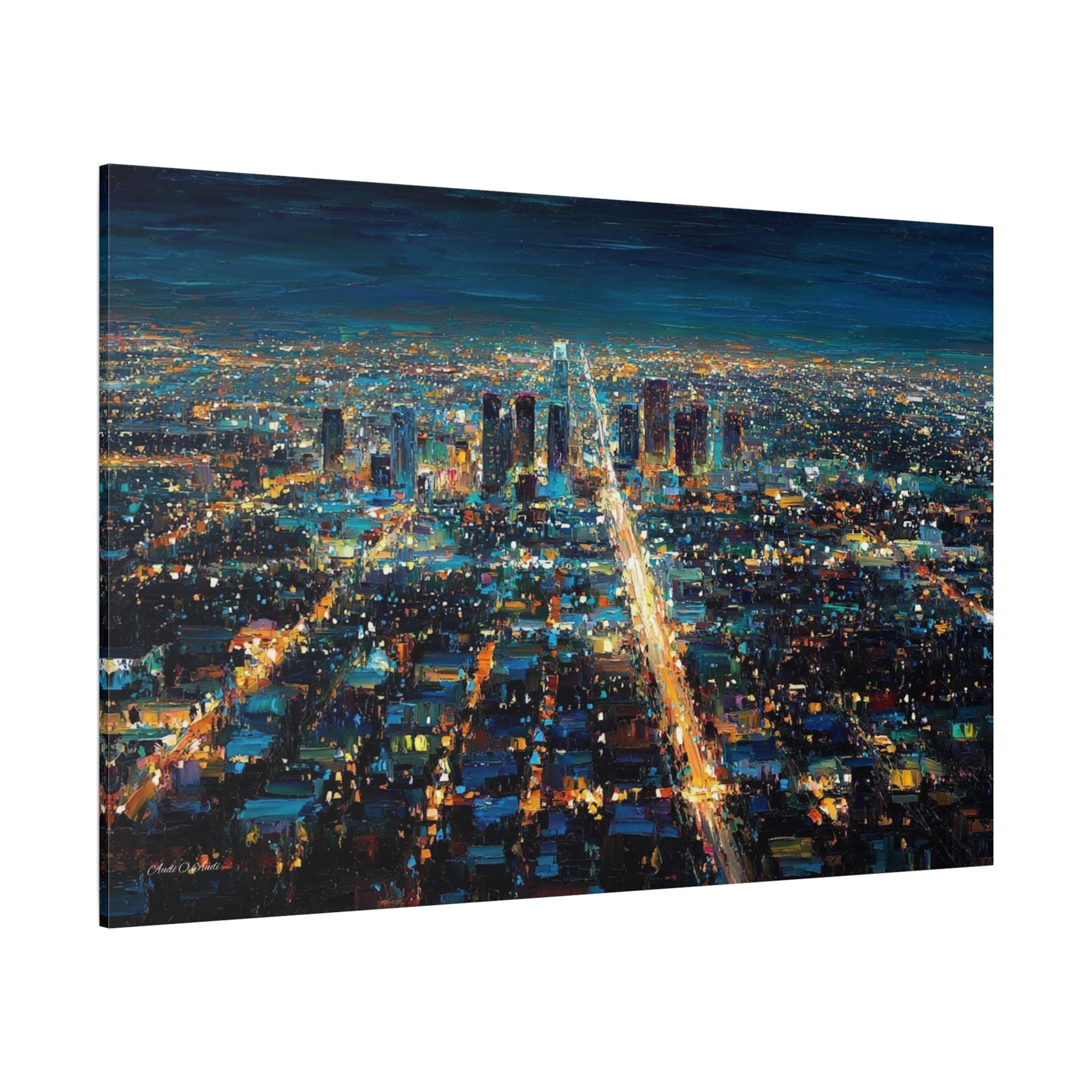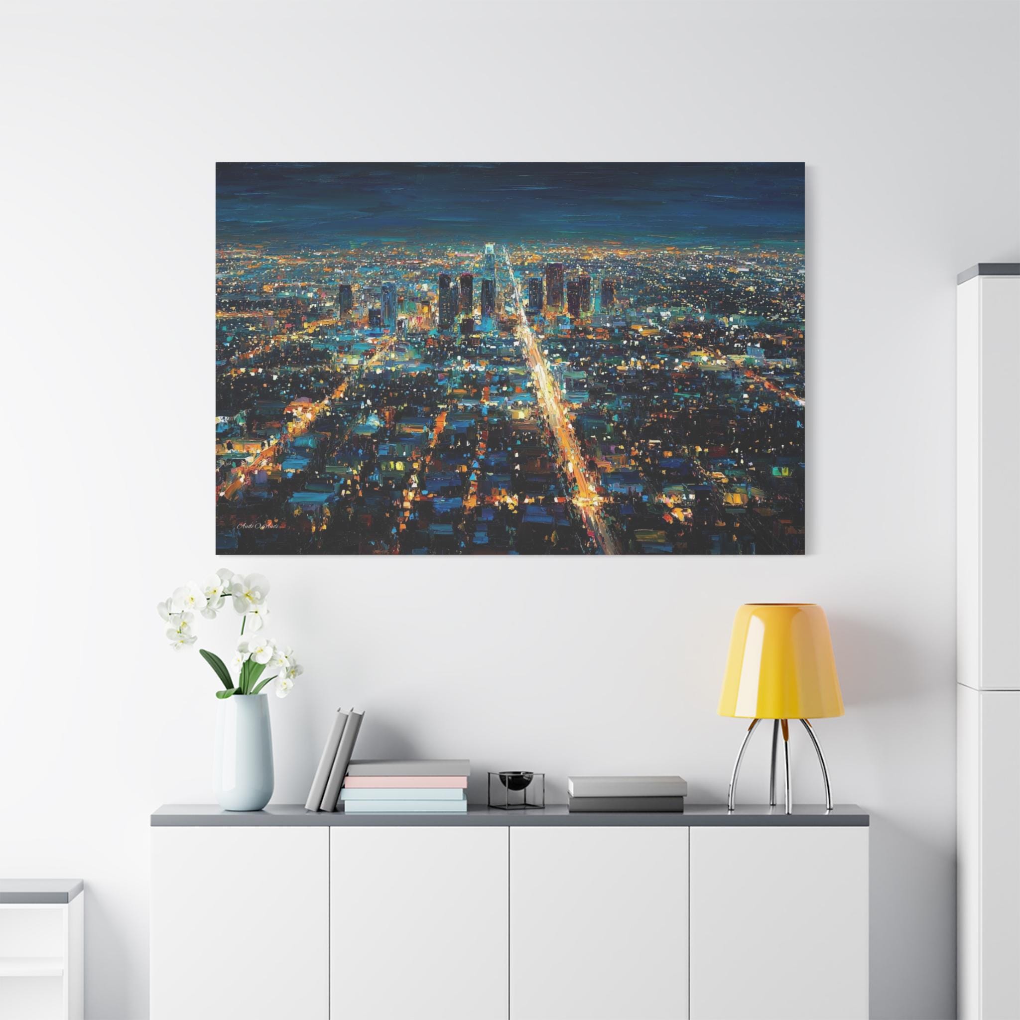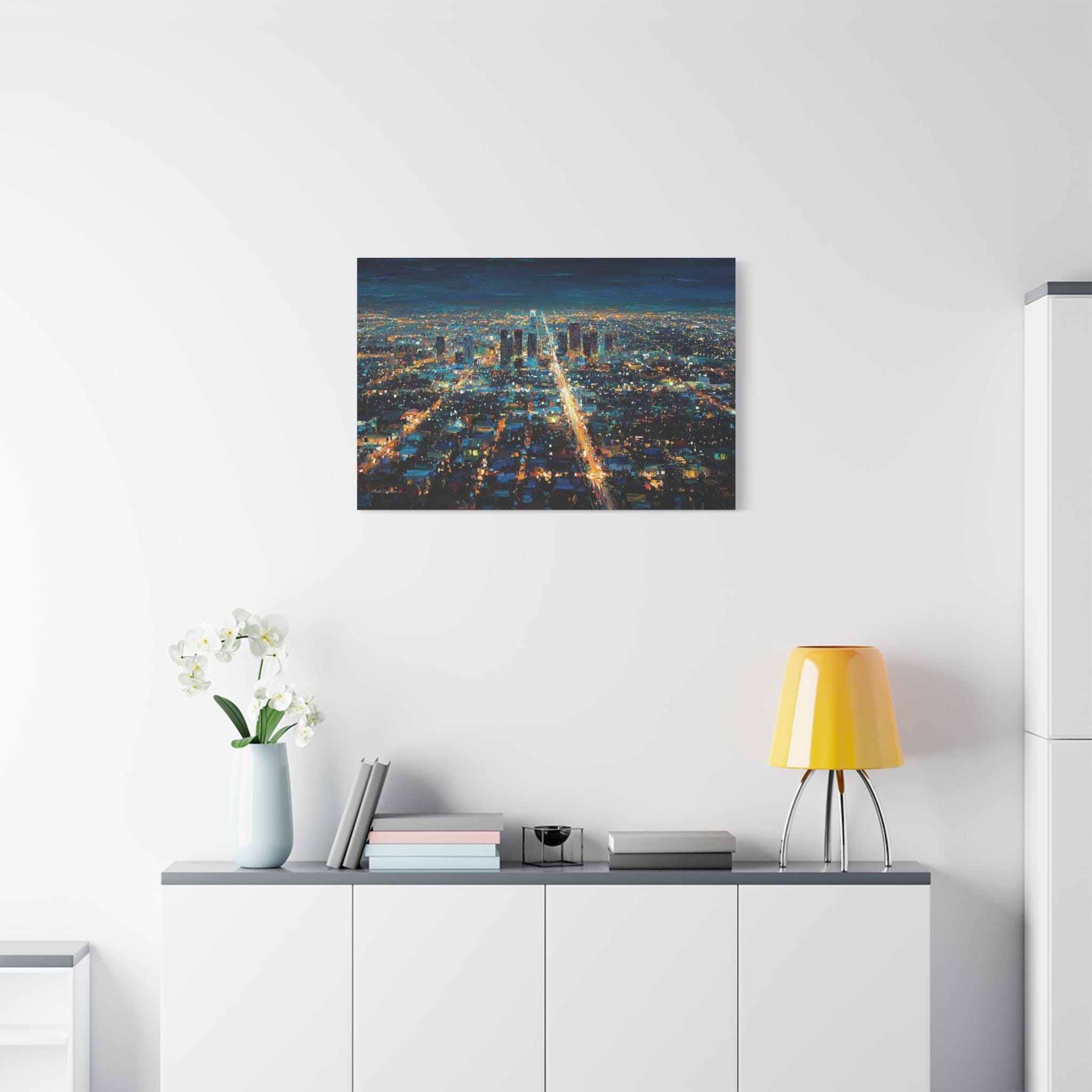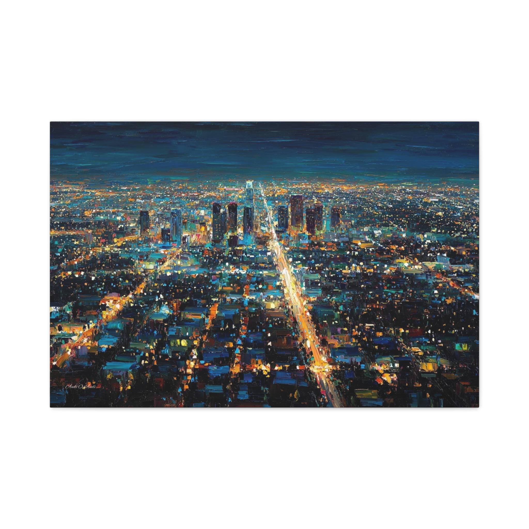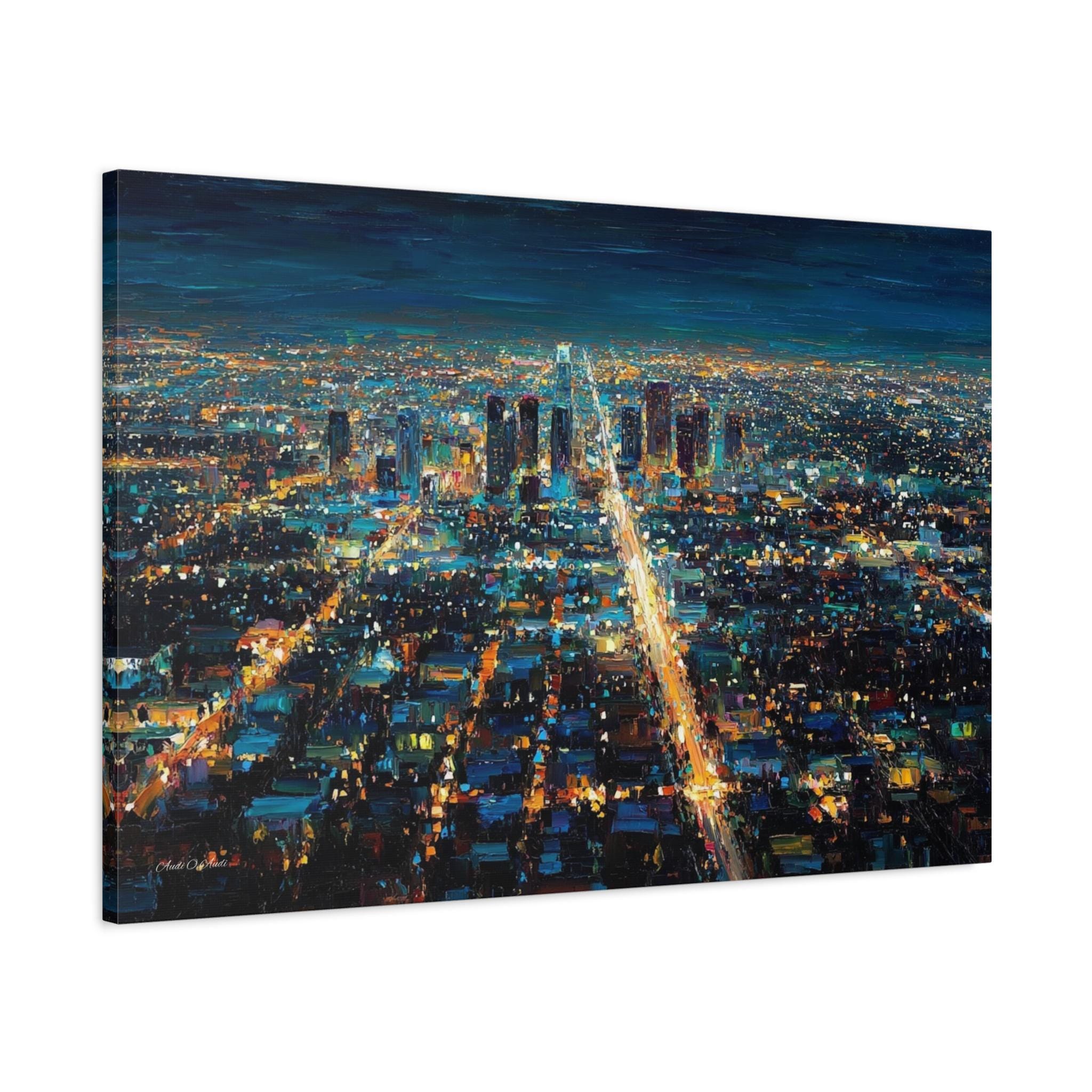 Bring the electric, vibrant energy and breathtaking scale of the city at night into your space with this stunning aerial cityscape canvas print. This captivating horizontal artwork features a sprawling metropolis illuminated by a glowing, golden grid of streetlights and rushing traffic. The brilliantly textured skyscrapers of the downtown skyline rise majestically against the deep, moody indigos, teals, and purples of the night sky.