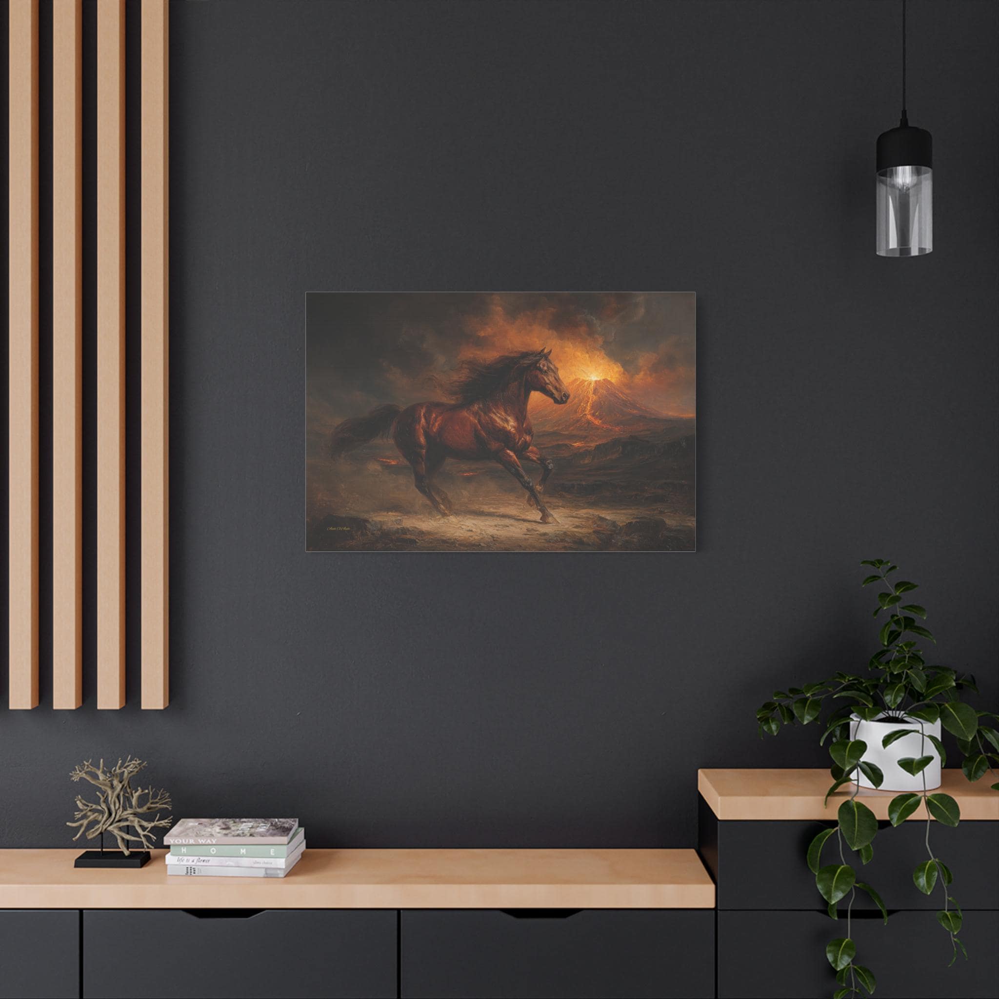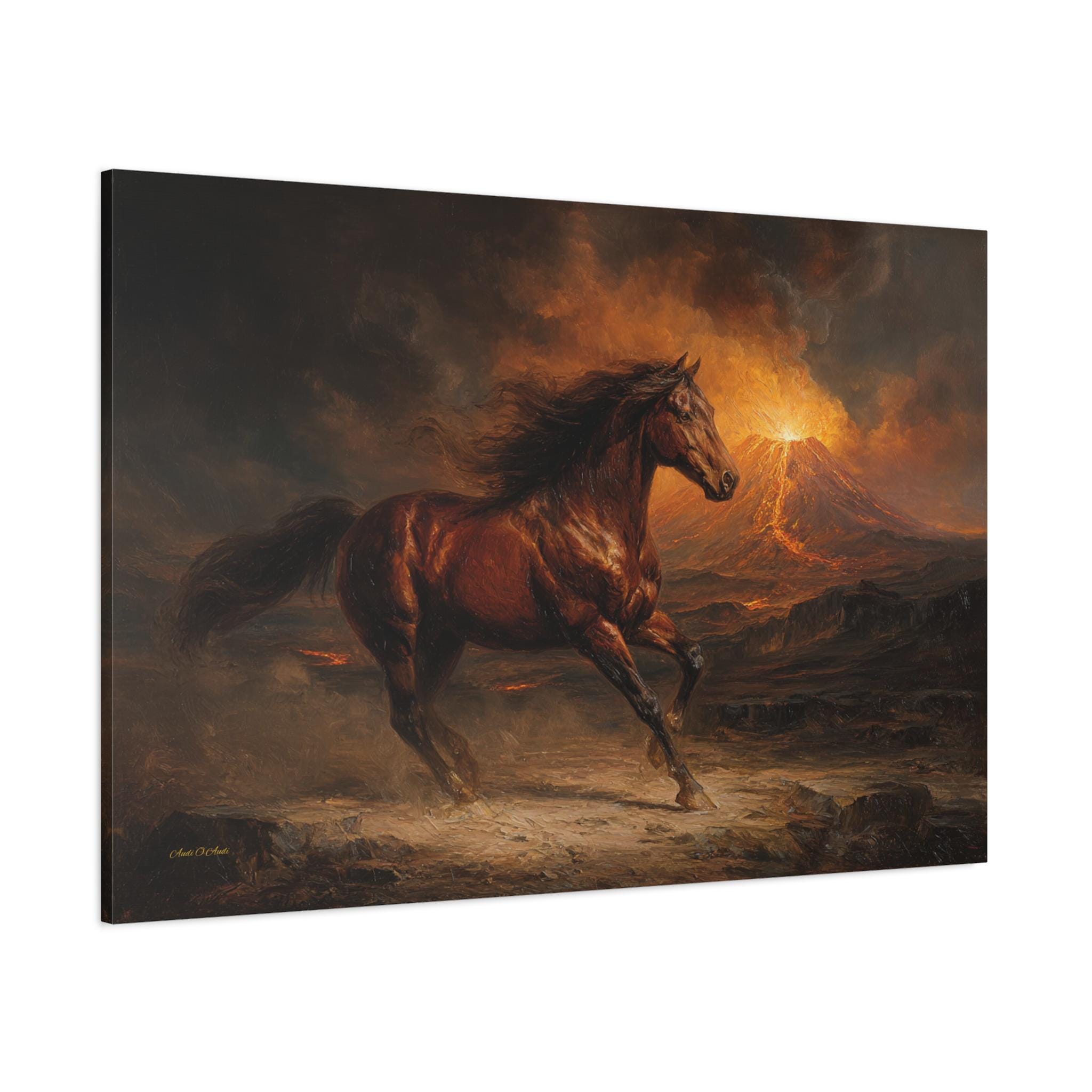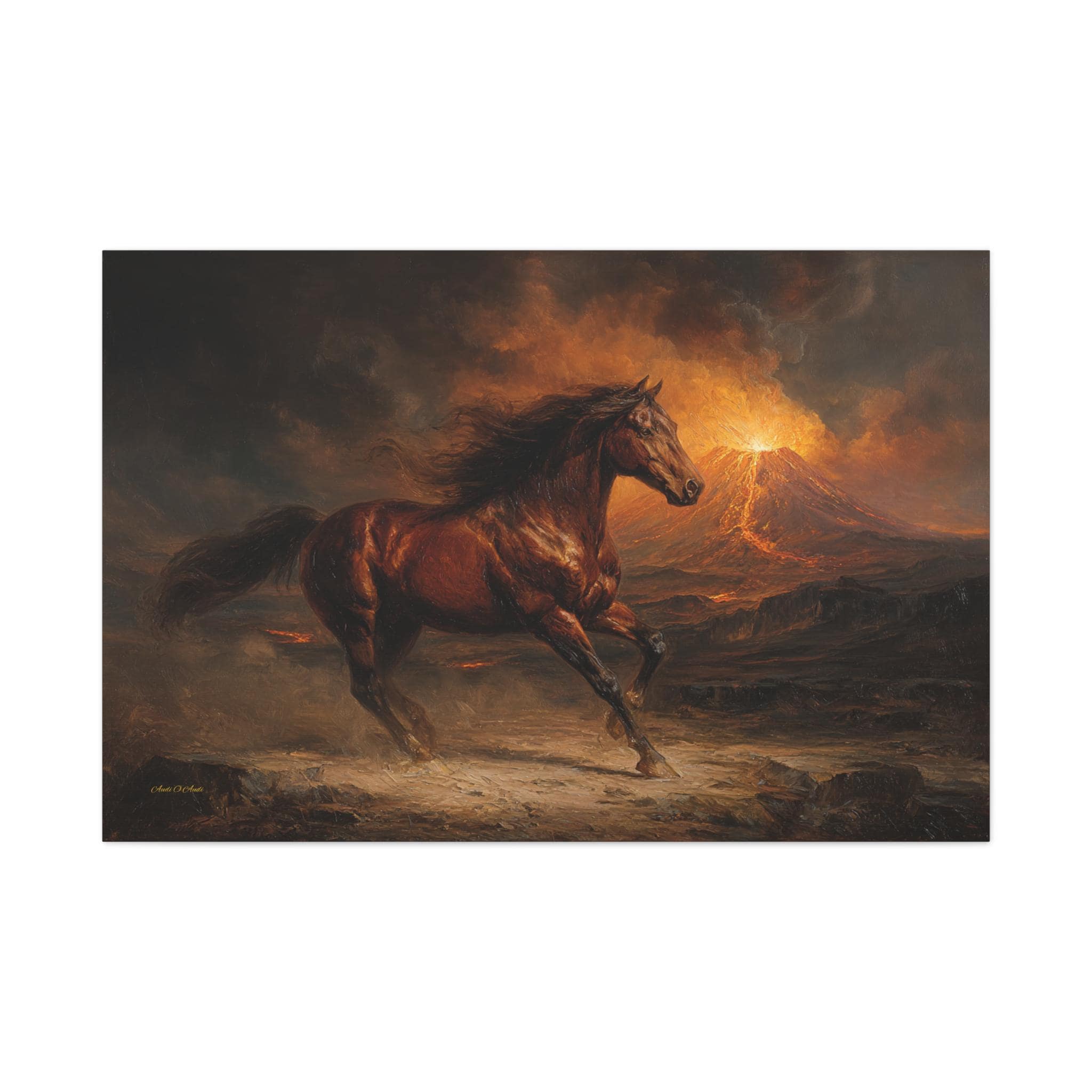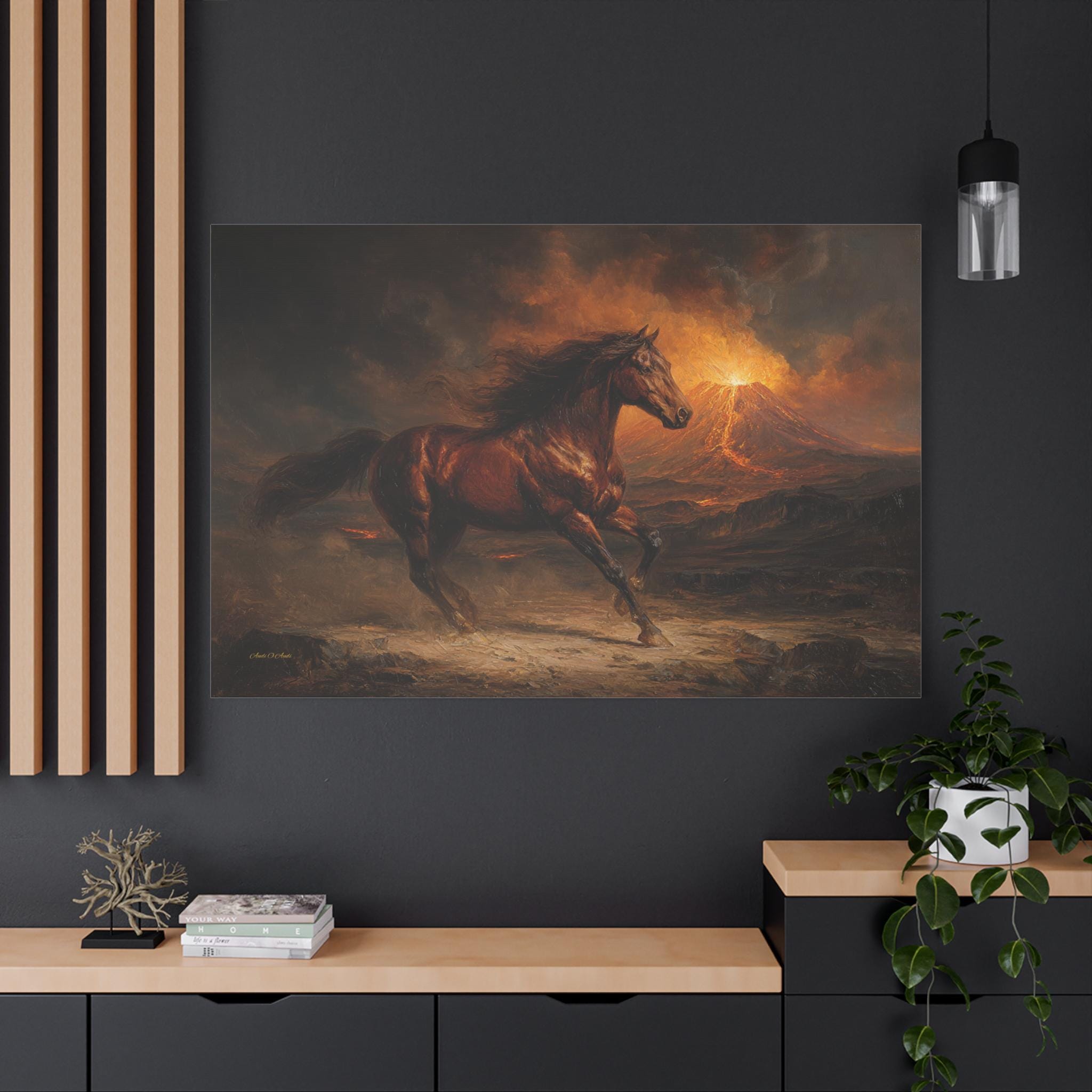 The composition radiates incredible motion, epic survival, and rugged elegance. The design utilizes a rich, heavy impressionist impasto oil painting style, beautifully capturing the optical illusion of thick, sweeping palette knife strokes. This technique gives the horse's flowing mane, the rugged terrain, and the glowing lava an incredibly rich, 3D-like depth. It is the perfect, dynamic statement piece to elevate a modern home office, a rustic cabin, or a masculine living room.