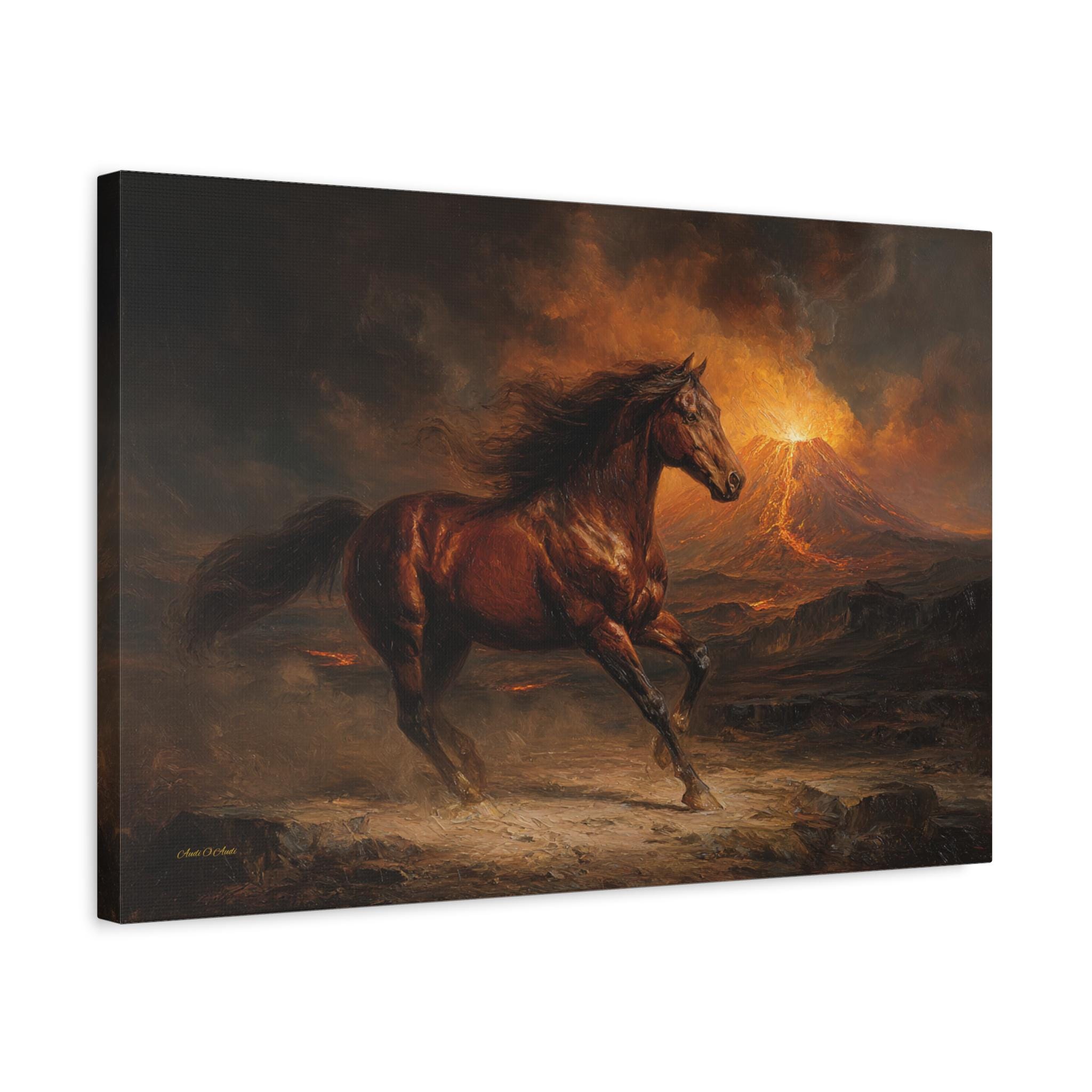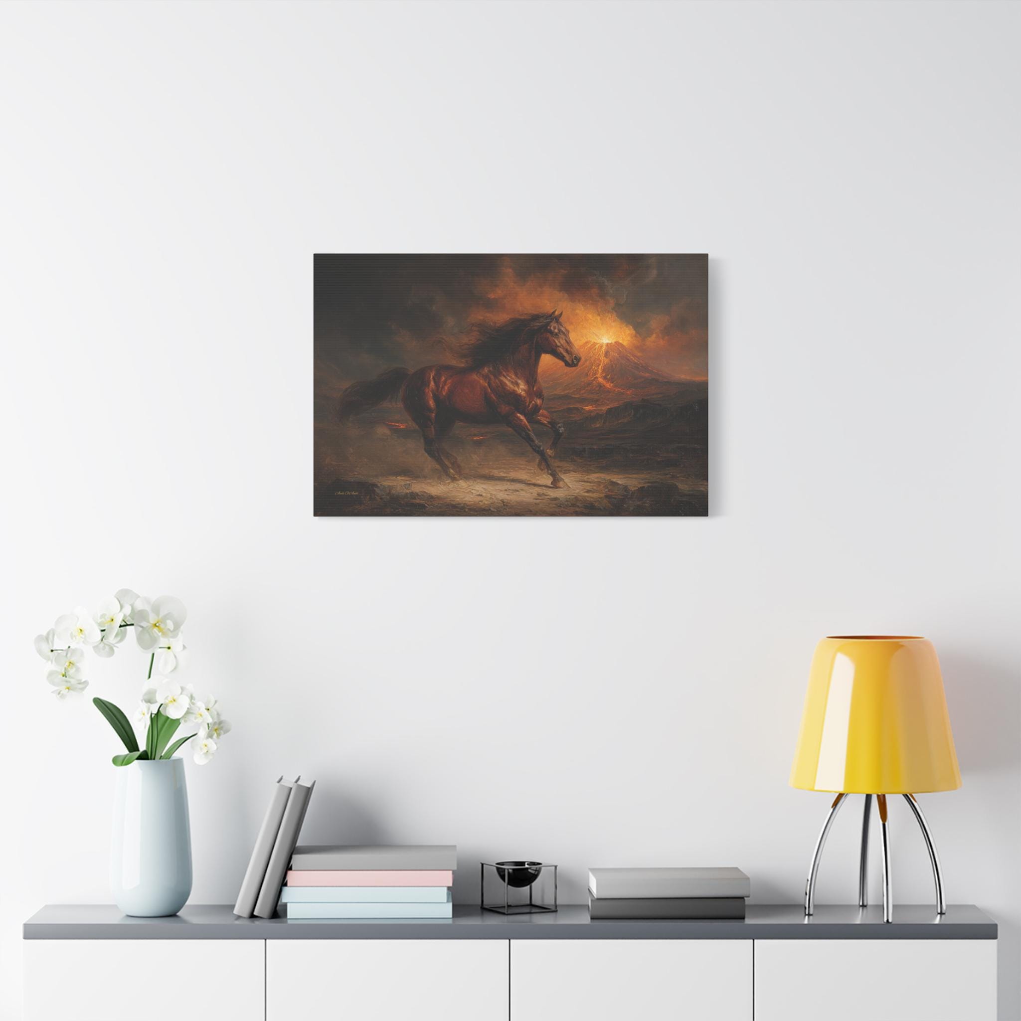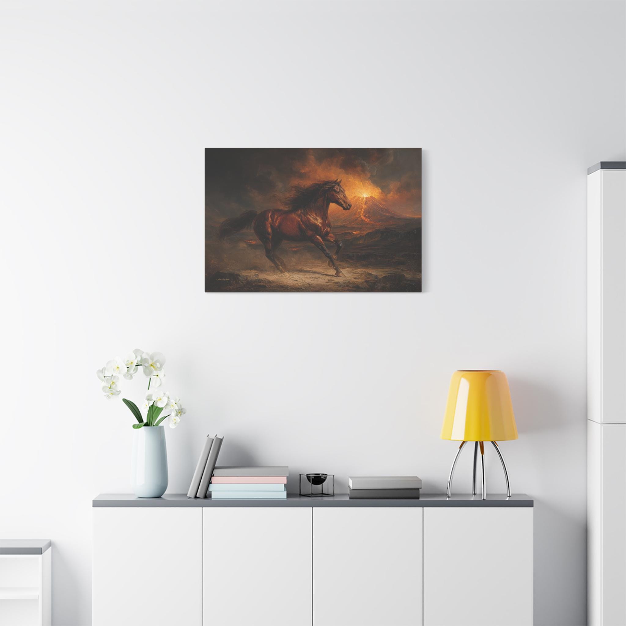 Bring raw power, untamed energy, and breathtaking cinematic drama into your space with this stunning wild horse canvas print. This captivating horizontal artwork features a majestic chestnut horse galloping fiercely across a rugged, ash-covered landscape. In the background, a massive volcano erupts, painting the smoky, dramatic sky with glowing hues of fiery orange, golden yellow, and deep, moody charcoal.