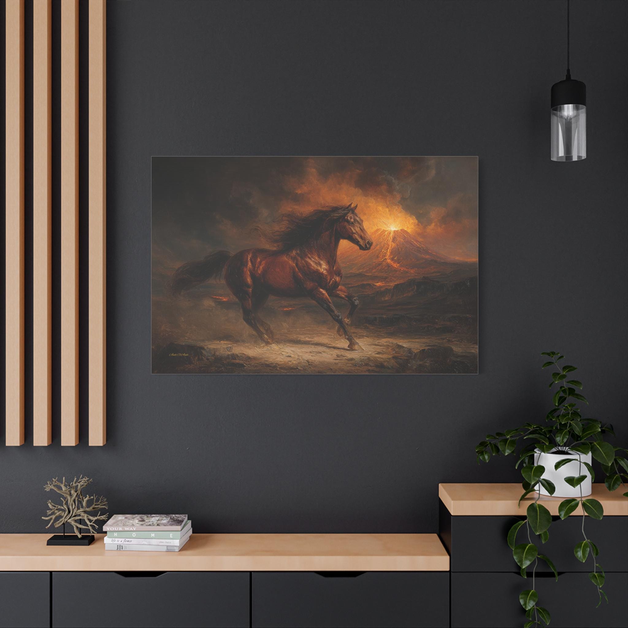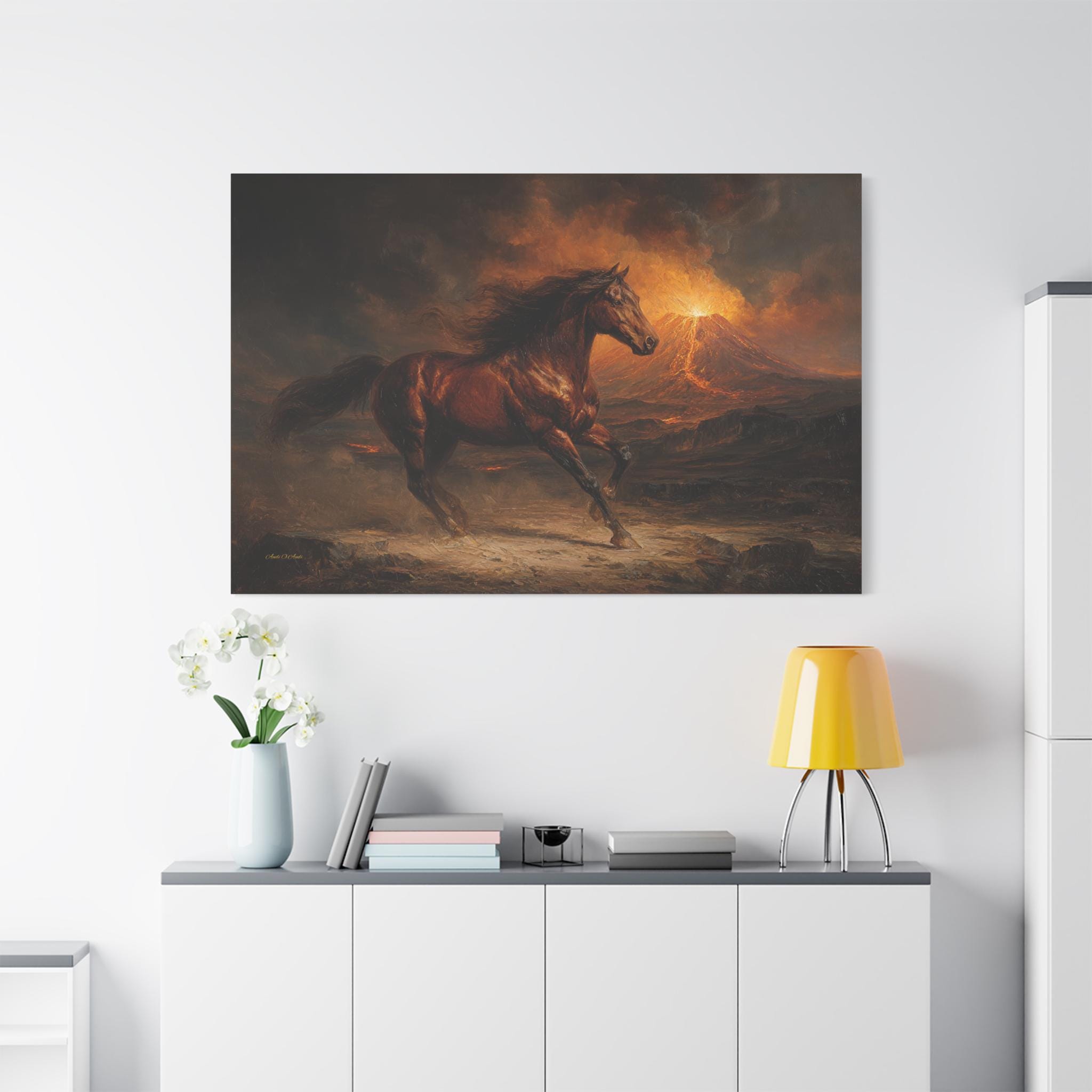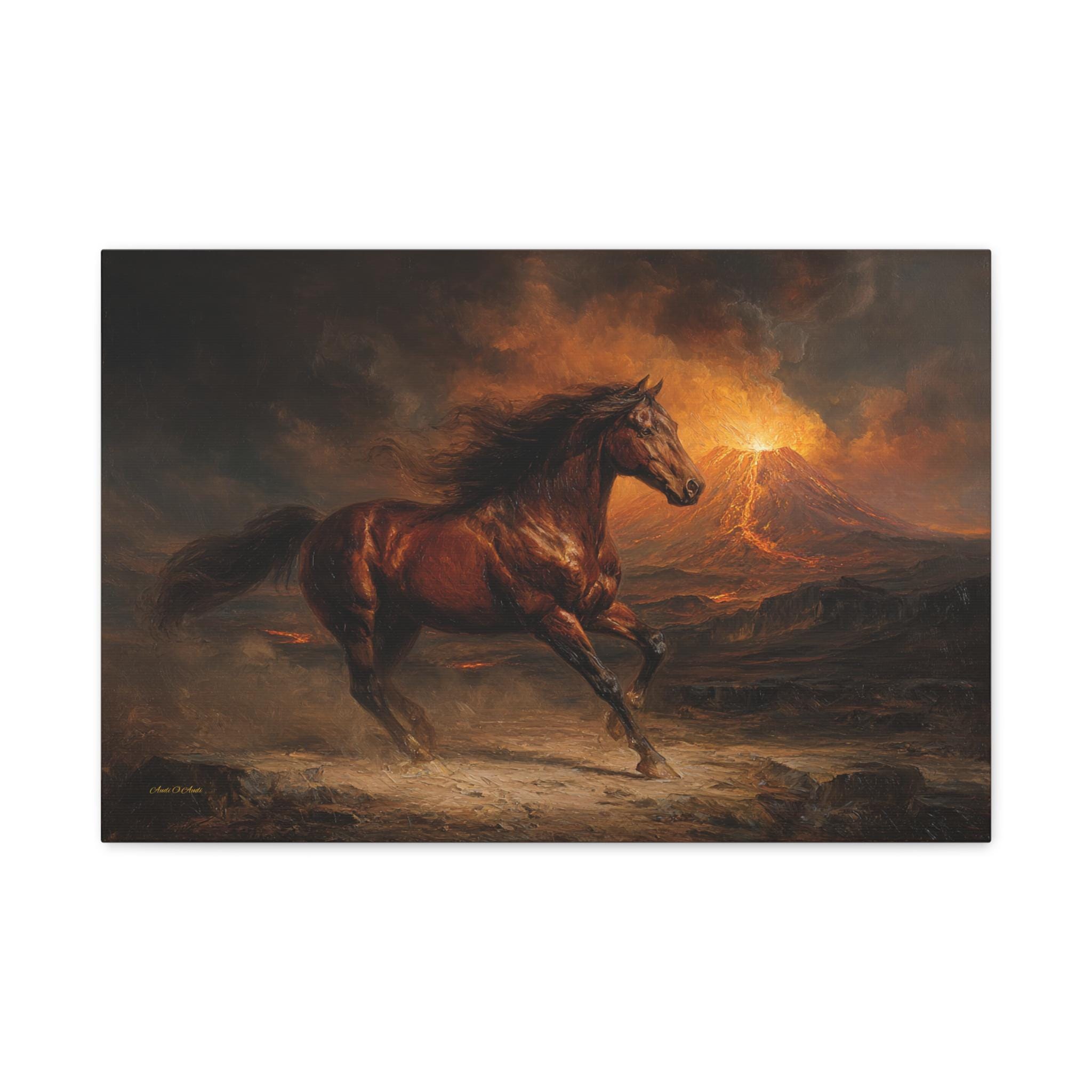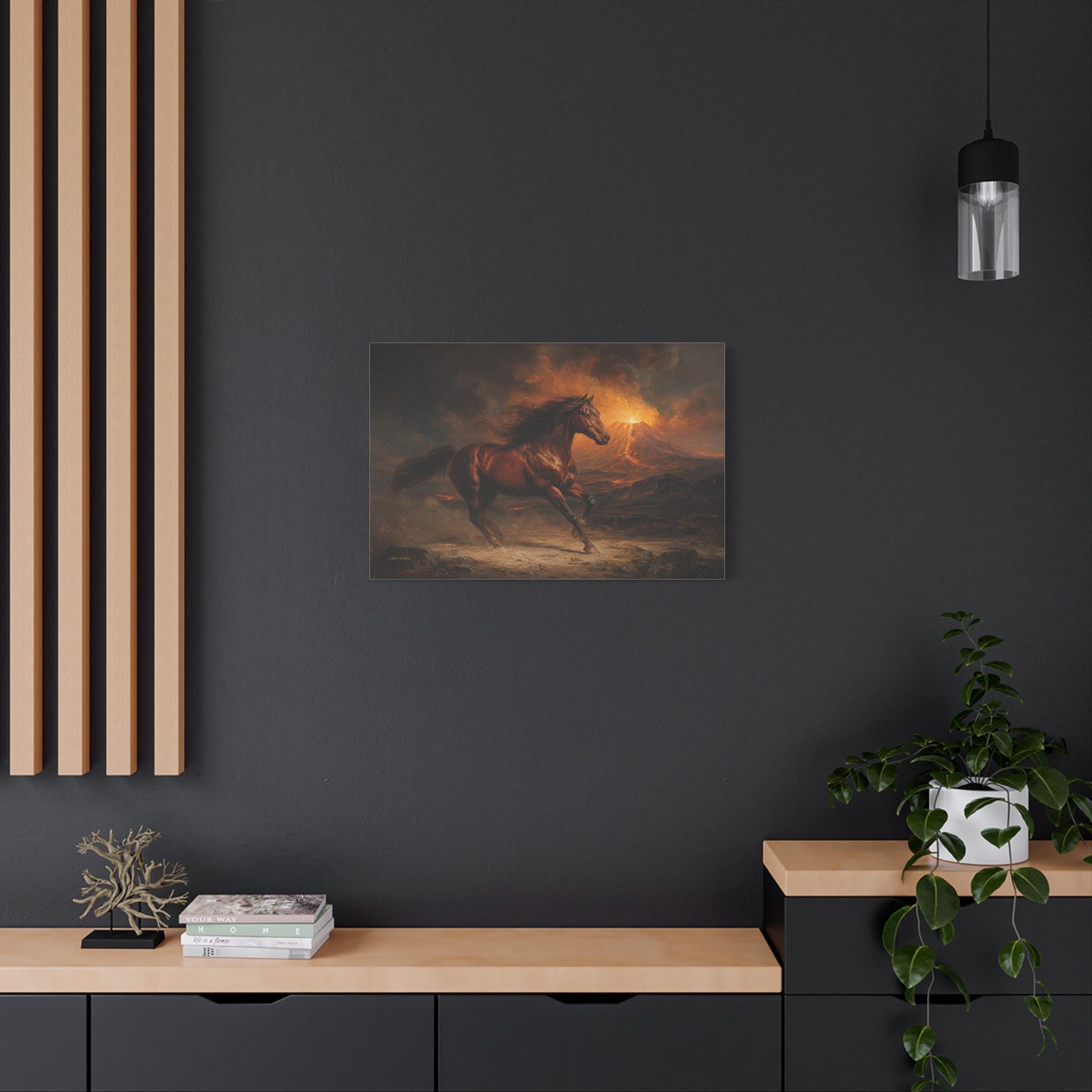 Bring raw power, untamed energy, and breathtaking cinematic drama into your space with this stunning wild horse canvas print. This captivating horizontal artwork features a majestic chestnut horse galloping fiercely across a rugged, ash-covered landscape. In the background, a massive volcano erupts, painting the smoky, dramatic sky with glowing hues of fiery orange, golden yellow, and deep, moody charcoal.