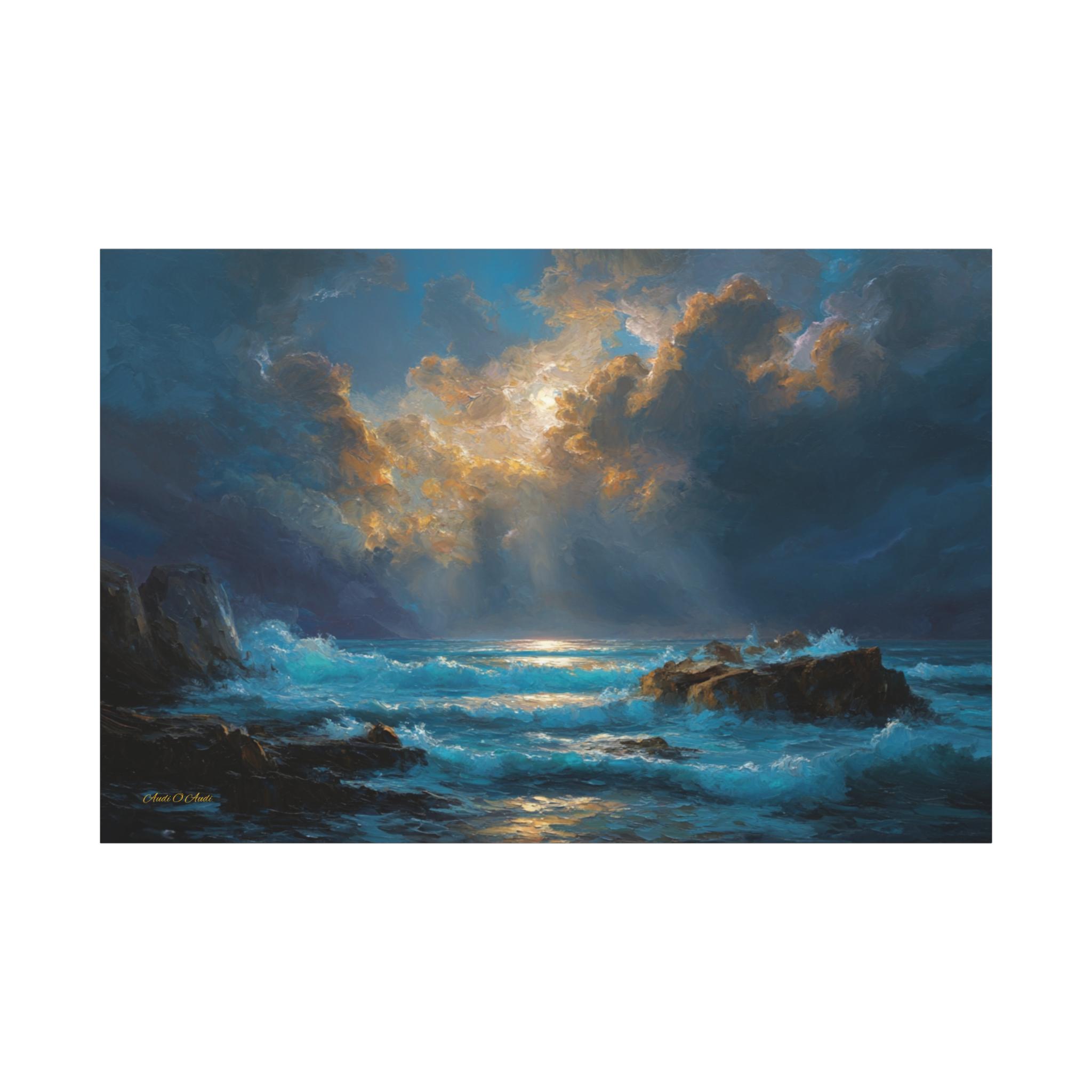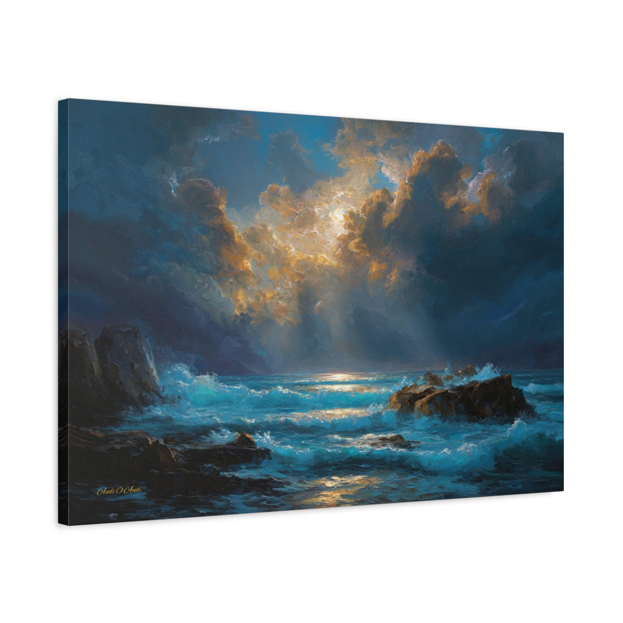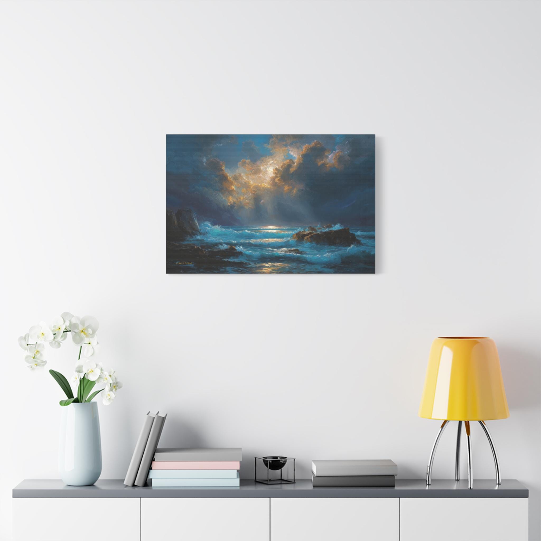 Gallery-Quality Canvas: Printed on 100% cotton fabric (400gsm) which provides a substantial, museum-grade feel and ensures the vivid cyan waves, golden sunbeams, and deep midnight blues look brilliantly saturated.