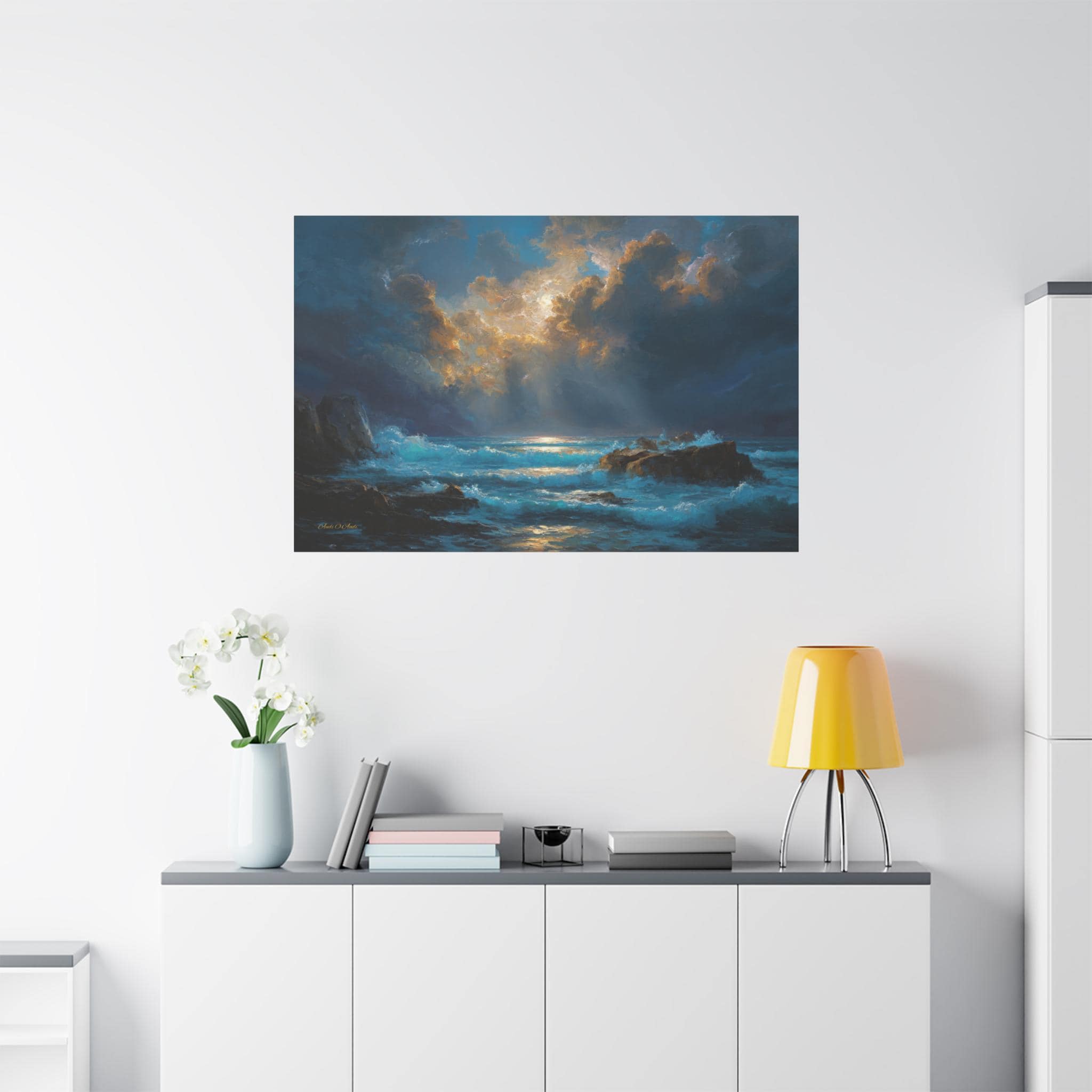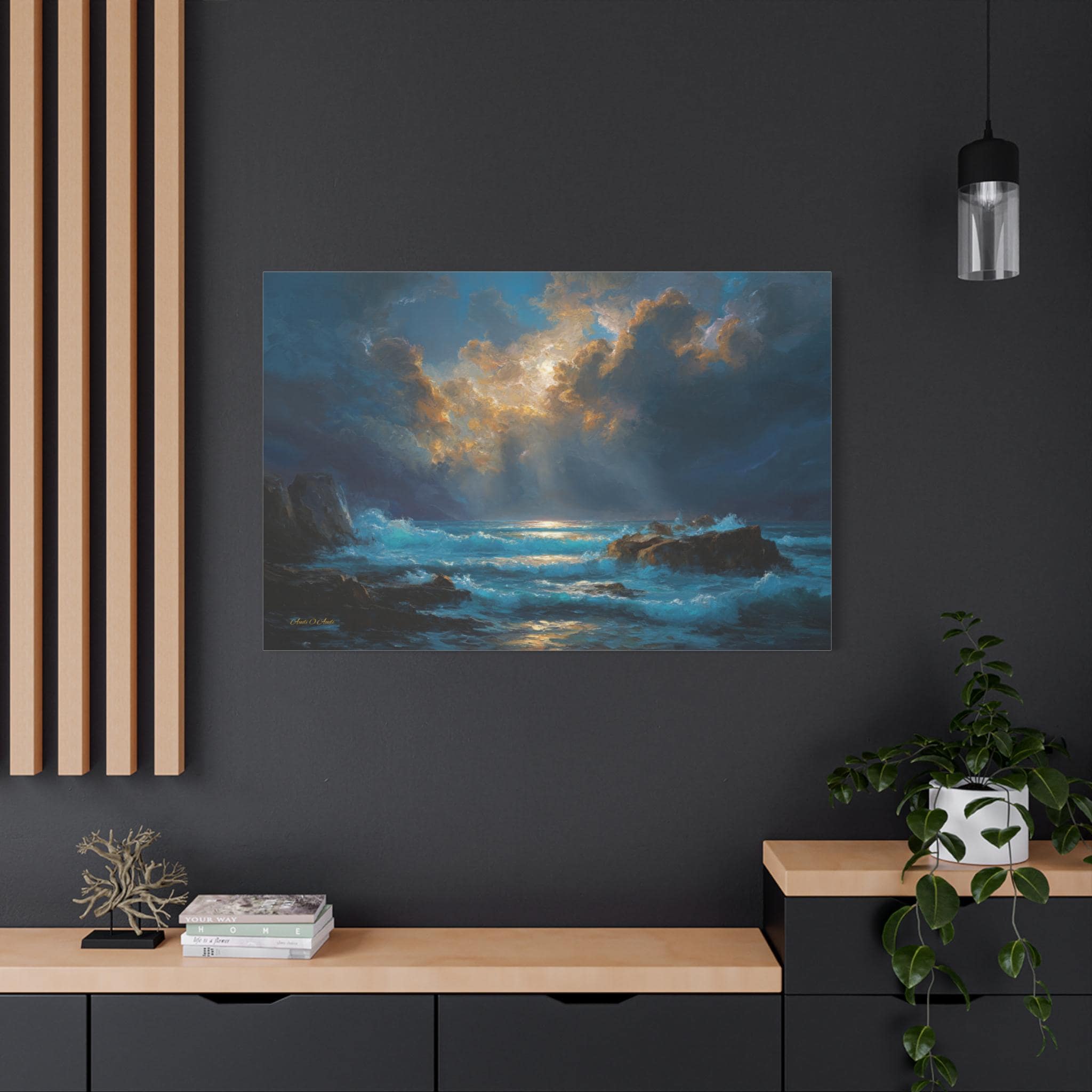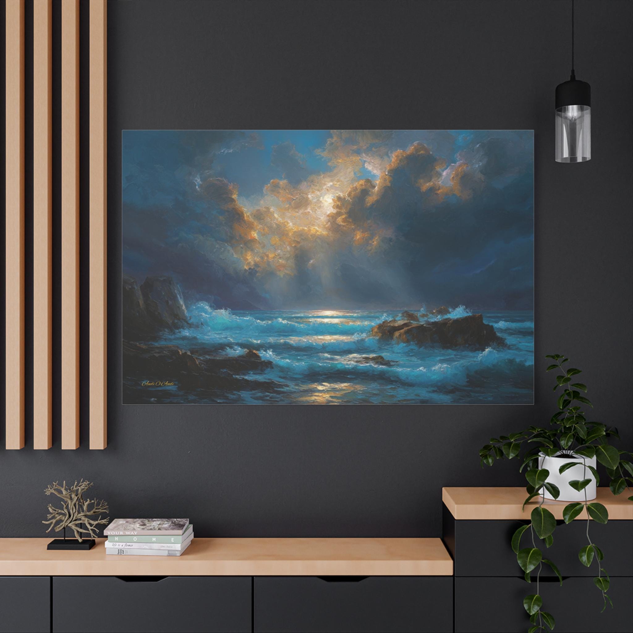 Gallery-Quality Canvas: Printed on 100% cotton fabric (400gsm) which provides a substantial, museum-grade feel and ensures the vivid cyan waves, golden sunbeams, and deep midnight blues look brilliantly saturated.
