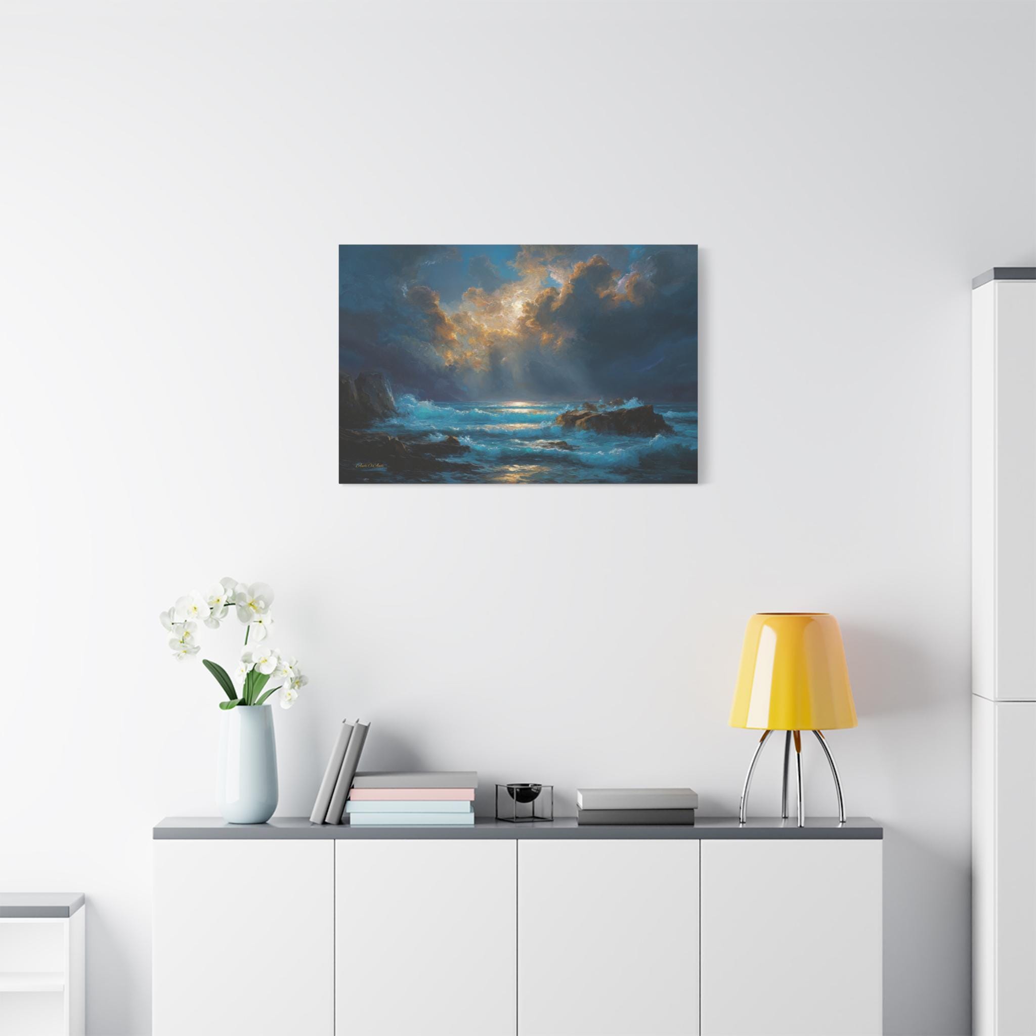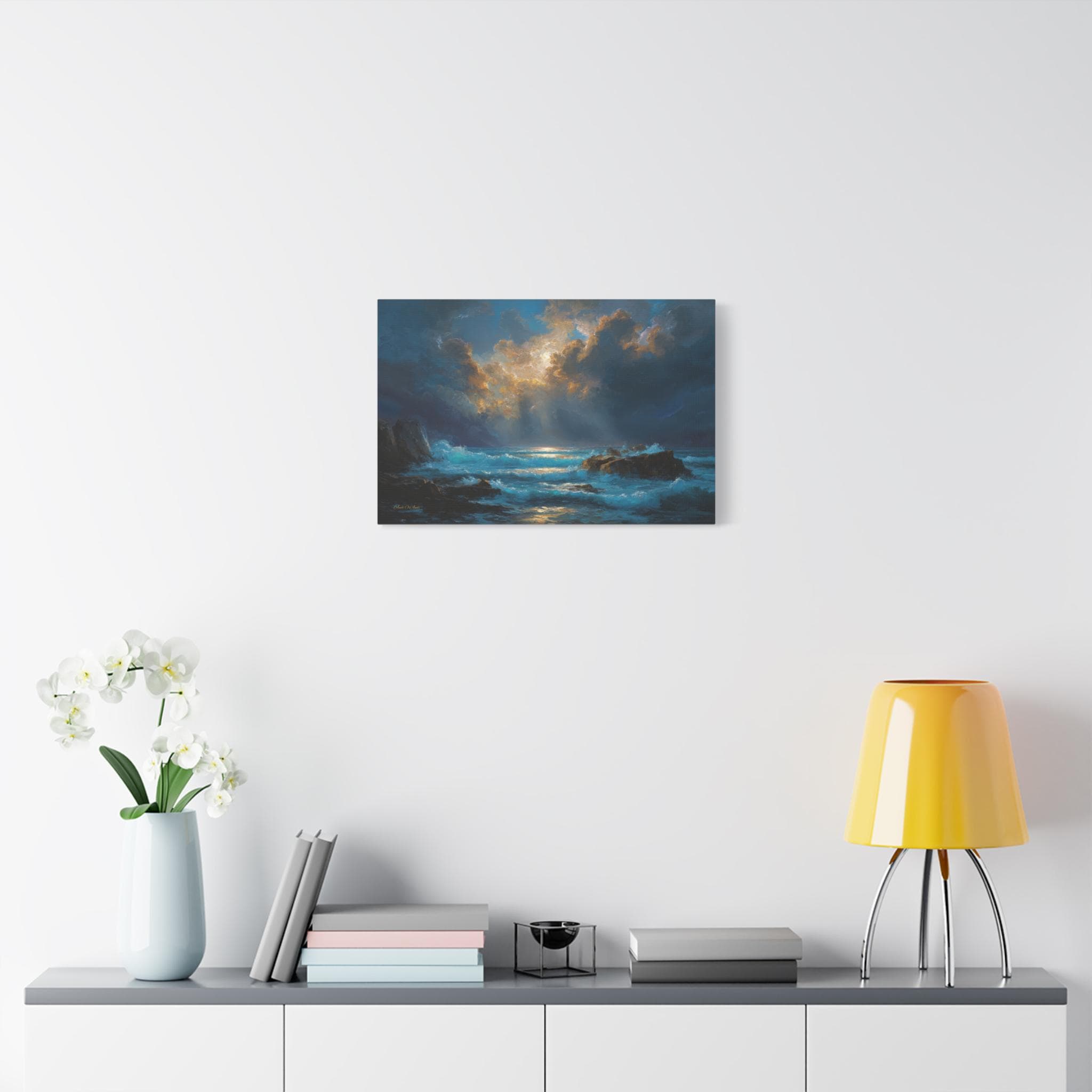 Bring the raw power, breathtaking drama, and majestic beauty of the untamed ocean into your home with this stunning moody seascape canvas print. This captivating horizontal artwork features a powerful coastal scene where brilliant, glowing sunlight breaks through heavy, dramatic storm clouds. The divine light casts a golden reflection across churning, vivid turquoise waves crashing against rugged, shadowed coastline rocks.