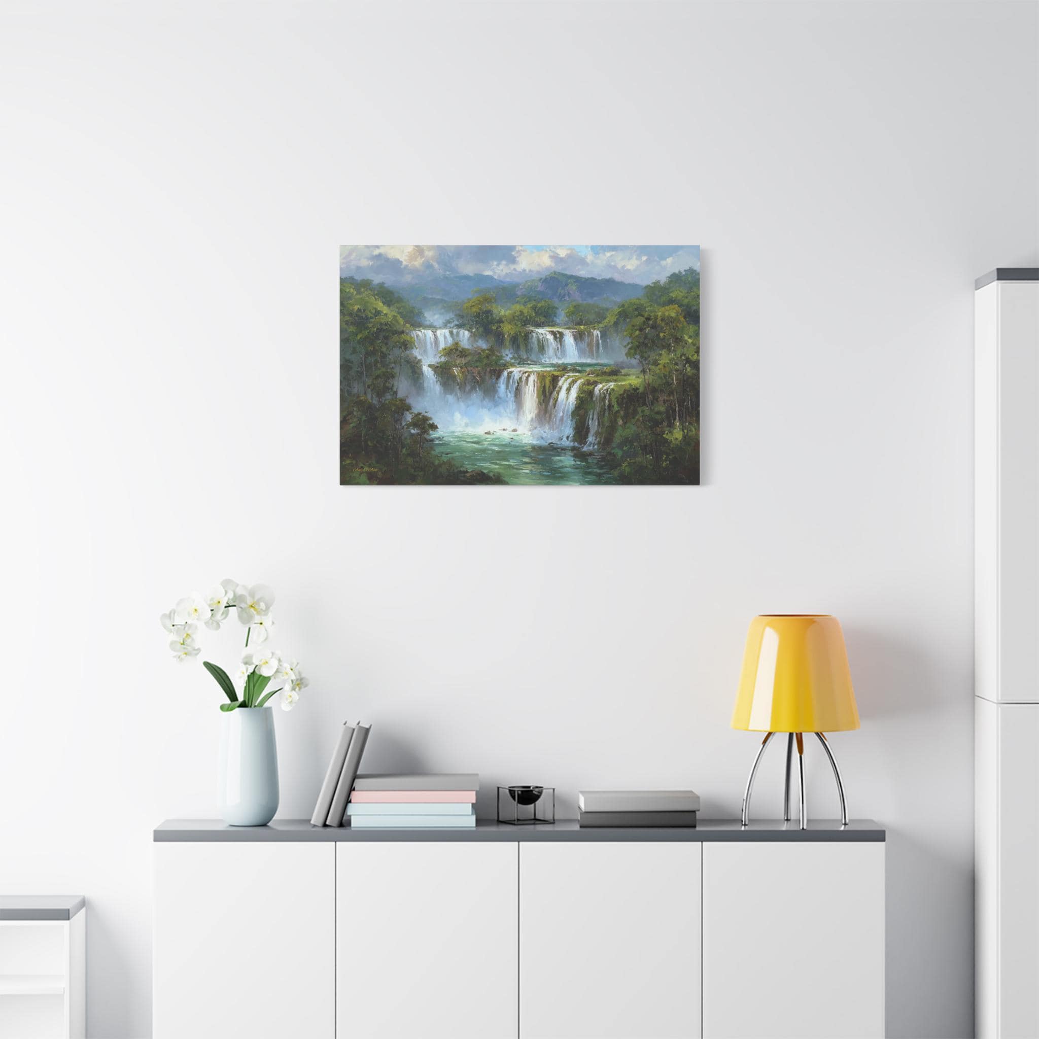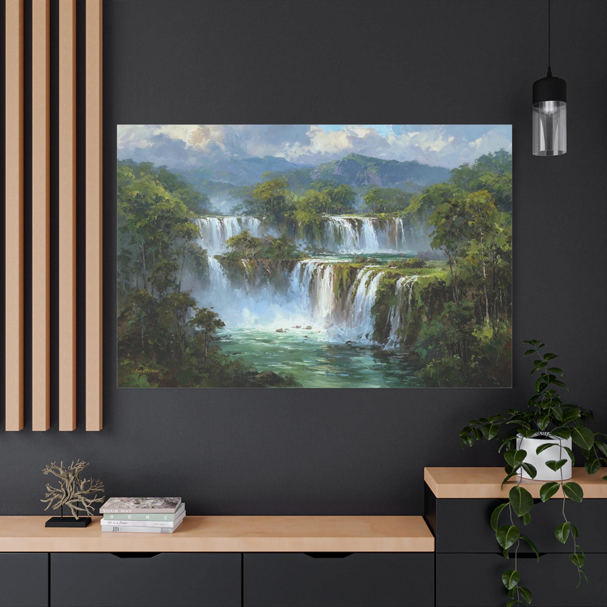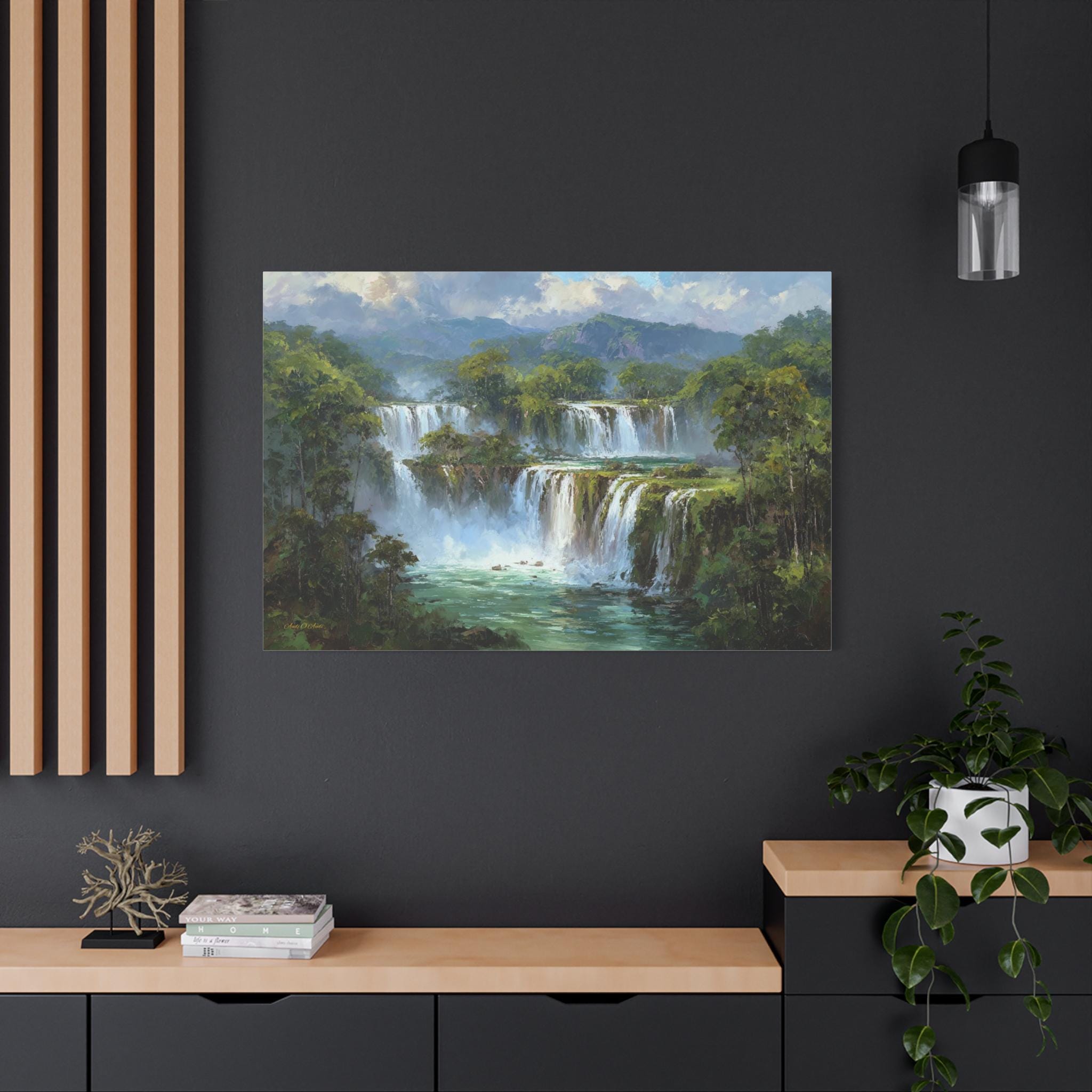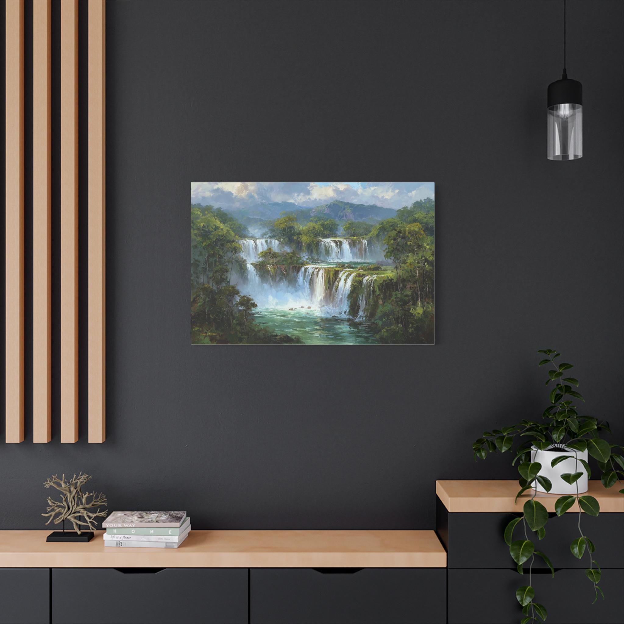 Bring the breathtaking majesty, refreshing energy, and lush beauty of a hidden tropical oasis into your space with this stunning waterfall landscape canvas print. This captivating horizontal artwork features a magnificent multi-tiered waterfall cascading down rocky, moss-covered cliffs into a serene, turquoise pool. The scene is framed by vibrant, densely packed emerald green jungle foliage, all set beneath a misty, atmospheric sky and distant mountains.