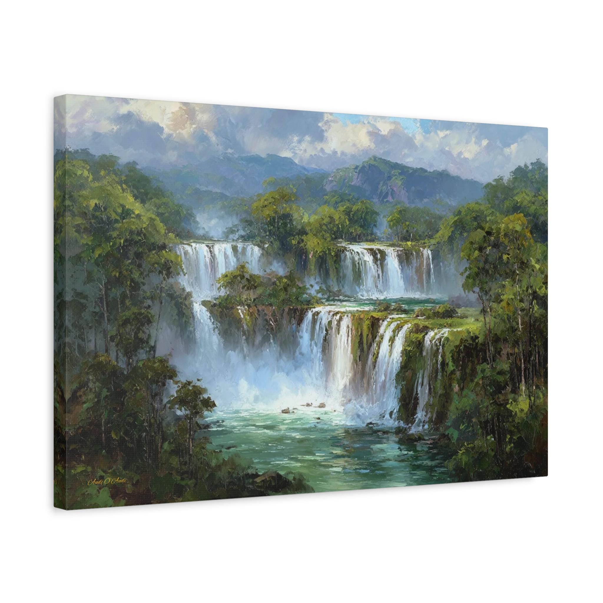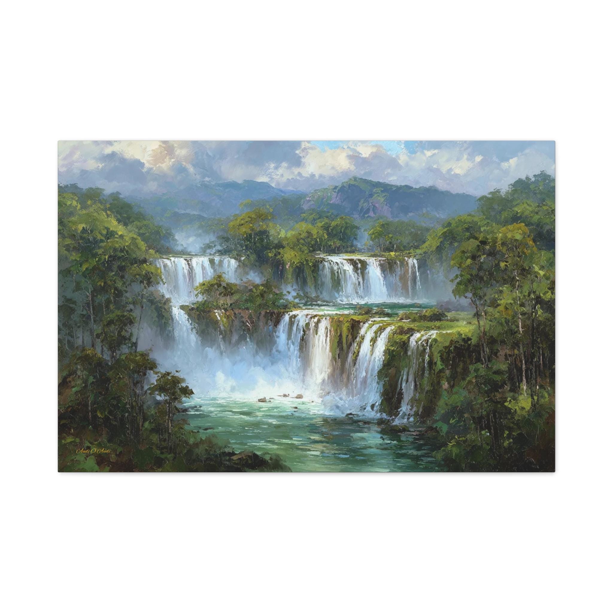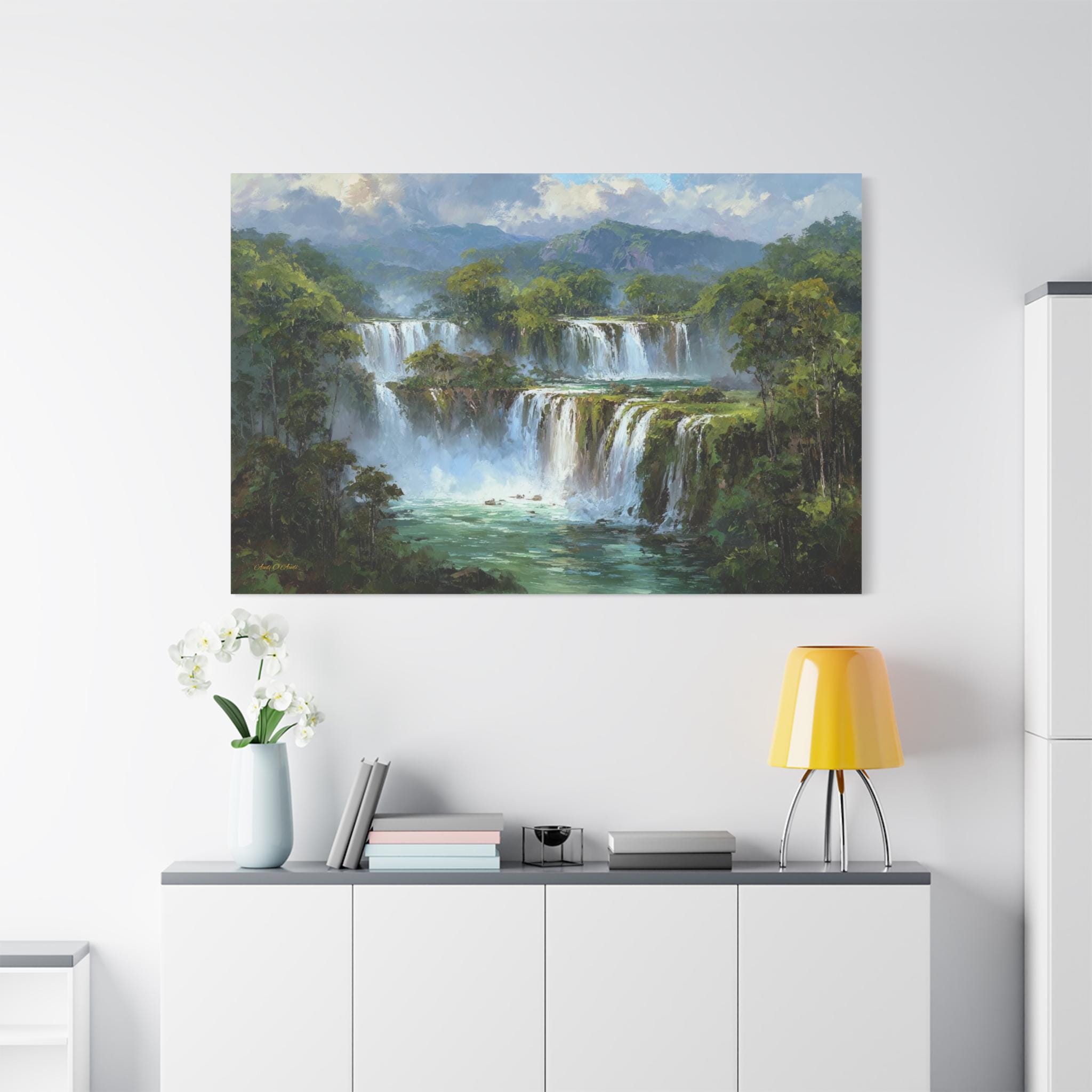 Bring the breathtaking majesty, refreshing energy, and lush beauty of a hidden tropical oasis into your space with this stunning waterfall landscape canvas print. This captivating horizontal artwork features a magnificent multi-tiered waterfall cascading down rocky, moss-covered cliffs into a serene, turquoise pool. The scene is framed by vibrant, densely packed emerald green jungle foliage, all set beneath a misty, atmospheric sky and distant mountains.