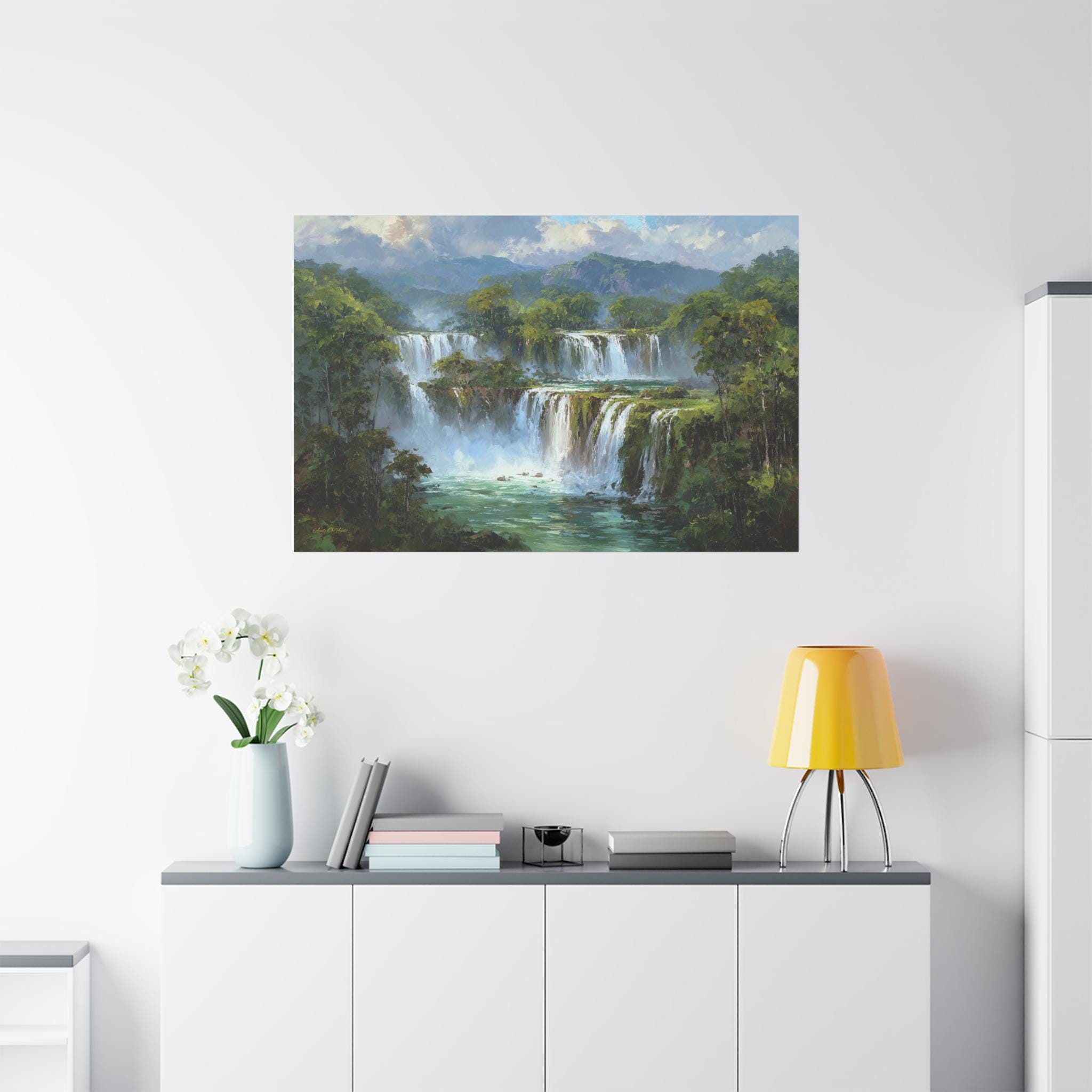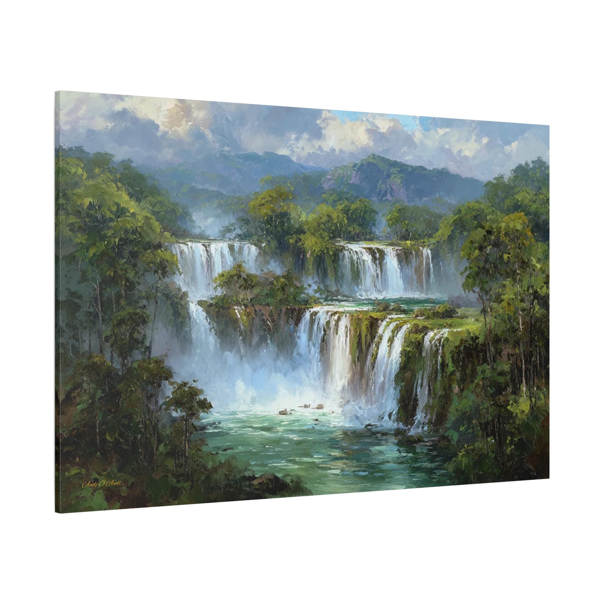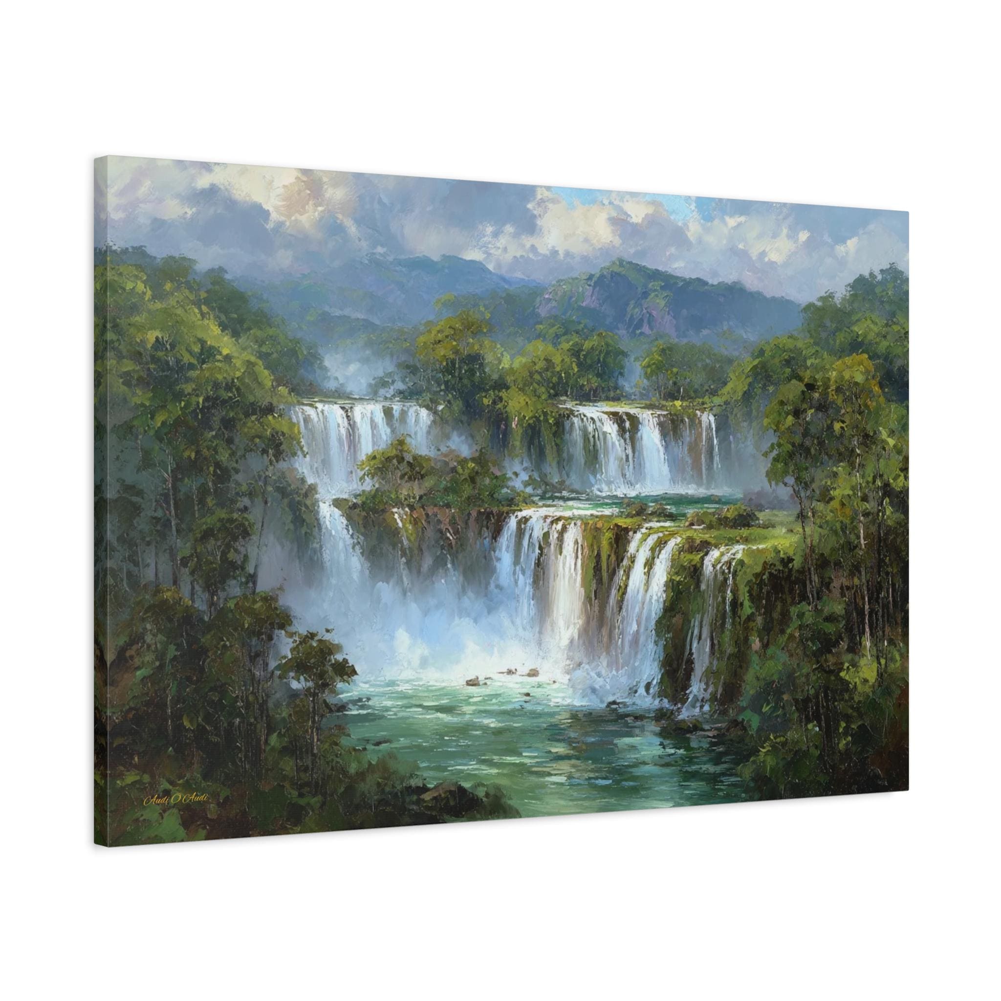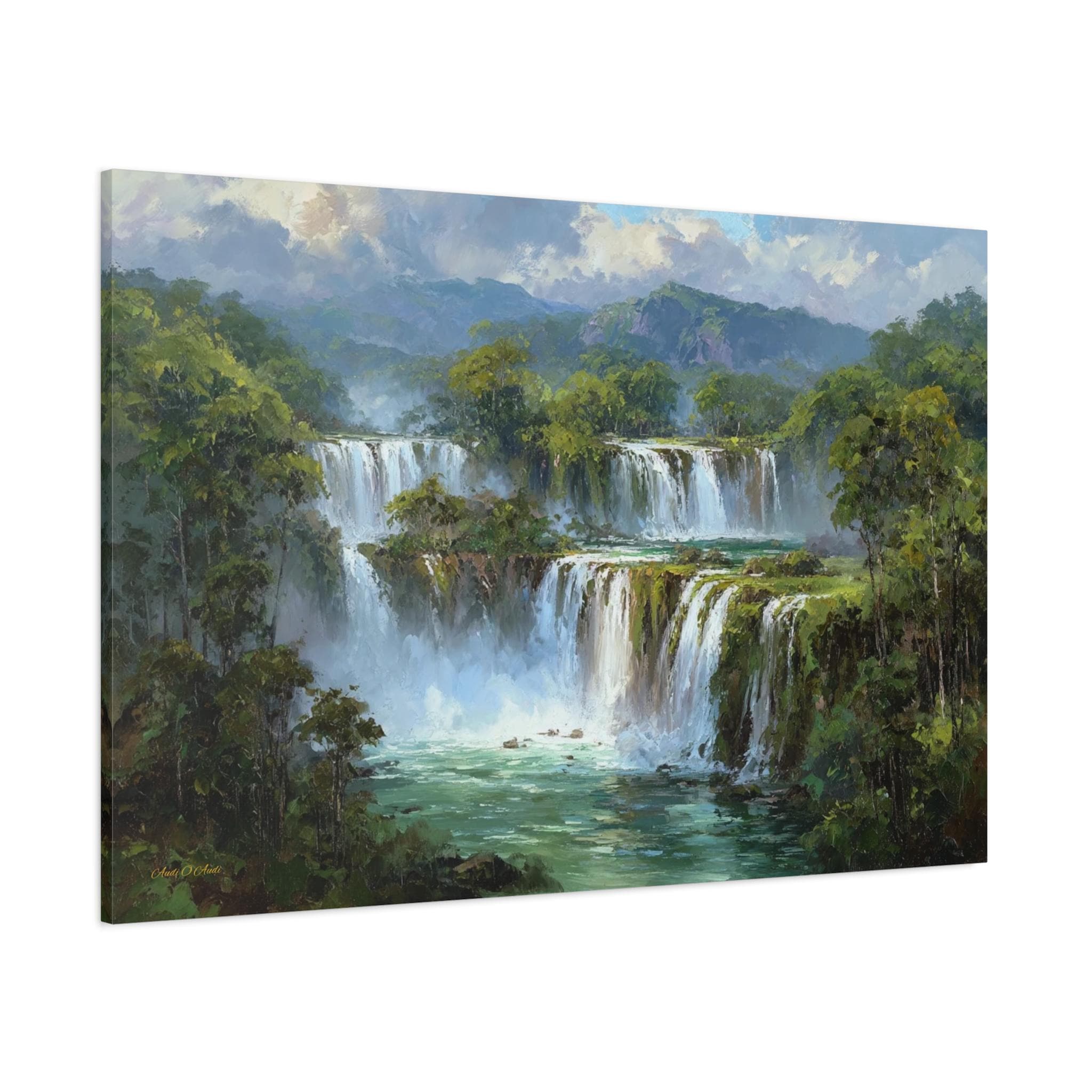 Bring the breathtaking majesty, refreshing energy, and lush beauty of a hidden tropical oasis into your space with this stunning waterfall landscape canvas print. This captivating horizontal artwork features a magnificent multi-tiered waterfall cascading down rocky, moss-covered cliffs into a serene, turquoise pool. The scene is framed by vibrant, densely packed emerald green jungle foliage, all set beneath a misty, atmospheric sky and distant mountains.