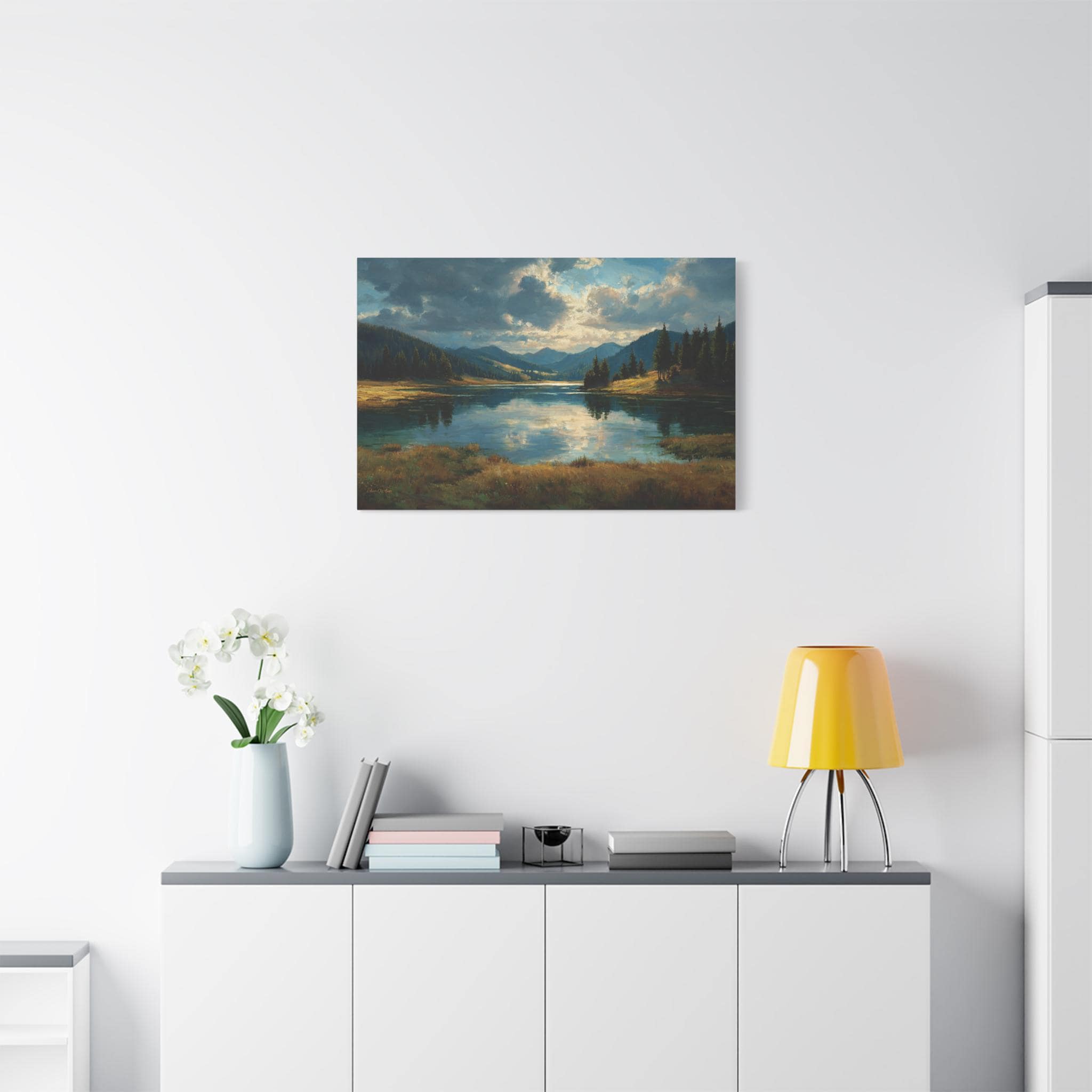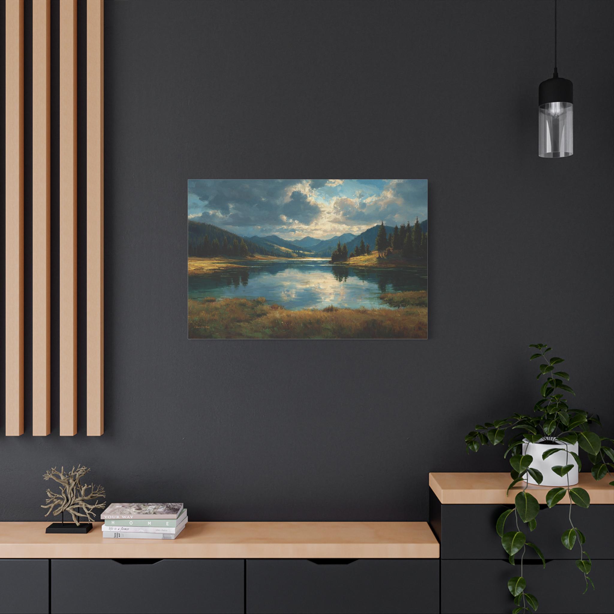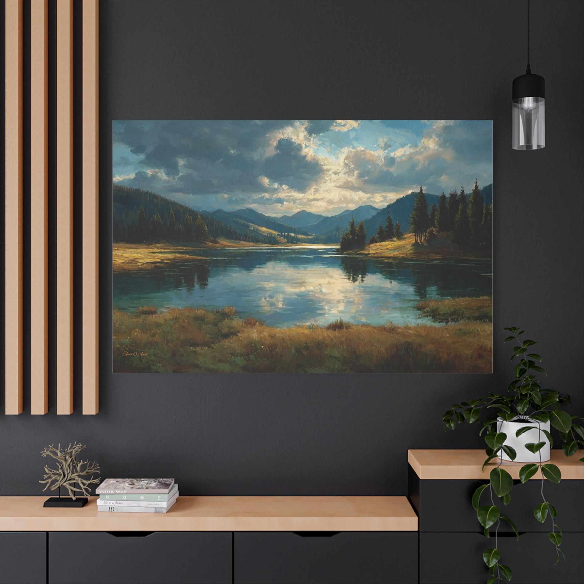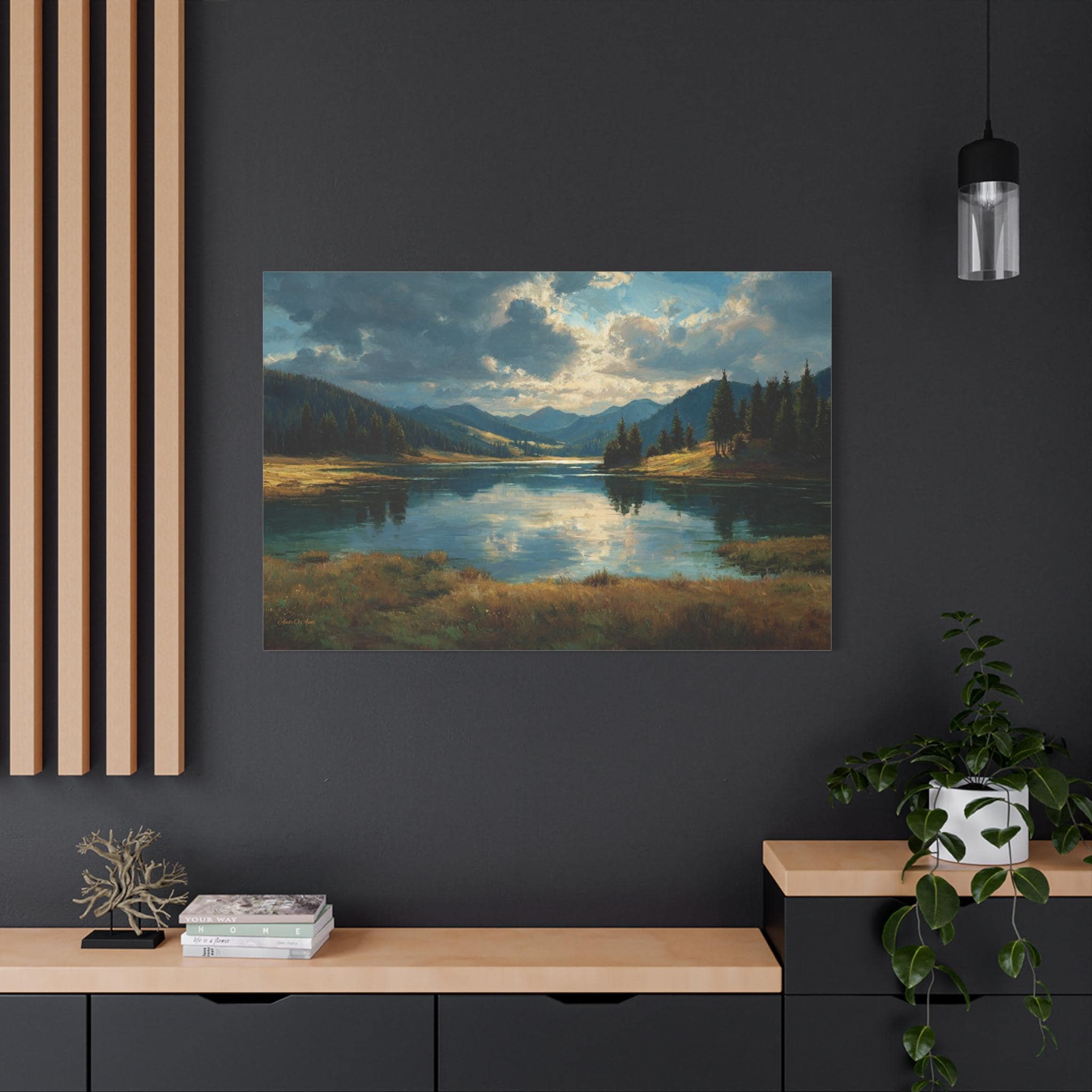 Bring the awe-inspiring majesty, profound peace, and refreshing beauty of the great outdoors into your home with this stunning mountain lake canvas print. This captivating horizontal artwork features a breathtaking view of a pristine, mirror-like alpine lake reflecting a dramatic, cloud-swept sky. Brilliant sunlight breaks through the clouds, illuminating the golden, grassy shores and casting a warm glow against the deep greens of the surrounding evergreen pine forests and distant mountain peaks.