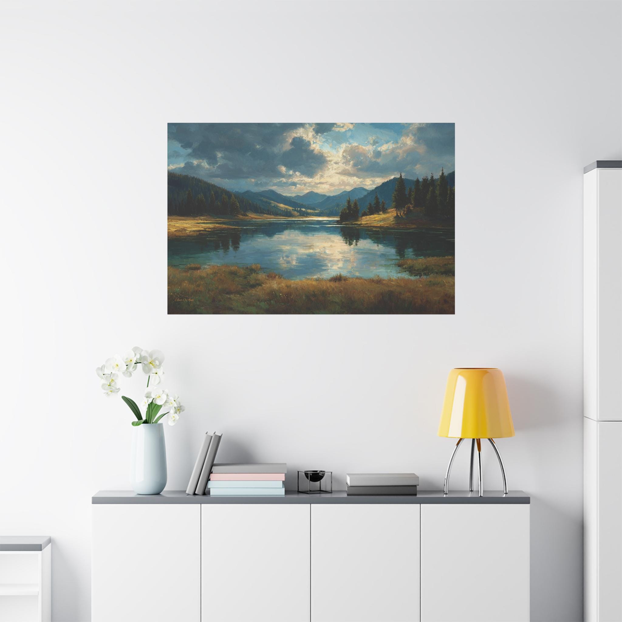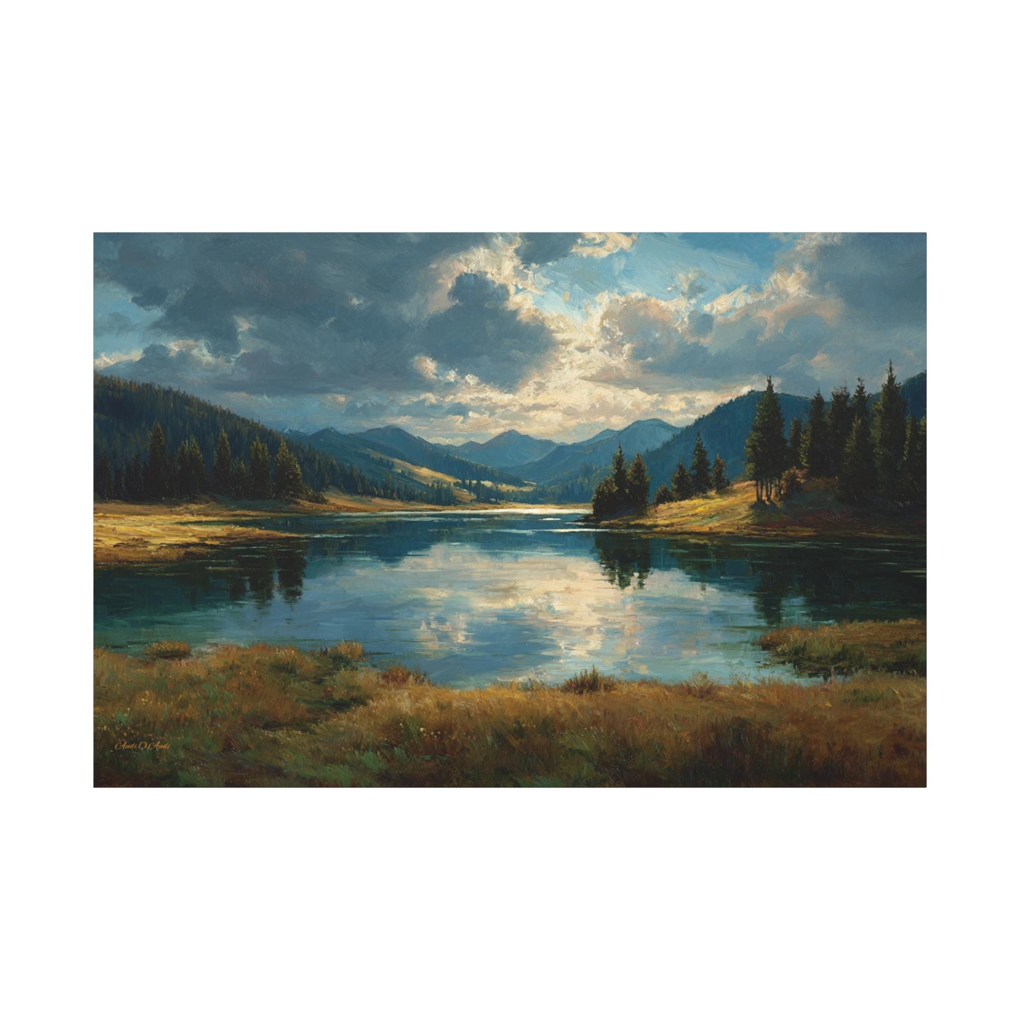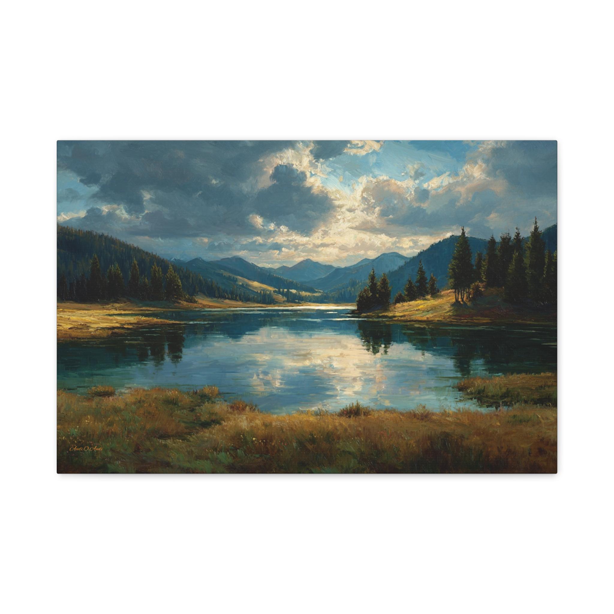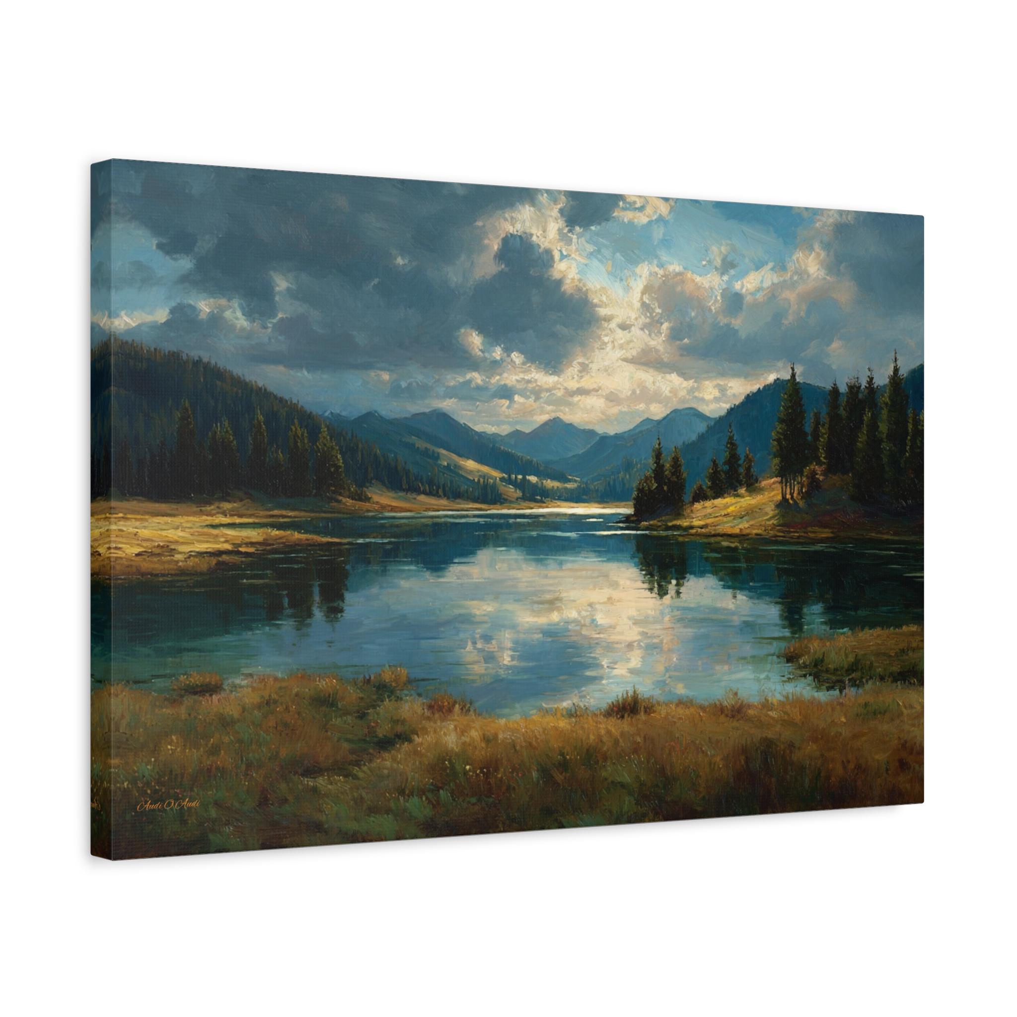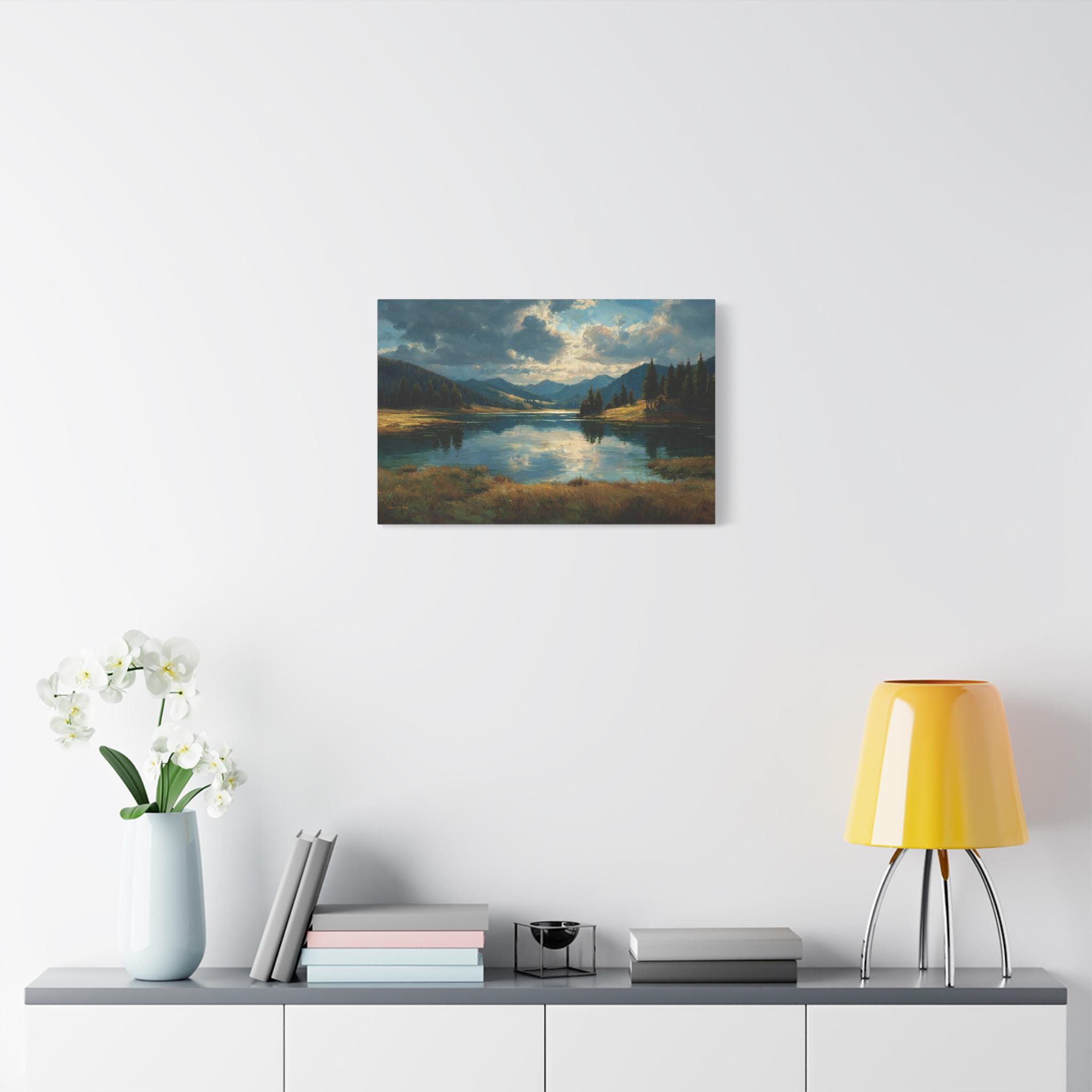 Bring the awe-inspiring majesty, profound peace, and refreshing beauty of the great outdoors into your home with this stunning mountain lake canvas print. This captivating horizontal artwork features a breathtaking view of a pristine, mirror-like alpine lake reflecting a dramatic, cloud-swept sky. Brilliant sunlight breaks through the clouds, illuminating the golden, grassy shores and casting a warm glow against the deep greens of the surrounding evergreen pine forests and distant mountain peaks.