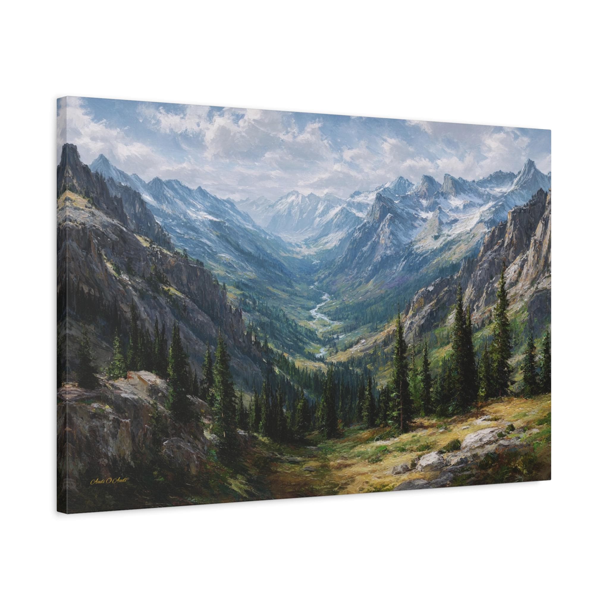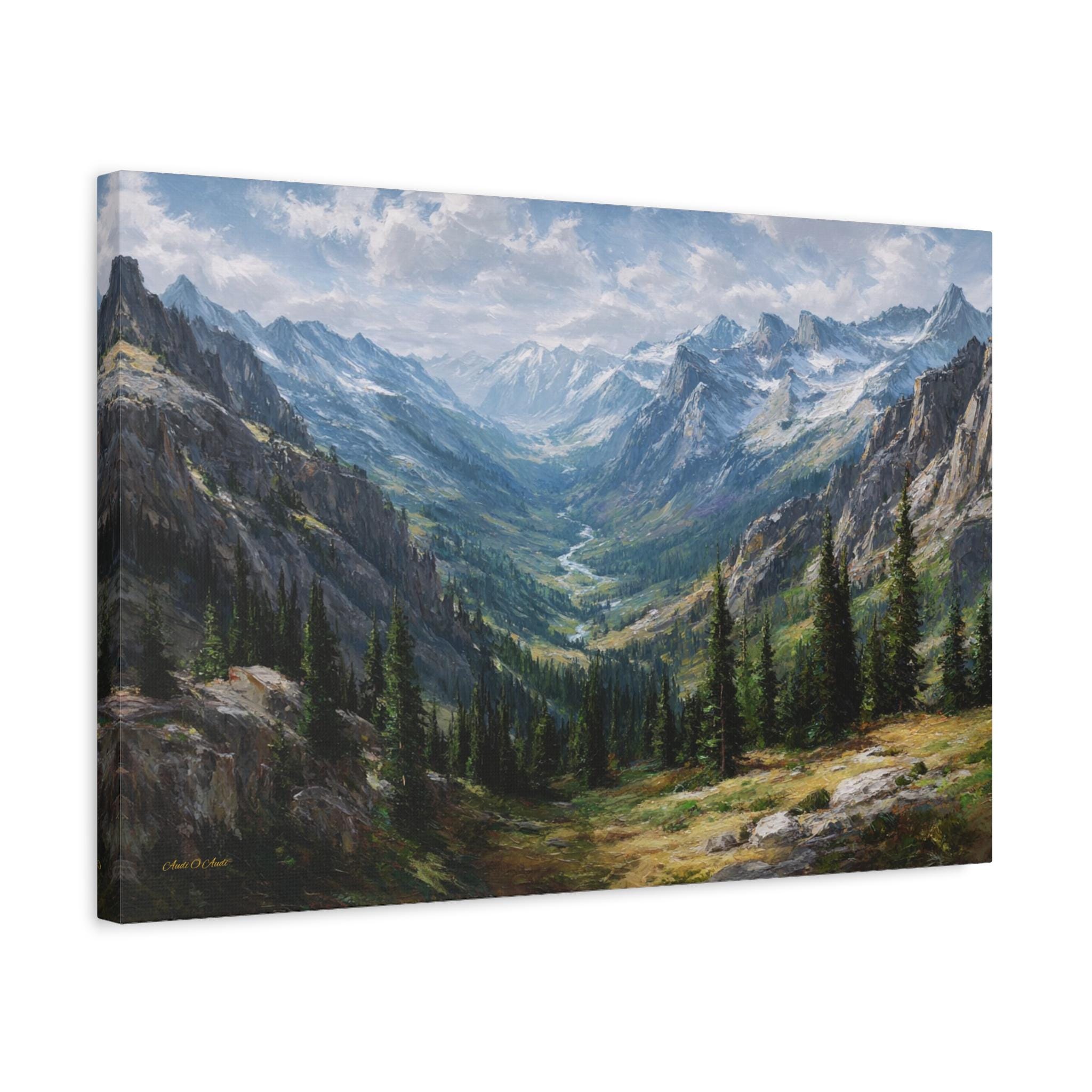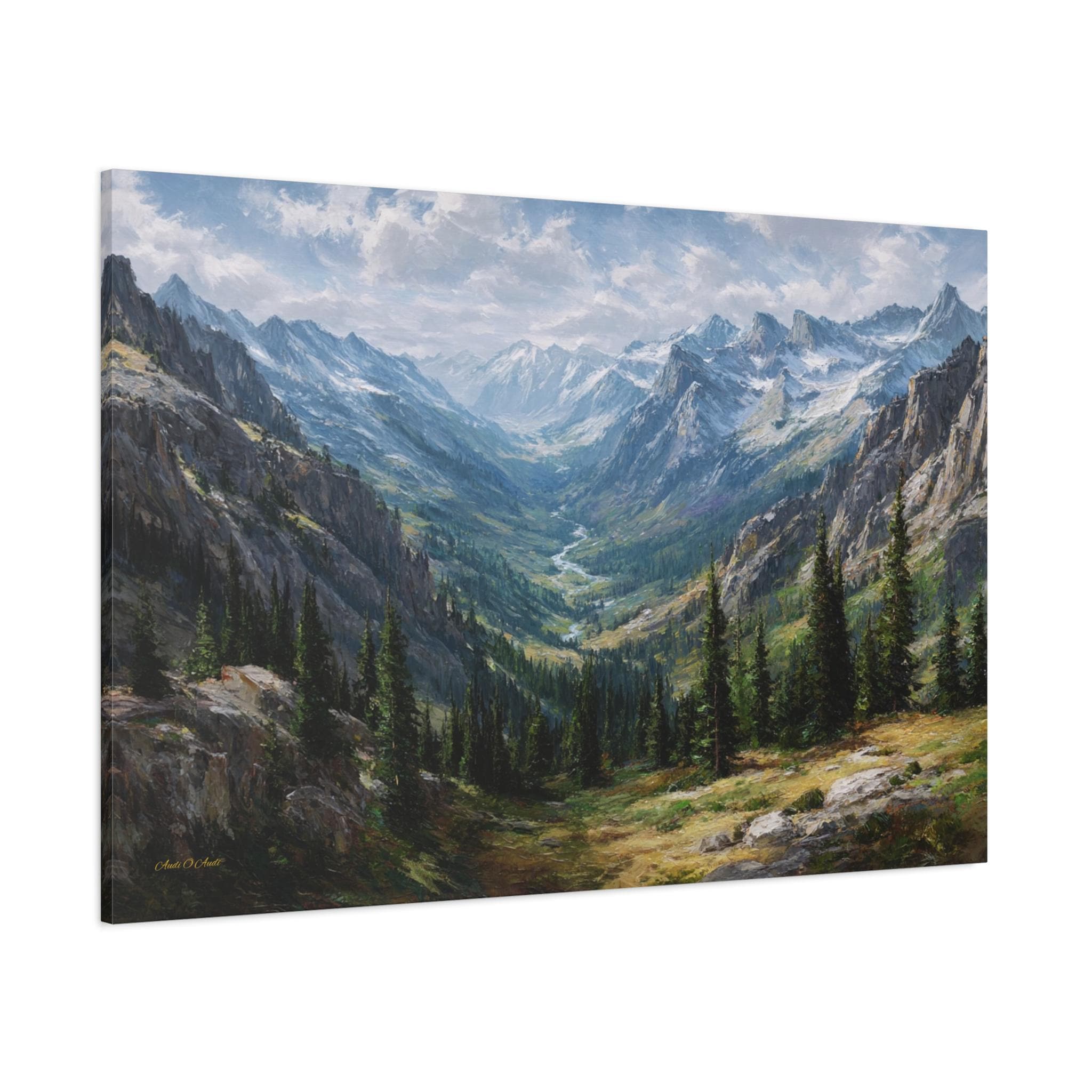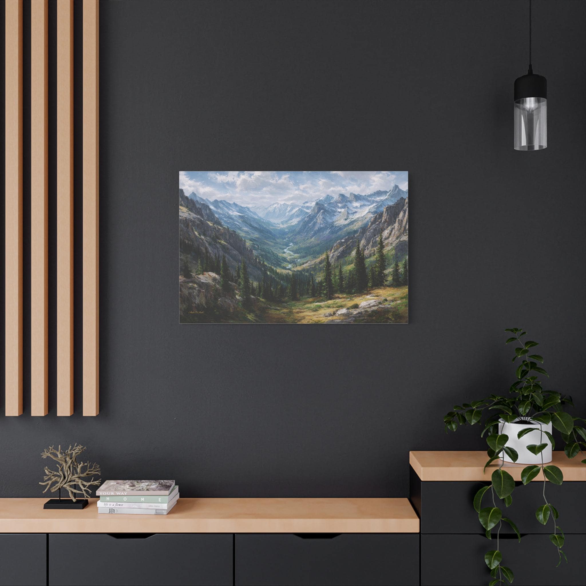 Bring the awe-inspiring majesty, expansive freedom, and rugged beauty of the alpine wilderness into your home with this stunning mountain valley canvas print. This captivating horizontal artwork features a breathtaking view down a lush, deep valley. A winding river cuts through dense evergreen pine forests and rugged, rocky cliffs, leading the eye toward towering, snow-capped mountain peaks set beneath a dynamic, cloud-swept sky.